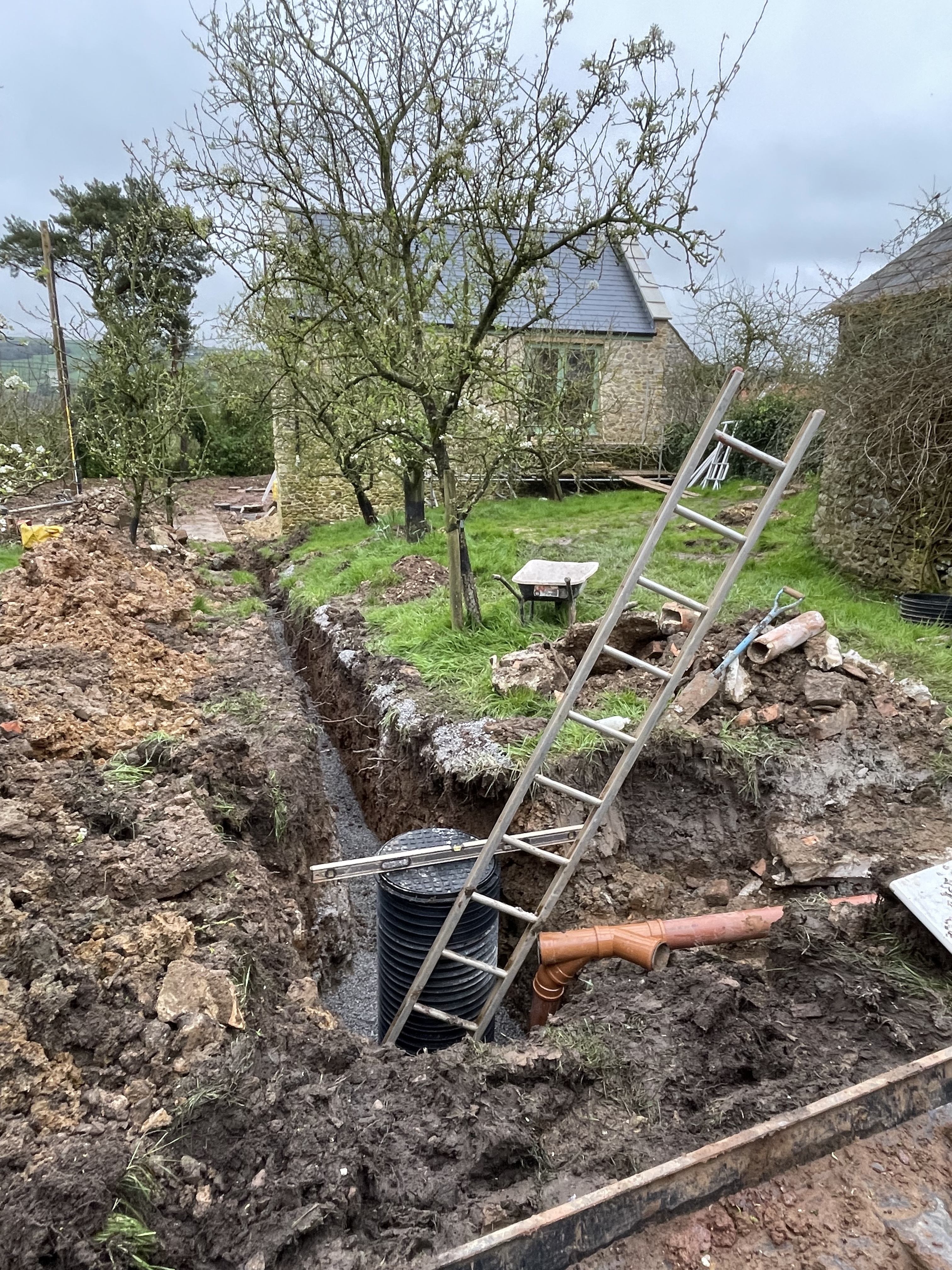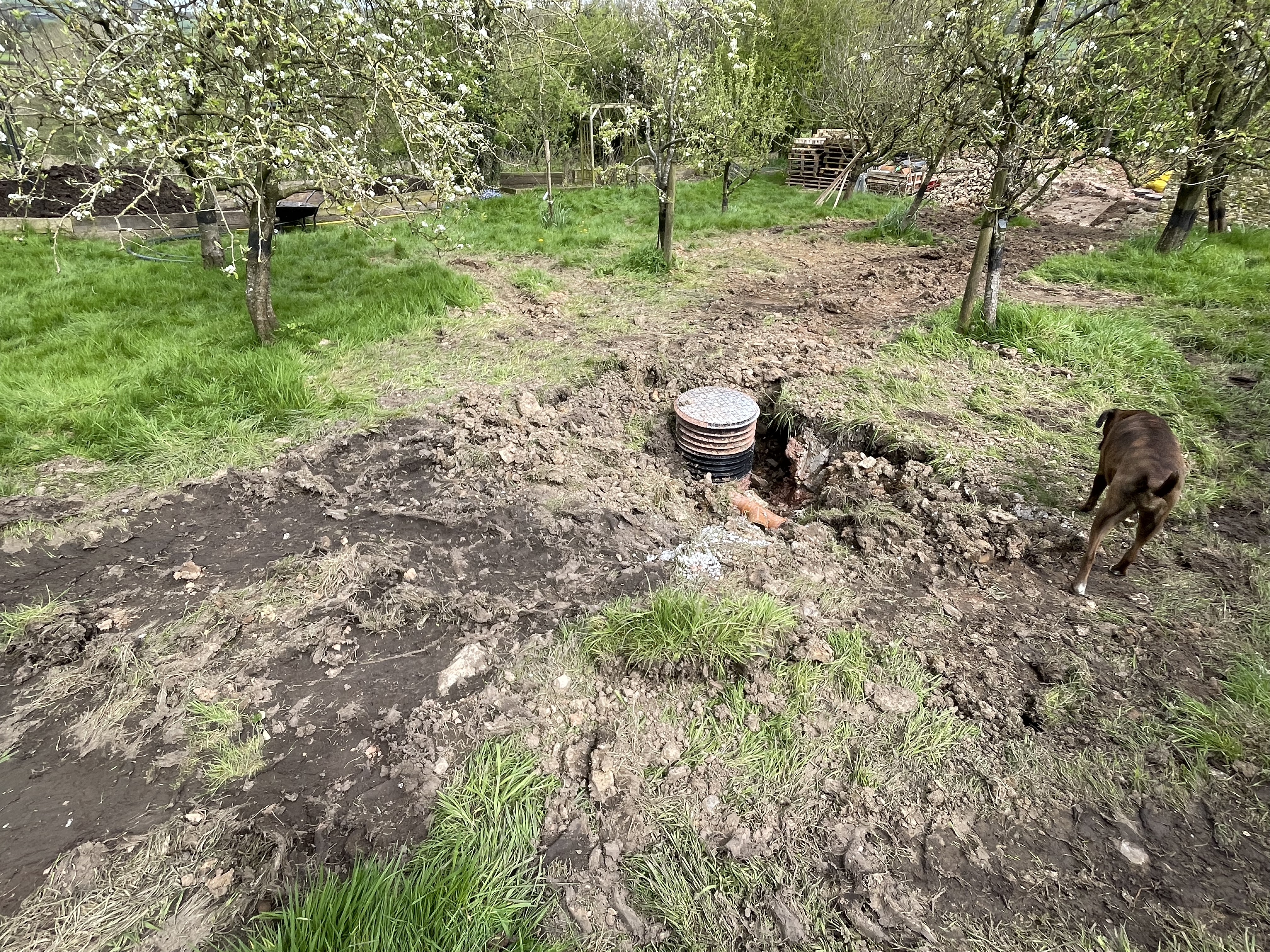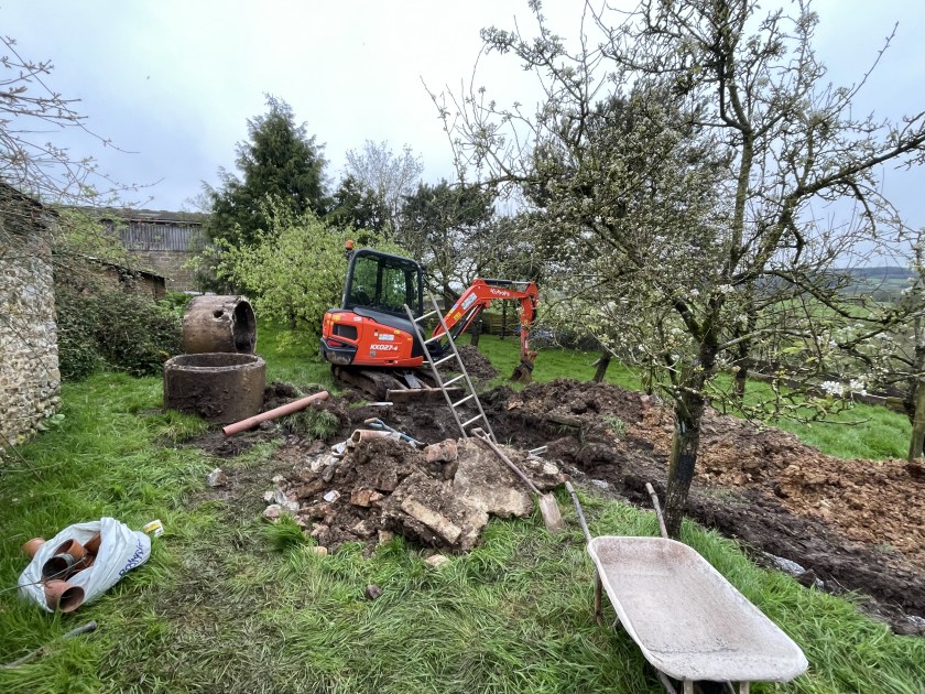 This has been a busy week all round. It’s also been a messy week for our site manager. Our farmhouse septic tank needed upgrading well before we moved in, and we’ve taken our chance with the renovations to connect it up to the new sewage treatment plant that’ll service the whole site. Our site manager, originally intending on just diverting the connection from the old tank to the new treatment plant, ended up digging the entire tank out because it was so small. He did this on what must have been the wettest day of the week and got completely covered in mud… The orchard (where the septic tank was located) doesn’t look much better now, but he filled in all the deep trenches before the weekend to make it accessible again – now we just need to hope the ground doesn’t collapse too much as it settles.