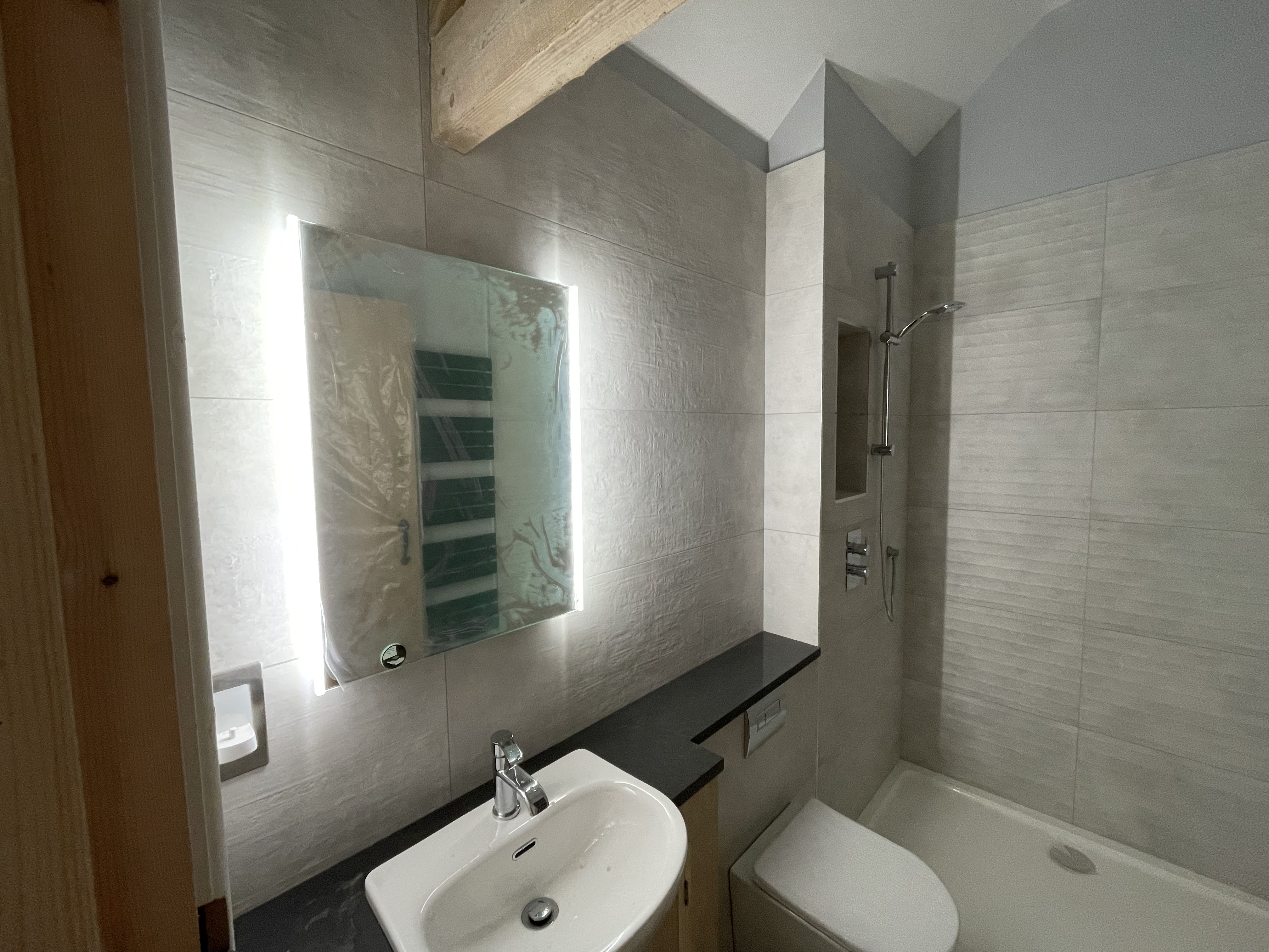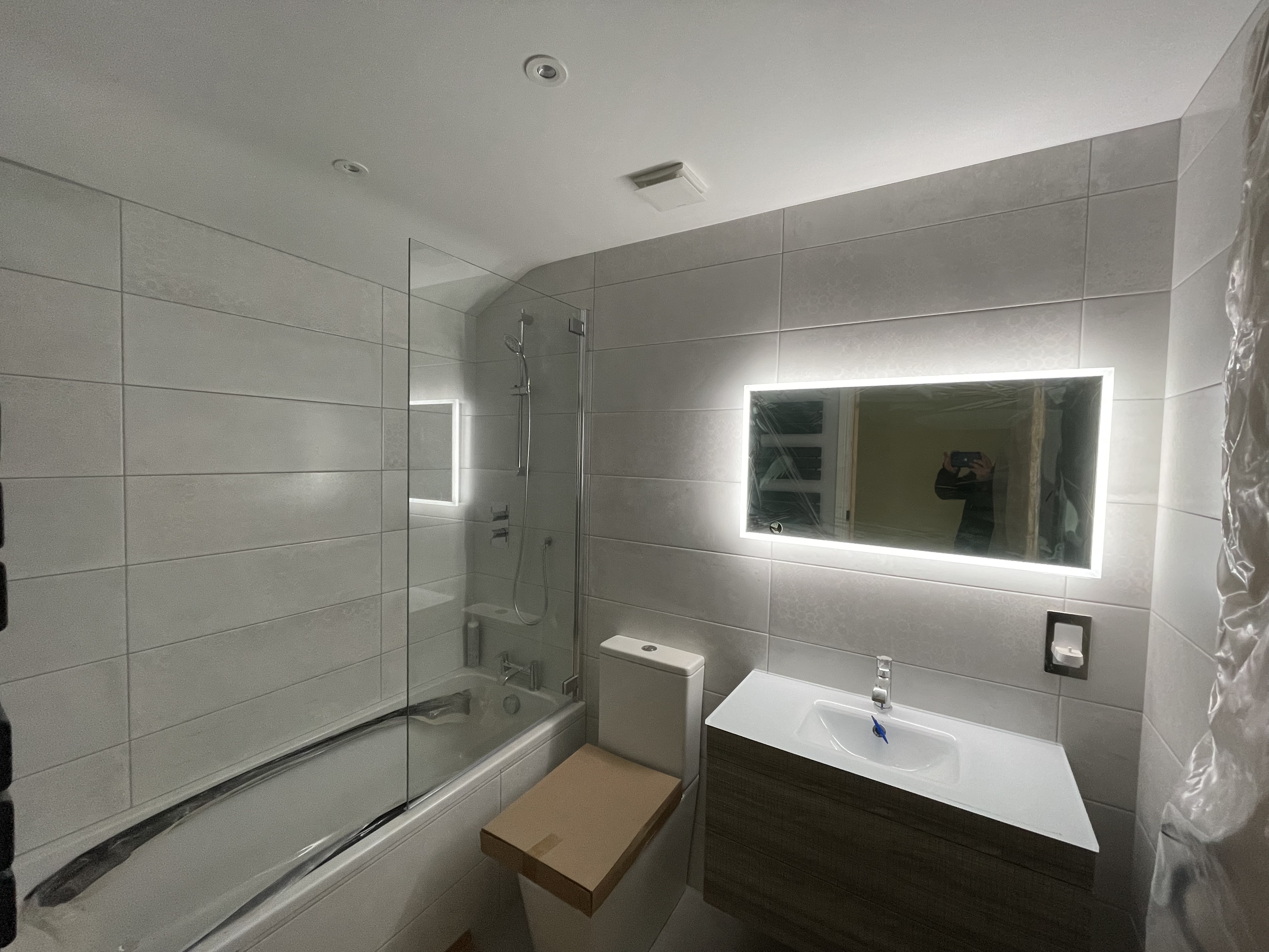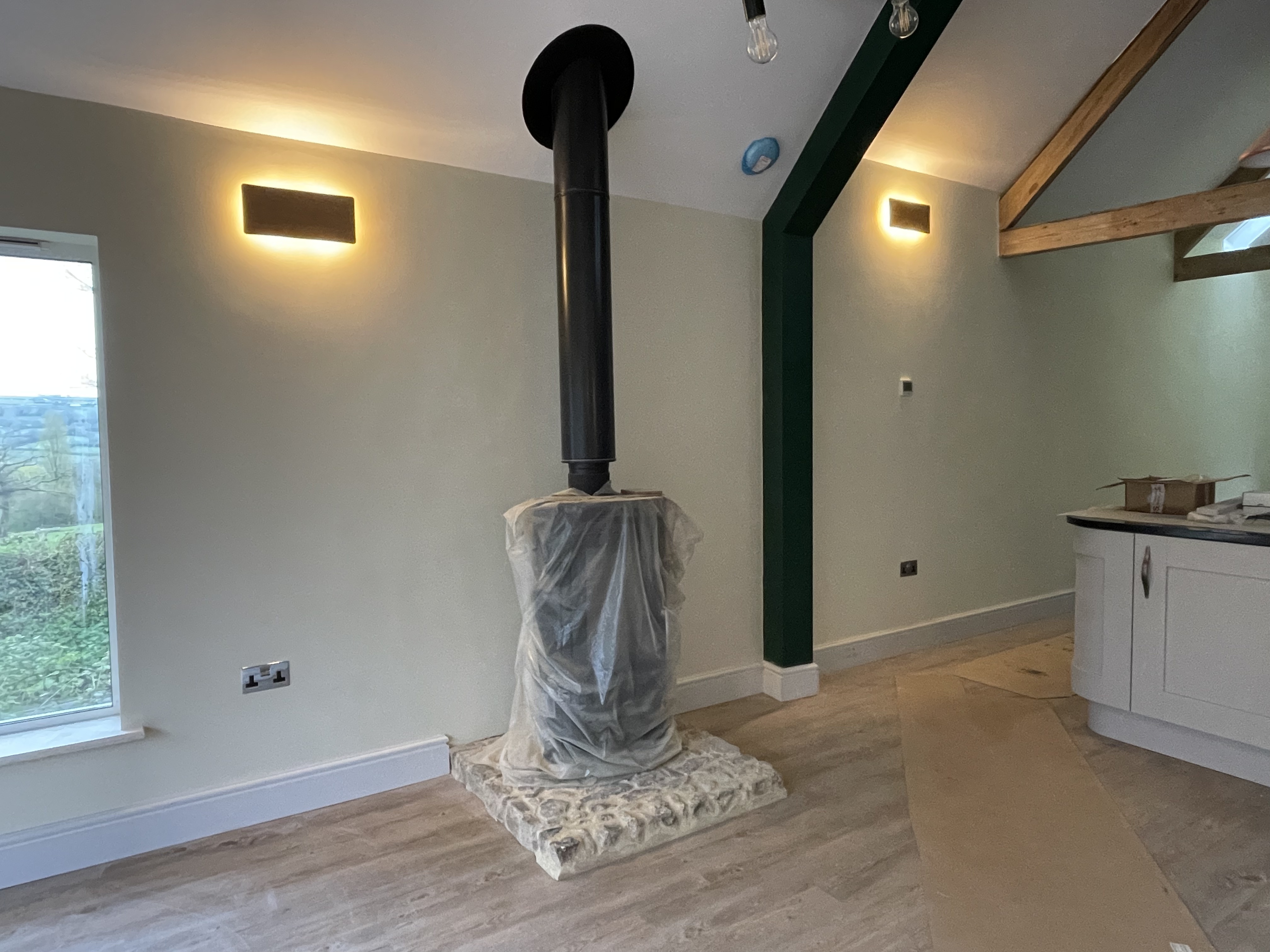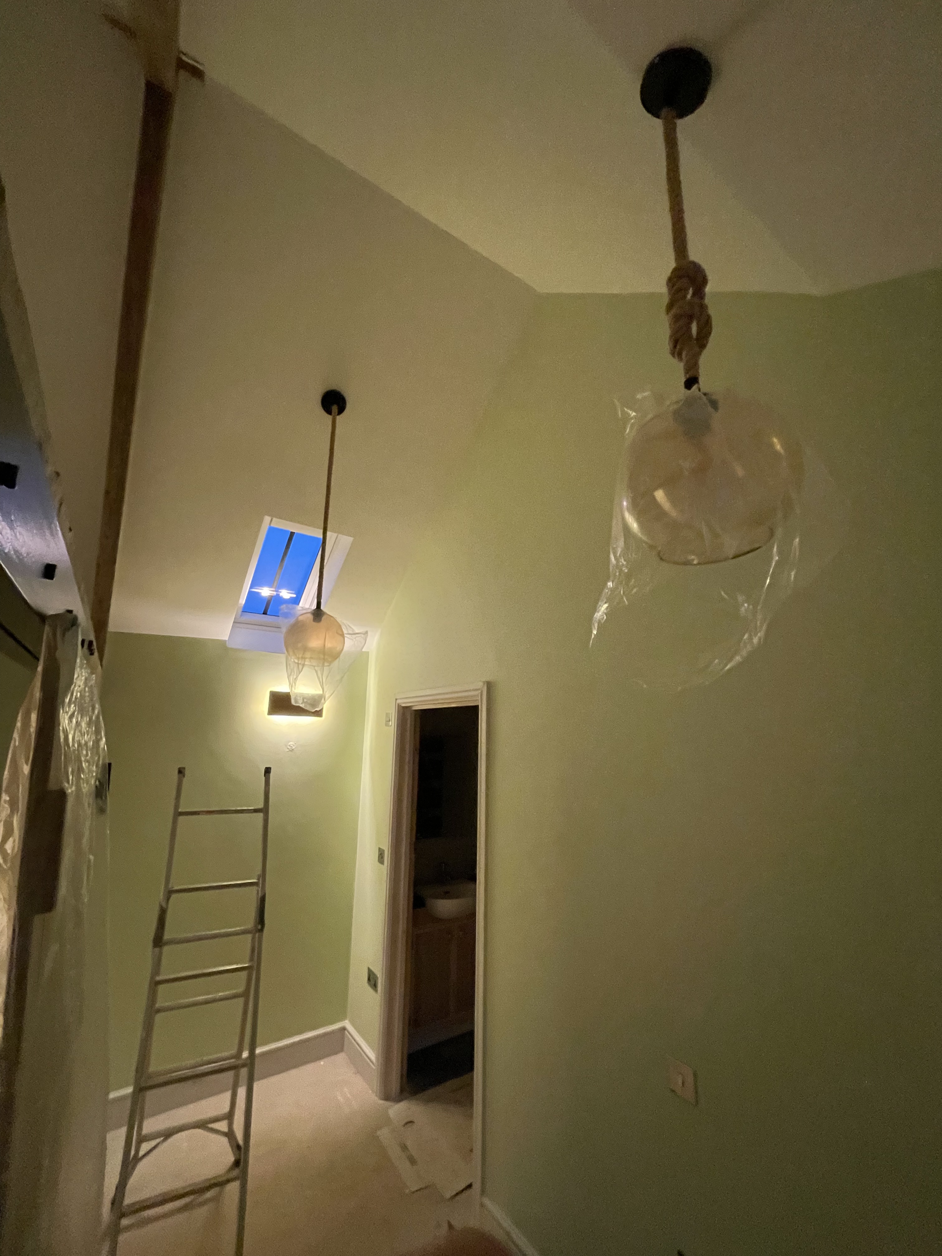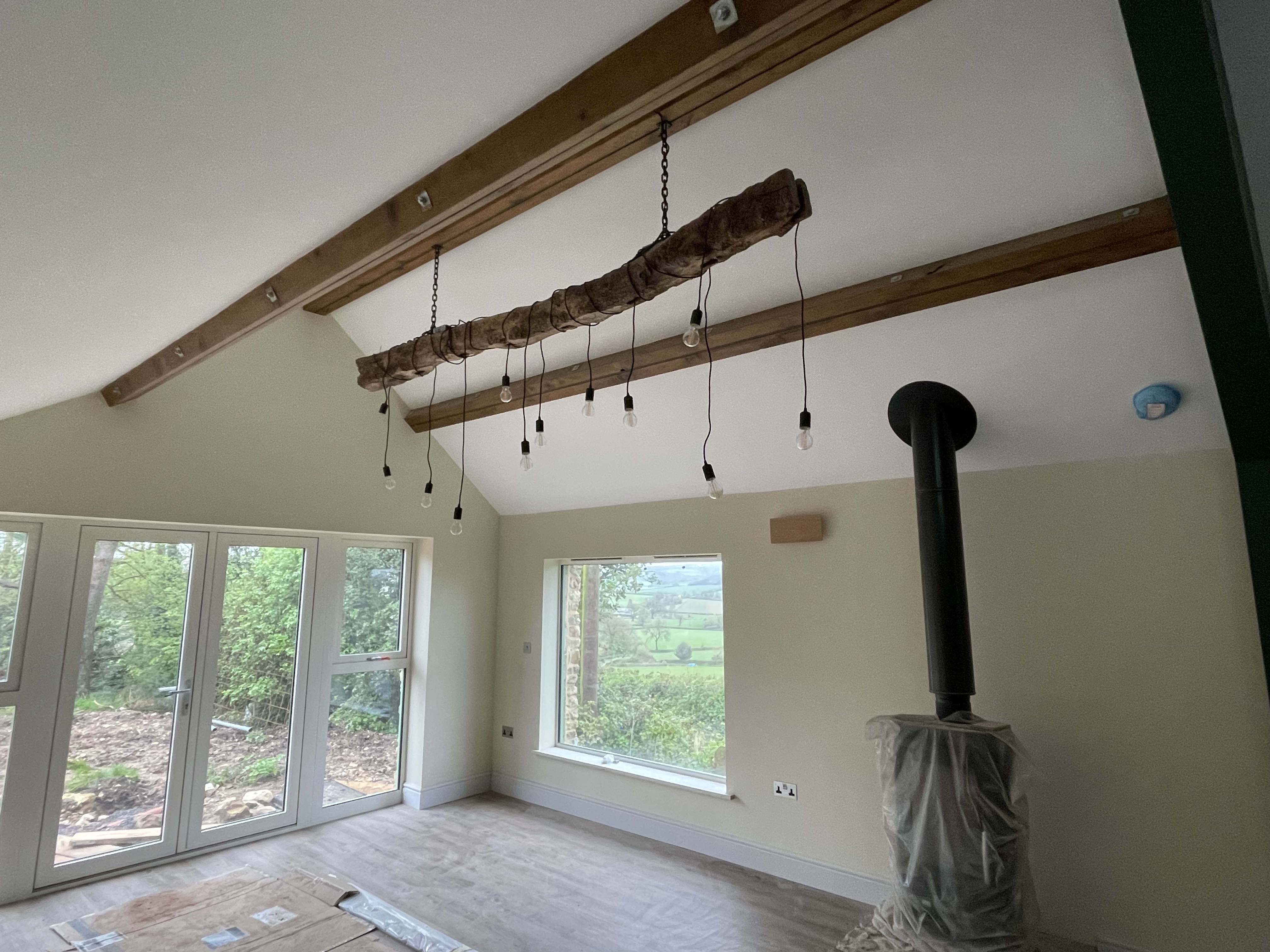 Our electricians have been back in our new house – adding the outside lights, wall lights, bedroom lights and putting lights on our hanging beam in the lounge. They’ve done a temporary job for now so that we can change the height of the lights easily – it’s so exciting to see this coming together from a photo we saw online and a couple of beams we found in the shippon when we first moved in. They’ve also connected up the lights on the mirrors in the bathroom and ensuite, and in the new shower room in the farmhouse. Given the first two rooms don’t have natural light it was important to us to have different lighting options to make it bright but with more subtle options too – and we love the end result.