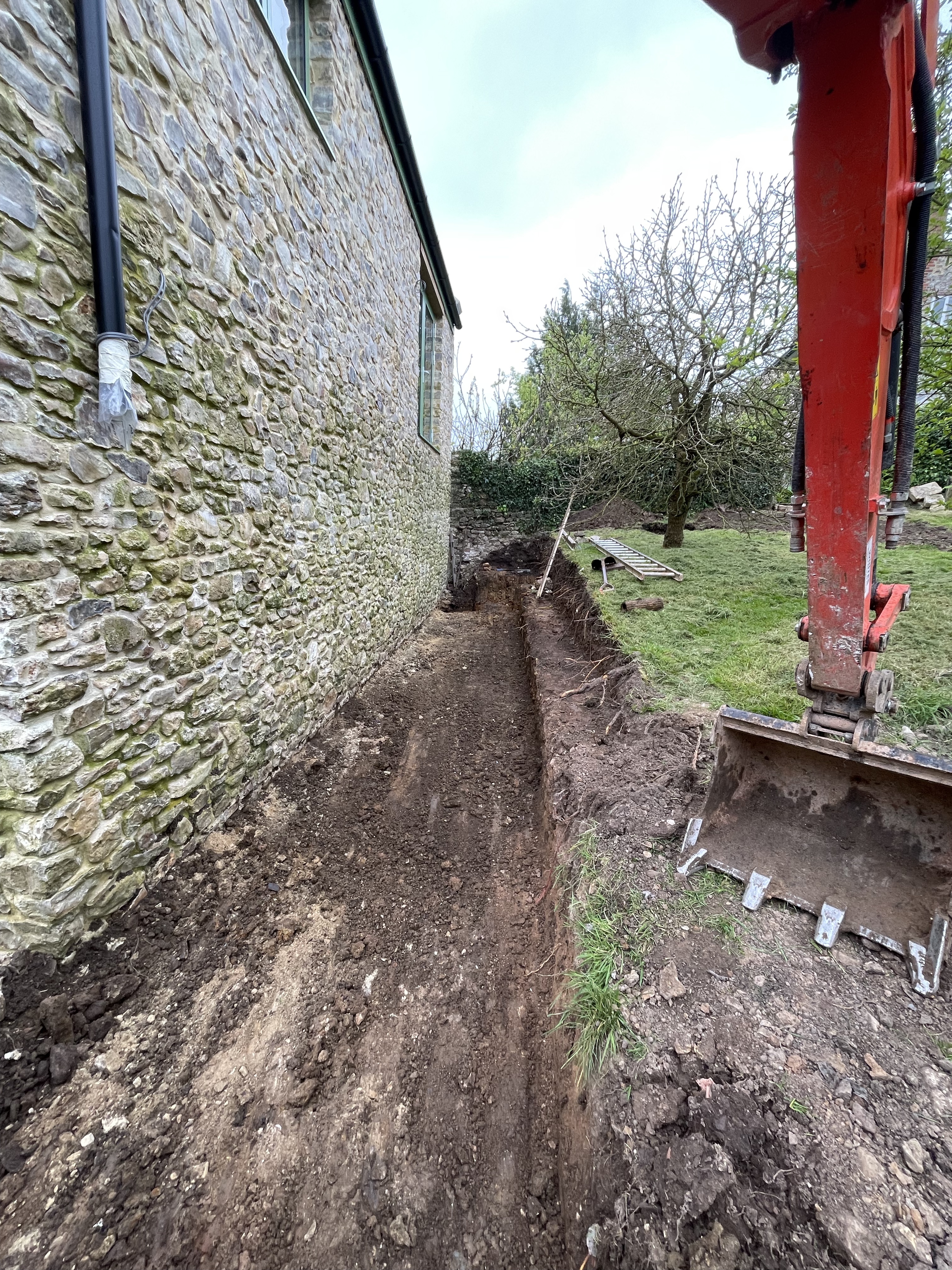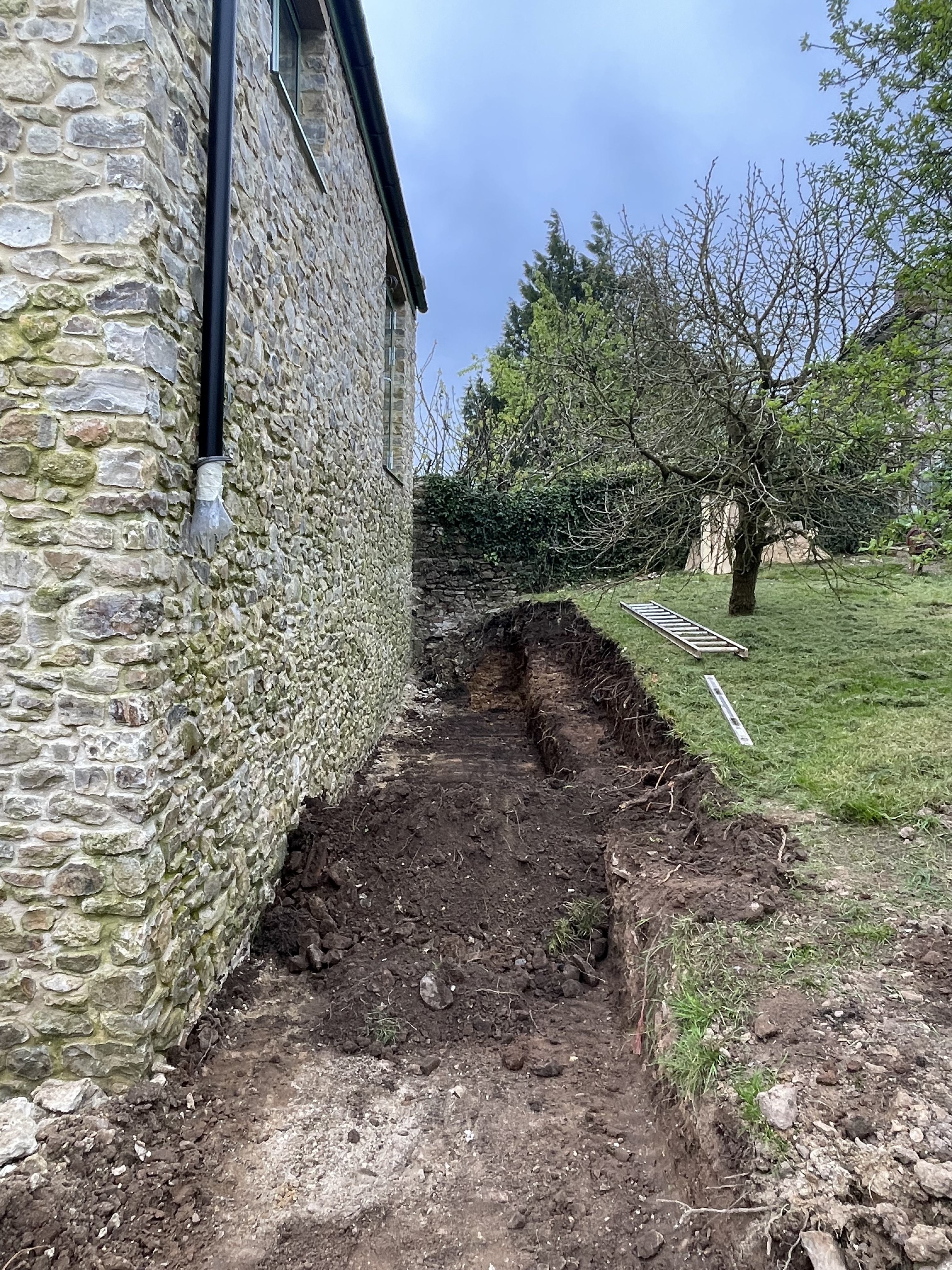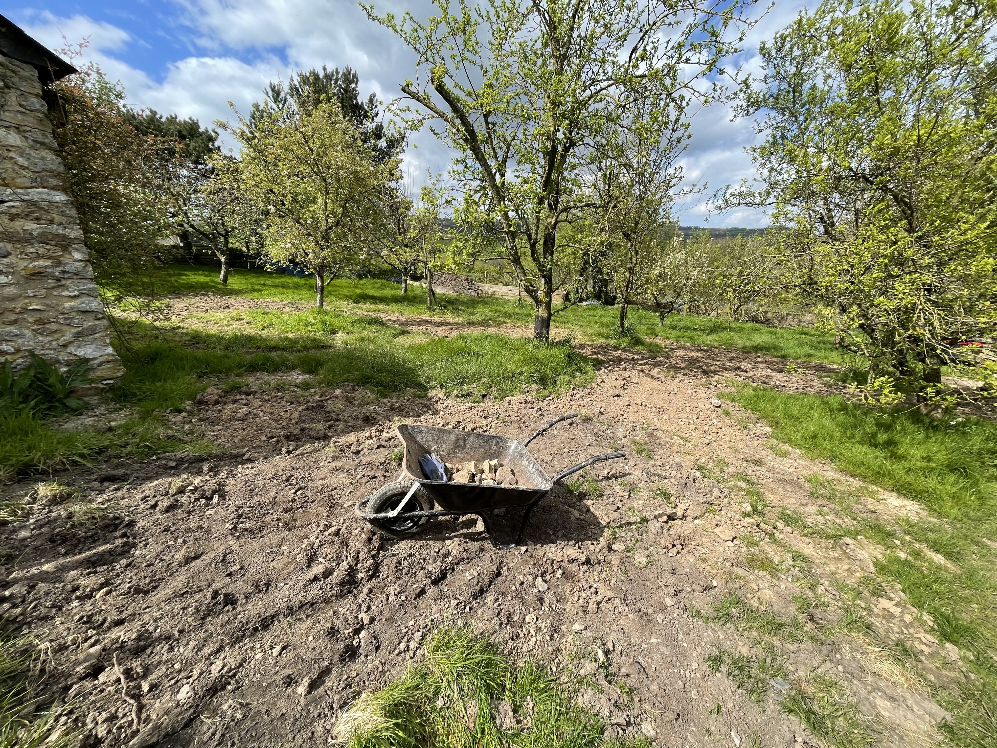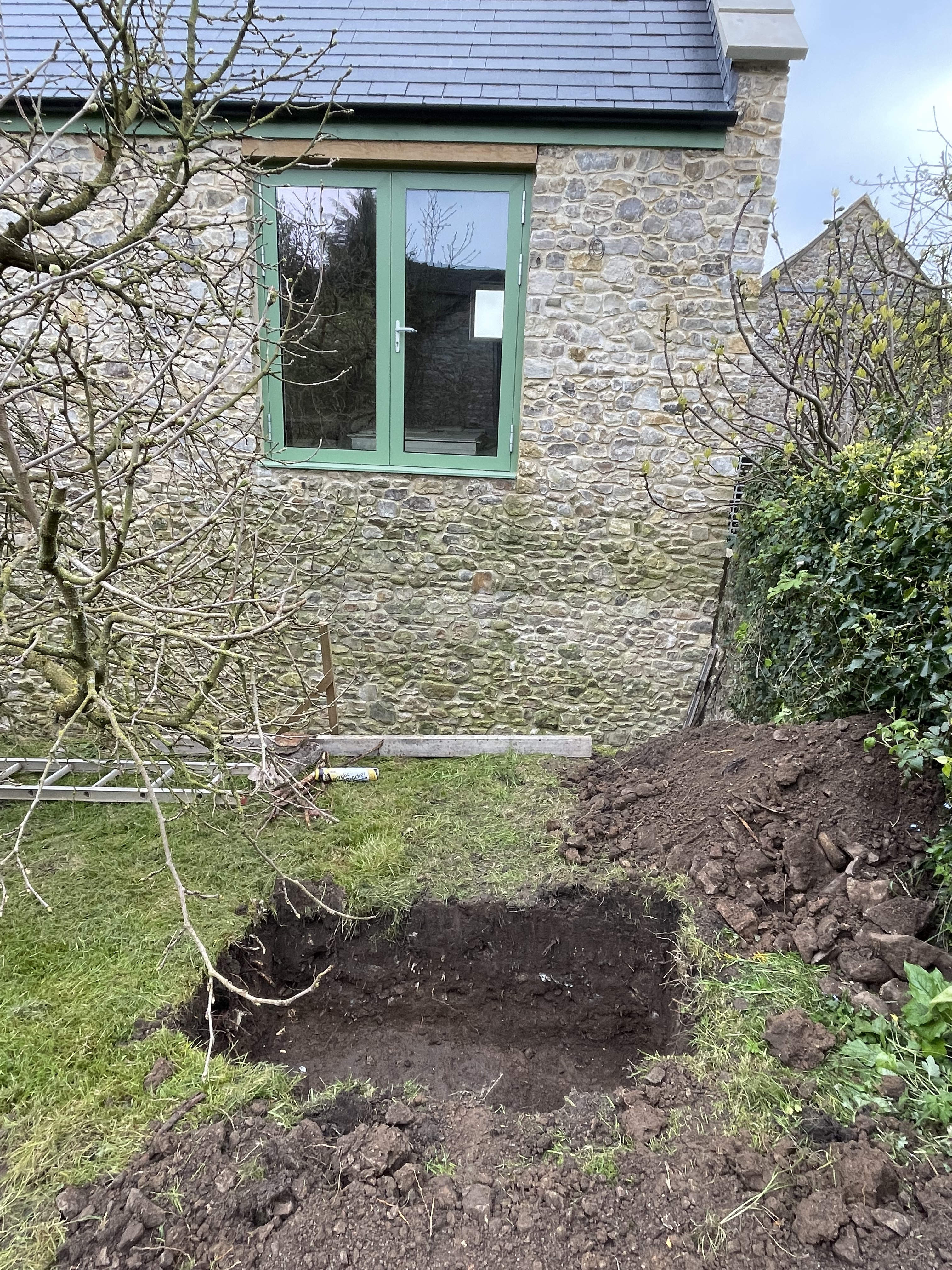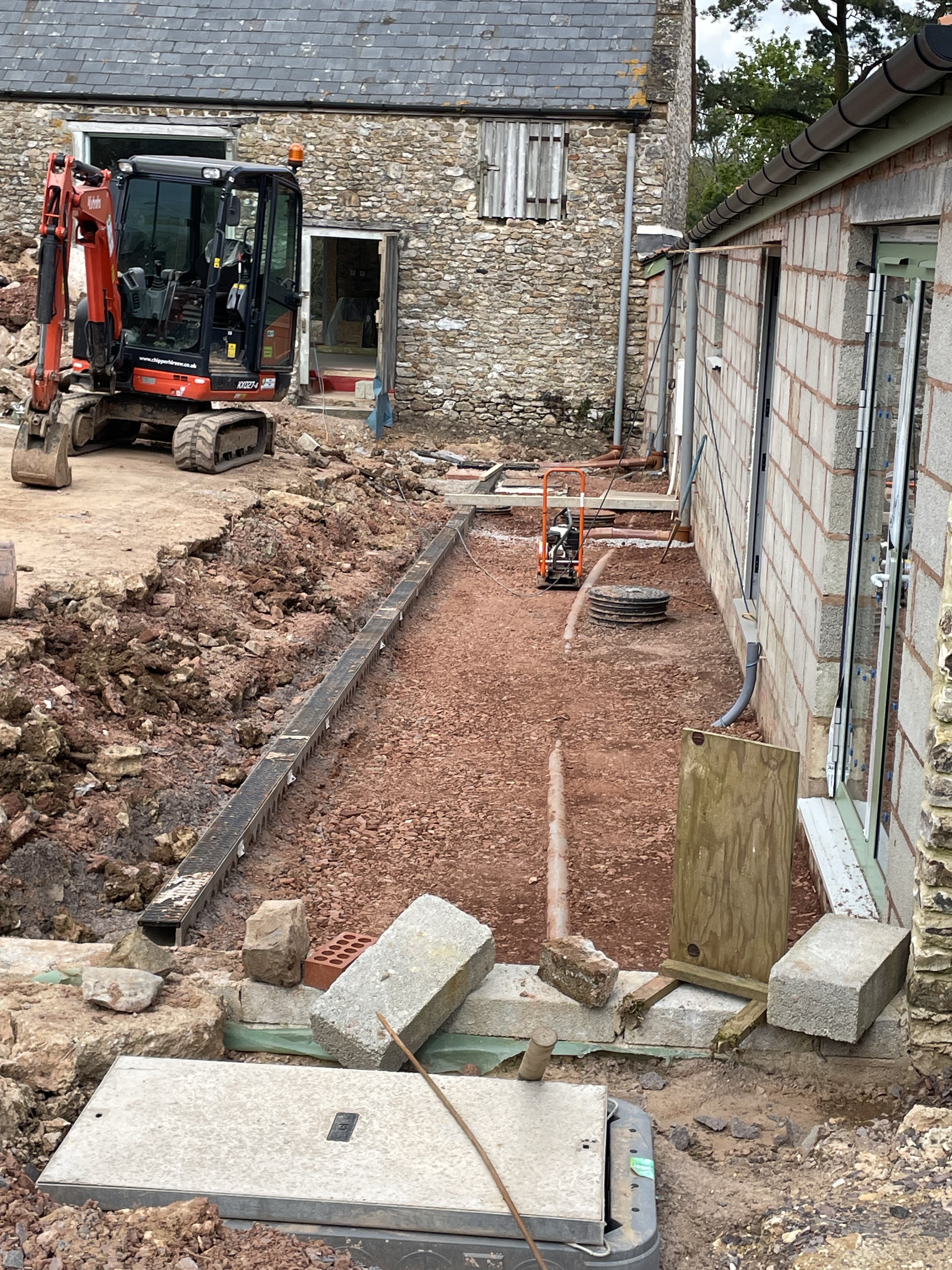 Progress continues with the external works. Another length of aco drain has been installed in front of the shippon (we thought they’d finished this last week!) and our builders have been putting stone down around it ahead of concreting. They’ve also put stone down round the back of the shippon in the areas we’ll be paving first, so it’s a firmer and more stable surface. And the final bit of scaffolding has been taken down at the back of the new barn (which was giving us short-term access to the communal games room) so the area can be prepped ready for the stairs to be installed. They’ll require concrete pads on the ground level and also in the orchard, as we’ll have two flights of stairs – one starting on ground level near the laundry, and another that guests staying at the farmhouse will be able to use. We’re also installing gabion baskets against the orchard bank to stop it collapsing in future, so John has spent a good chunk of Sunday collecting stone from across the site to fill them with.