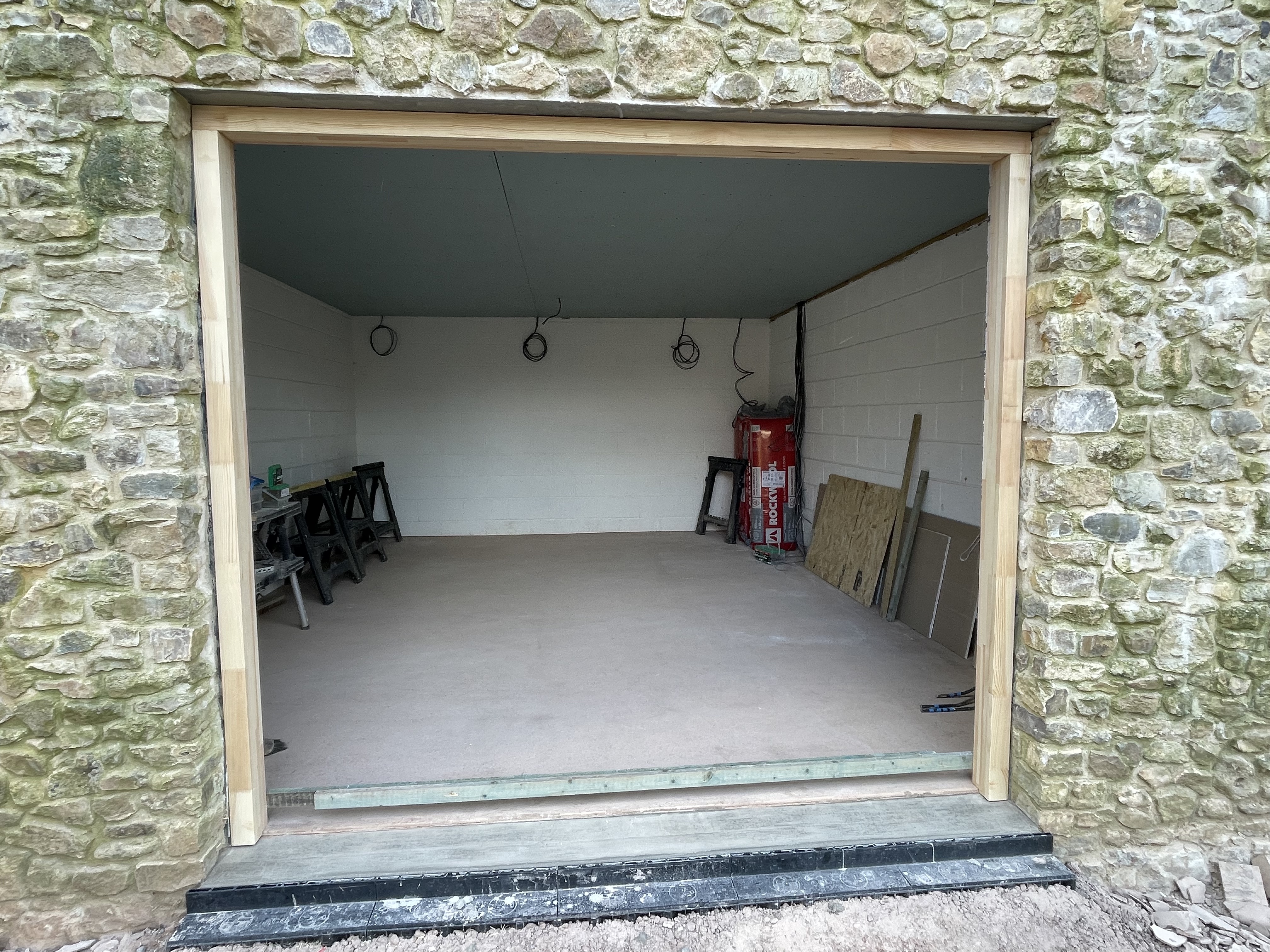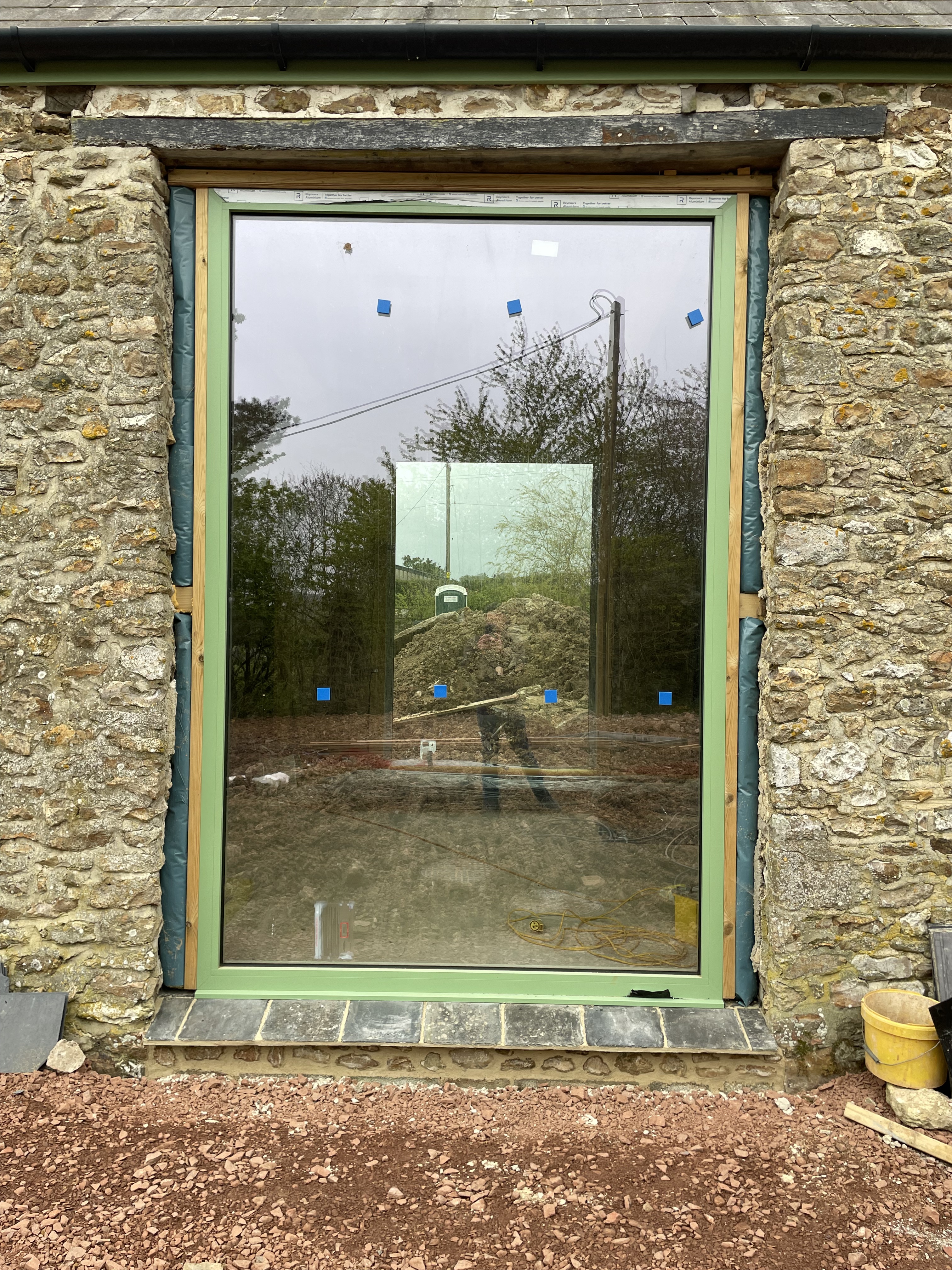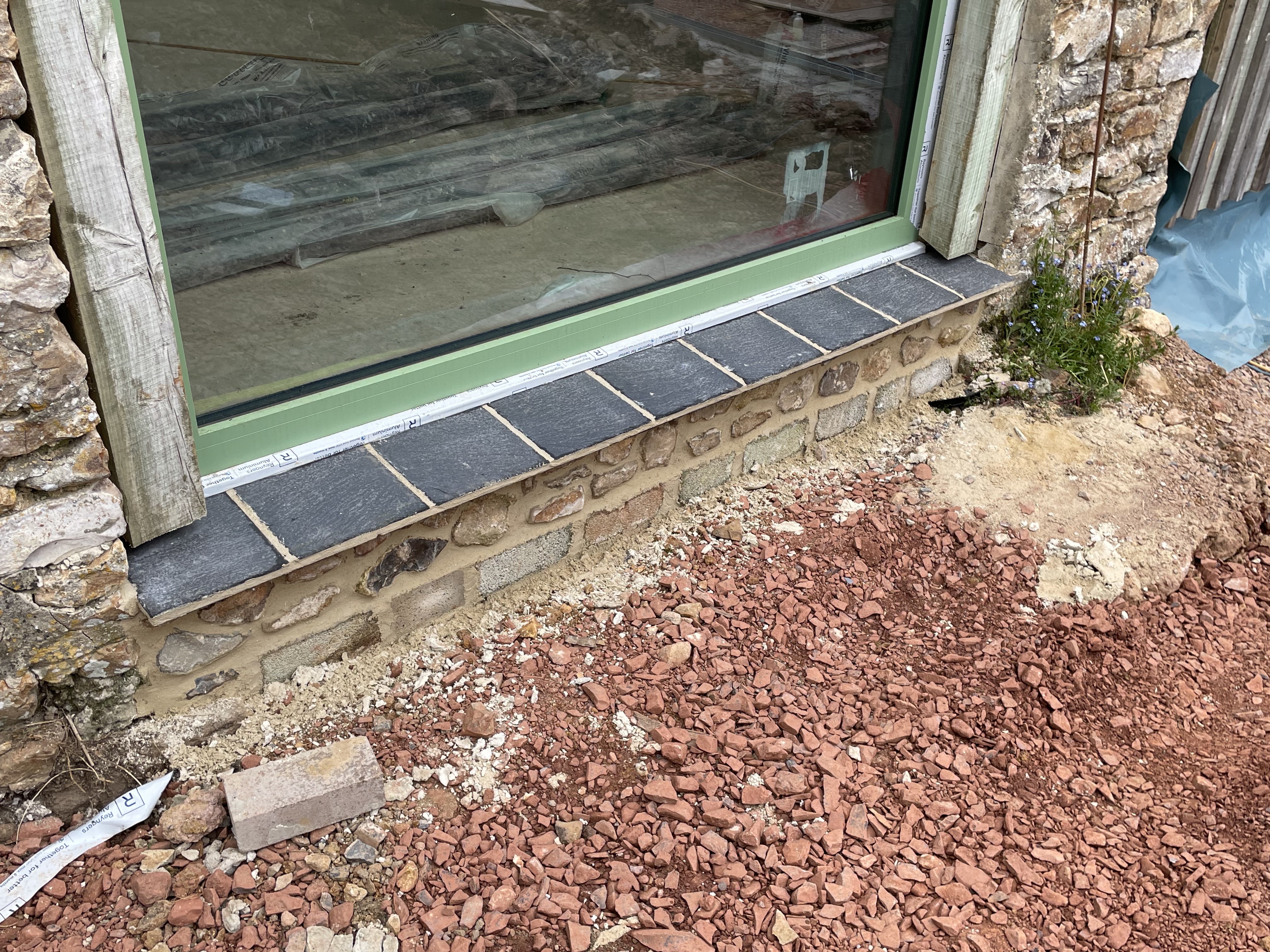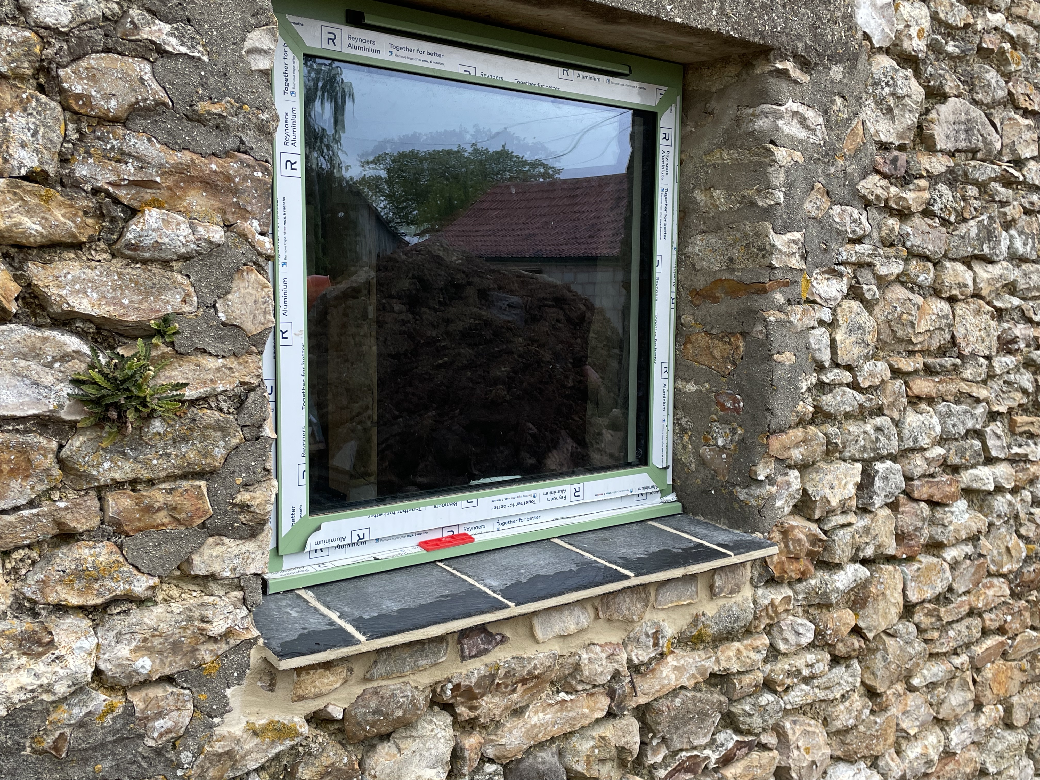 They’ve also added the final weathertight touches to the three-bed barn – now renamed “the Old Barn” seeing as though the new barn (the garage/laundry/communal games room) is now up and running. While the windows were installed a couple of months ago, one of them still had gaps around the window frame that needed to be filled. Our builders have now filled these – the next step will be to cover these with the door frame that was there previously. We want to keep as much of the heritage as possible and as the North-facing wood is thought to be an original fitting, we’re going to make some necessary repairs and put it back in front of the window frame. The slate window sills have now been installed too – our builders have done a fantastic job with these.