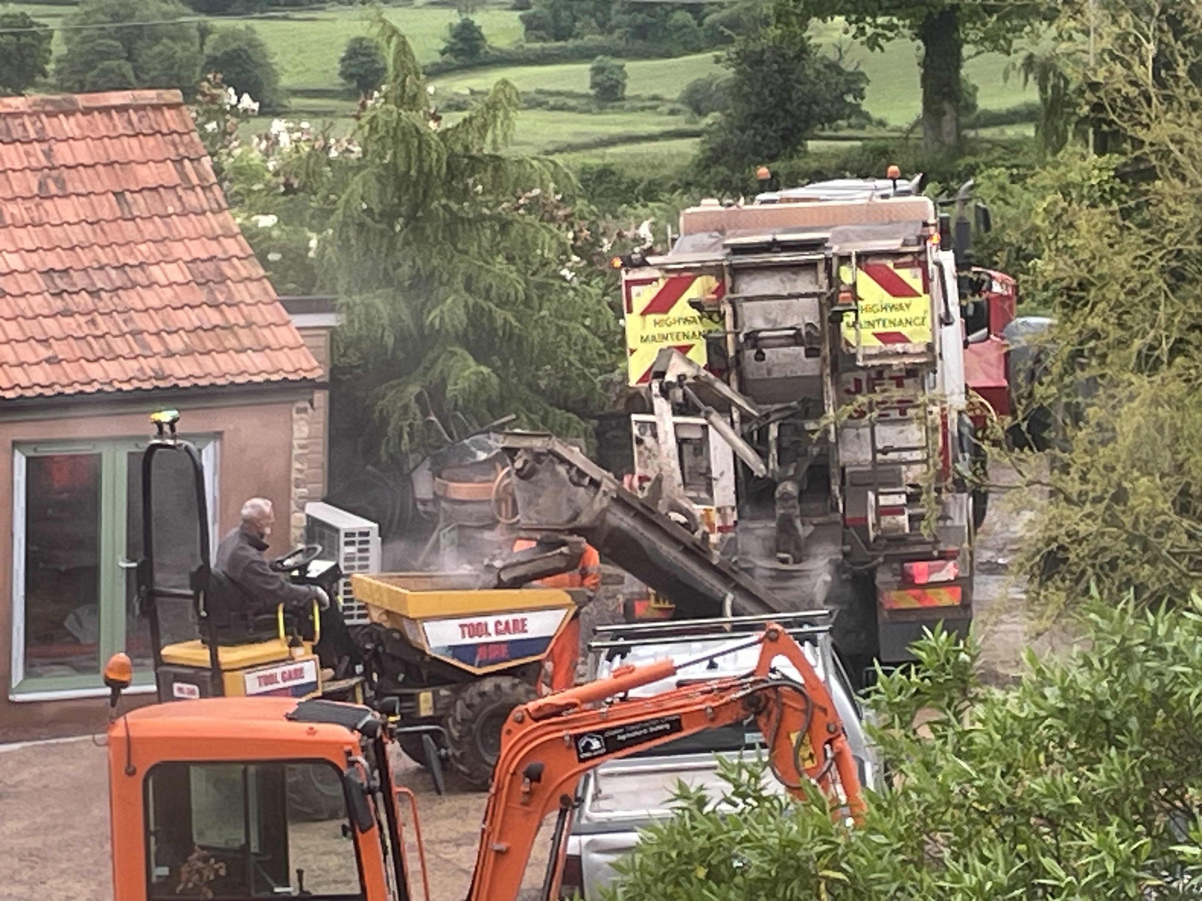 Early Tuesday morning our concrete contractors arrived with two big diggers and a large trailer. They spent the week breaking up most of the existing concrete in the yard and carting it away, before laying stone down to create a flatter firmer surface. Our builders have put shuttering all around the outside of the area to be concreted except where it meets the existing concrete, where they’ve cut a nice clean edge to make it easier to link the old with the new. Frustratingly we’re having to replace most of the concrete in the yard because the council wouldn’t let us build a small wall to protect the shippon from water flowing down the yard. Instead we’ve had to add an aco drain about a metre before the shippon and slope the concrete from the building down to it so any overflow water is taken away before reaching the shippon. This means we’ve had to take up more of the remaining yard than if we’d had a wall – the aco drain is lower than the previous level was and further into the yard so we need to create a steeper slope down to it. Had we kept most of the existing concrete it would have left some very strange gradients and been difficult to drive on. More time and more cost just to keep the area looking like a farmyard – the joys of living on a curtilage listed site.