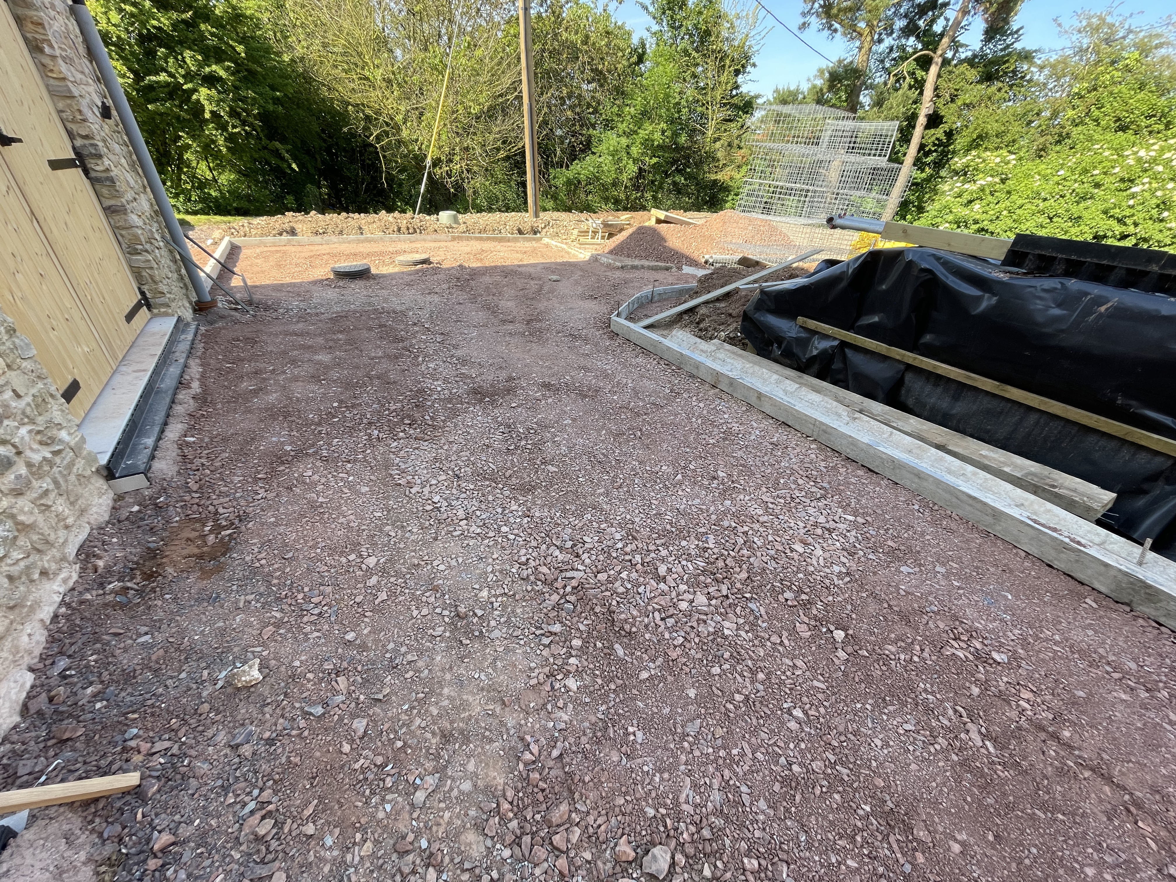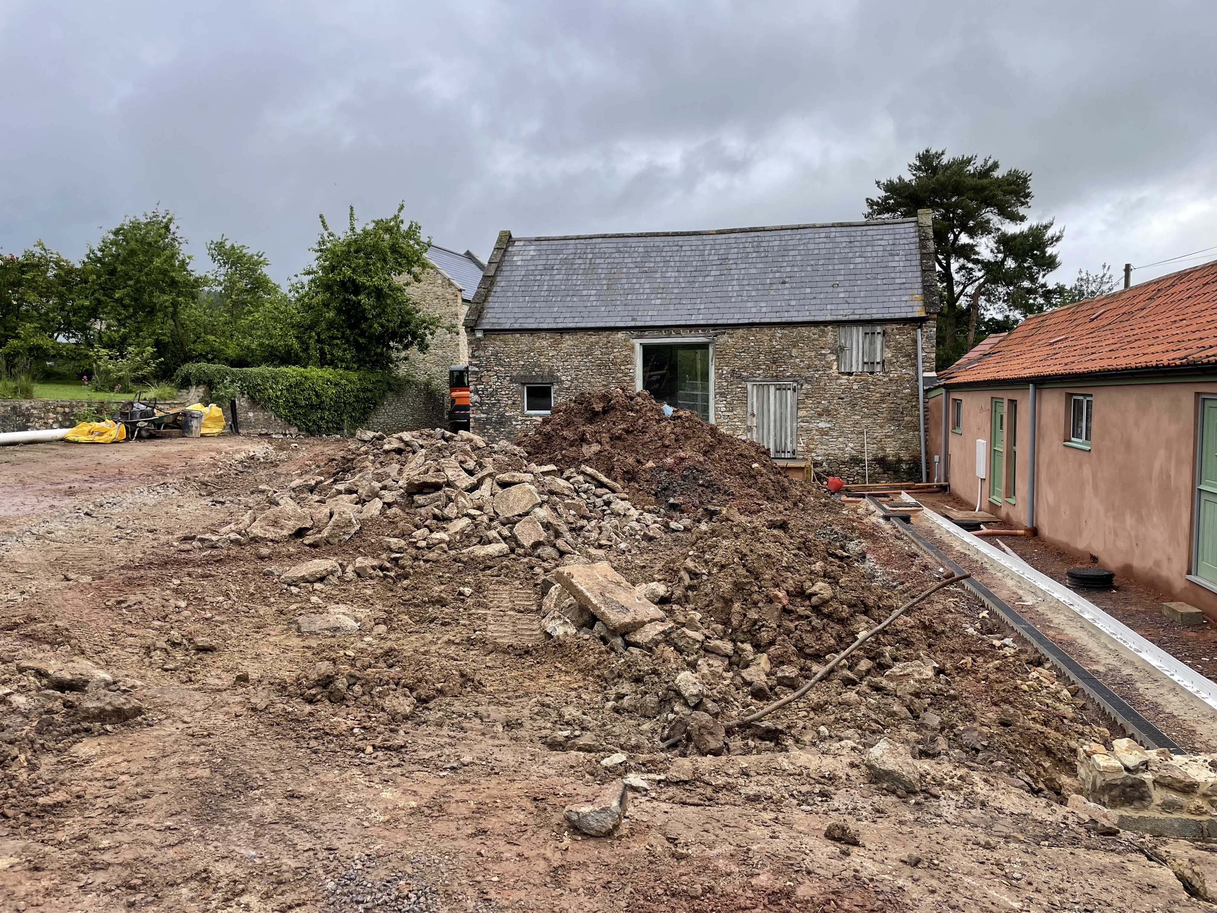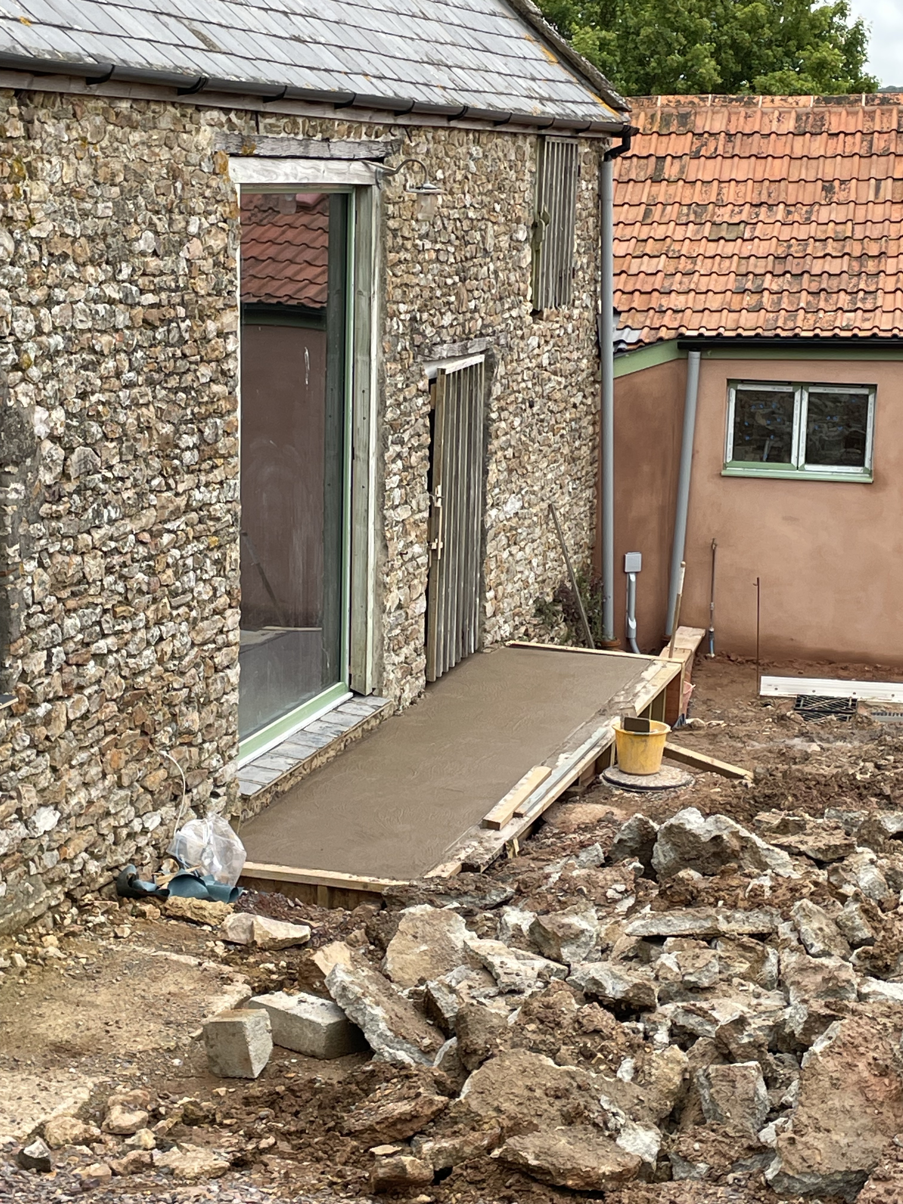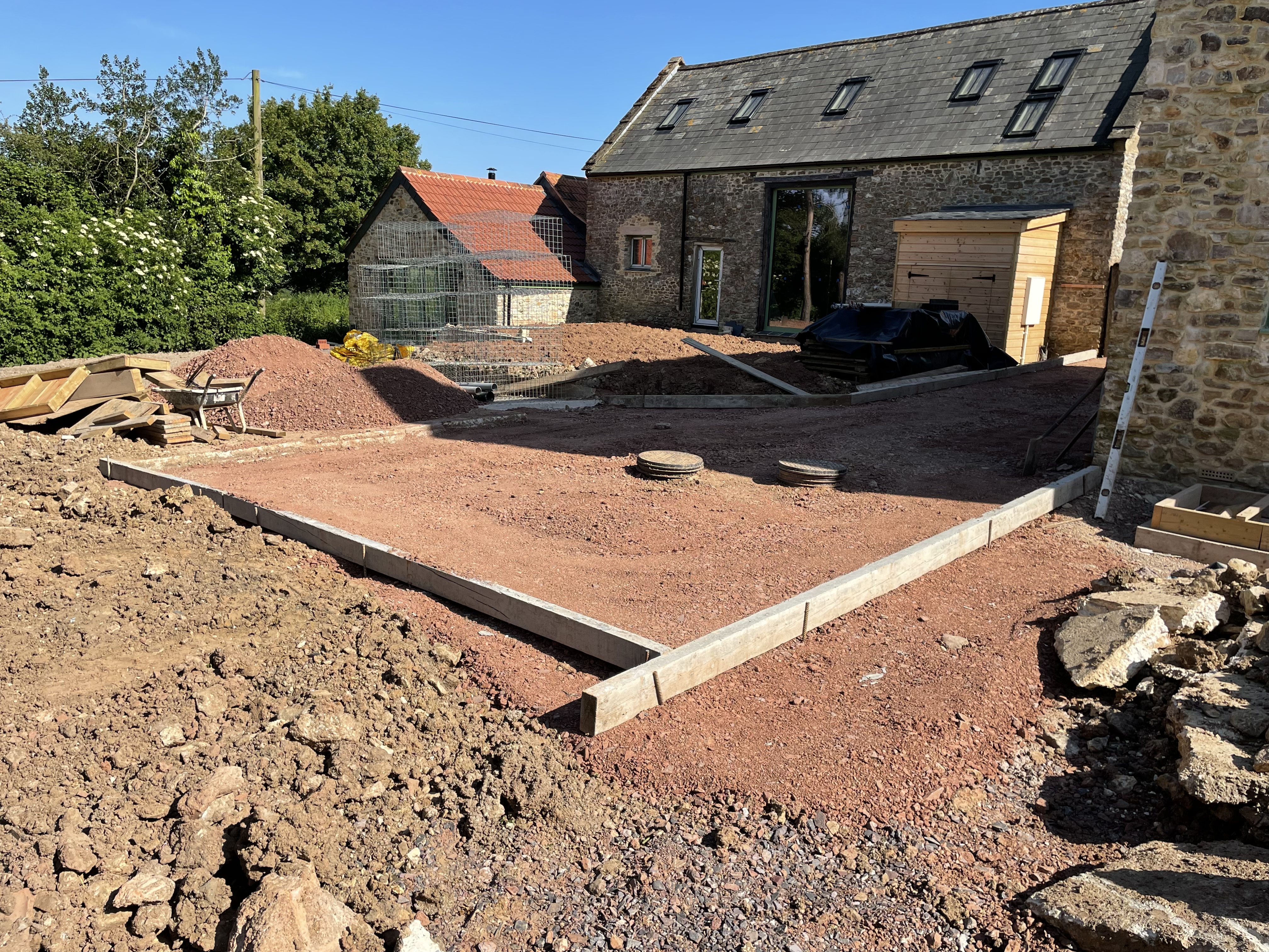 Our builder has been busy concreting various smaller parts of the site in preparation for the main concreting work. He’s created the ramp up to the three-bed barn, which he built the shuttering for last week. It’s the only part of the yard which isn’t flat because without it, we wouldn’t be able to have step-free access into the building and it wouldn’t pass building regulations. And he’s concreted the base of our external dog shower and added shuttering around the top so that when the new concrete is poured it creates a hole that we can fill with pebbles for a nice clean look. He’s also concreted the ducts in for the EV chargers – we’re only installing one for now but wanted to future-proof the site as much as possible to minimise disruptive building work required when we have guests staying.