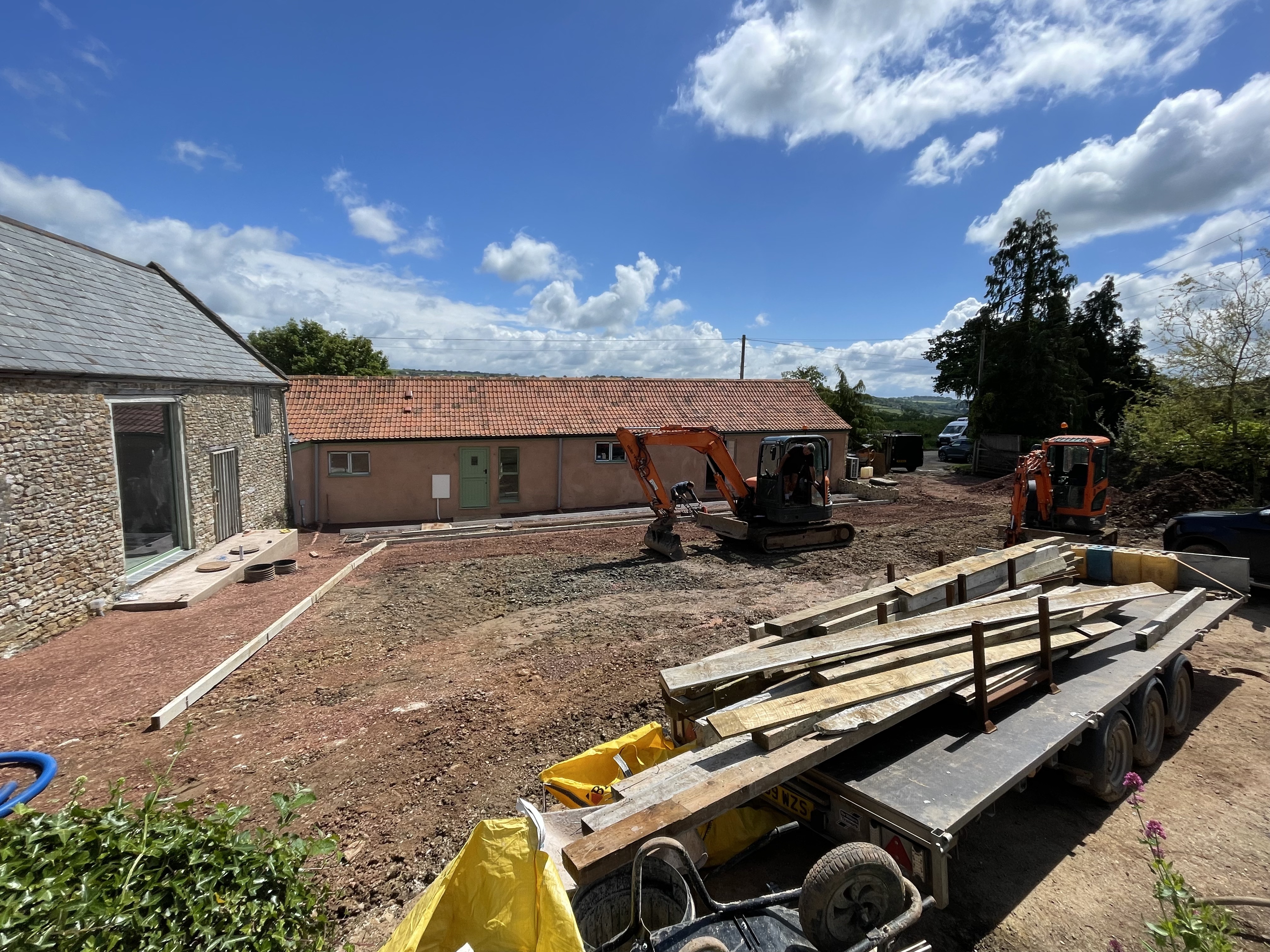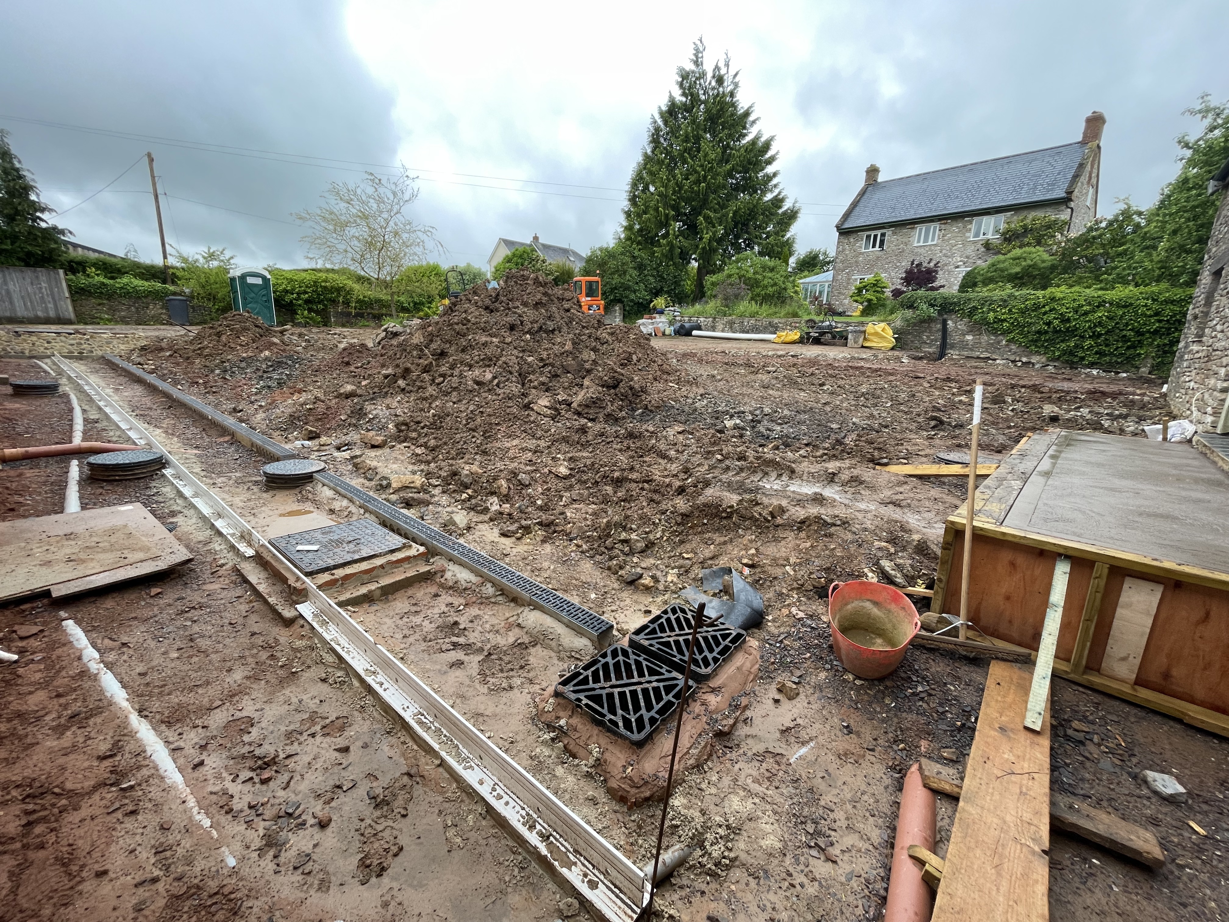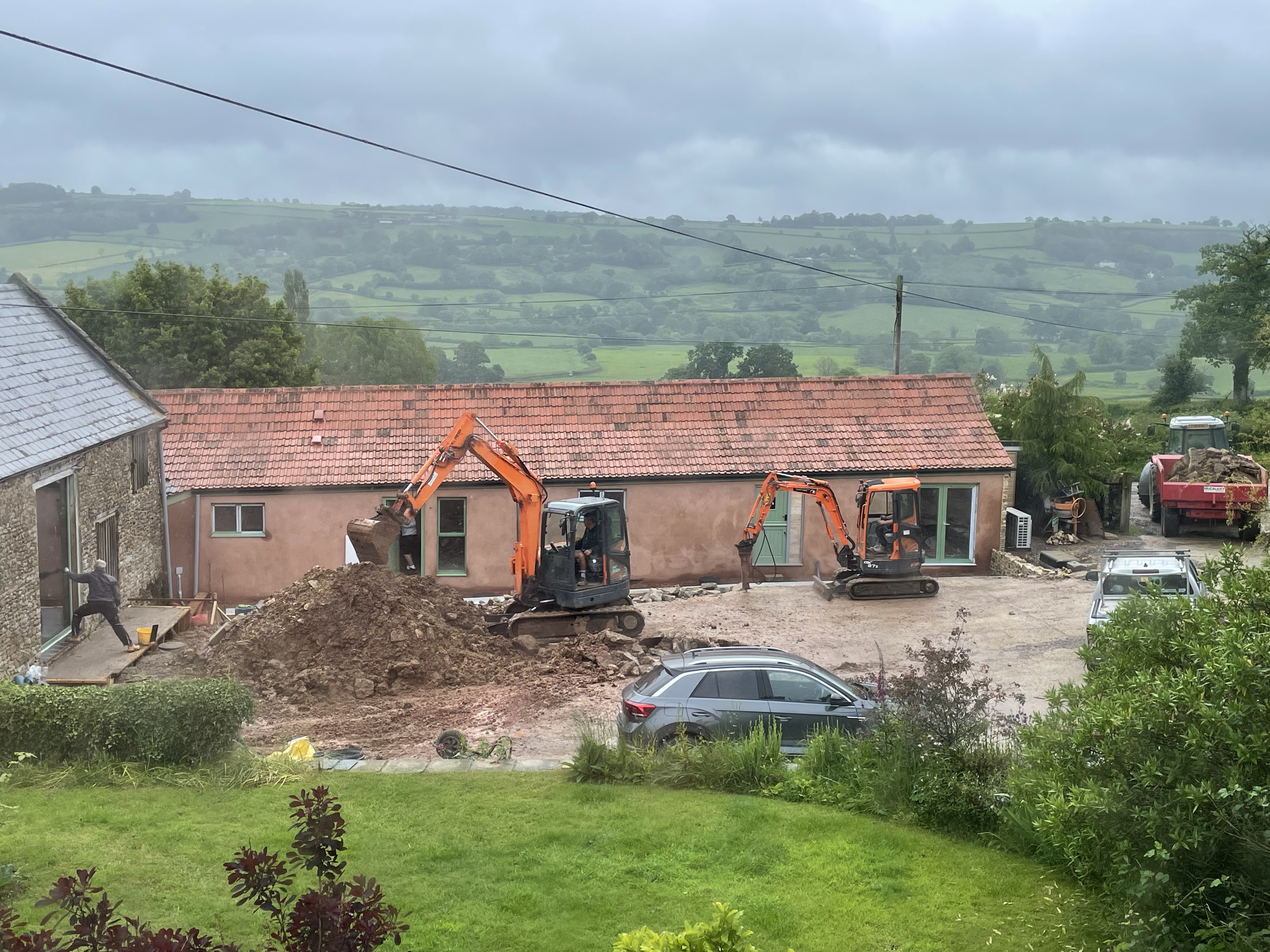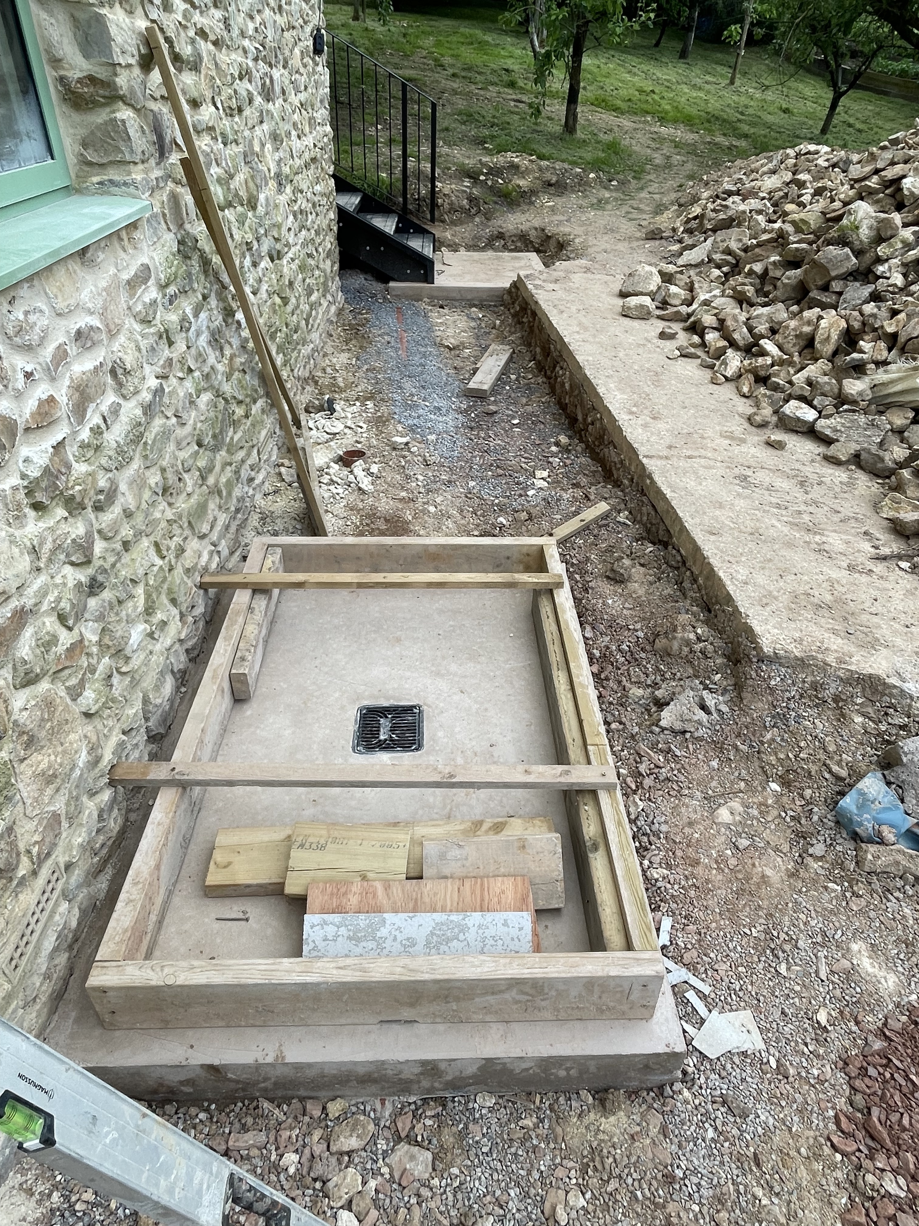 Our builder has been busy concreting various smaller parts of the site in preparation for the main concreting work. He’s created the ramp up to the three-bed barn, which he built the shuttering for last week. It’s the only part of the yard which isn’t flat because without it, we wouldn’t be able to have step-free access into the building and it wouldn’t pass building regulations. And he’s concreted the base of our external dog shower and added shuttering around the top so that when the new concrete is poured it creates a hole that we can fill with pebbles for a nice clean look. He’s also concreted the ducts in for the EV chargers – we’re only installing one for now but wanted to future-proof the site as much as possible to minimise disruptive building work required when we have guests staying.