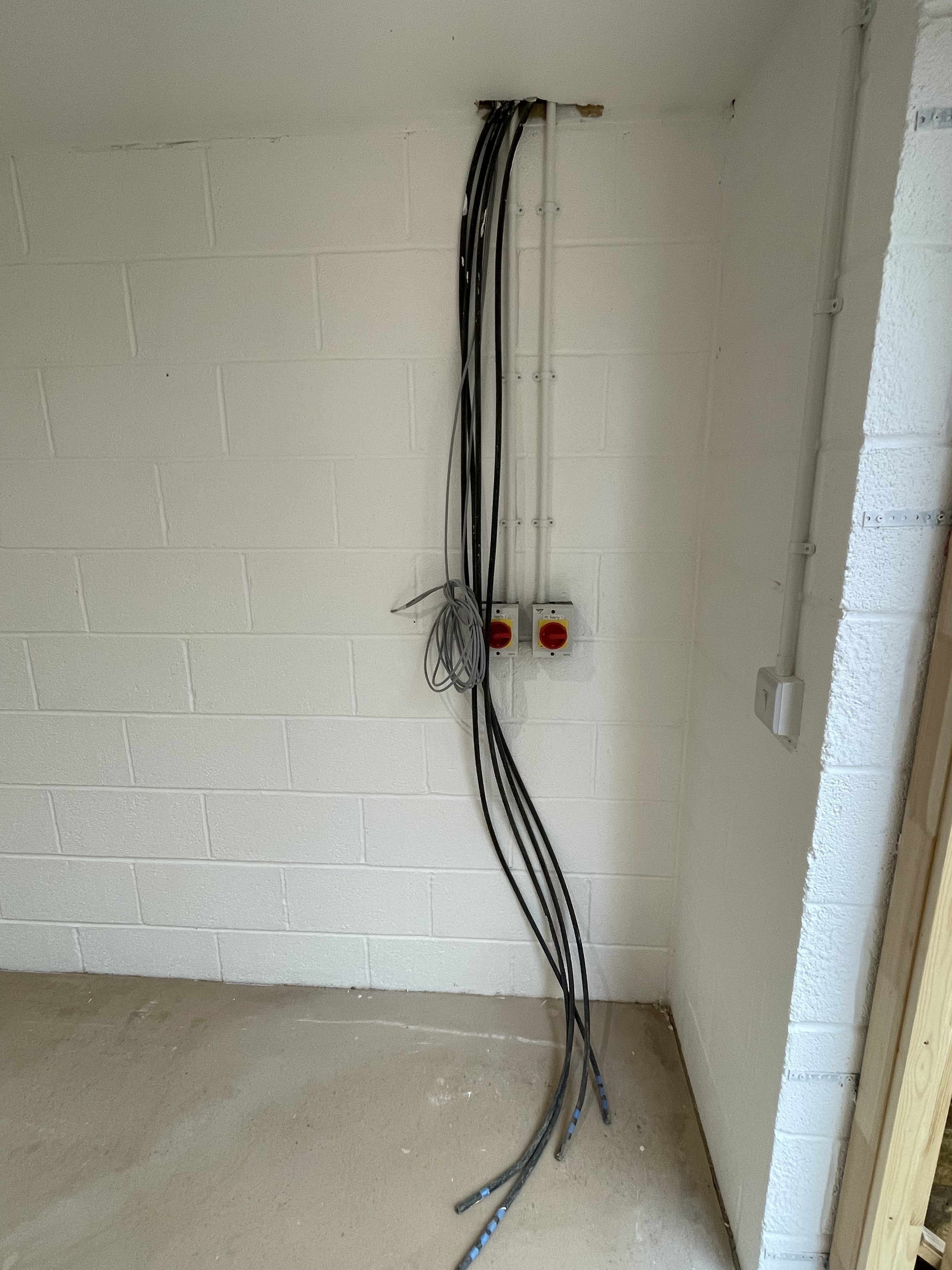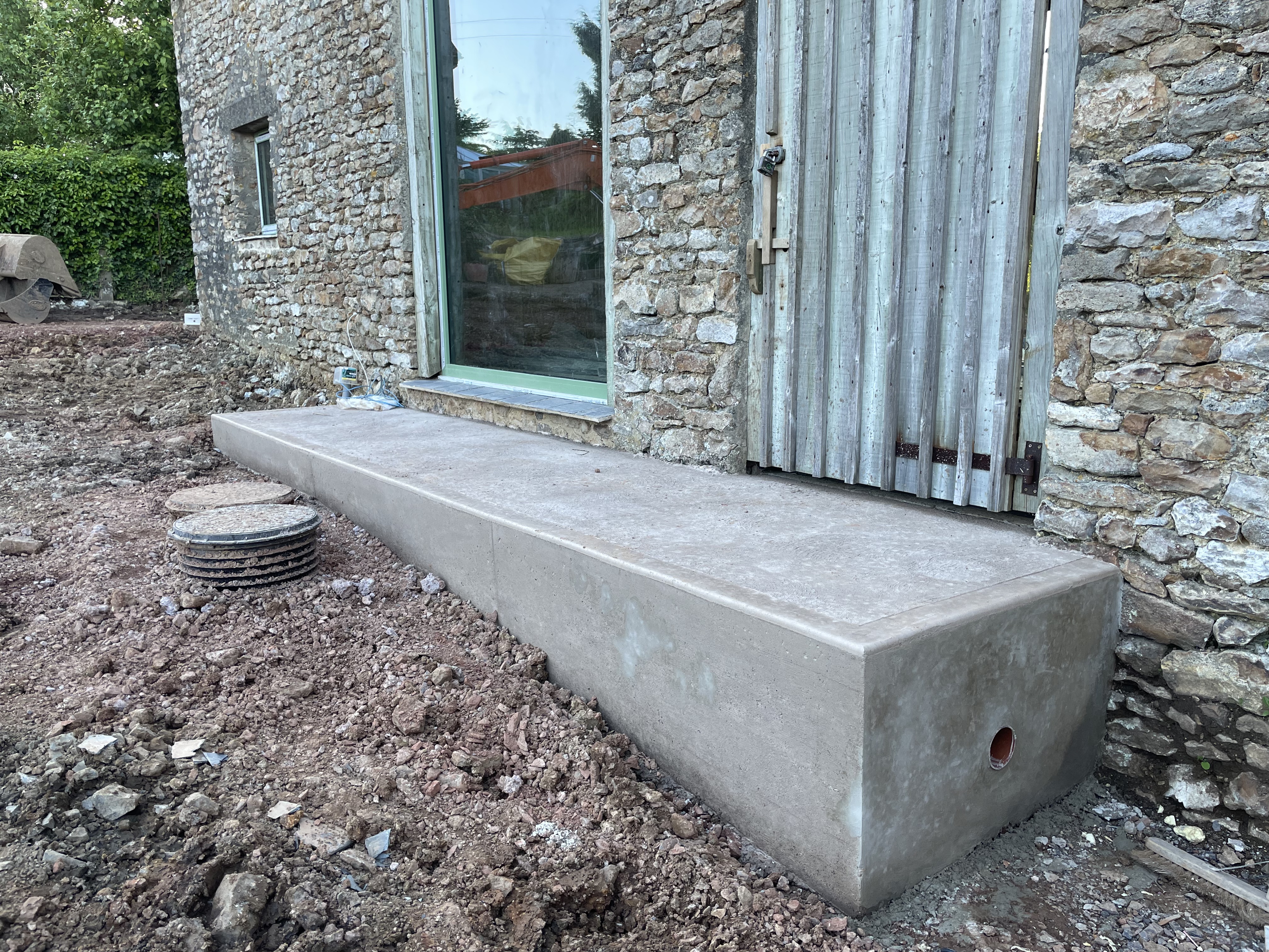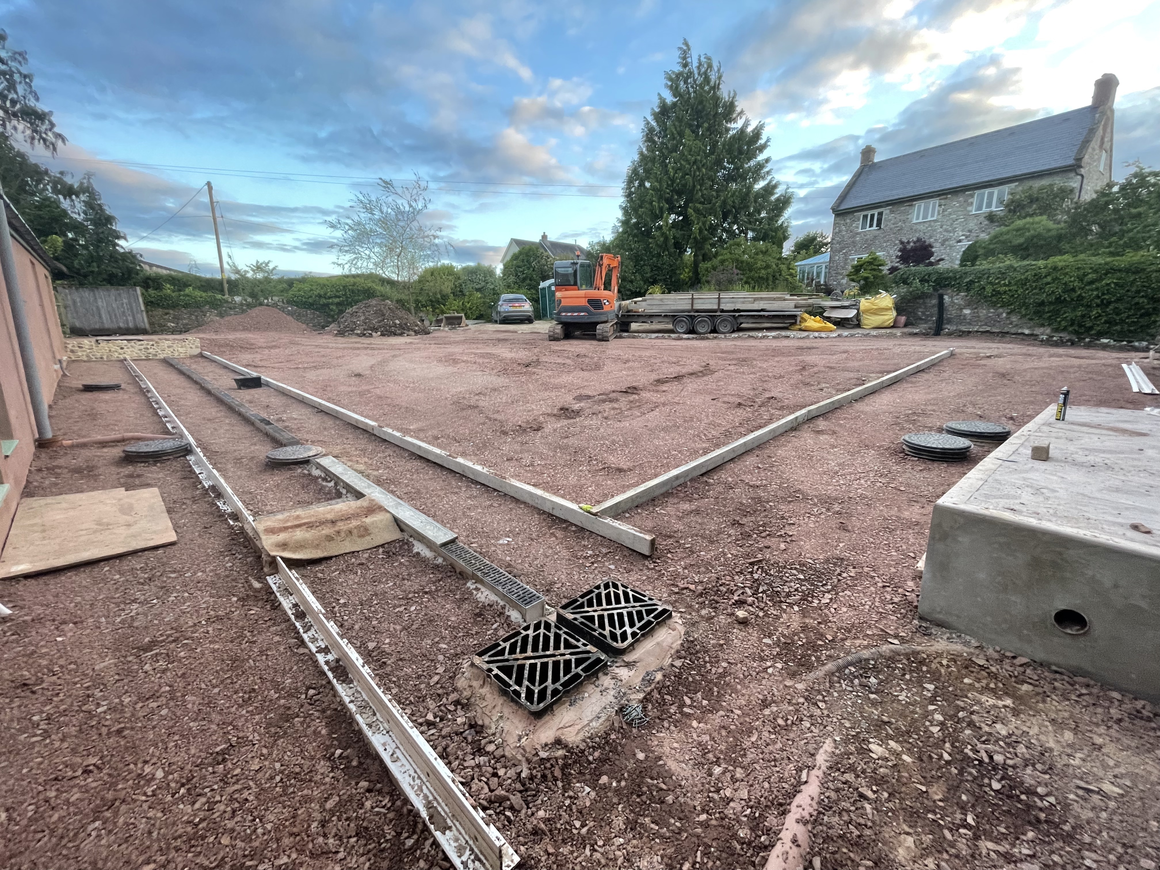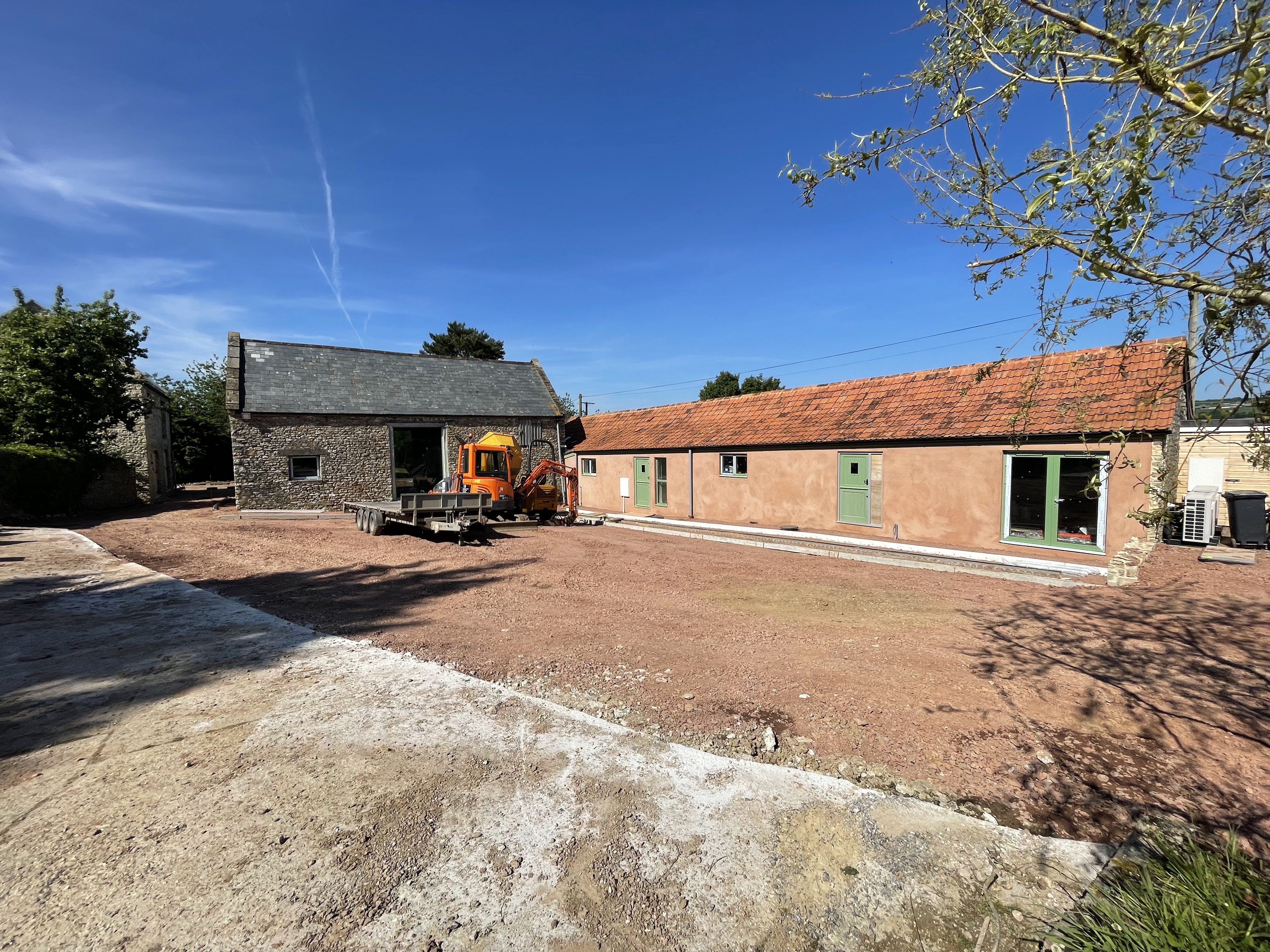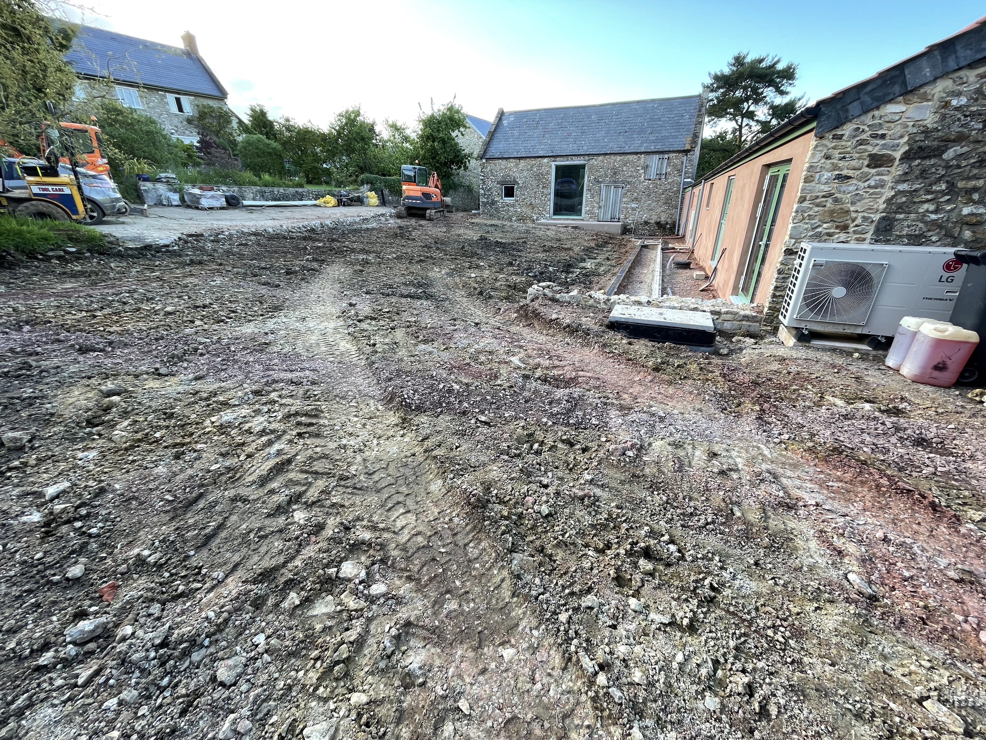 Our builder has been busy concreting various smaller parts of the site in preparation for the main concreting work. He’s created the ramp up to the three-bed barn, which he built the shuttering for last week. It’s the only part of the yard which isn’t flat because without it, we wouldn’t be able to have step-free access into the building and it wouldn’t pass building regulations. And he’s concreted the base of our external dog shower and added shuttering around the top so that when the new concrete is poured it creates a hole that we can fill with pebbles for a nice clean look. He’s also concreted the ducts in for the EV chargers – we’re only installing one for now but wanted to future-proof the site as much as possible to minimise disruptive building work required when we have guests staying.