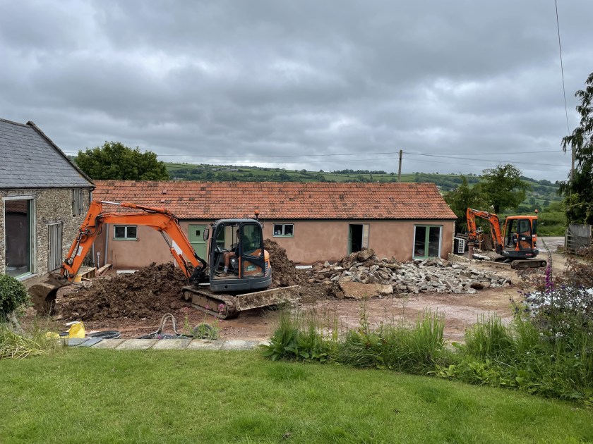 Our builder has been busy concreting various smaller parts of the site in preparation for the main concreting work. He’s created the ramp up to the three-bed barn, which he built the shuttering for last week. It’s the only part of the yard which isn’t flat because without it, we wouldn’t be able to have step-free access into the building and it wouldn’t pass building regulations. And he’s concreted the base of our external dog shower and added shuttering around the top so that when the new concrete is poured it creates a hole that we can fill with pebbles for a nice clean look. He’s also concreted the ducts in for the EV chargers – we’re only installing one for now but wanted to future-proof the site as much as possible to minimise disruptive building work required when we have guests staying.