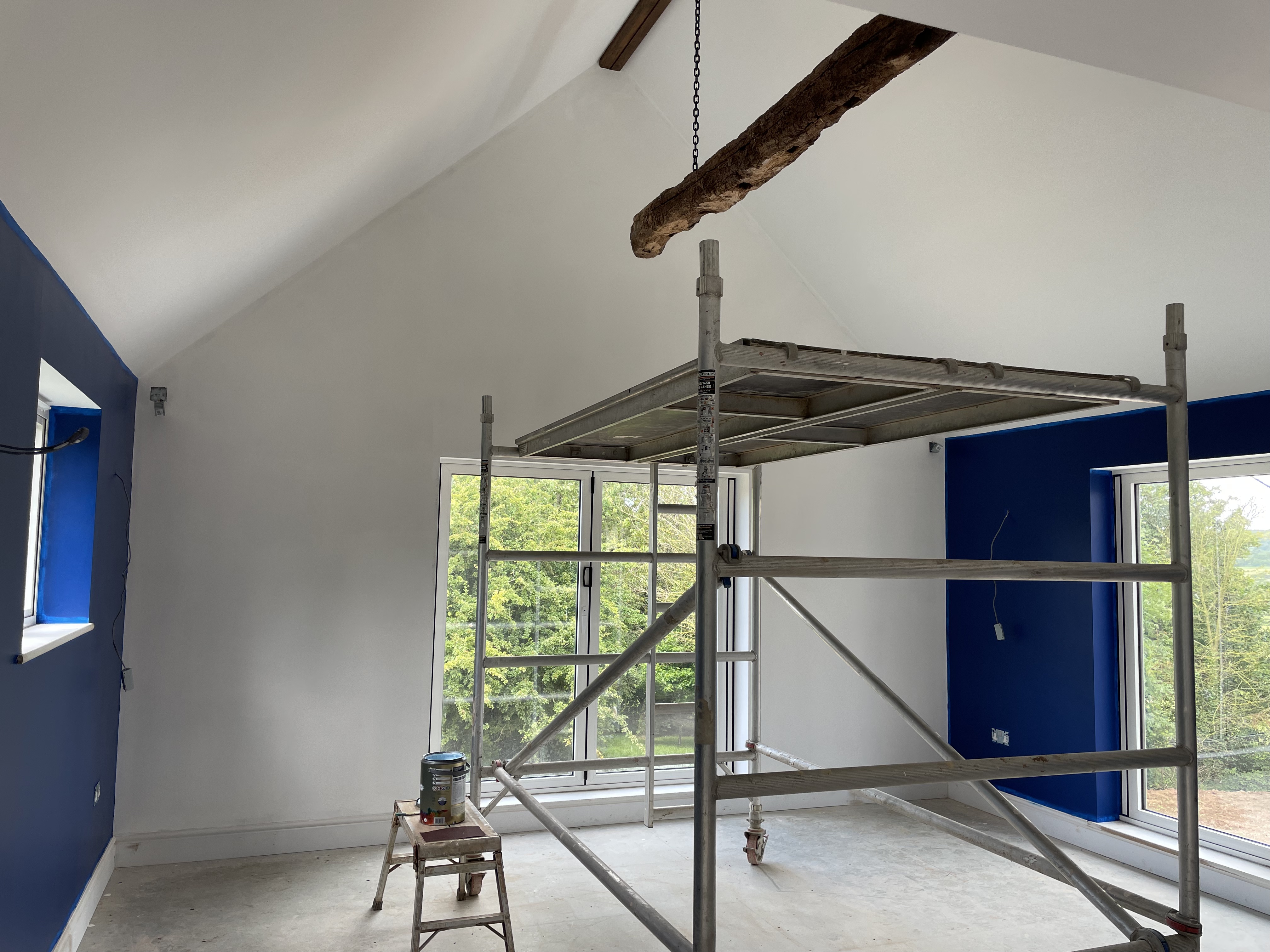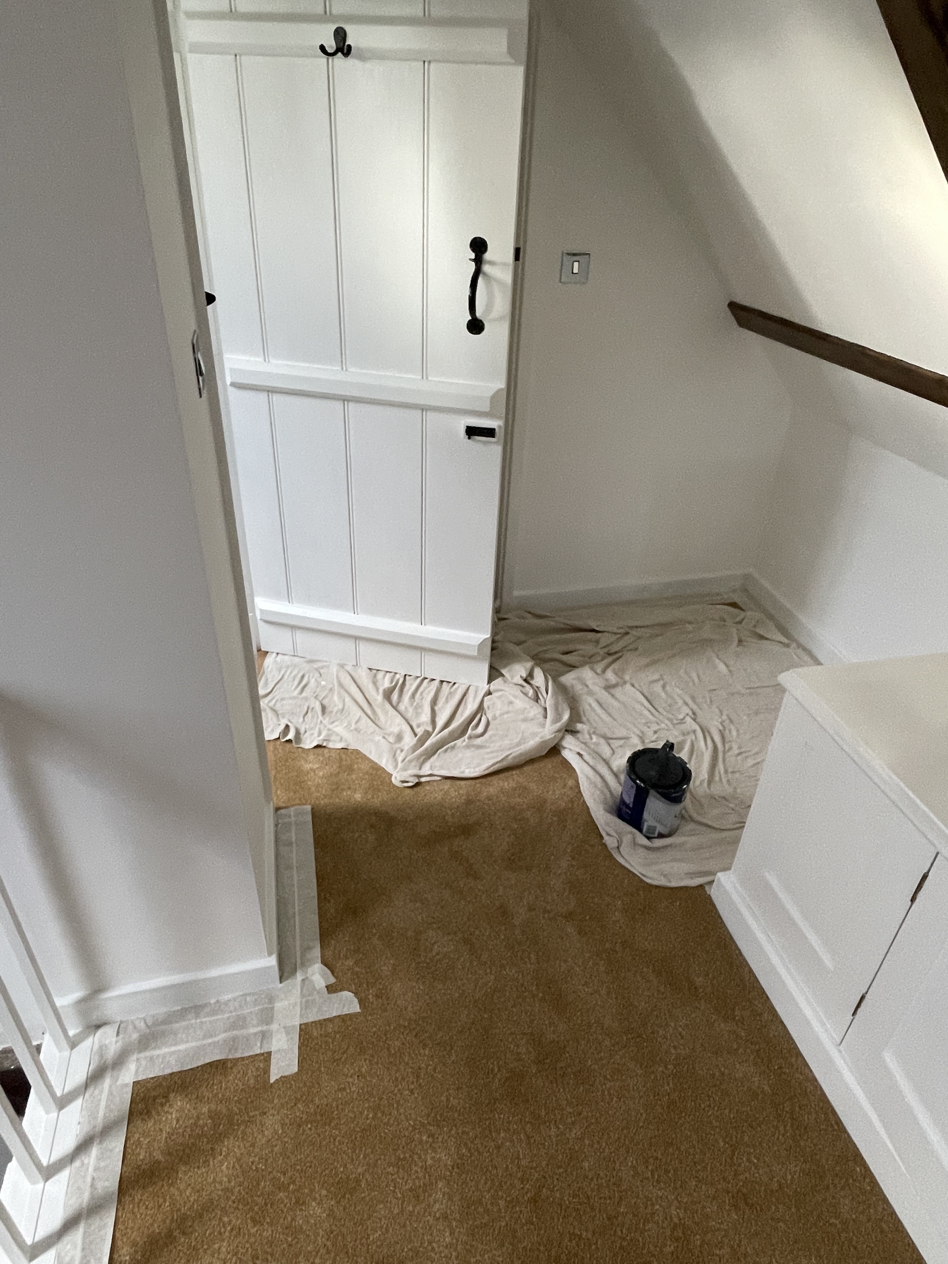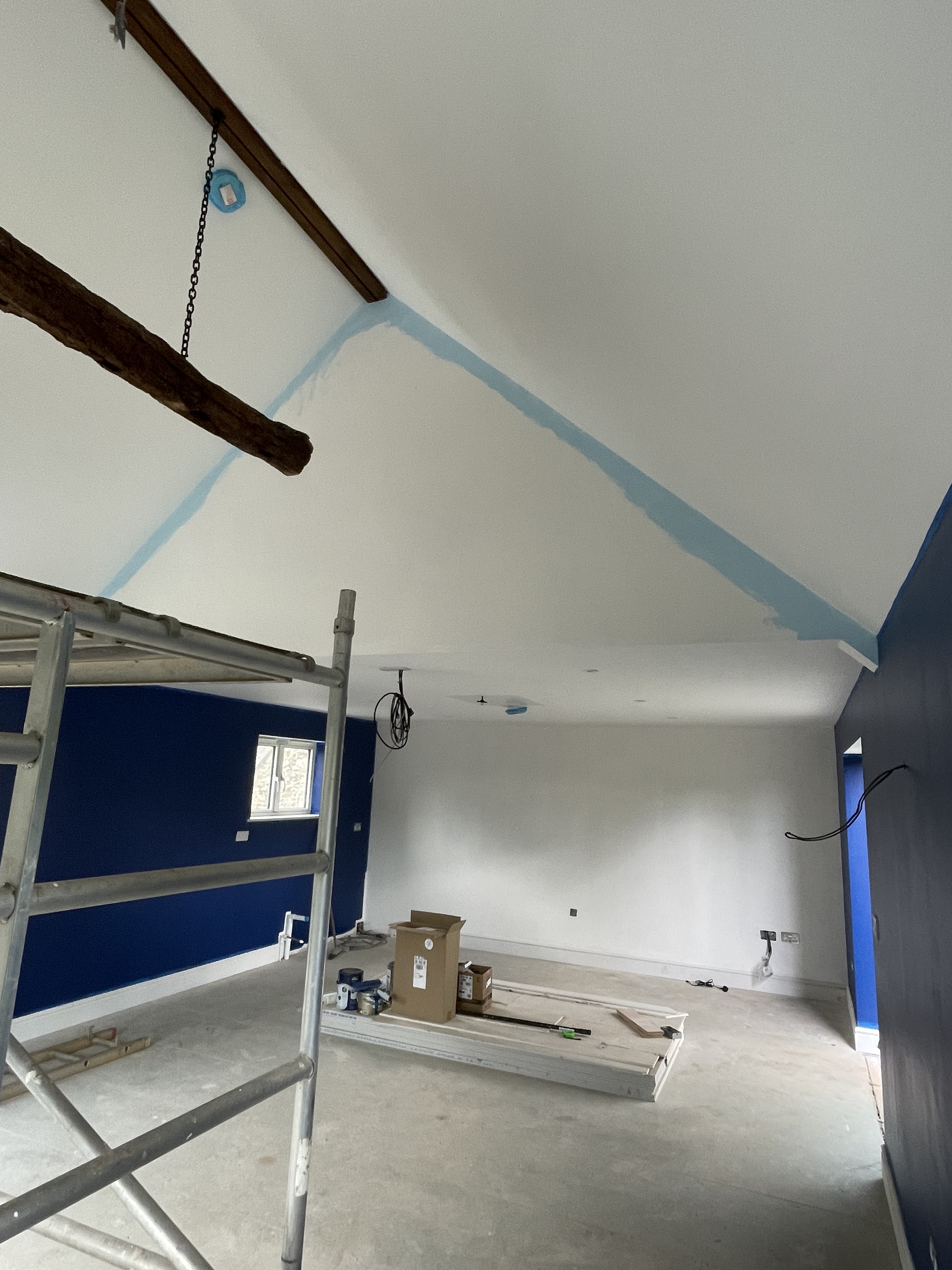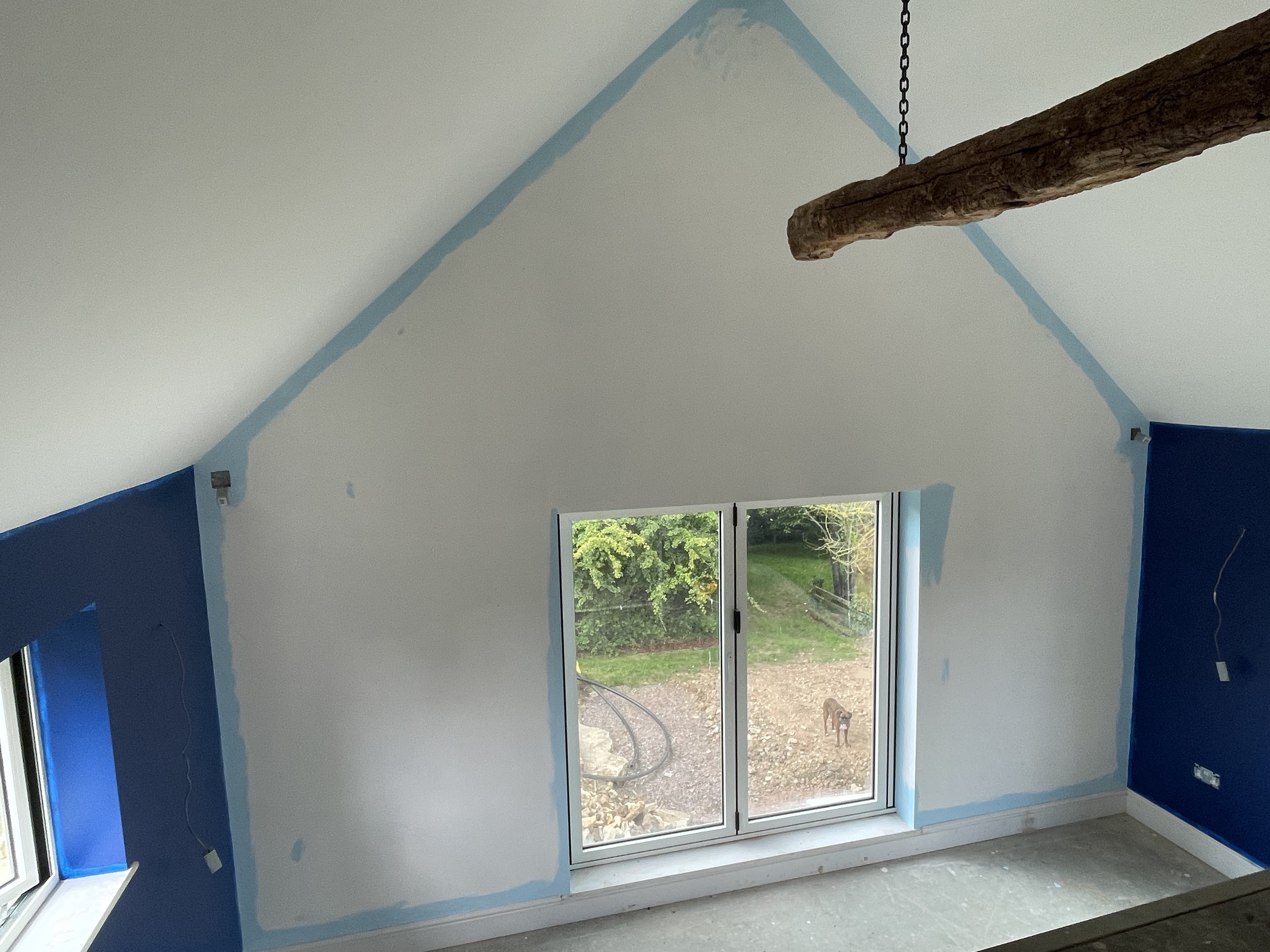 The rest of the week has definitely been filled with odd jobs around the place. In the farmhouse we’ve started painting the woodwork on the top floor landing (the final bit left) and we painted the soffit board below the roof, which we’d missed when the scaffolding was up. The window company came to replace the final blown window too so that’s one job ticked off the list. And in the laundry we put the first layer of Polyfilla around the light switch and filled in the screw holes on the door frame to make it a bit neater. We started edging the high walls in the communal games room so we can finish with the tower as soon as possible – the blue has turned out a little brighter than it was meant to so I hope It looks ok!