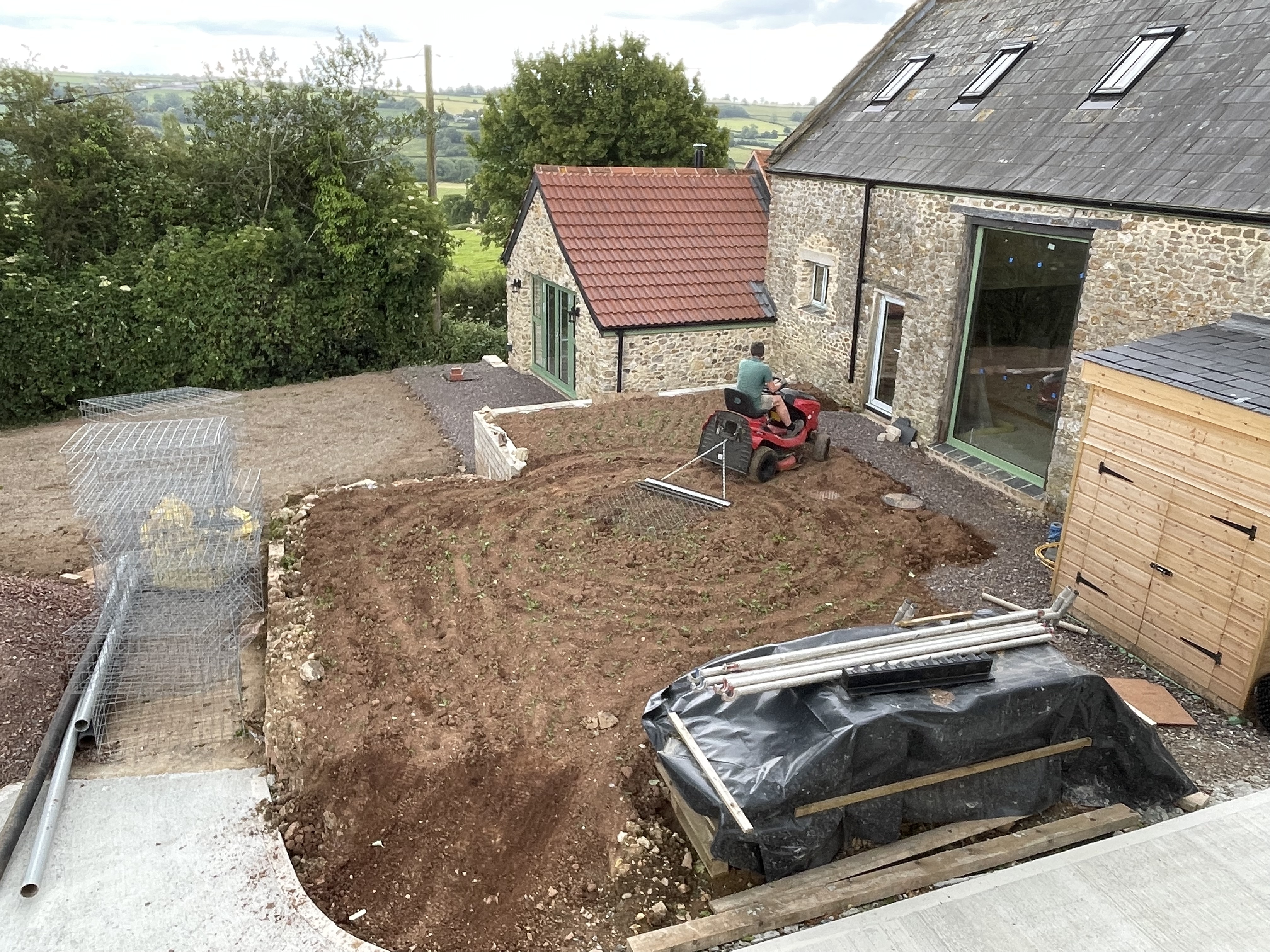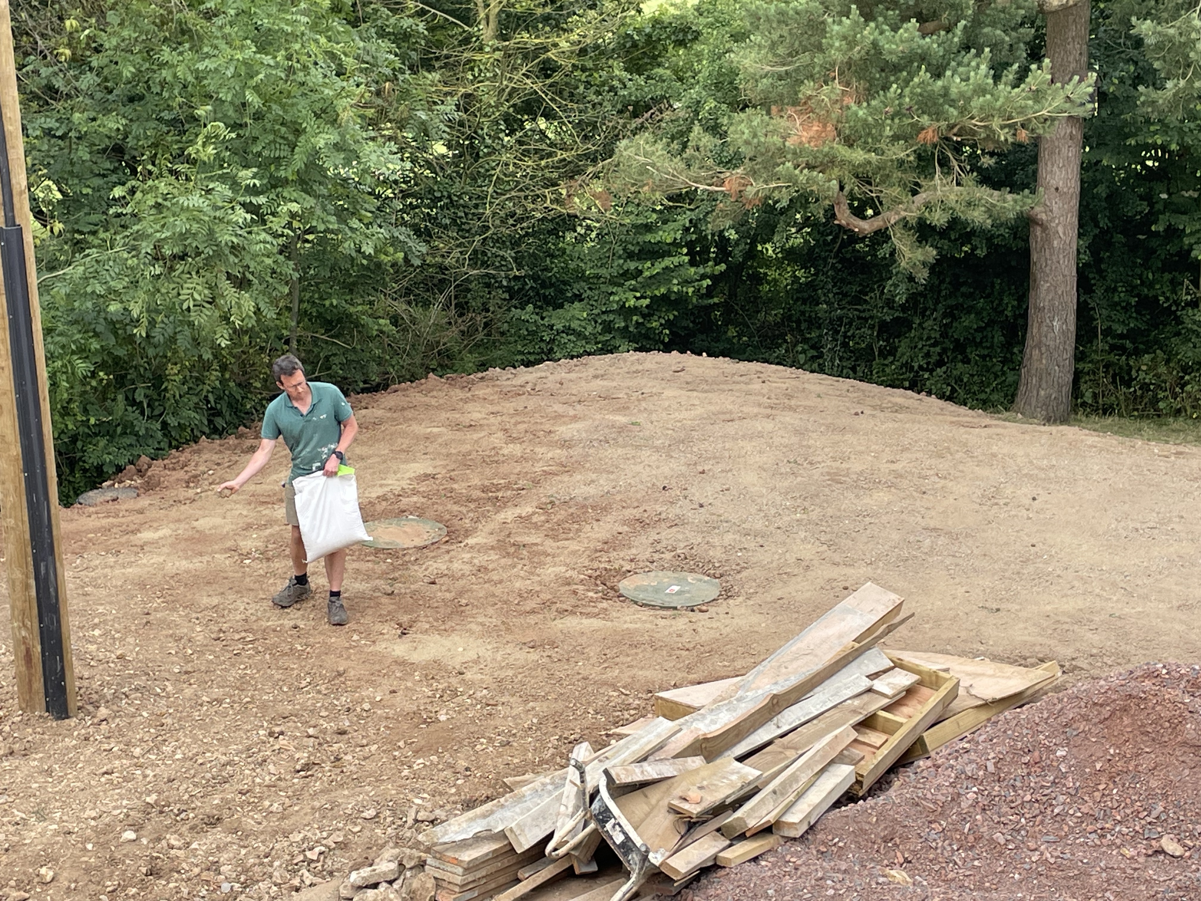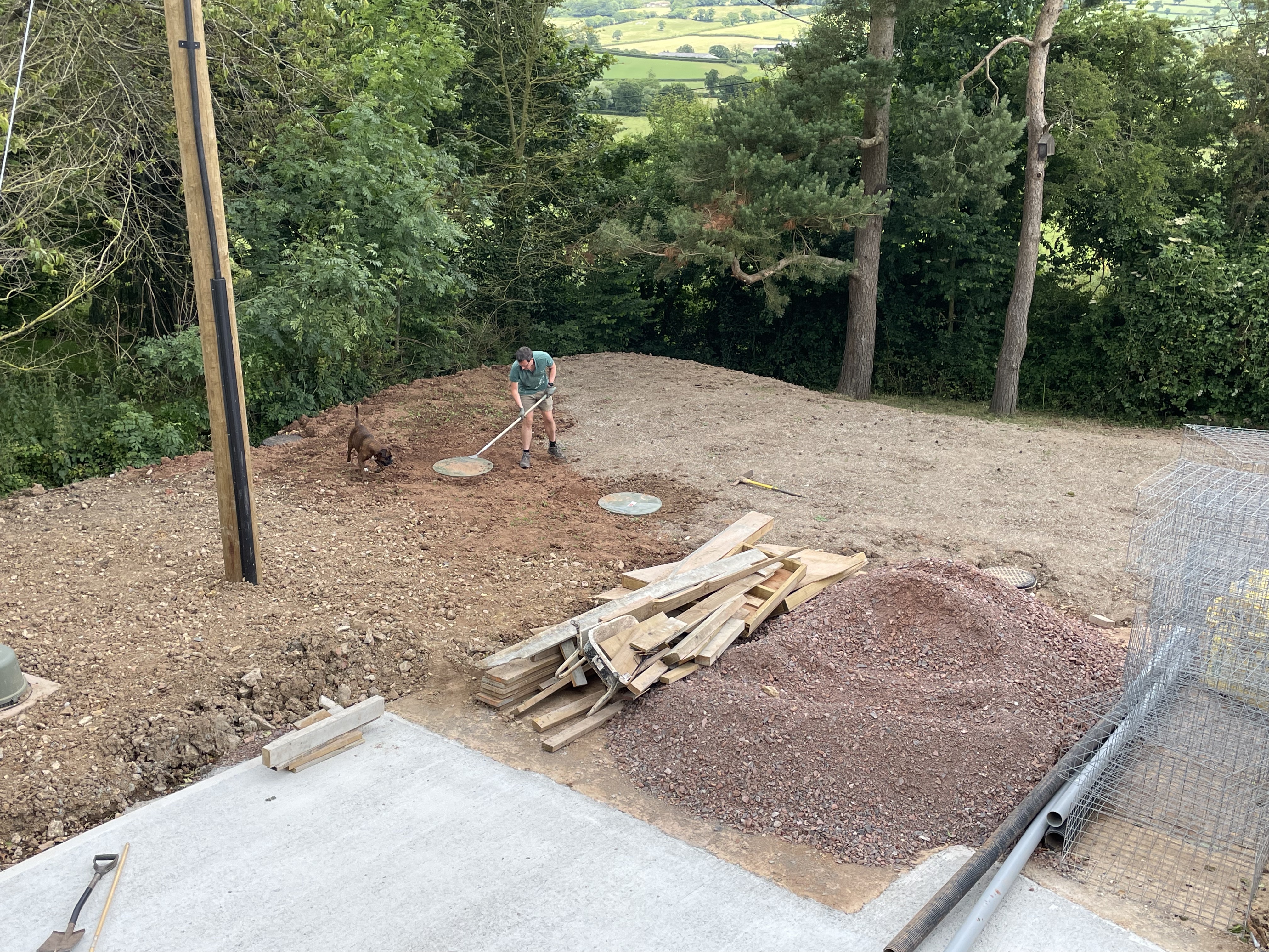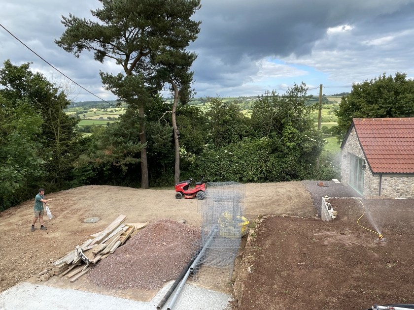 We ended up doing a mixture of all of them, which means we’re making progress but not reaching any milestones. The biggest job we’ve done is to get the grass seed down in the gardens of our new house and the three-bed. John spent most of the weekend getting rid of yet more stones and flattening the soil to get rid of the lumps and bumps and weeds. Where our builders laid the top soil it wasn’t too bad, but one section consisted of soil dug up from elsewhere on site, which is hideously stony. He then proceeded to sow 27kg (!) of grass seed and start soaking it with the sprinkler (the first use of our new tap!). Now we just need a good combination of rain and sun to avoid killing our water bill.