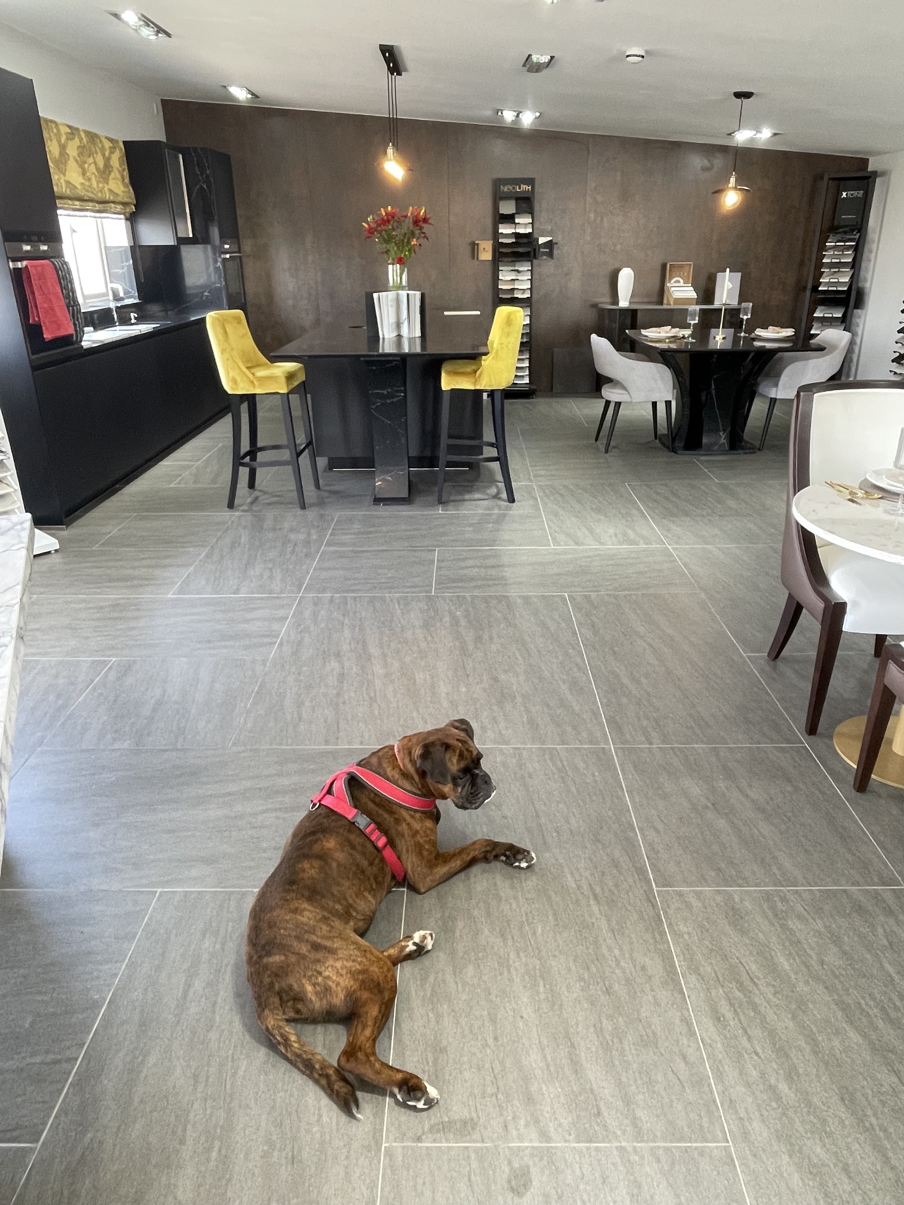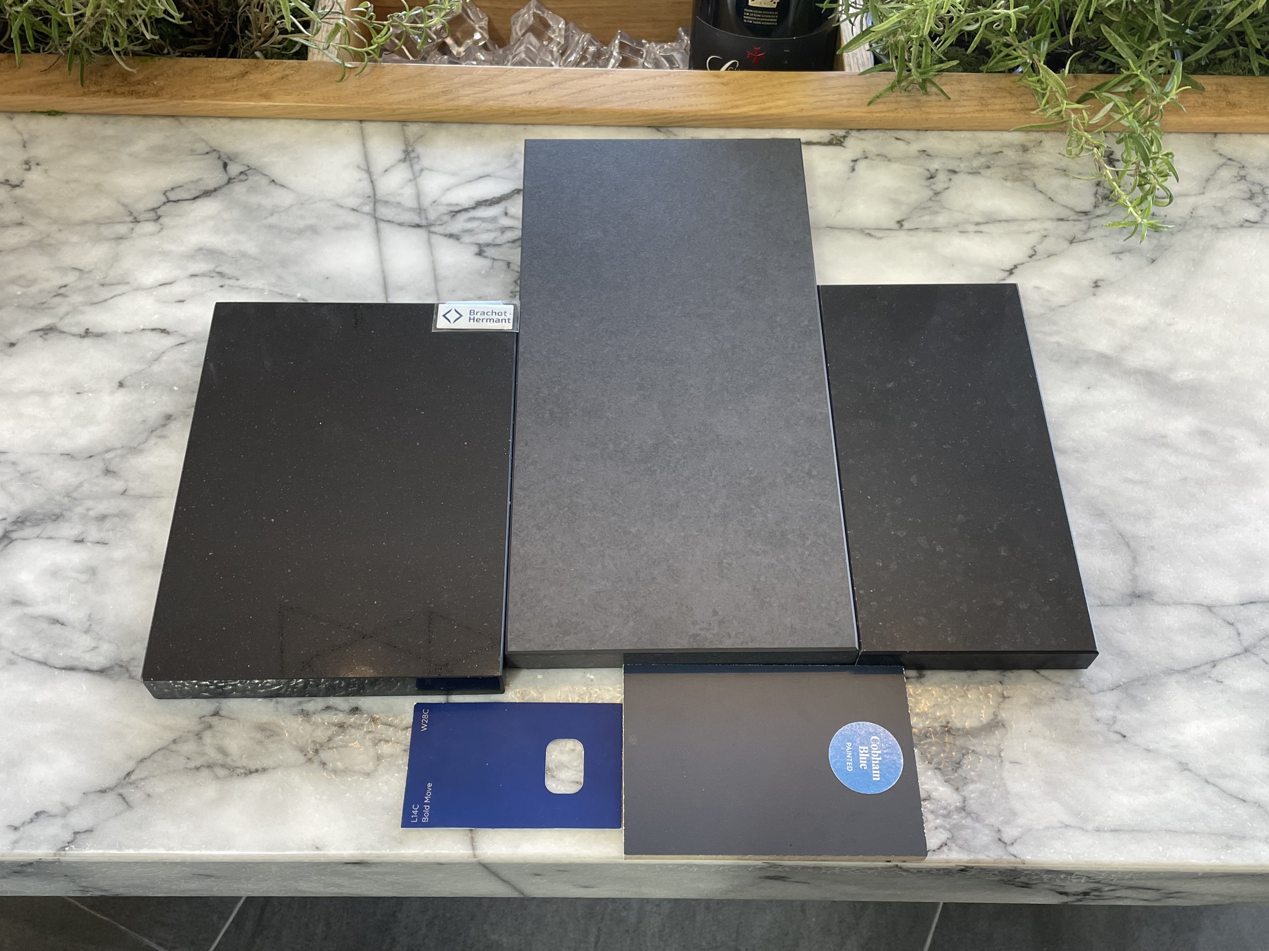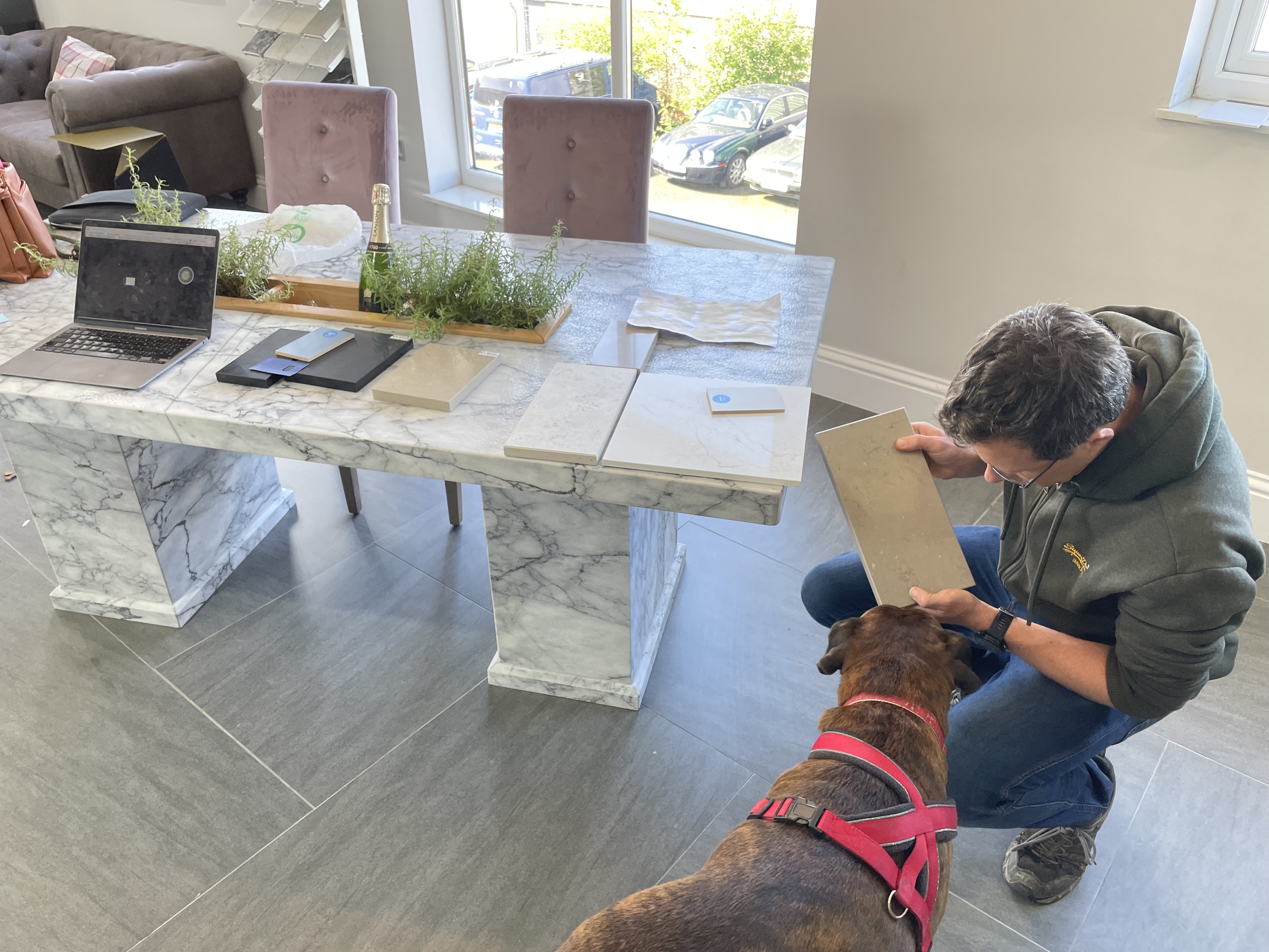 We spent Saturday morning out visiting various suppliers to get materials for the rooms in our communal building – the stone merchant outside Exeter for the work surfaces in the kitchenette (games room) and guest laundry; a vinyl floor for the games room (we went for a hard wearing one for outdoor shoes); and the aforementioned too-bright paint. Most of the other bits were delivered this week or coming tomorrow – the laundry tiles and the games room kitchenette arrived on Wednesday and the white goods are arriving tomorrow. Slowly but surely…