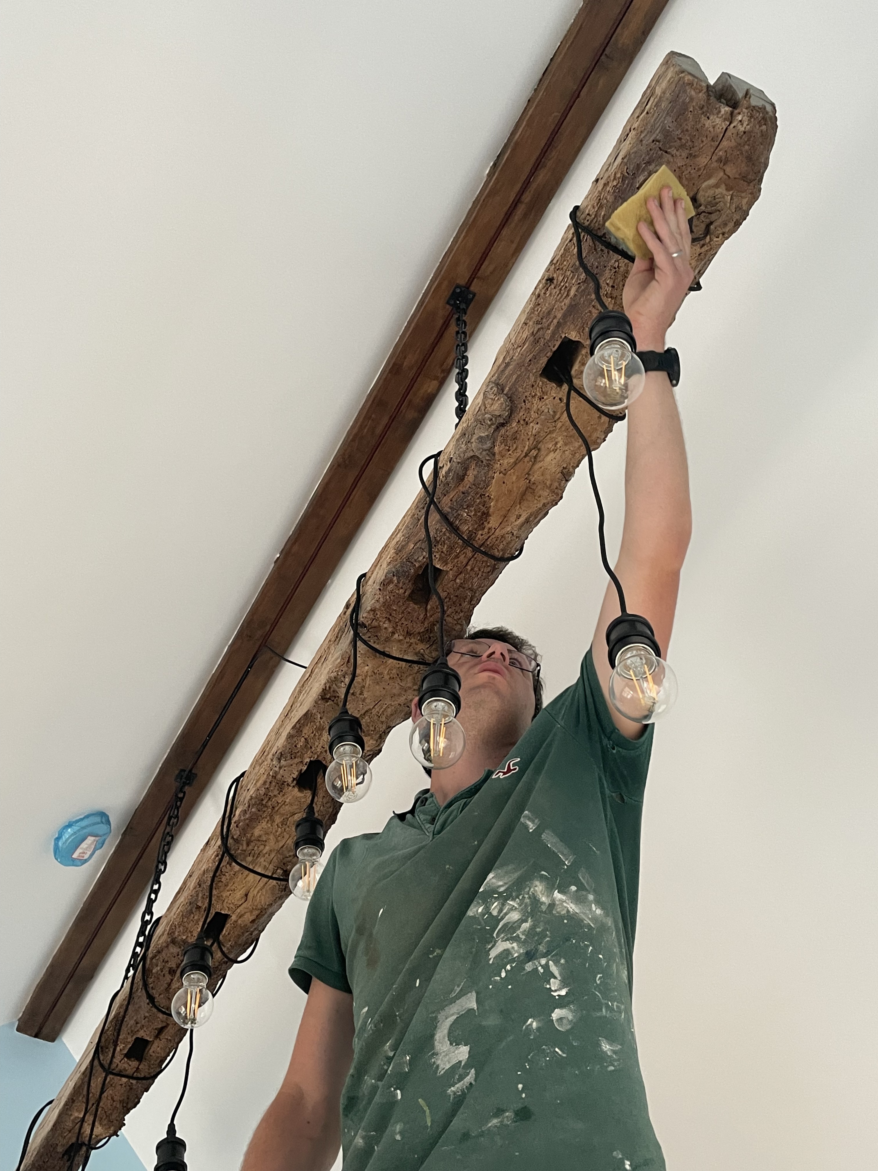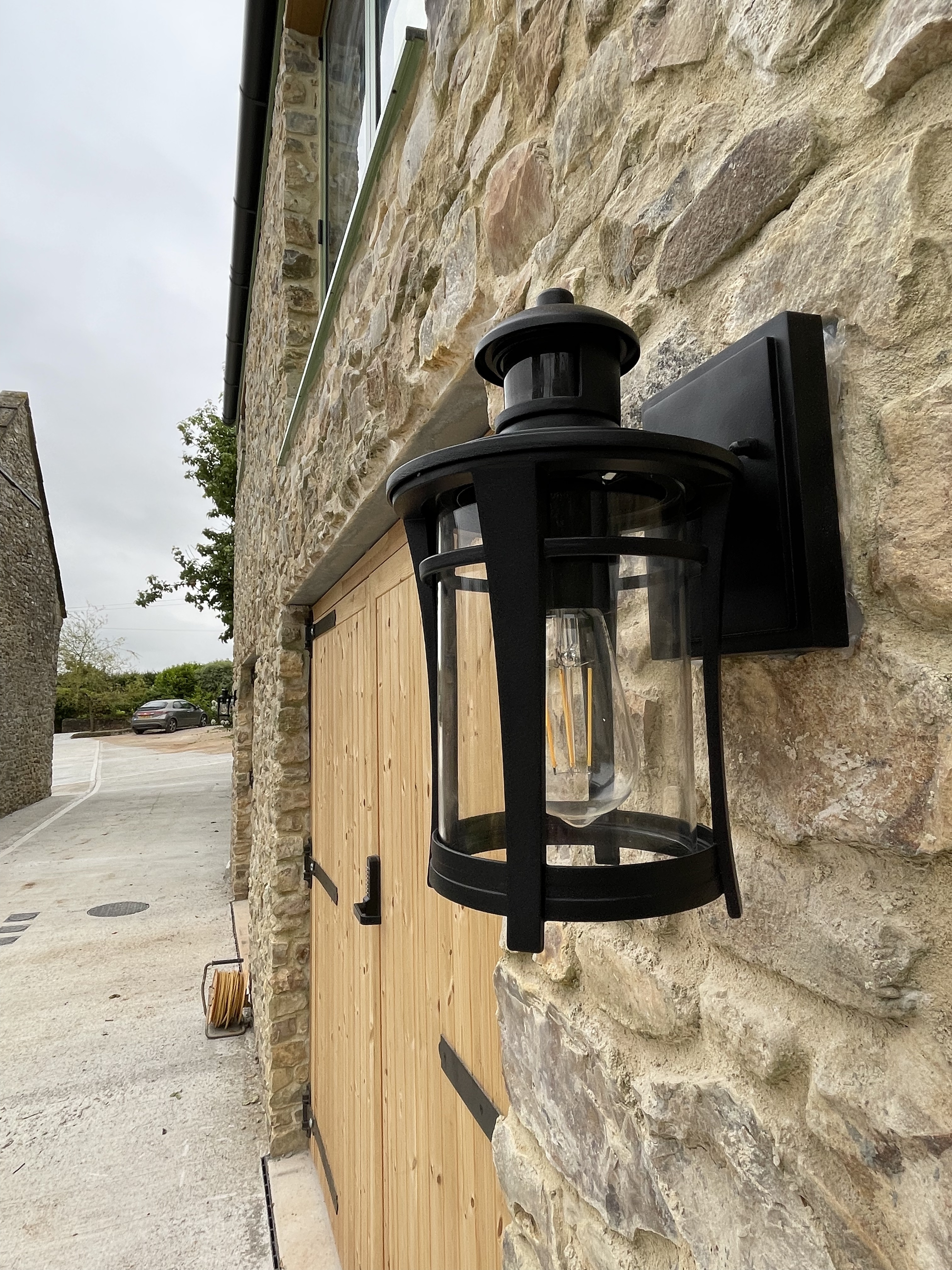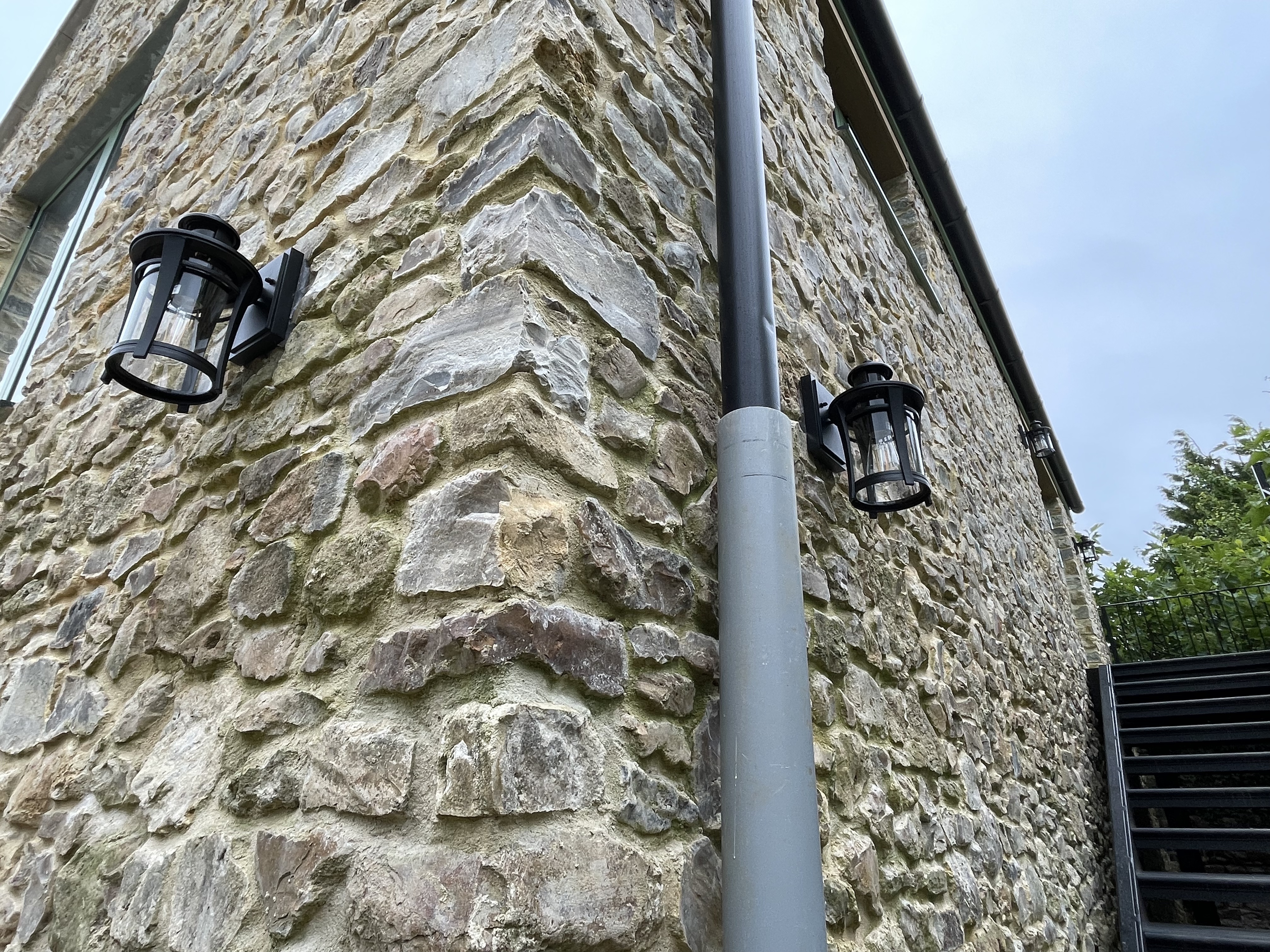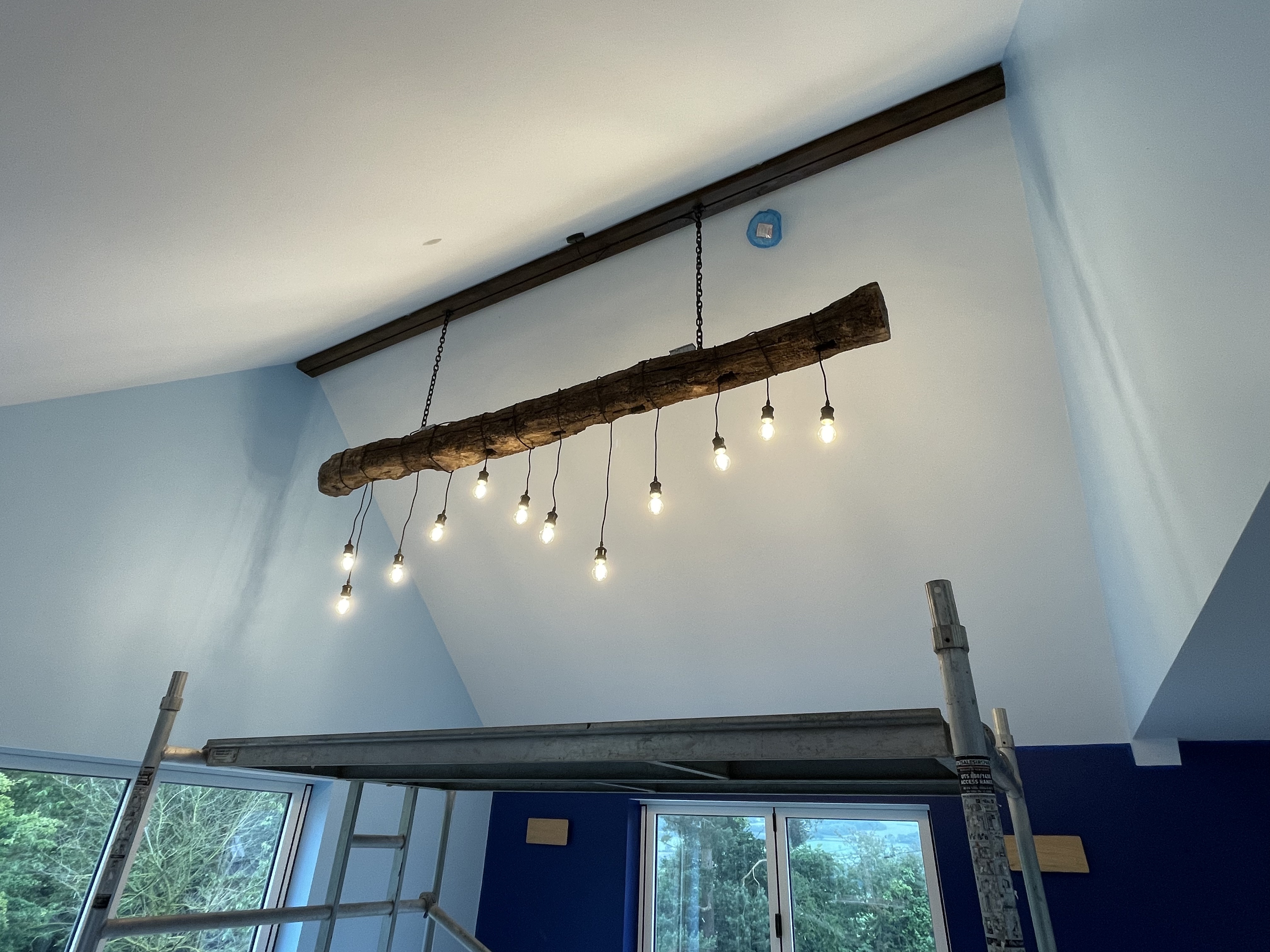 The electricians have been hard at work putting in various items of kit required for the solar tiles (which still aren’t connected yet but we hope to get done in the next few weeks), and installing the broadband connection from our house to the games room. This is only temporary until we complete and open the three-bed cottage – we’ve built each cottage to be independent and the communal barn is connected to the three-bed cottage in relation to utilities. But we don’t want to pay for two broadband connections right now so we’ll run the communal building off our connection until then. Our electricians have also been busy with lighting – installing the wall lights, outside lights and putting the beam light fittings on, which is the same design as the one in our new house.
