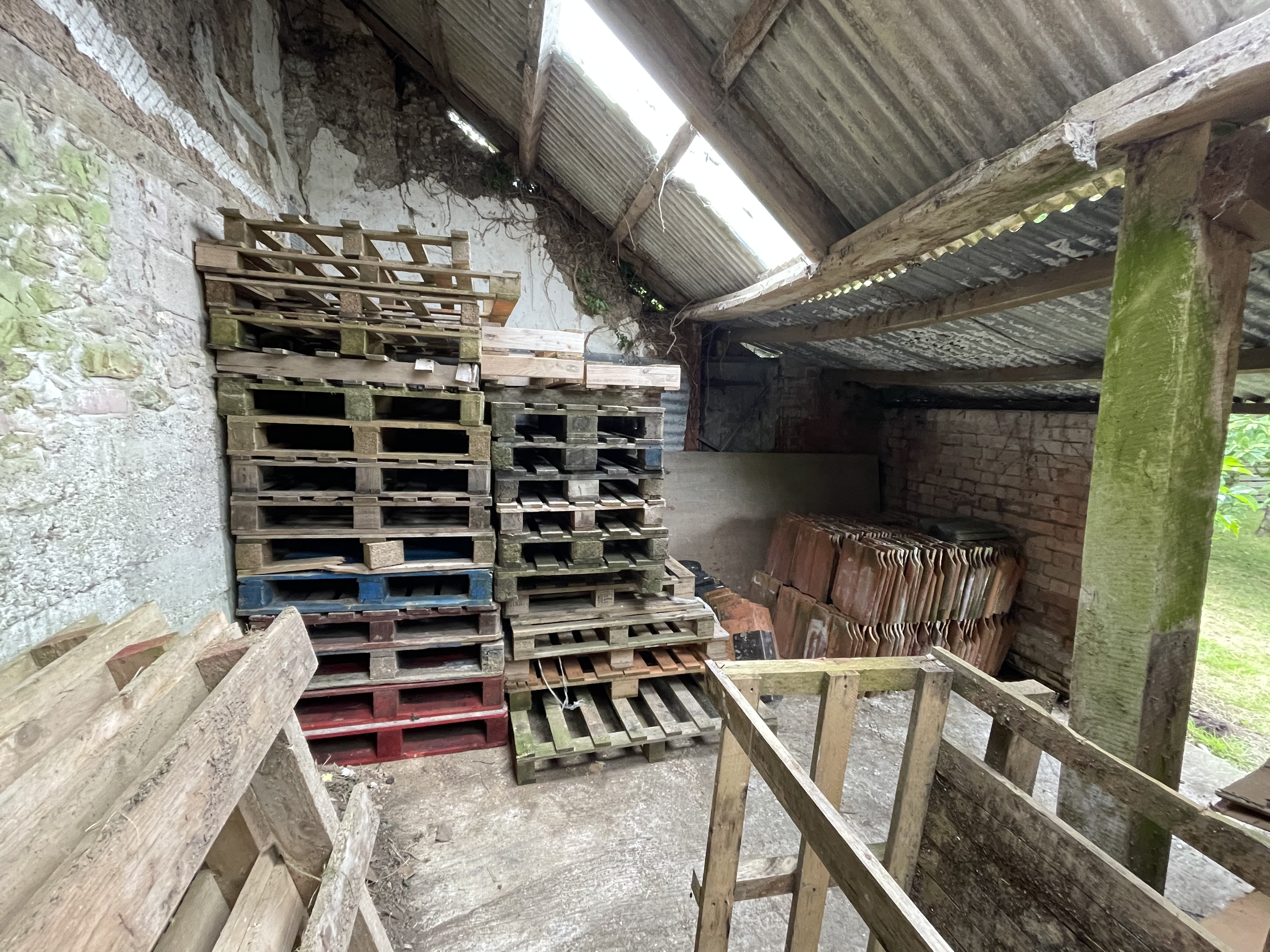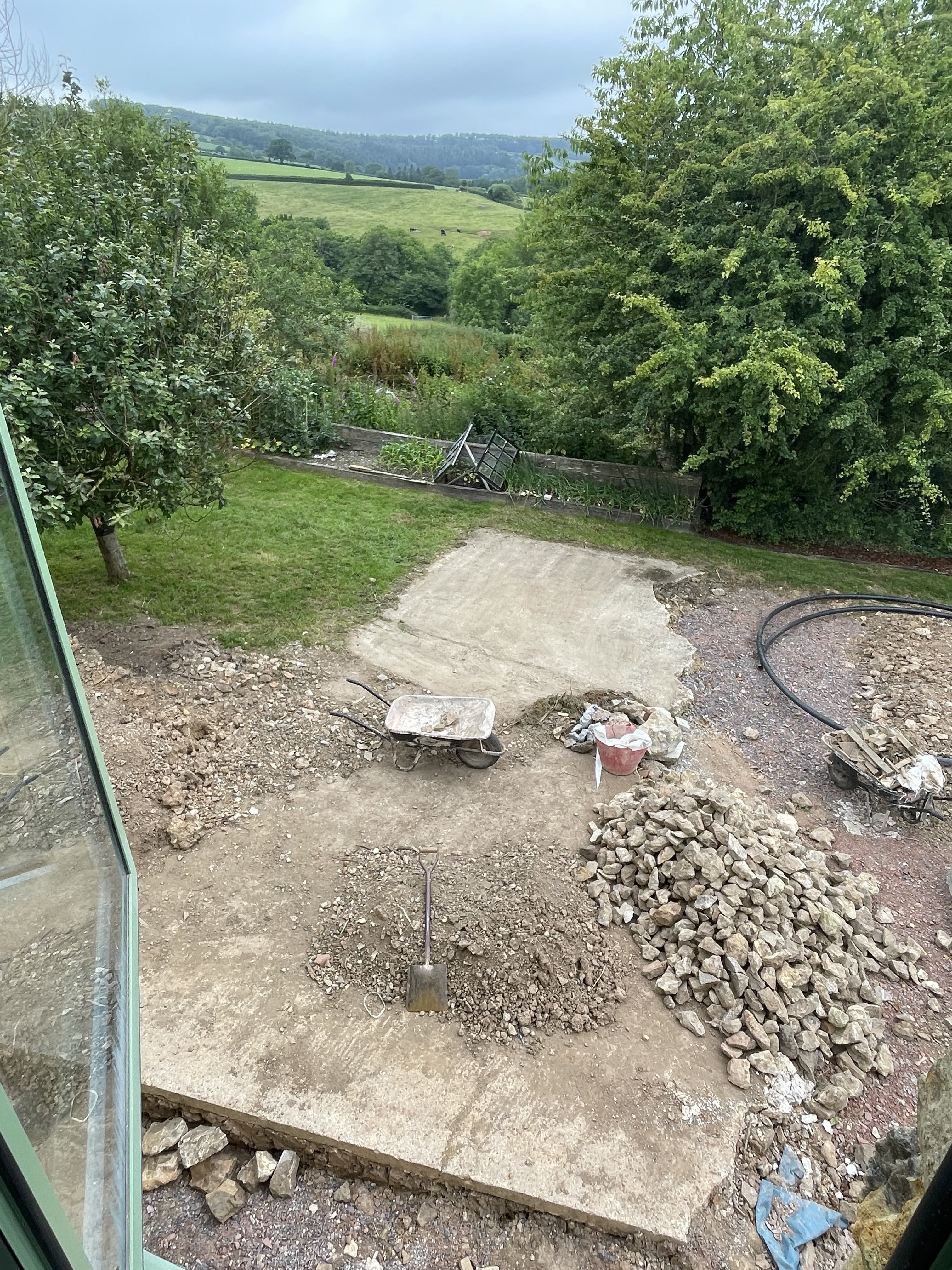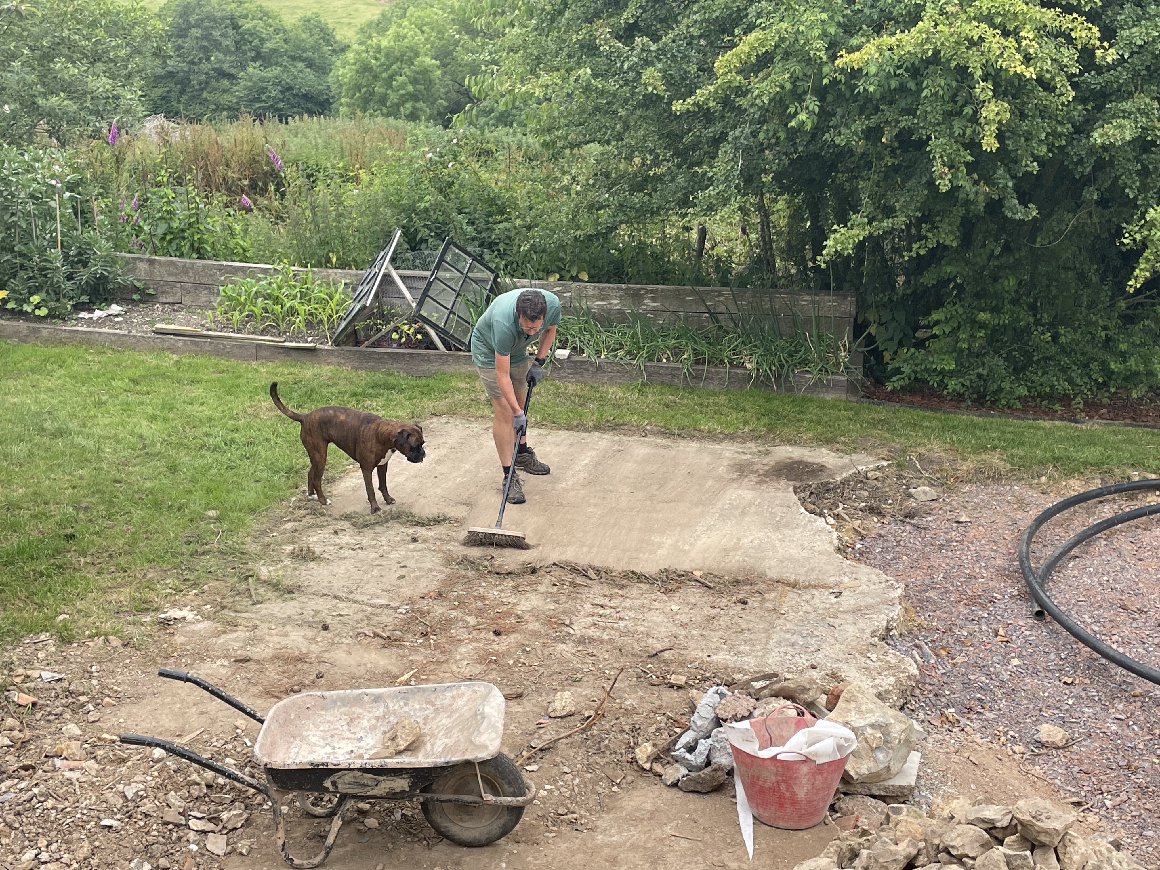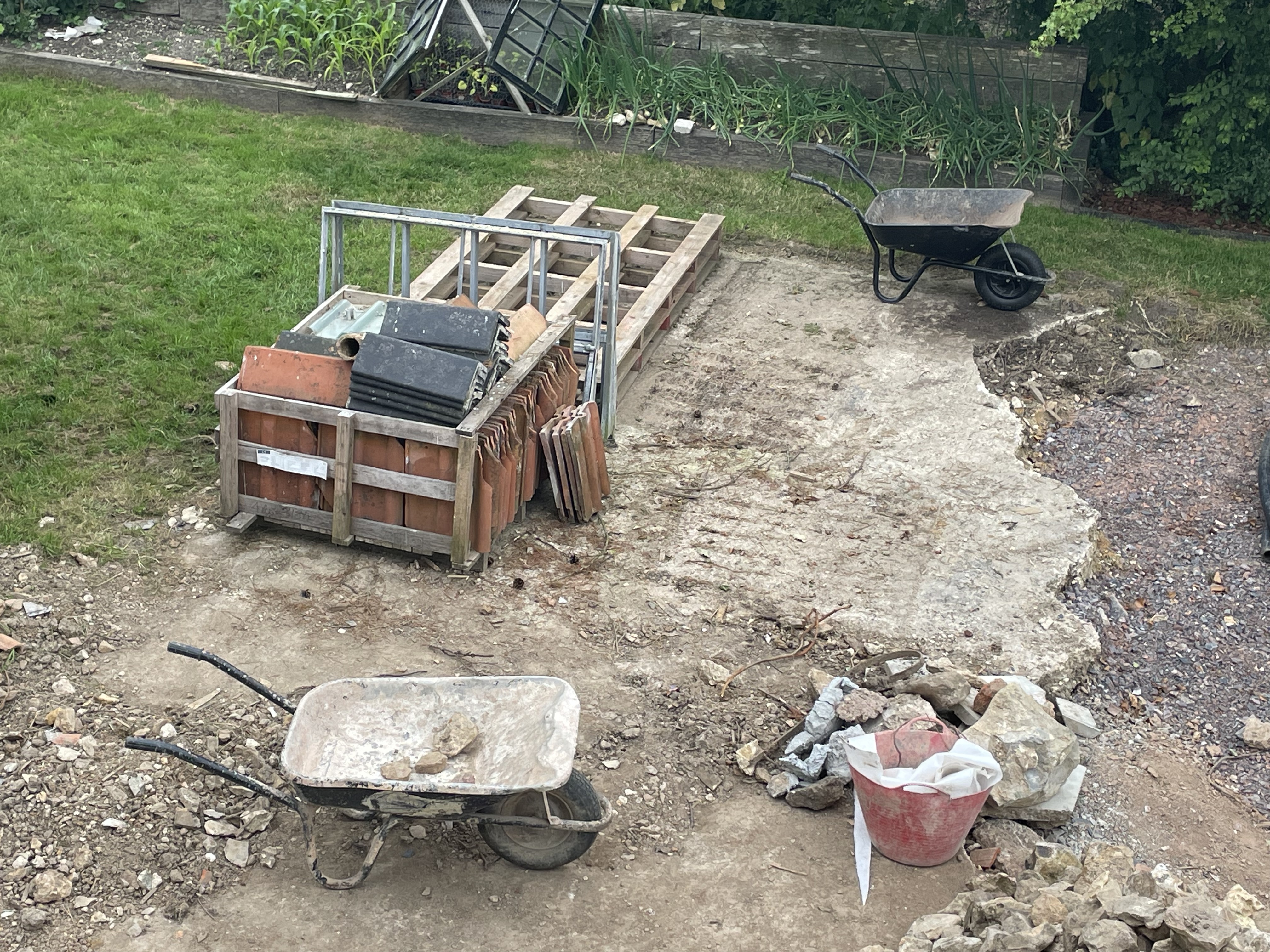 One of the remaining jobs for our builder is to concrete the rest of the yard, around the side of the communal barn. It’s the area next to where the pallets and leftover roof tiles were being stored (and the huge pile of stones but that’s mostly gone now thanks to the gabions). While that section of concrete isn’t being removed, our site manager needs to cut it back to a clean edge so he can join the new concrete to the old. So John spent most of Sunday tidying up in the lean-to of the Elizabethan cottage – which hadn’t been touched since we moved in other than storing copious amounts of cardboard in there for the compost bins and was full of old bits of wood and probably 50 years of dirt and dust. He then moved all the pallets and roof tiles up to the lean-to to keep them out of the way until we use them.