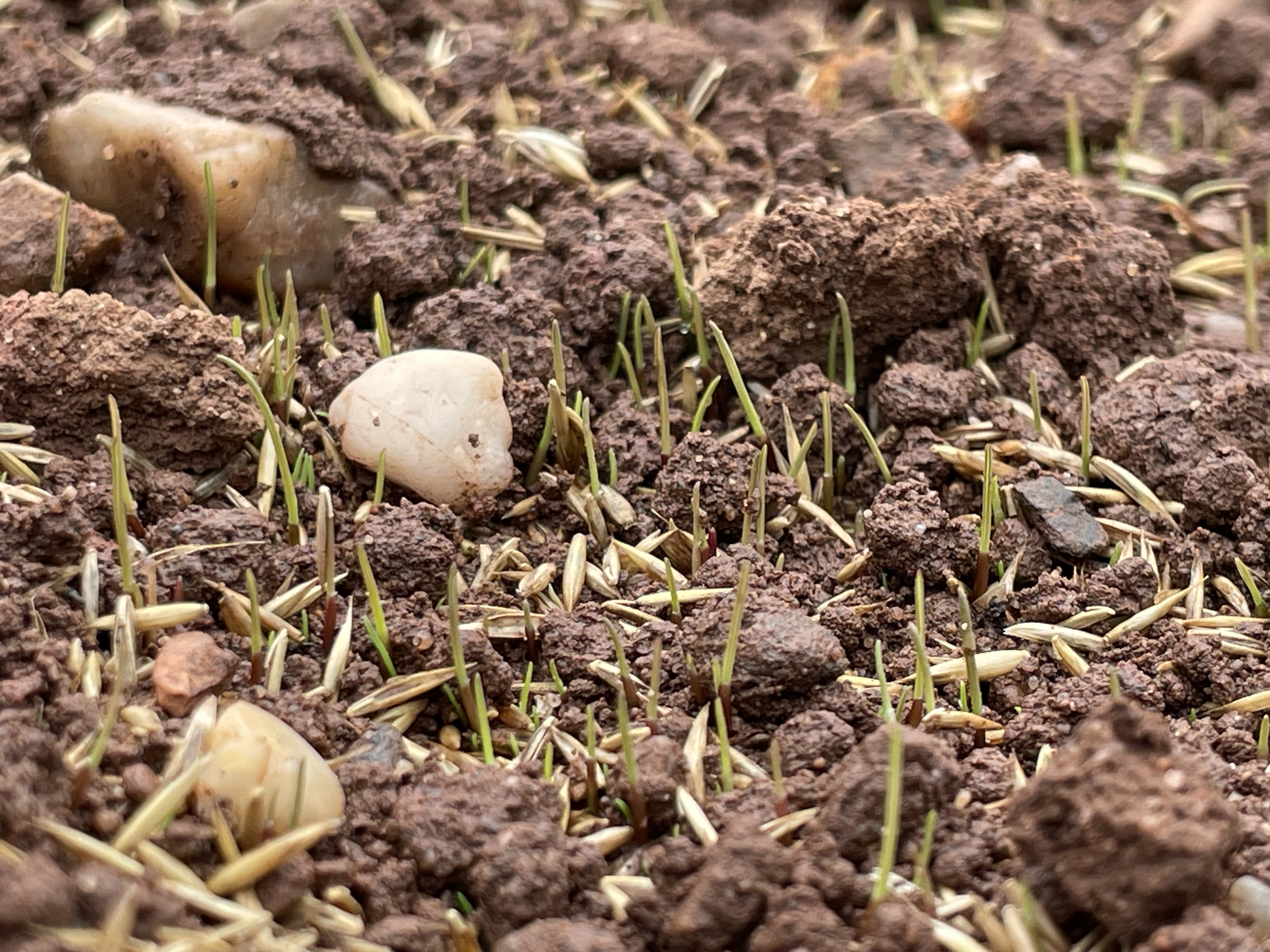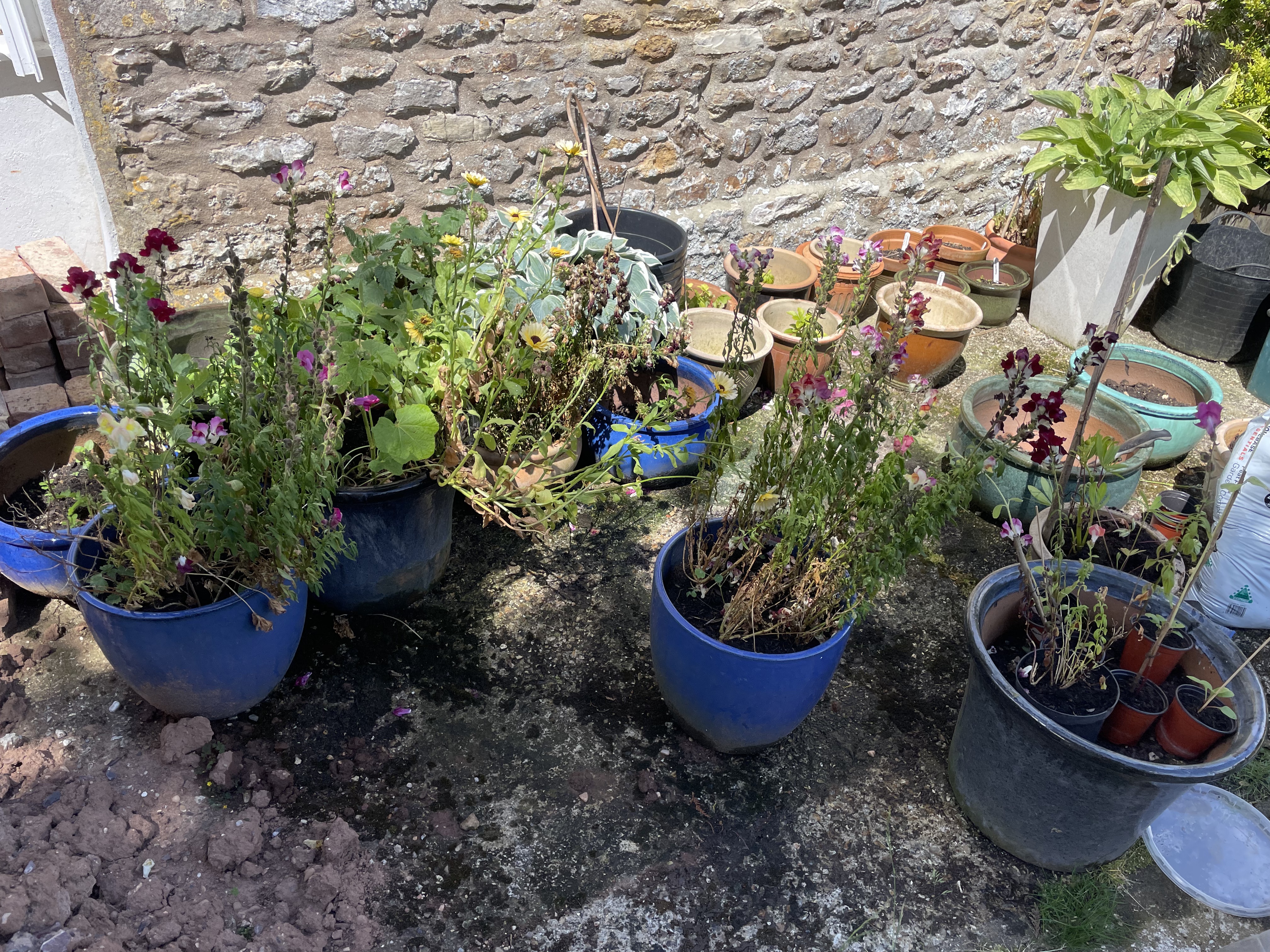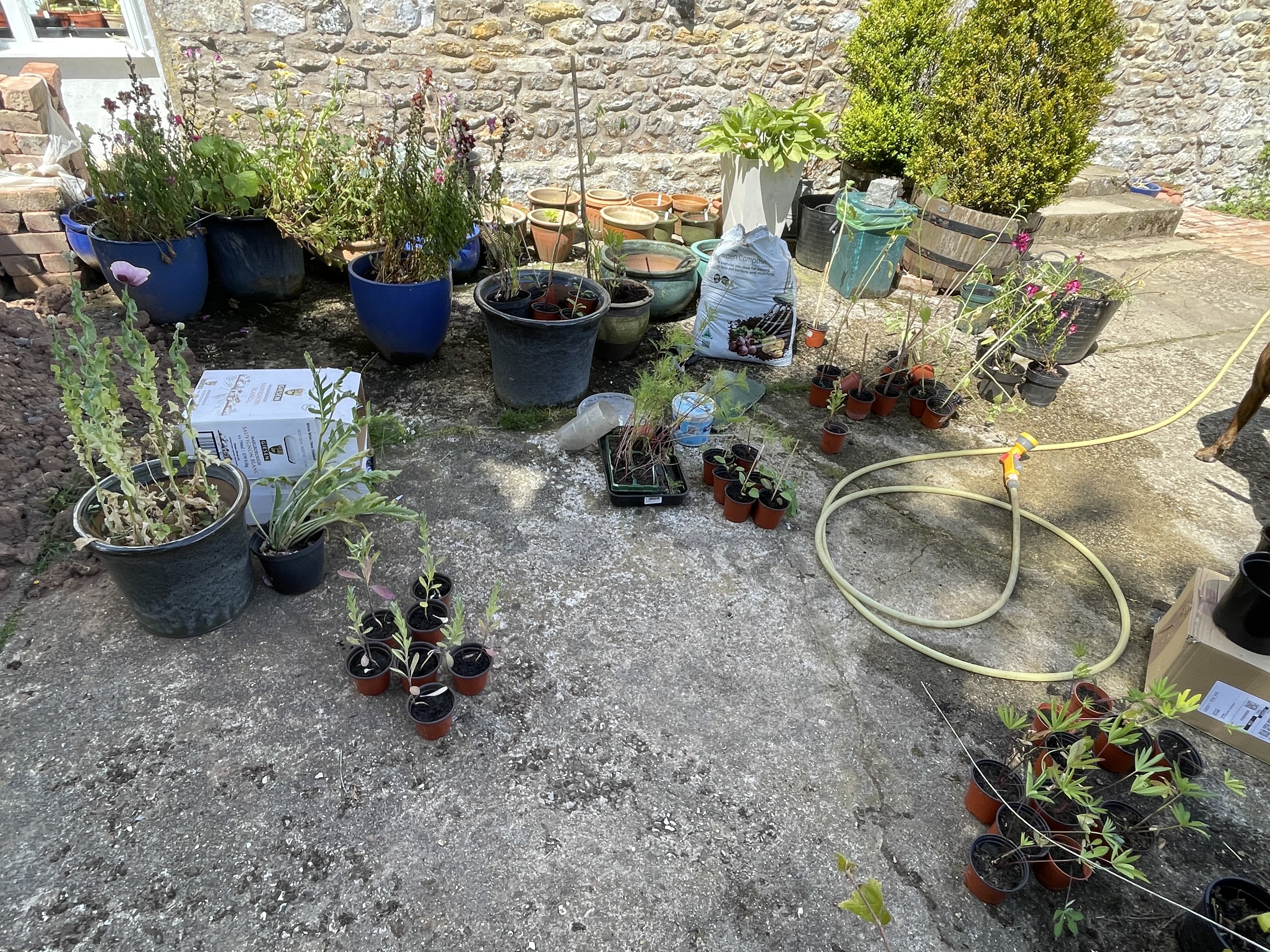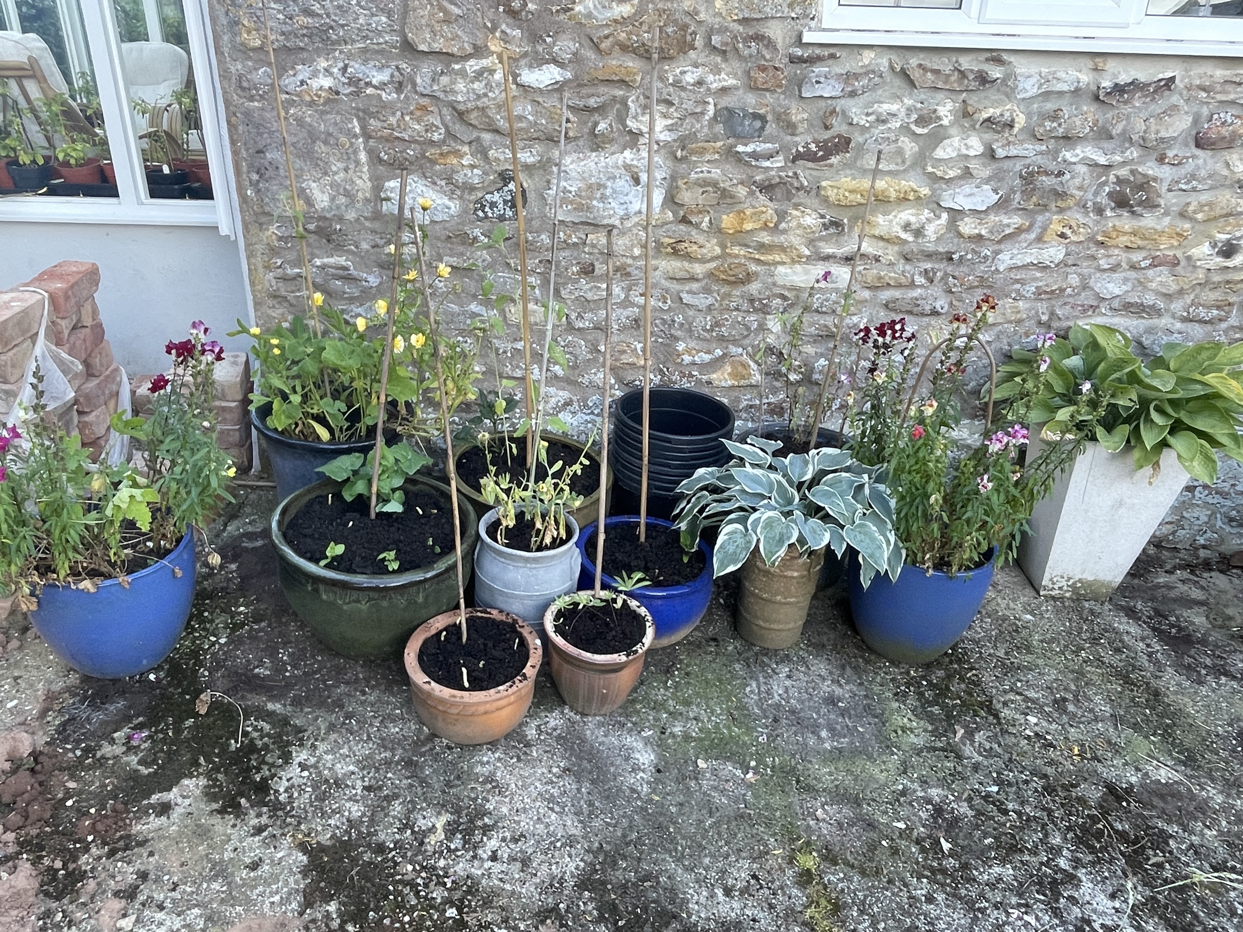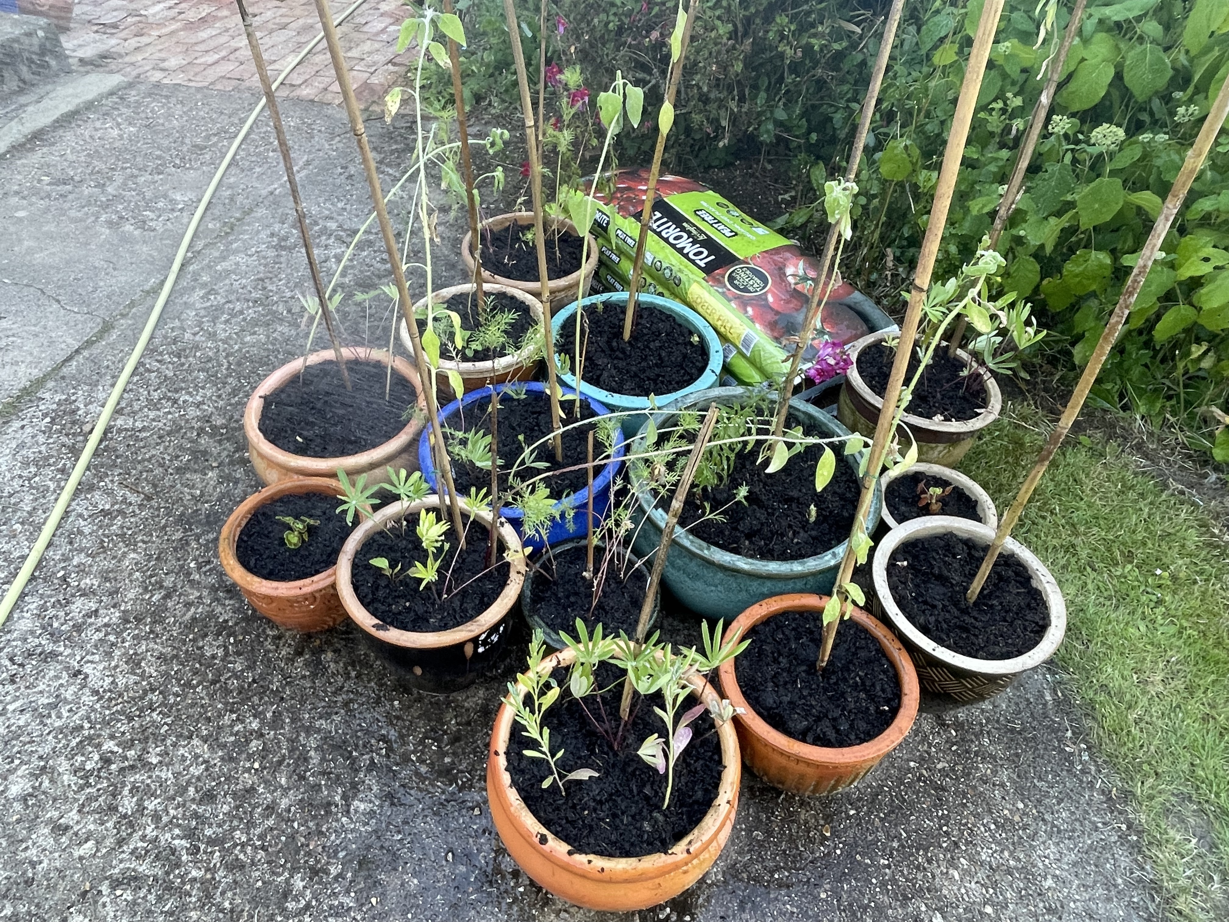 A very busy week at work meant little time for me to catch up on planting. John managed to mow all the lawns which has made the place look a lot tidier, and we had some very understanding friends visit this weekend who didn’t mind sitting outside to chat while I planted up the pile of pots we’ve accumulated. It’s incredibly late to get most of the flowers out and they look to have suffered while they’ve been waiting in the greenhouse, but hopefully some of them will flower in the coming weeks so the place looks brighter for visitors. One thing which is growing is the grass seed in our new back garden and in the three-bed garden, which is starting to create a green carpet amongst the soil. It’s a very promising sign.