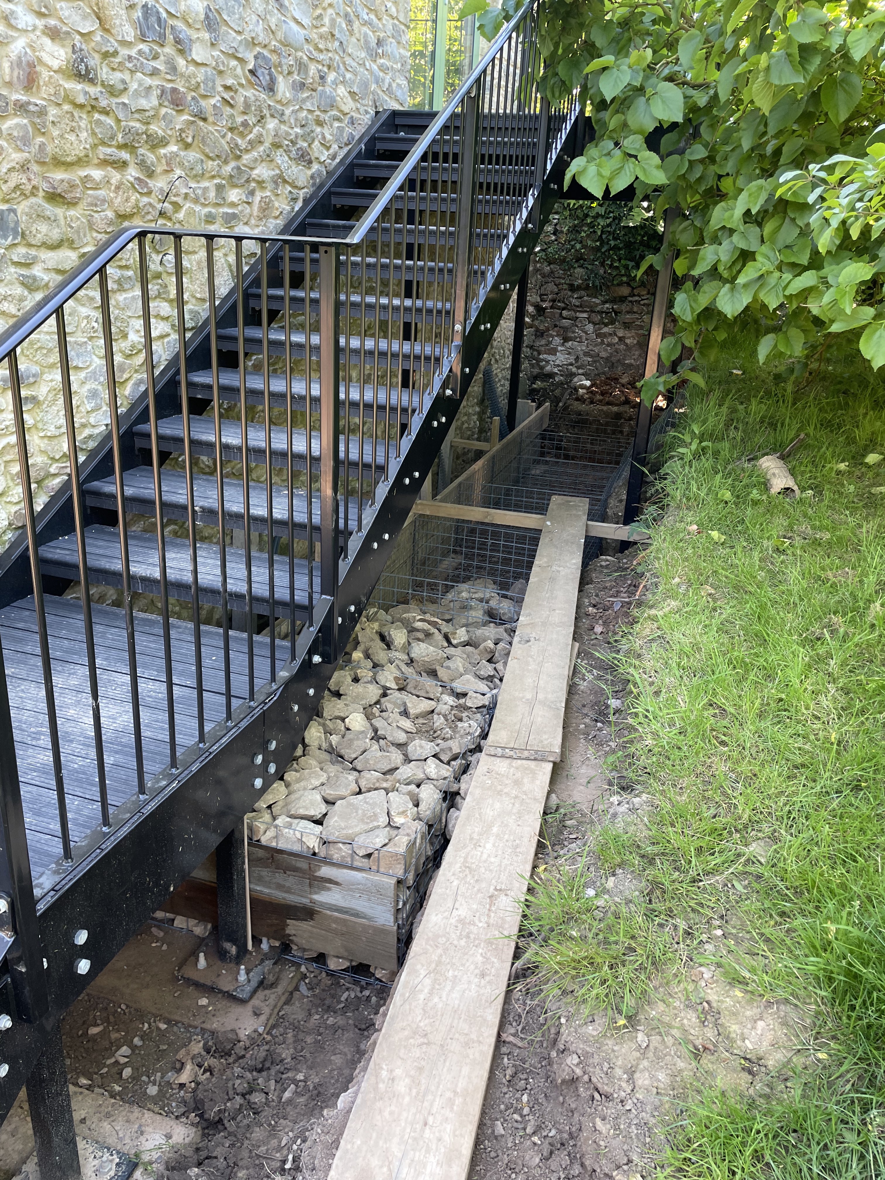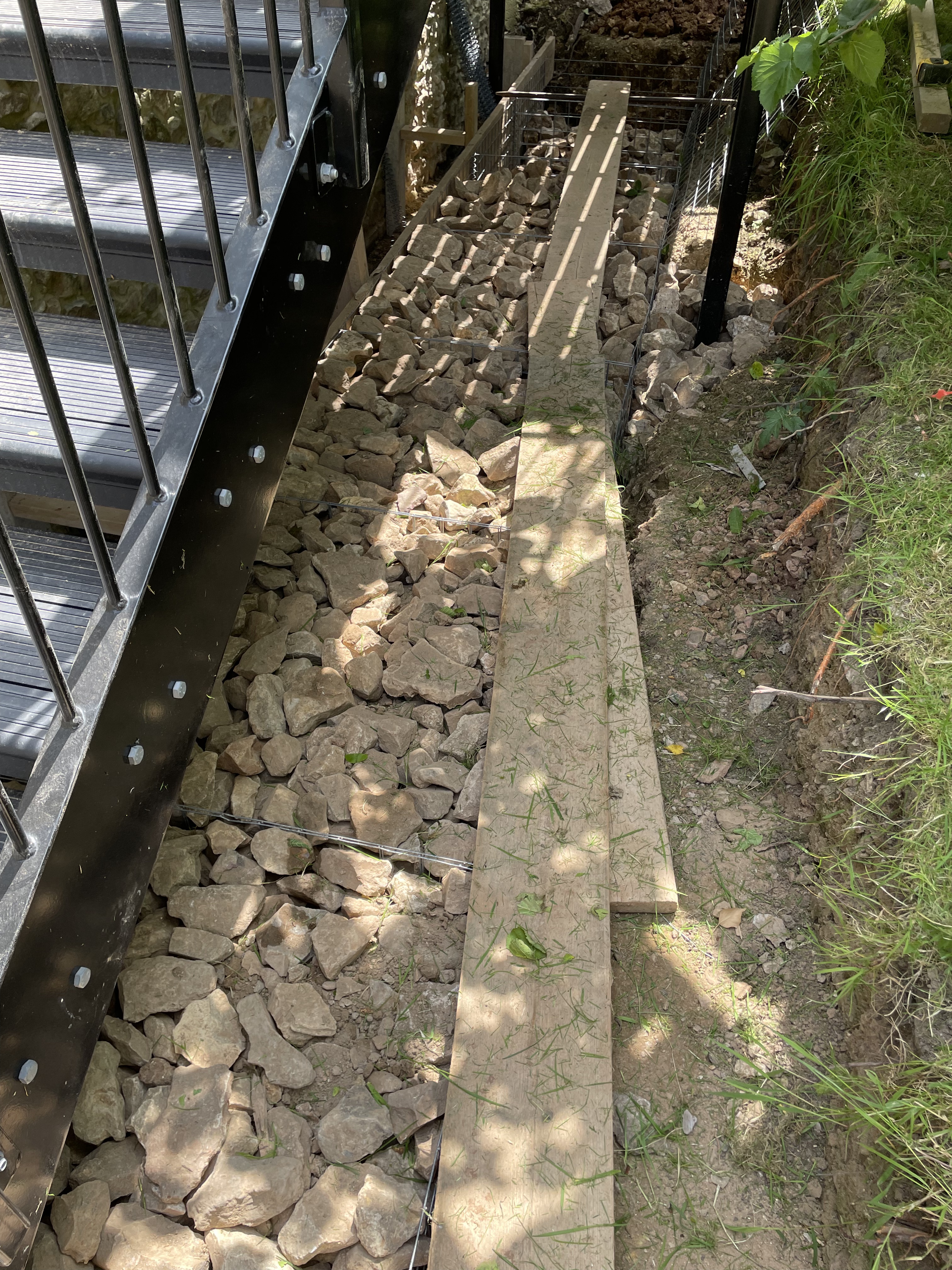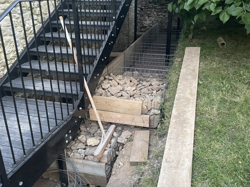 We ended up locating the new barn a little further out than where the original barn had been to avoid the need to build an expensive retaining wall backing onto the orchard. Ironically by the time we paid for the extra stone required to face the entire wall, and the stairs, and the gabions, we think it’s cost us more than the retaining wall would have done. There’s a chance however we’d have lost the mulberry bush which is of historical significance in the mulberry world, and it wouldn’t have looked as good without the stairs. It’s also a great way of getting rid of the huge pile of stone we had left over that wasn’t suitable for the barn walls, and removes the risk of any water seeping through the retaining wall from the orchard – always a potential problem when you have a wall built against a large bank of soil.