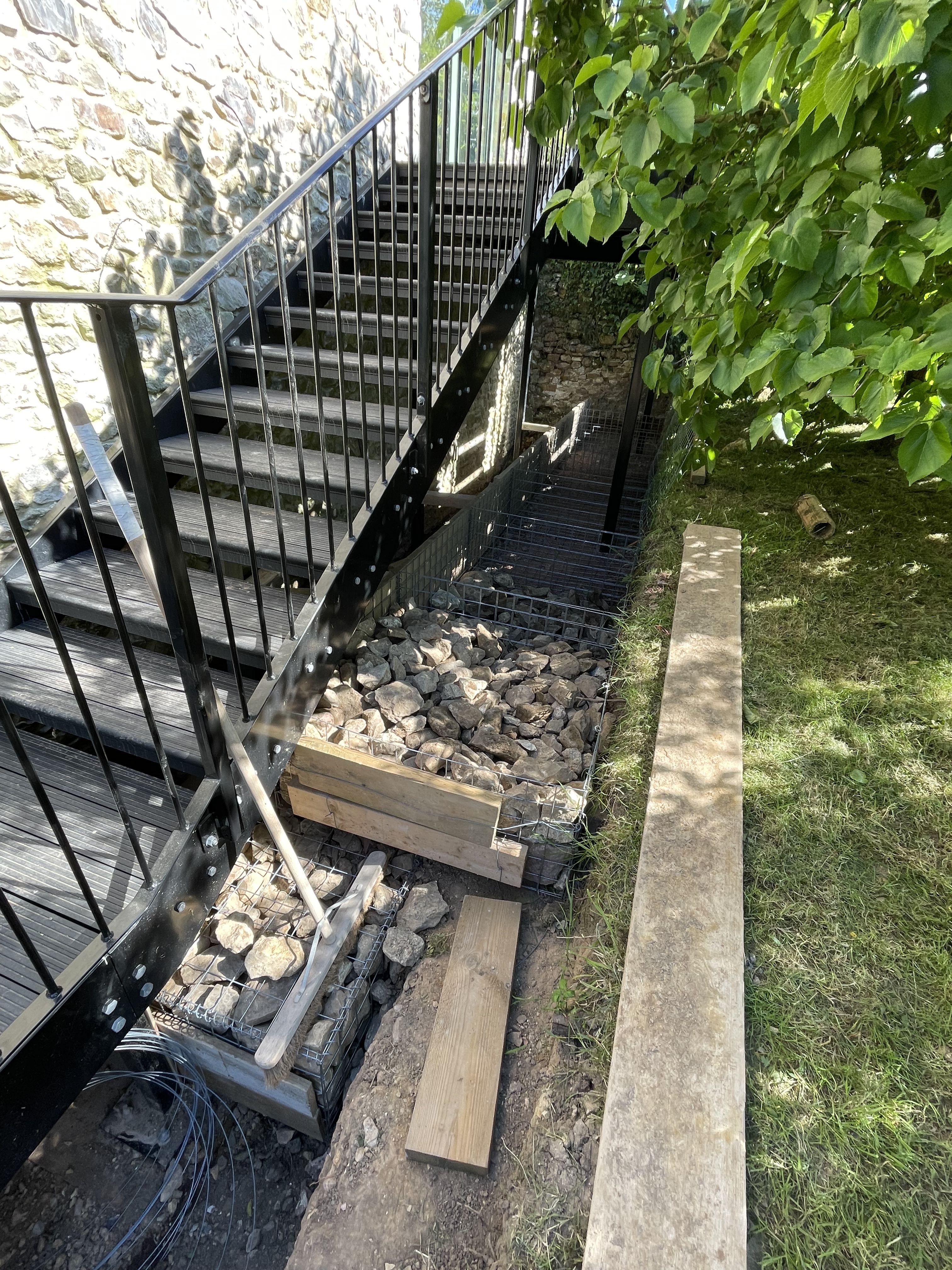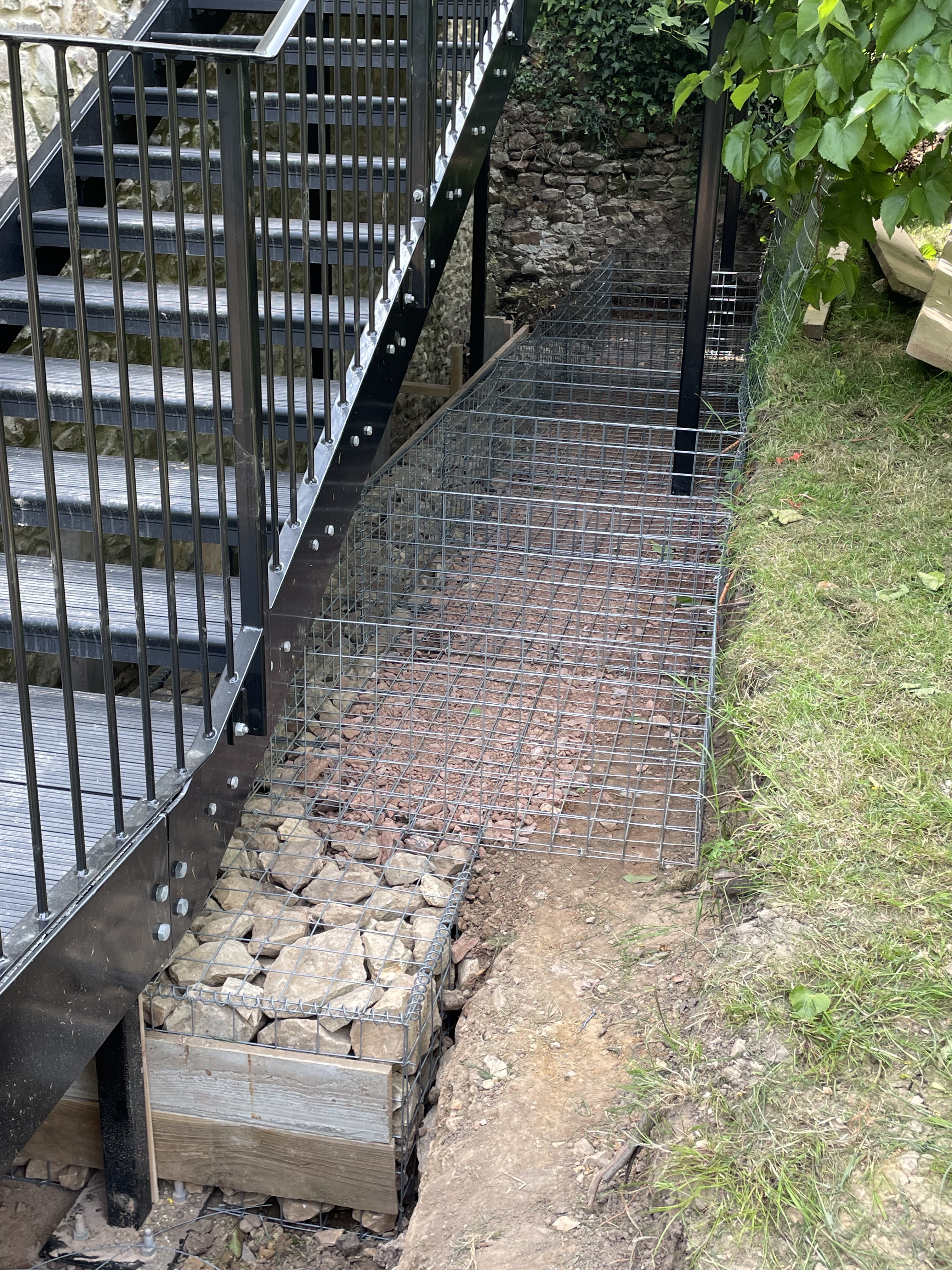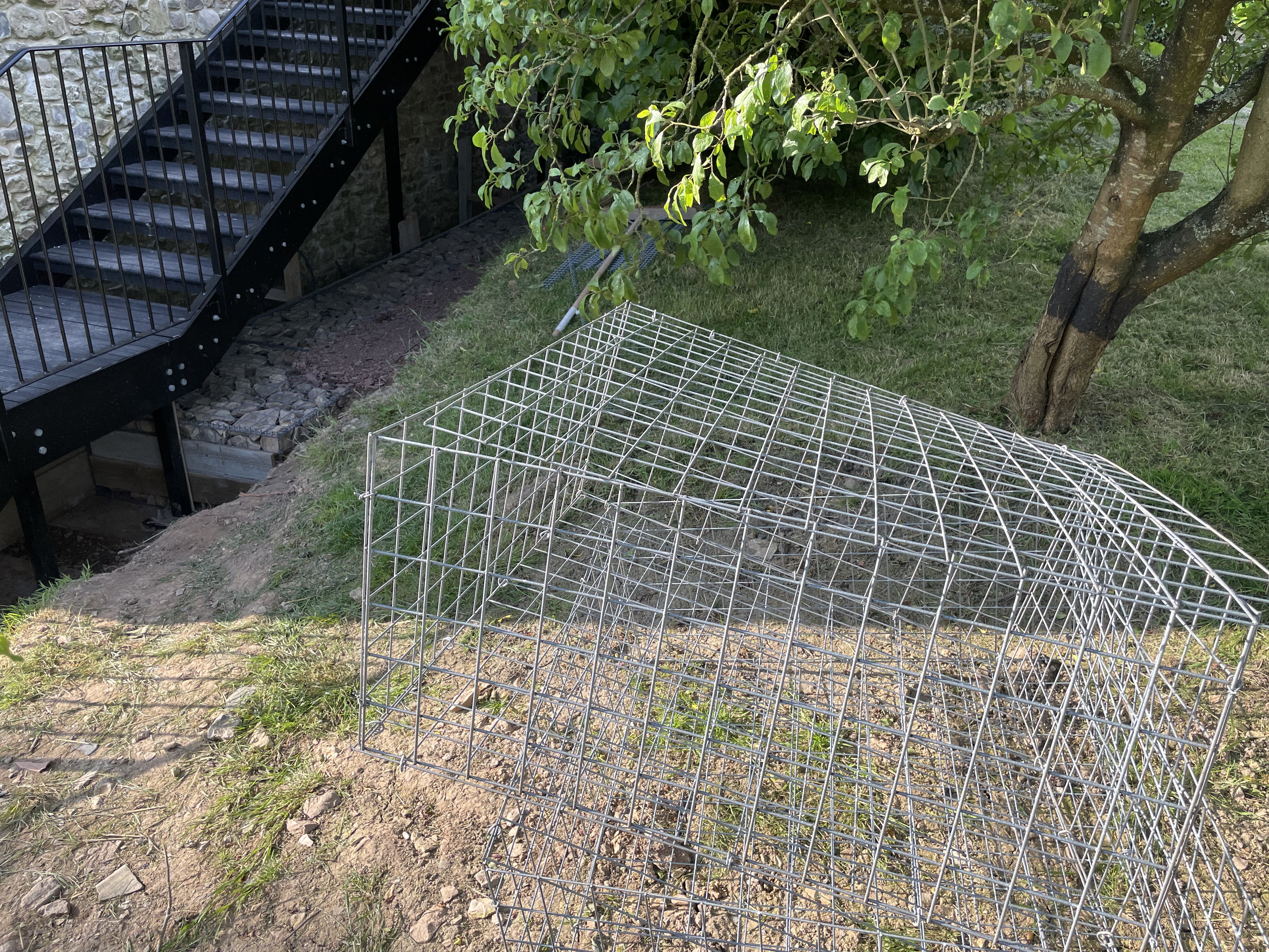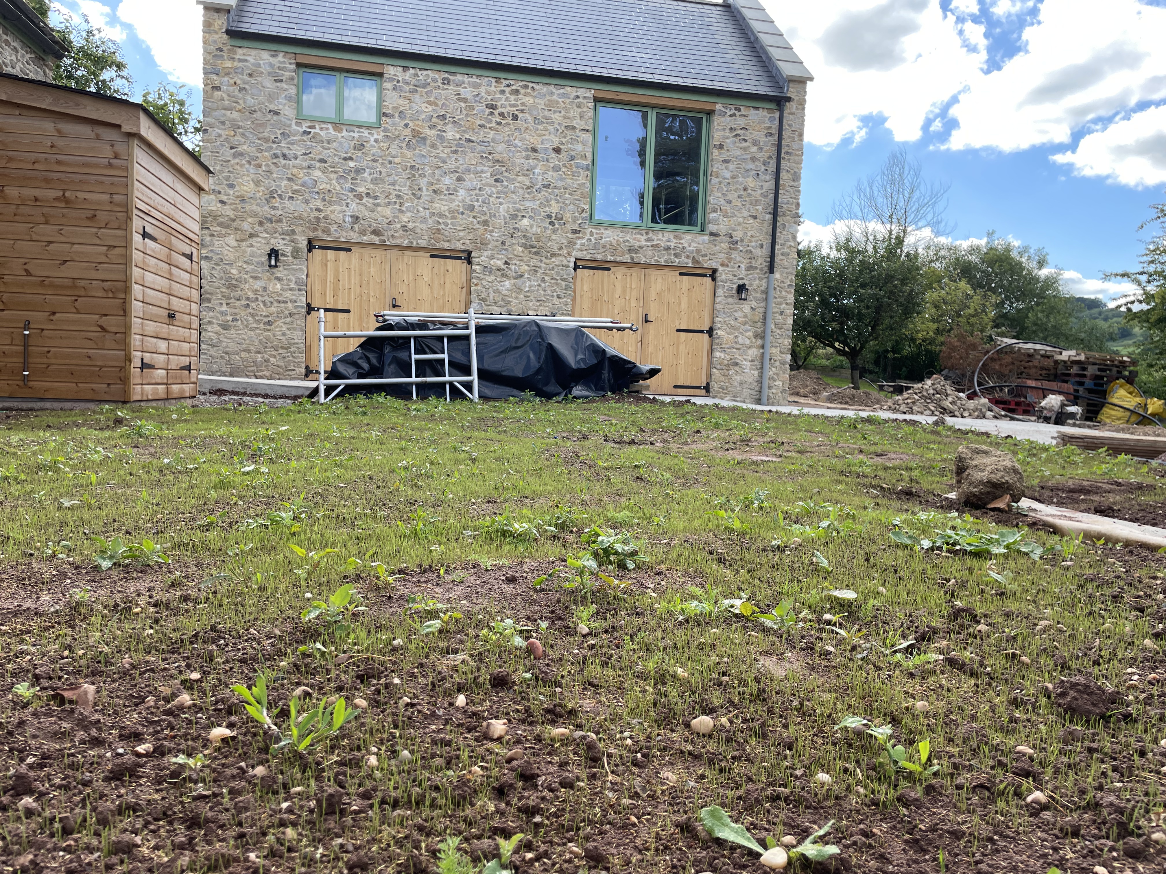 Most of the work completed this week has been in/around the communal building (‘The New Barn’), which is the one building left with significant work to do. With help from two of the concrete contractors, our site manager built the gabions behind our new barn – wire crates that are filled with stone and protect the bank in the orchard from collapsing. He’s finished the top off really nicely with grass, so it blends into the orchard but you can still see the stones which make a nice feature.