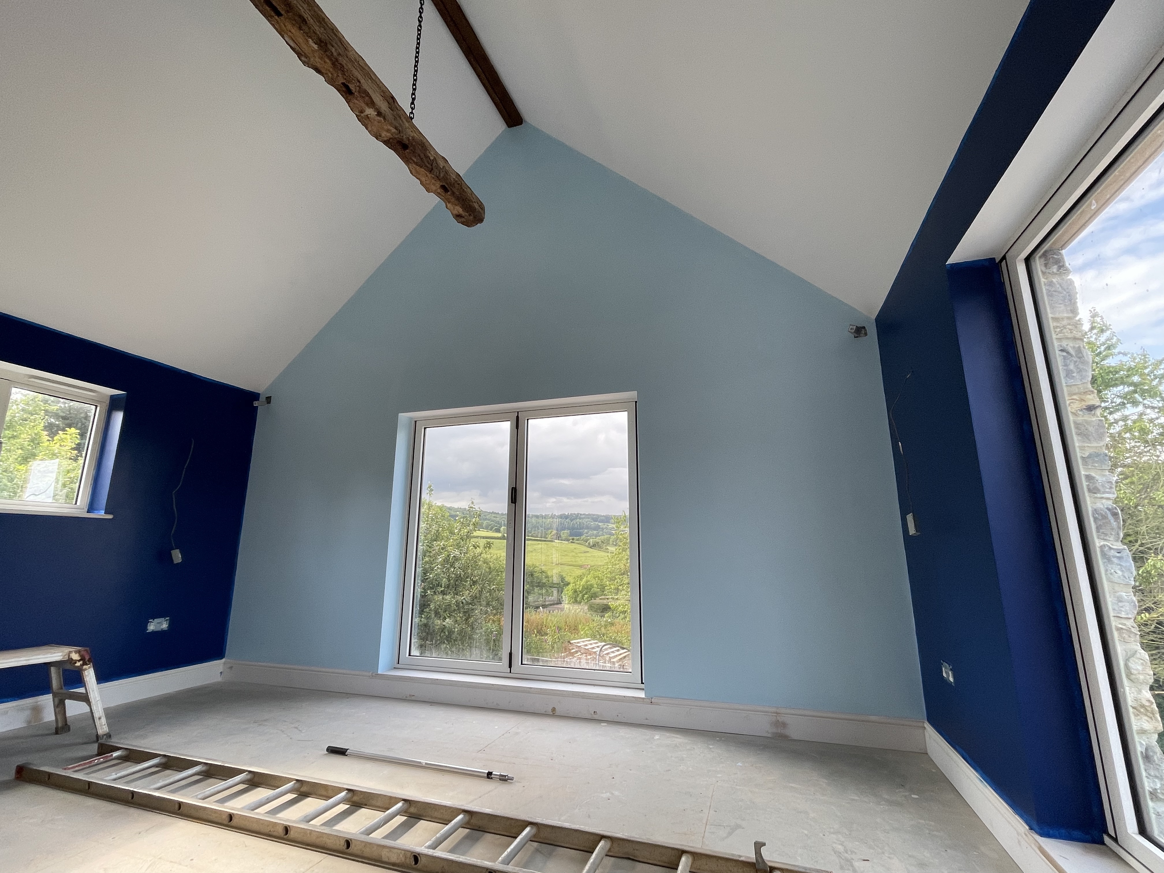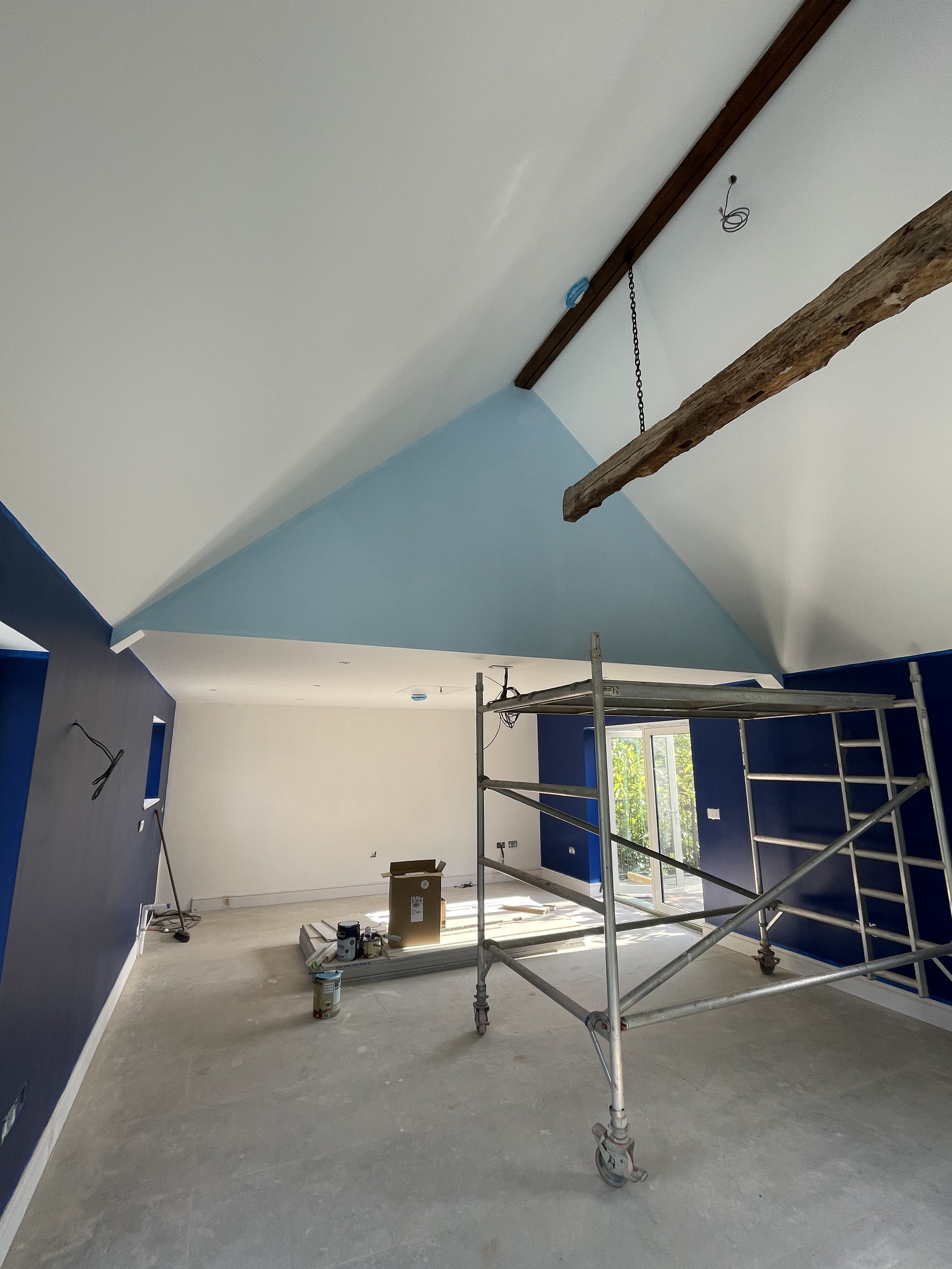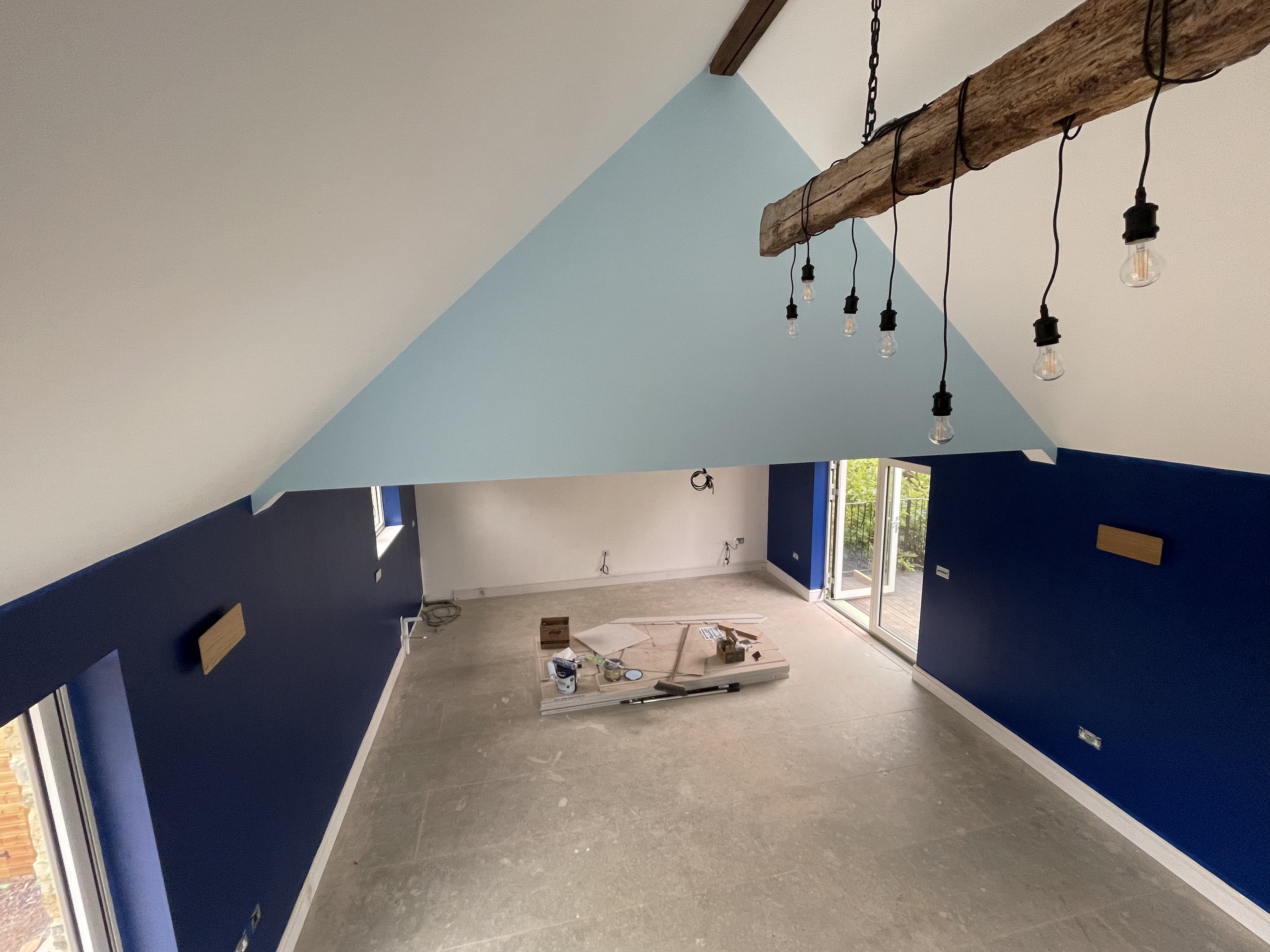We’ve continued painting in the games room too, doing the first coat of light blue paint on the back wall and against the bat loft to start with, followed by the second coat of edging of both blues. We also sanded back the window and bifold door sills and painted the first coat, and cleaned the bottom of the light beam. We hadn’t planned for this room to be a priority job but various fittings are going in next week and it needs to be ready by then. It also hopefully means we can finish with the platform soon so the flooring can go down.