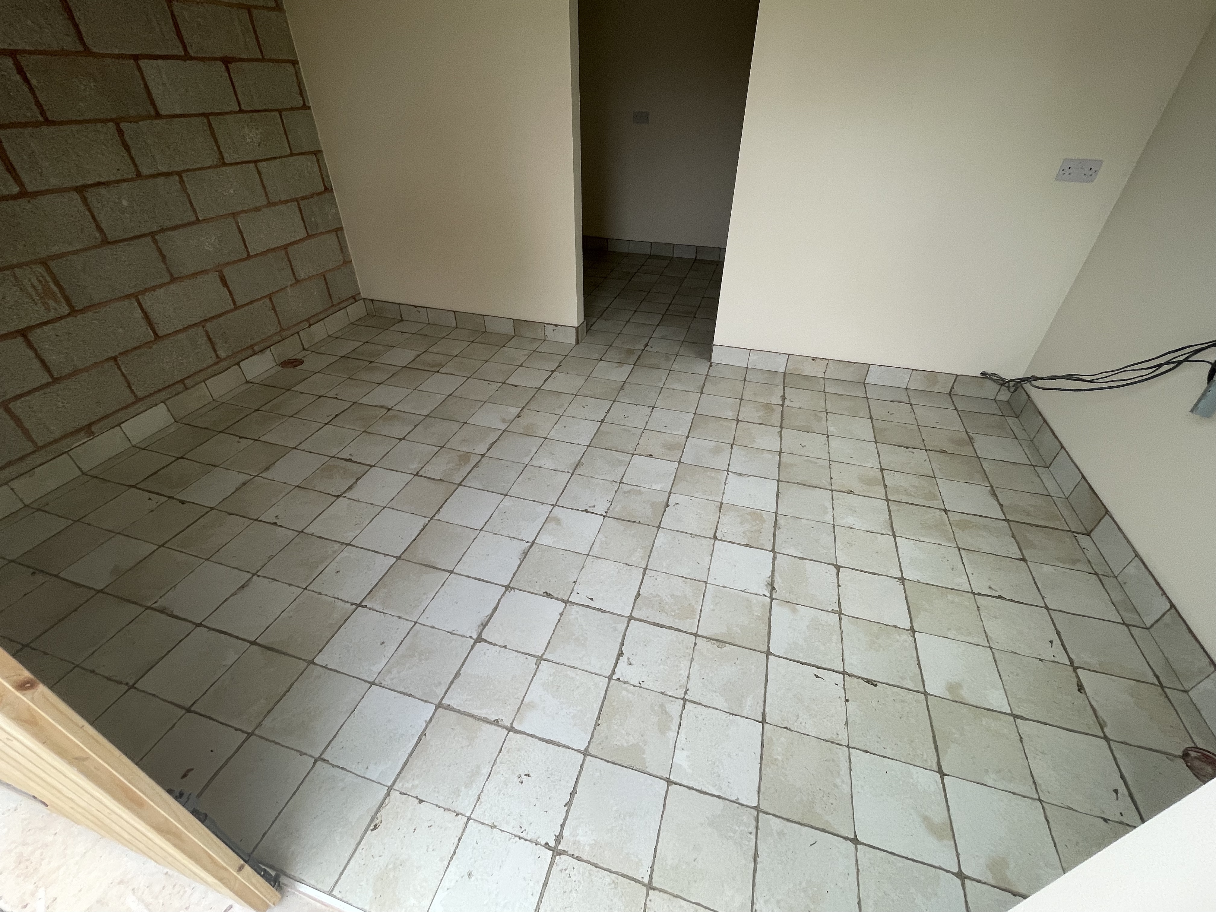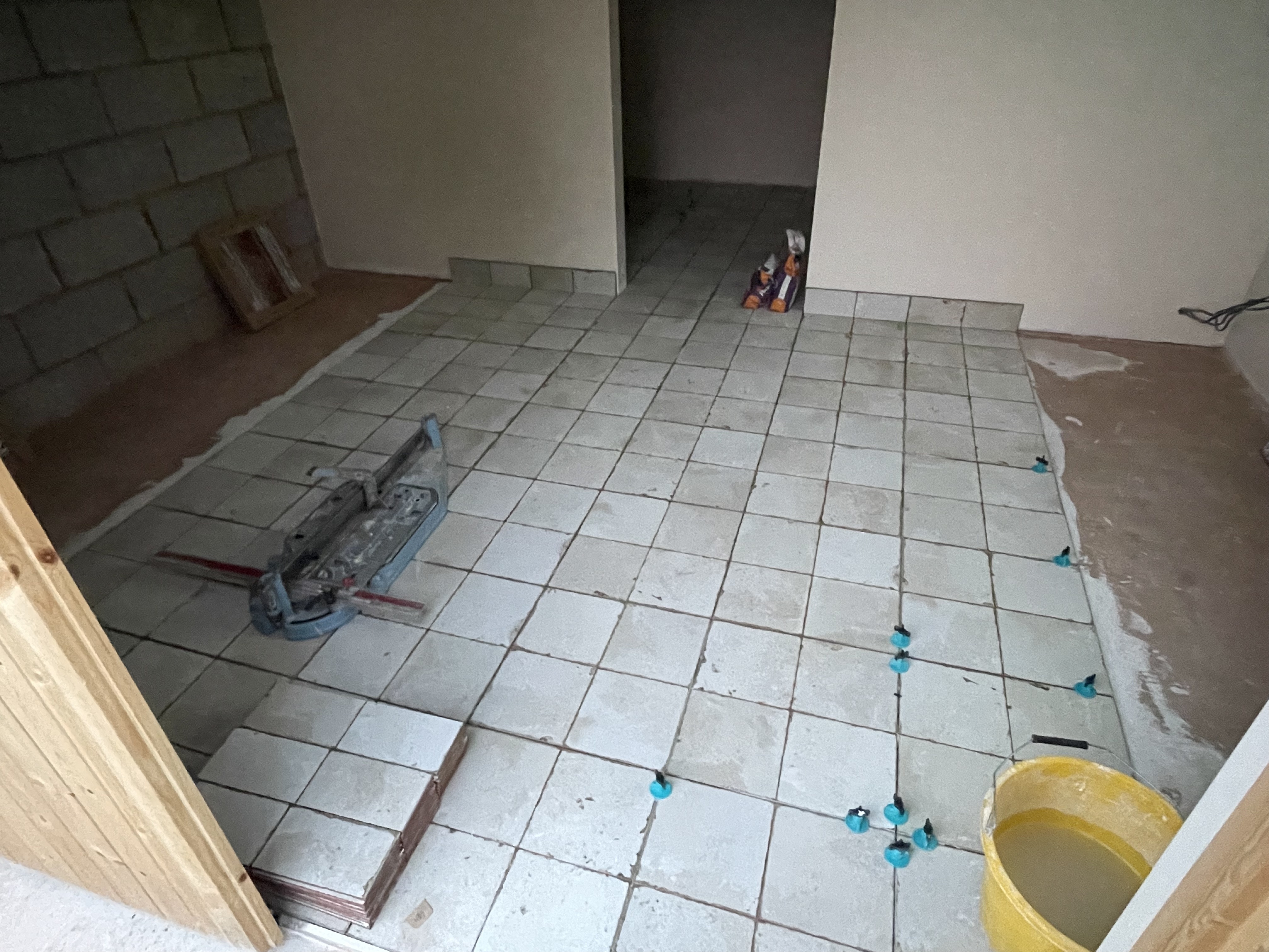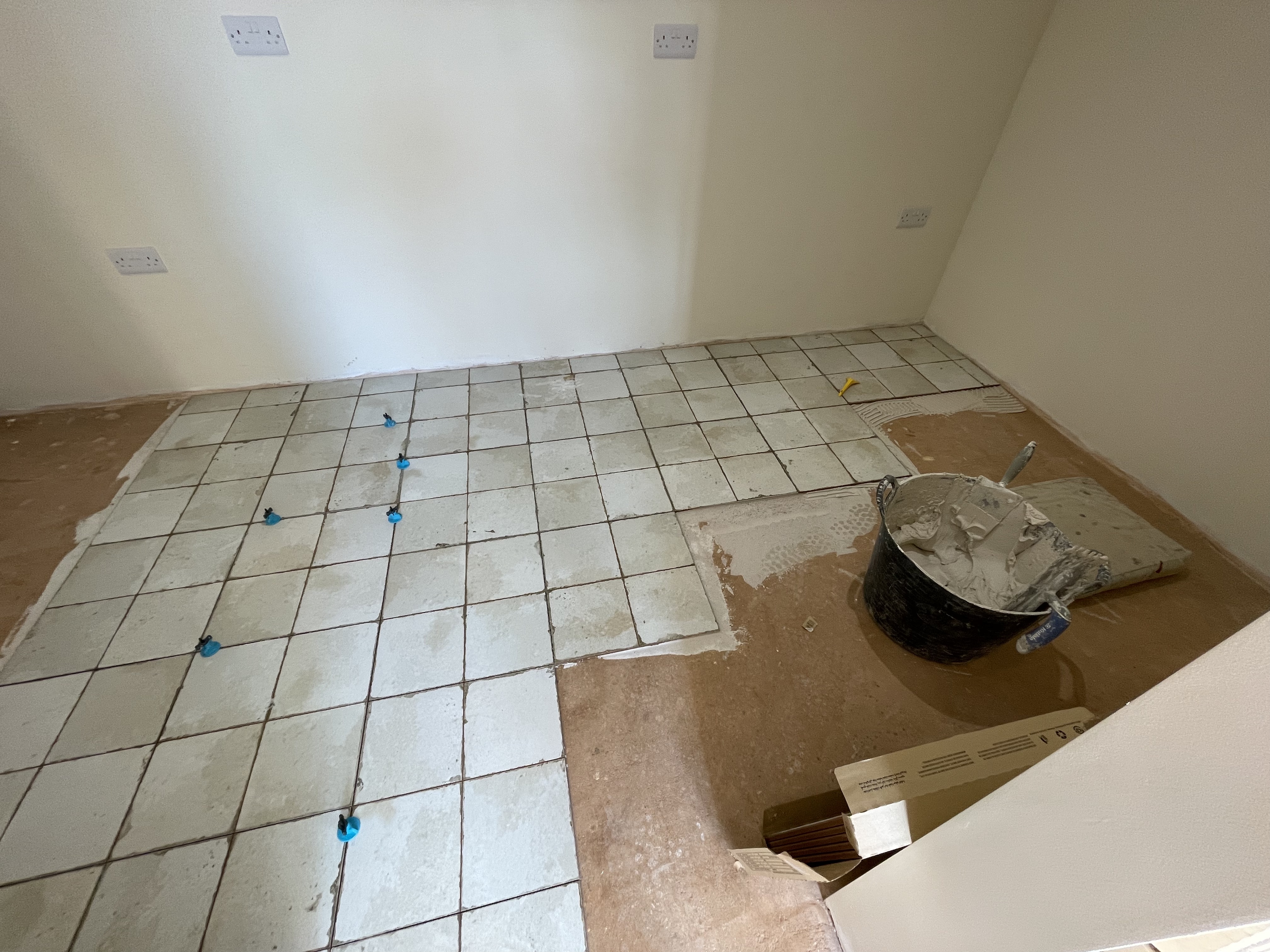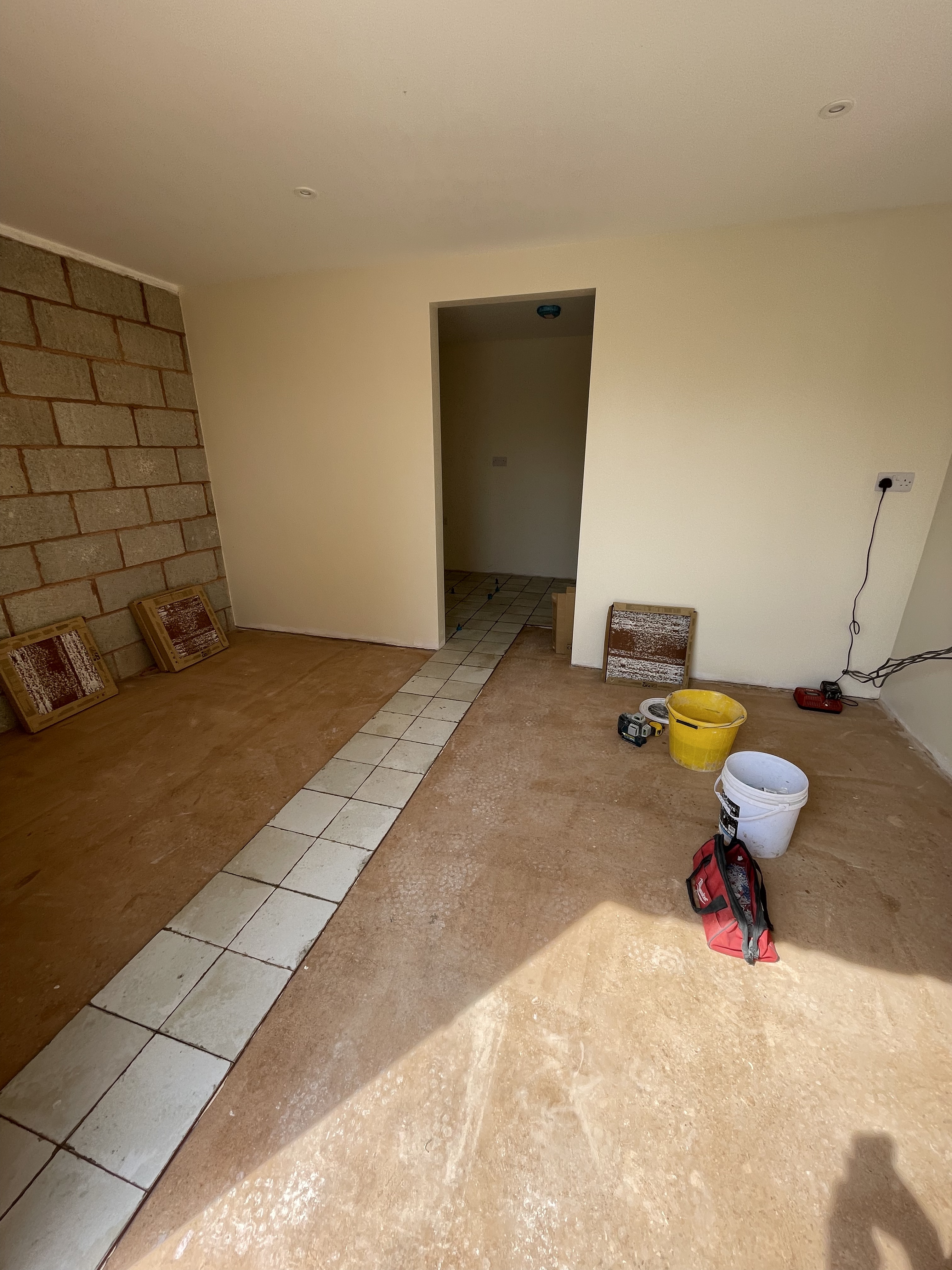 We’ve had both the tiler and the electricians on site this week. The tiler has completed the laundry floors – we used a tile similar in design to the farmhouse floor tiles for continuity. He’s added a little skirting around the walls with leftover tiles and it looks so good!