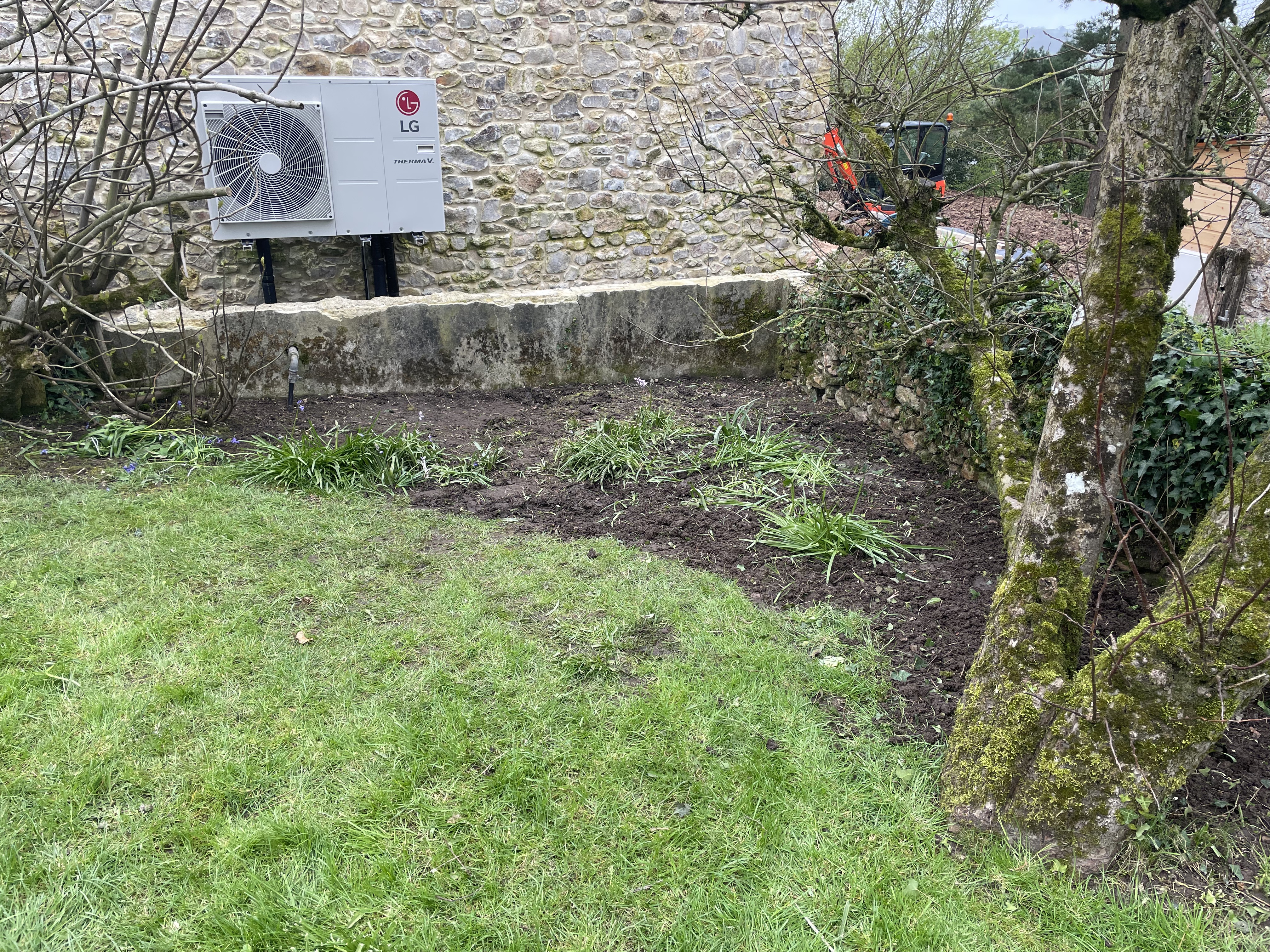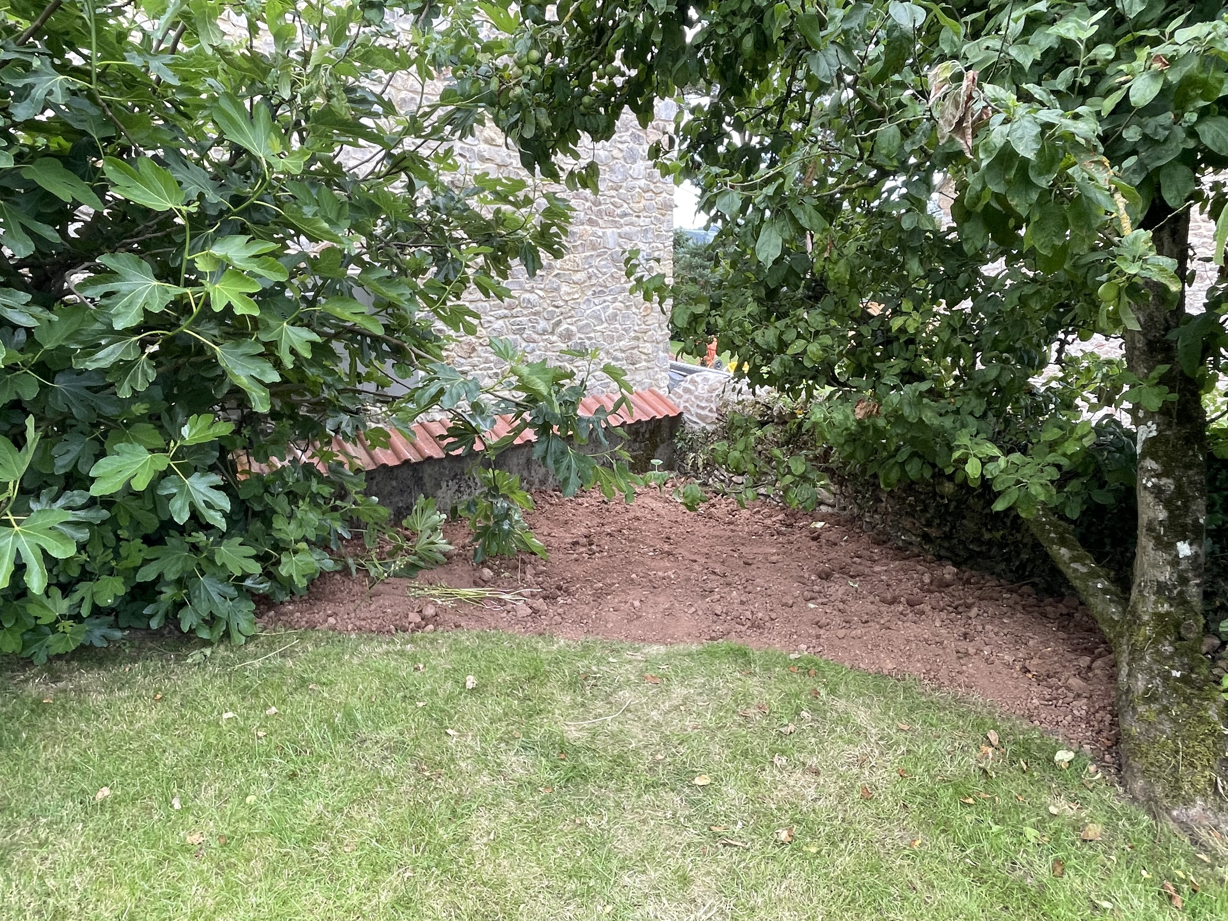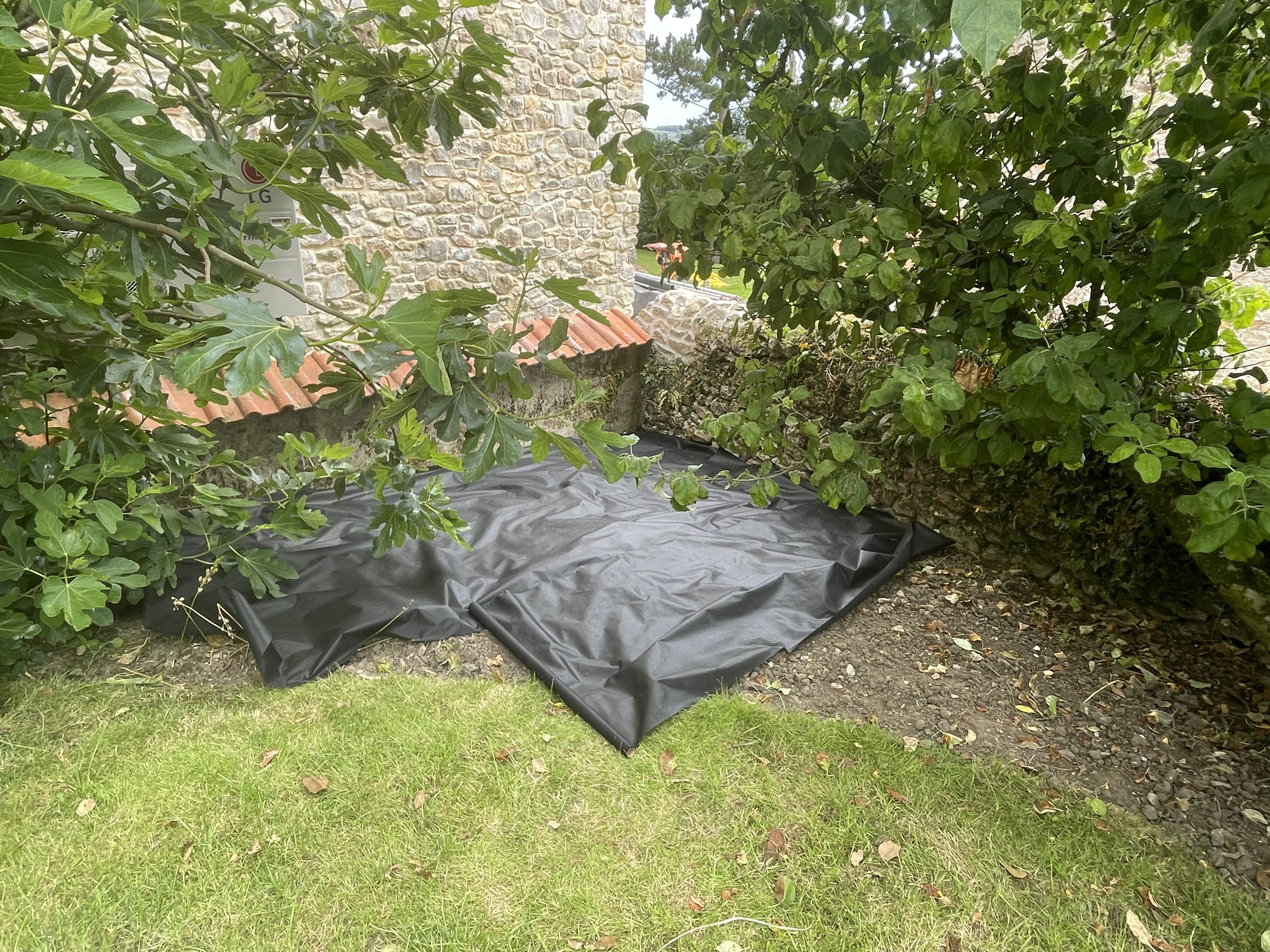 The other work they’ve done for us is to put tiles on top of the wall of the old barn that adjoins the farmhouse front garden. This was left when they demolished the derelict barn over a year ago and moved the new barn a foot away to avoid the need for a retaining wall. It was mainly grey concrete render and broken breeze blocks and looked a mess – it’s so much smarter now! It also meant we could finally lay the weed membrane and move the pile of soil from outside the front of the farmhouse without worrying that anything we did would be in the way / get trampled in the process. The weeds tried reclaiming the area over the three months since we first cleared it – the membrane was definitely required! Hopefully it’s thick enough to work, and the wild flowers will hold them back (once we seed it that is).