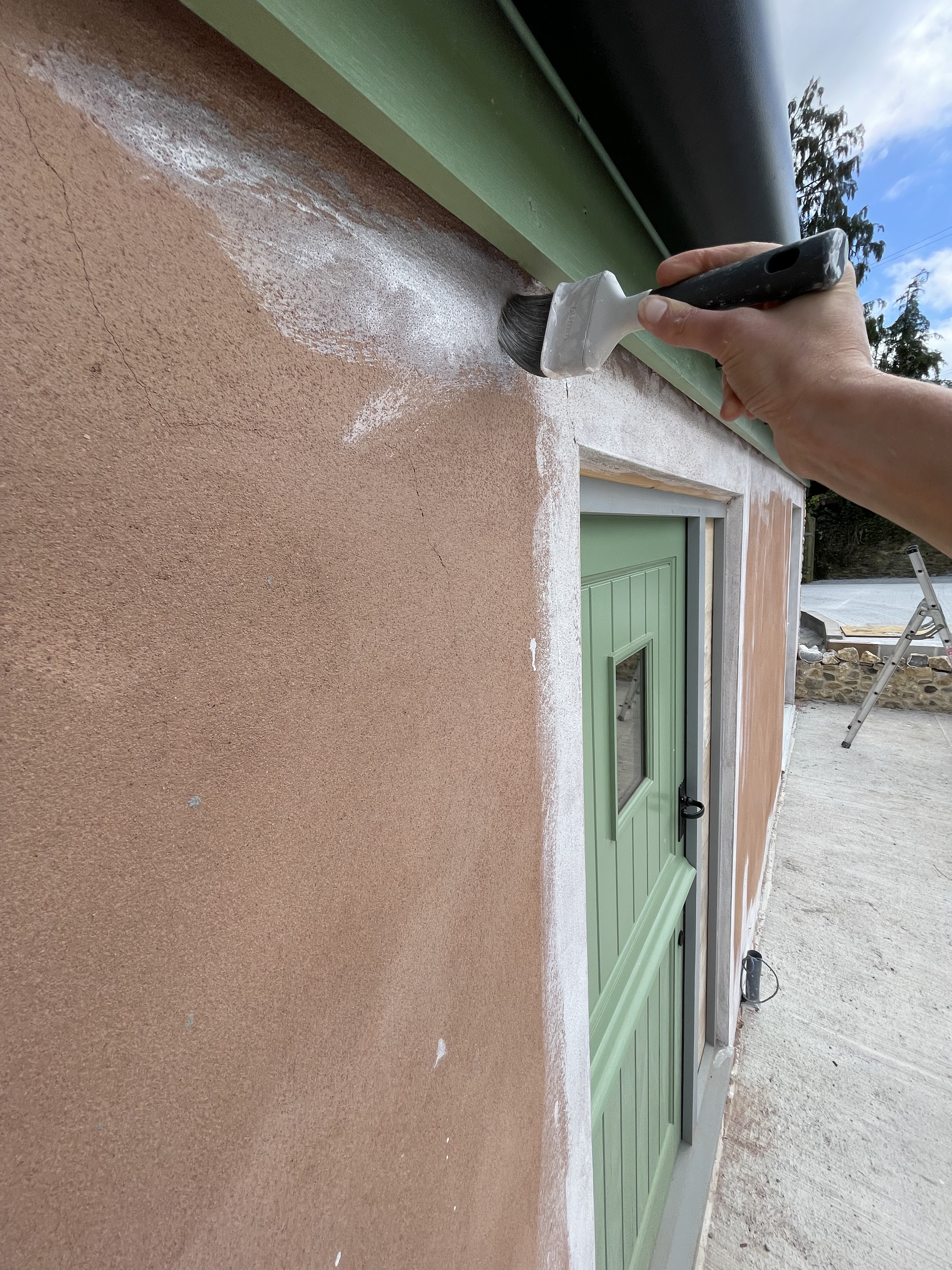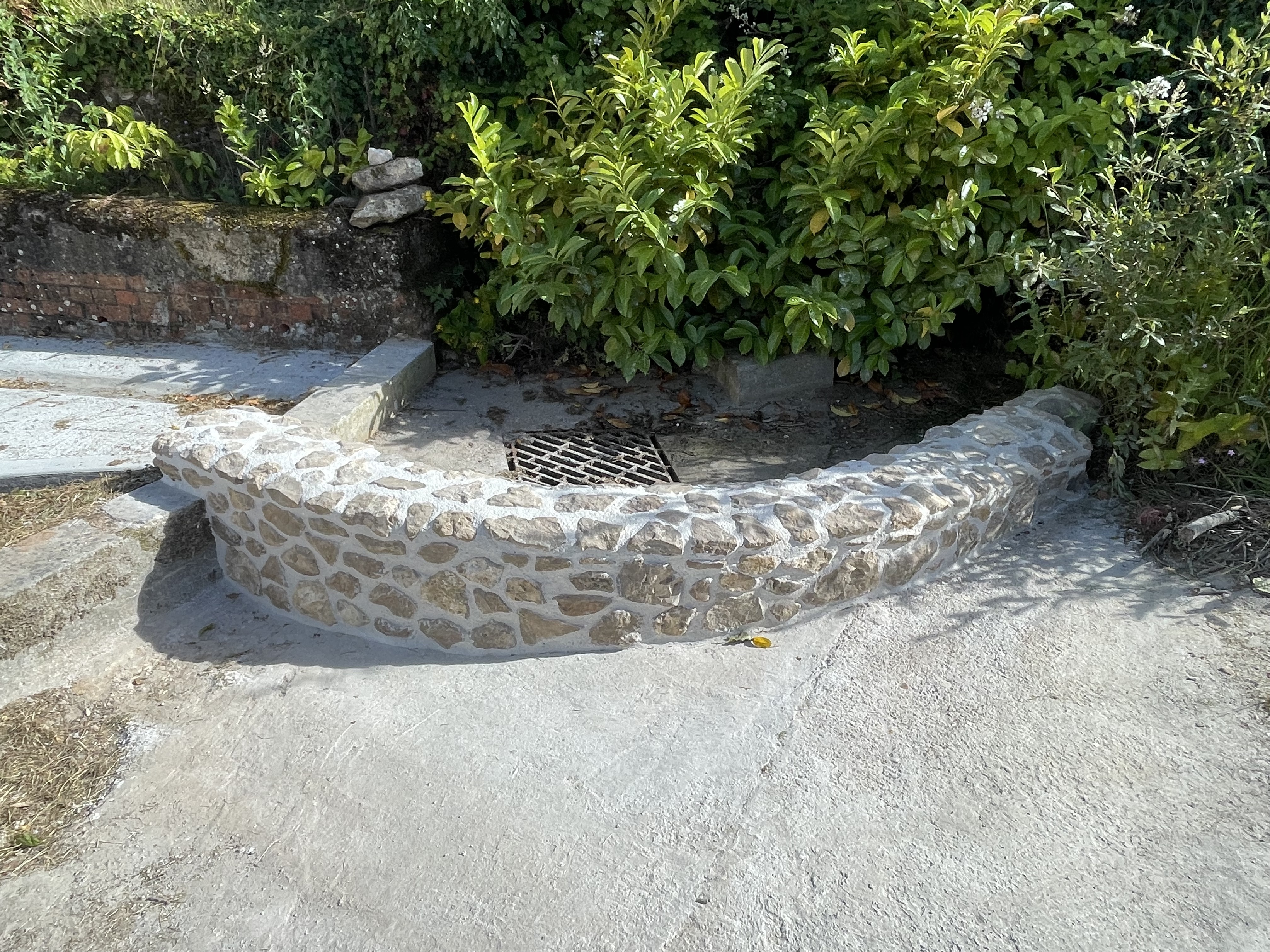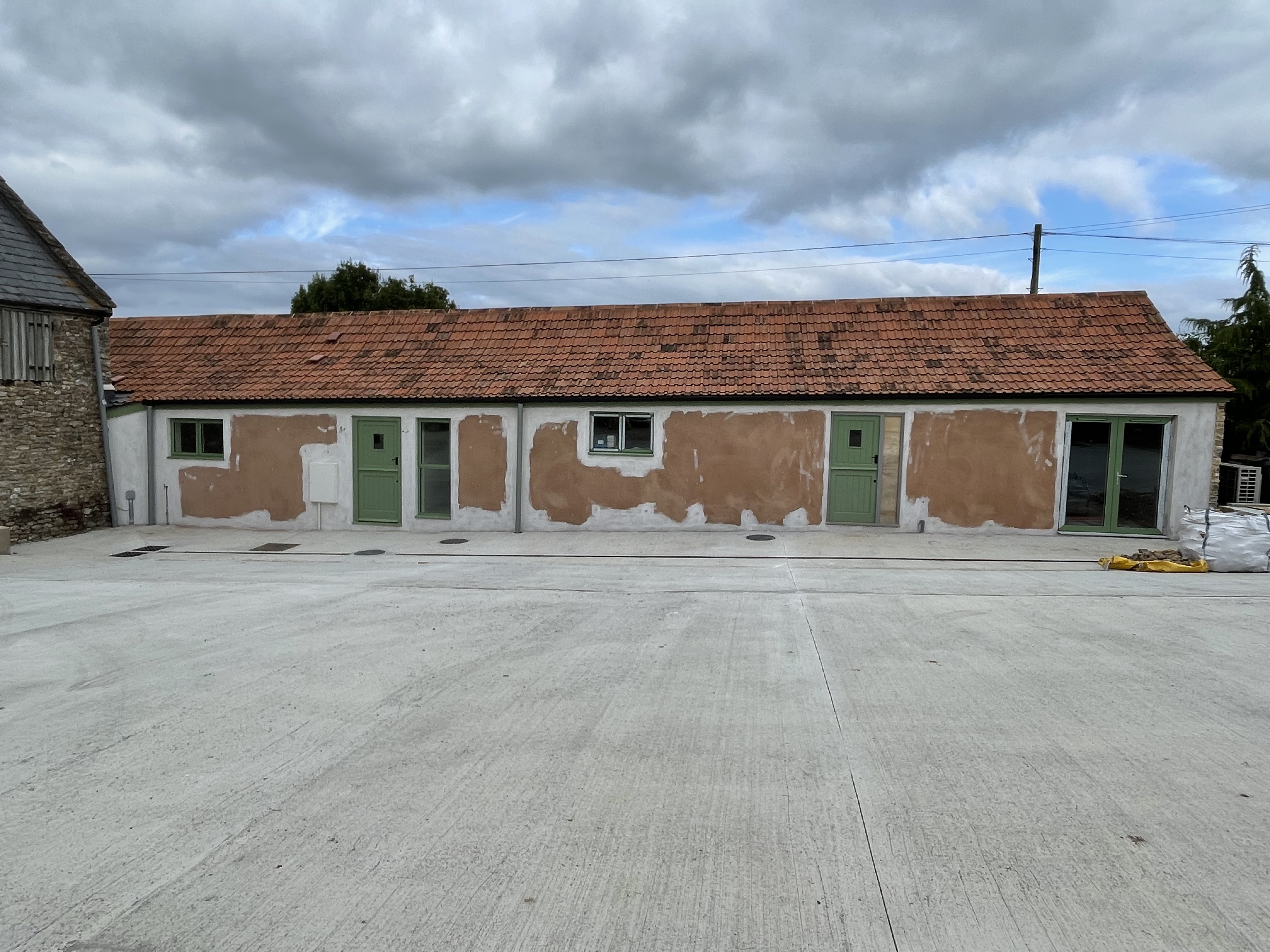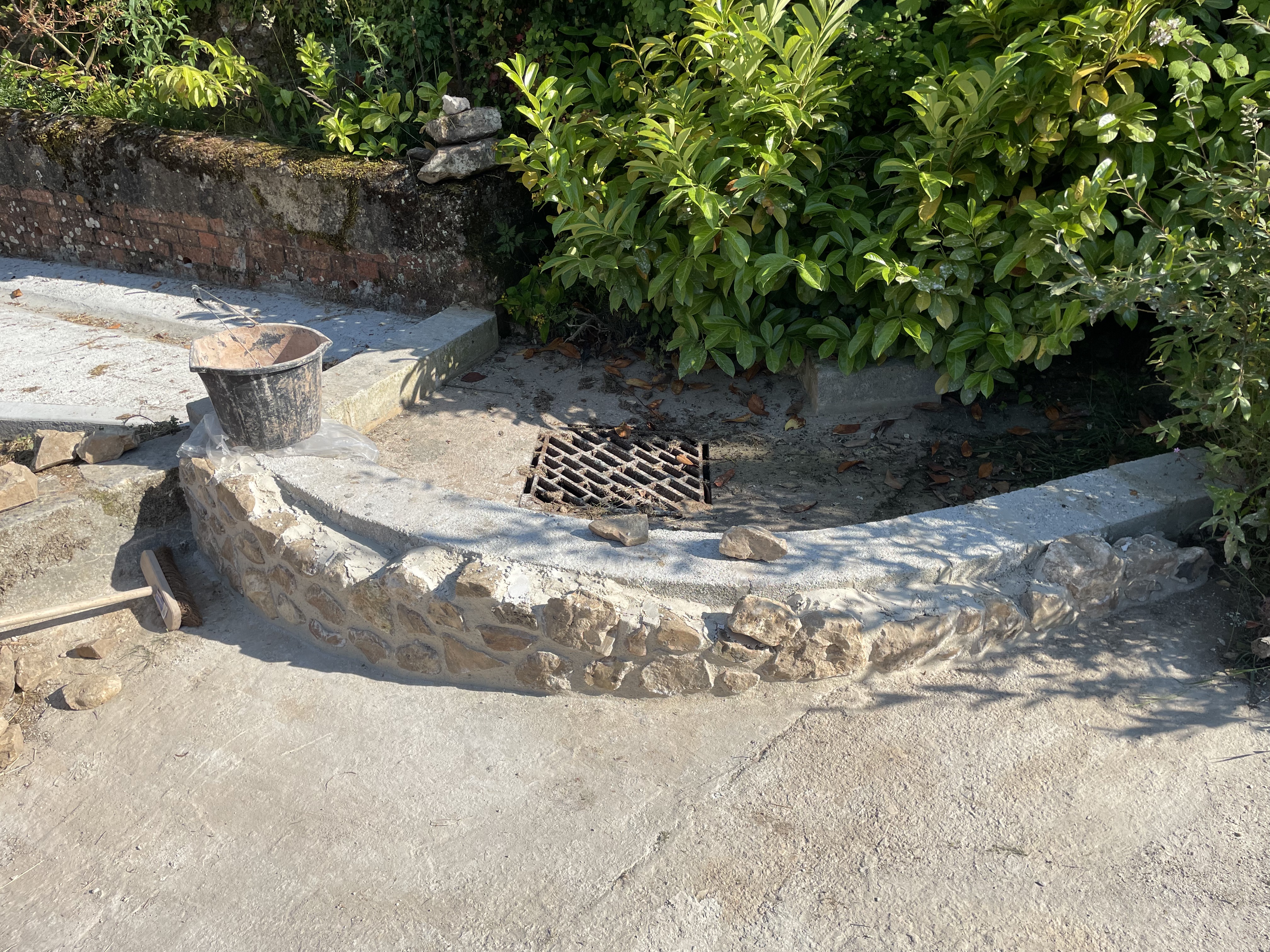 And they’ve been building various stone walls across the site – the first is around the main drain entry point for the water that comes down off the hill, that had been left as breeze blocks since they first built it. The second is by the French windows of the one-bed cottage. Now the concrete yard has been laid and levelled to direct excess rainwater away from the buildings, we have a level that the wall needs to build up to so that you don’t open the French windows and just stare at concrete. We want to make this area into a little garden for the one-bed cottage, but as the council don’t like the idea of sectioning the yard off or using trellis of any kind, we need to think a bit more about how to make this work.