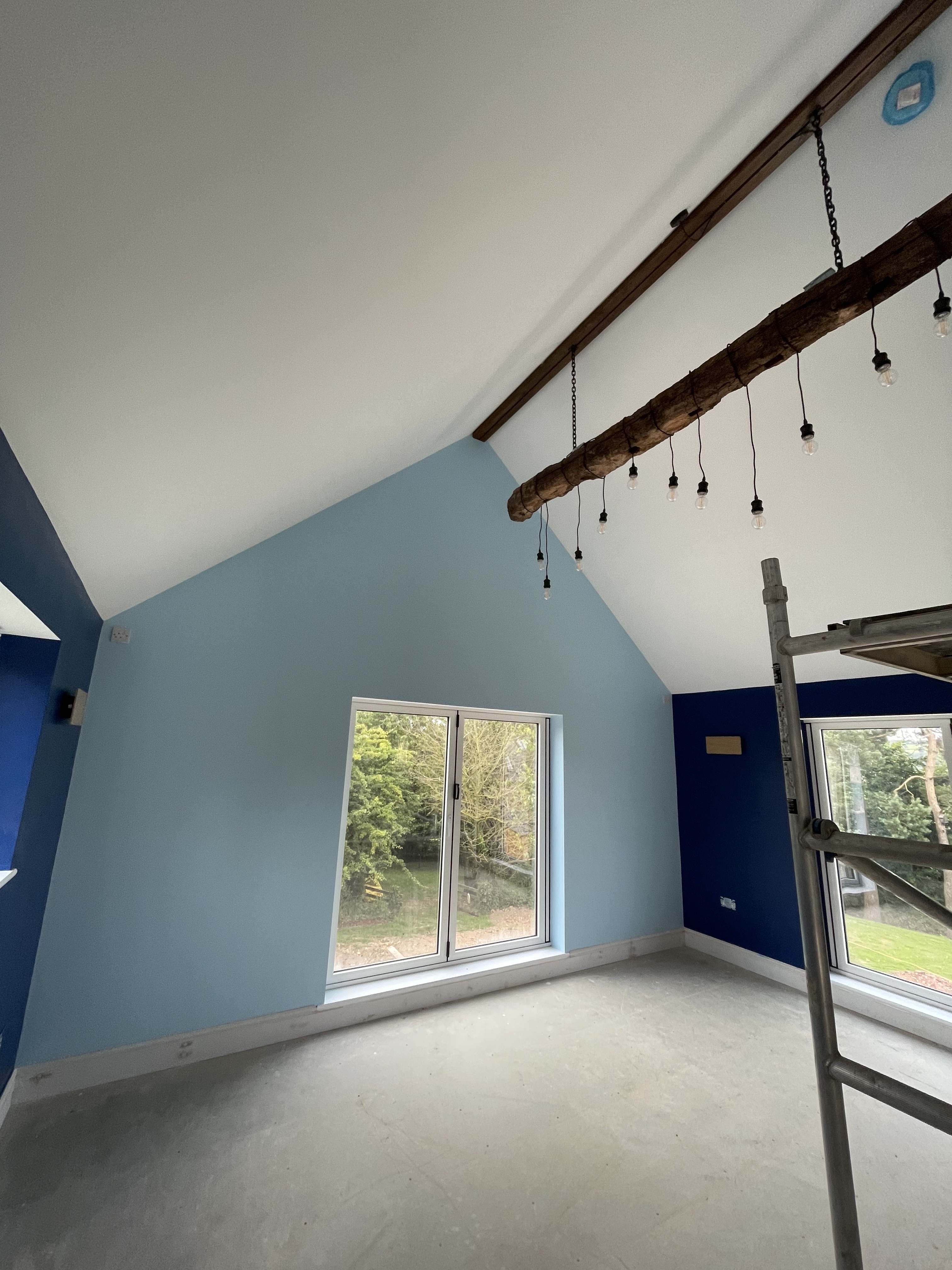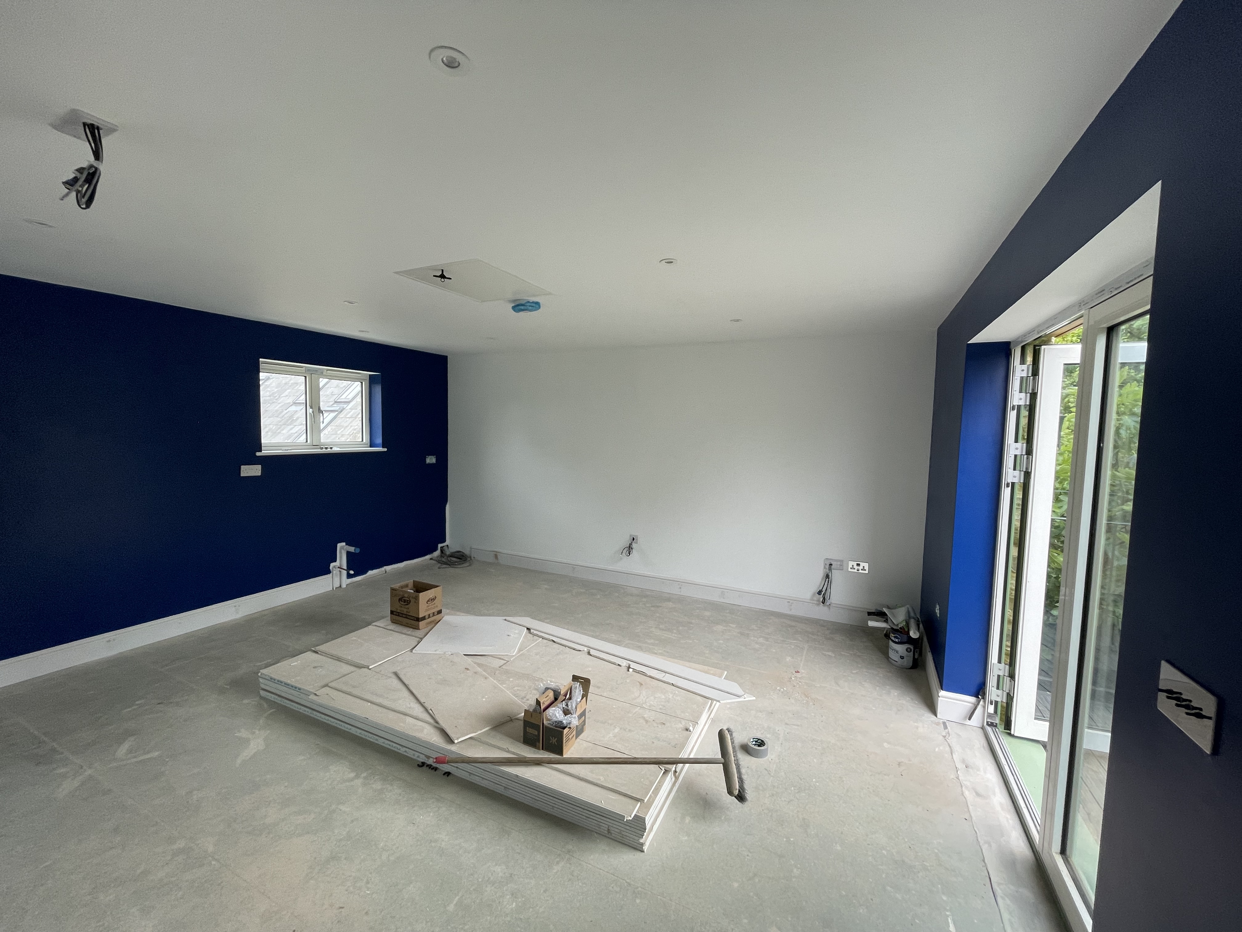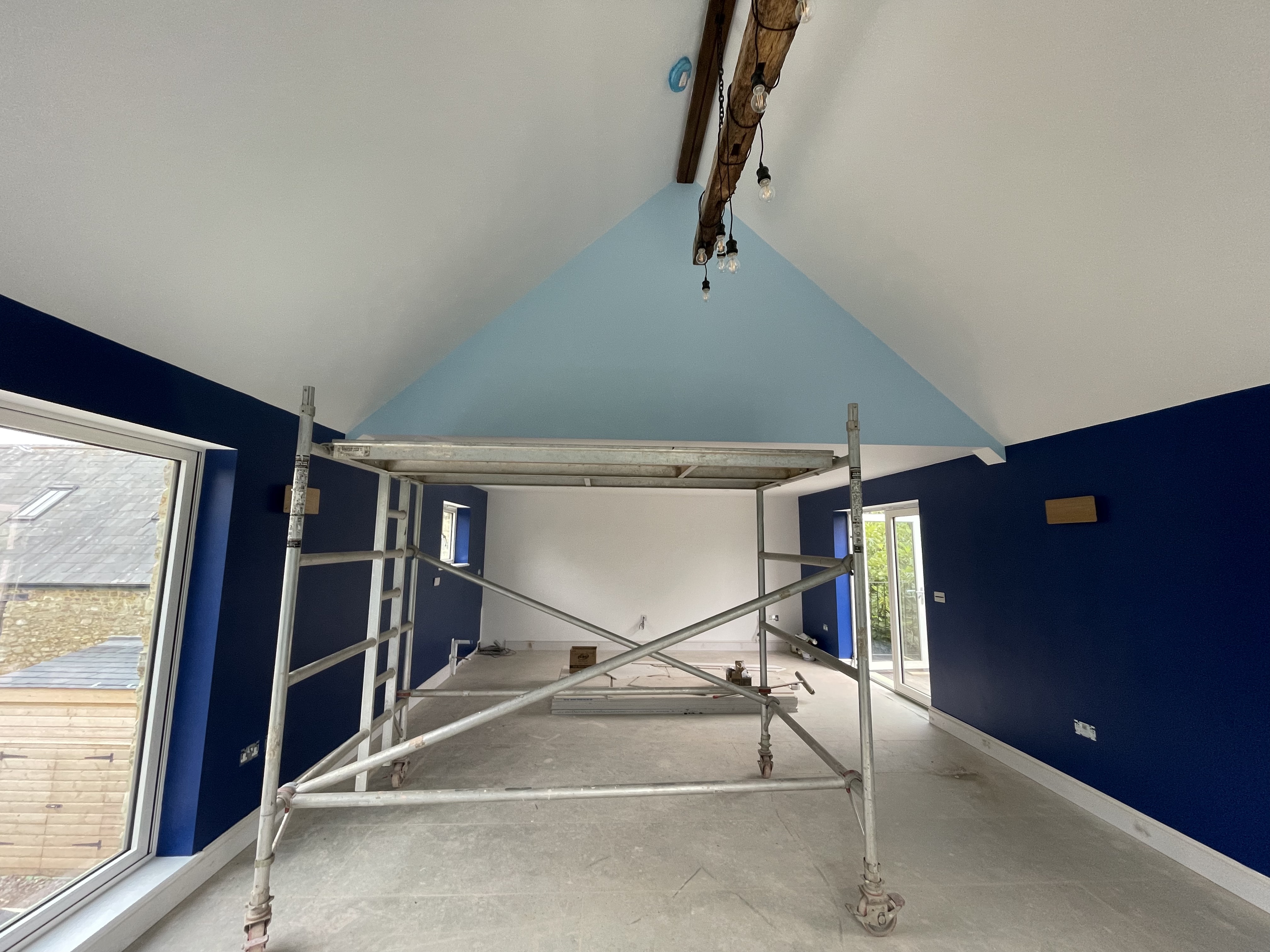 We’ve also made real progress with painting – or it feels like it at least. We wanted to finish painting the games room before the internal fittings (balustrades in front of the windows and a small kitchenette) went in, so it reached top priority of the job list for us this week. It’s been a bit of a nightmare room mainly because of our choice of paint – the dark blue is almost impossible to edge straight against the lighter colours, and it needed between 3-5 coats which took extra time. We managed to finish it this week though – painting the white ‘projector wall’, finishing the final coat of light blue, edging the whole room multiple times, and painting the window and door sills ready for the balustrades to sit on. Despite getting this far, we’re unlikely to actually finish the room for a while now. Once the builders have finished, the last thing for us is to sand and paint the skirting board, but it’s not on the critical path to renting out the farmhouse so it’ll wait until that’s ready. The stairs have finally been taken away to be repaired/replaced and won’t be ready for at least two weeks, so there’s no point in holding any rental up for them.