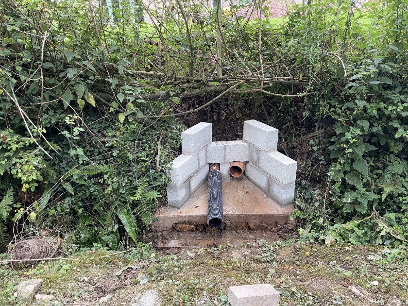 It definitely feels like we’re coming to the end of the build phase now – with most of our jobs being finishing touches outside.It’s mainly been our site manager here for the last few weeks – plus any tradespeople such as the concreters that were needed. This week one of the other builders came back to help with the final push, as our site manager is now due on another project. With a week of wall-to-wall sunshine, their focus (and most of ours) was getting through the outside tasks – the cement mixer seems to have been going constantly! They’ve built a headwall in the bank in the wood just where the water pipes empty into, to give the area more stability and prevent any risk of the bank slipping in future. They’ve also done some lovely concrete sculpting inside the drain covers – we can only assume it’s to effectively channel any water down into the drain as it would be a real waste of a fabulous job otherwise!