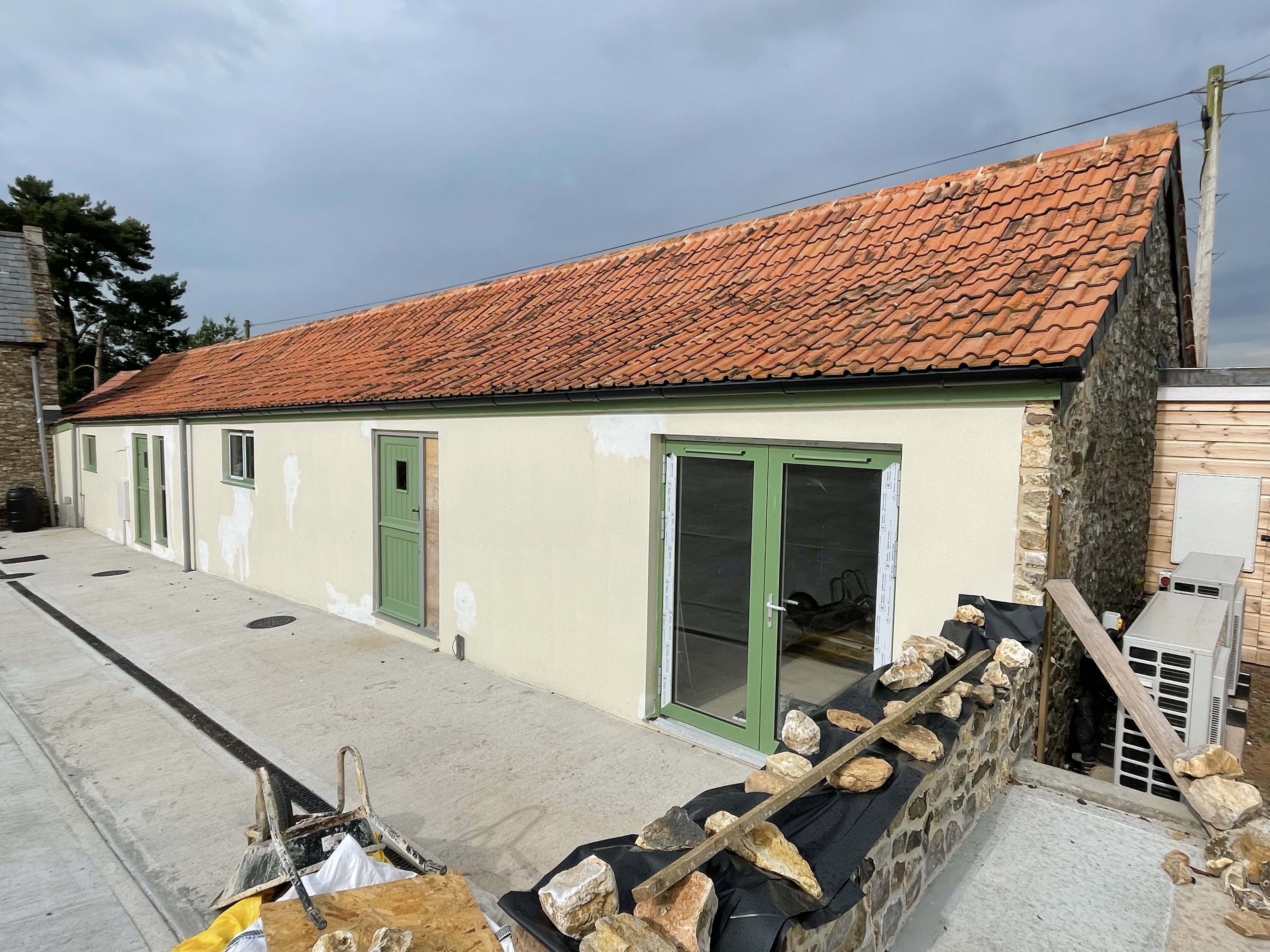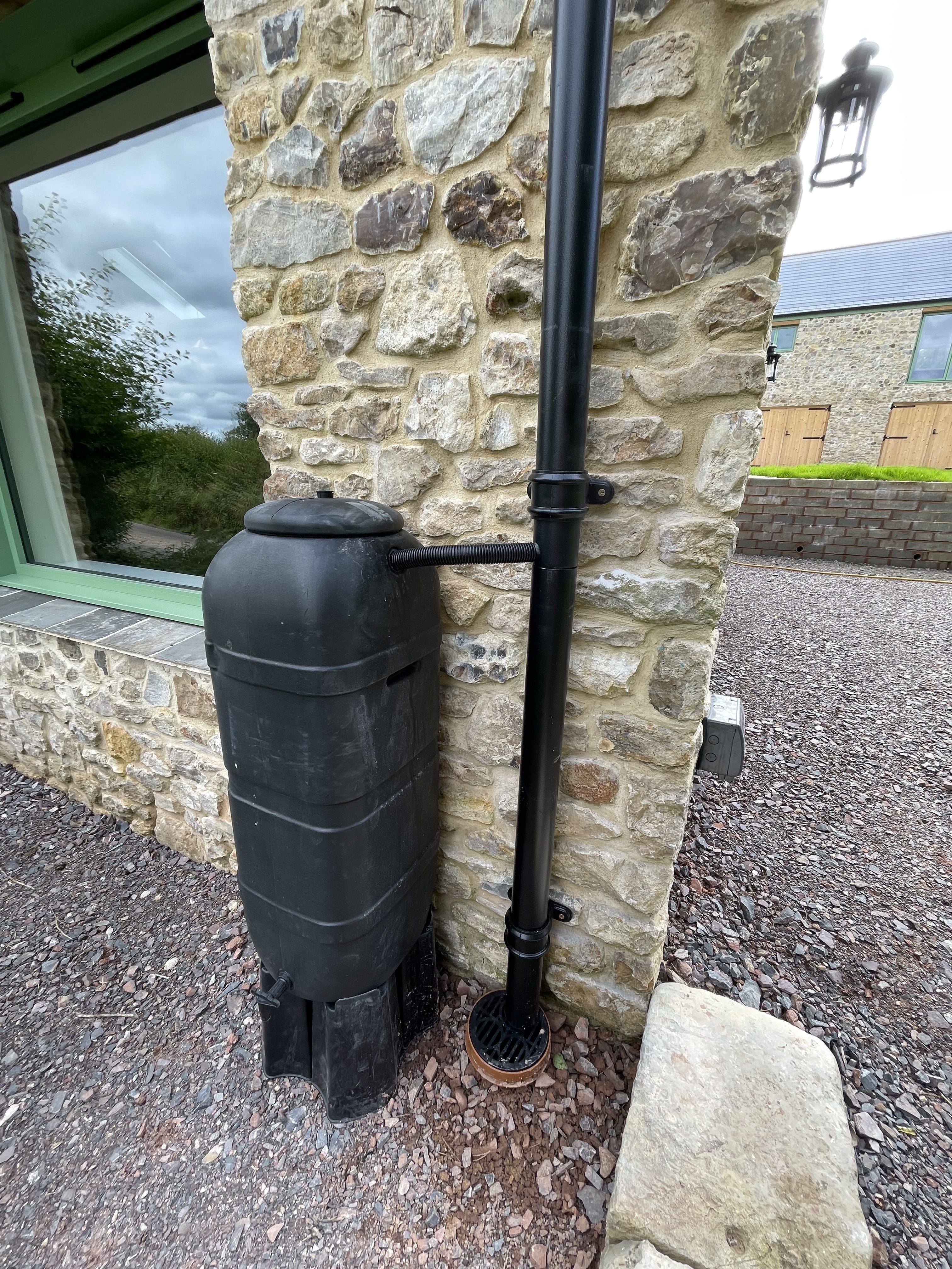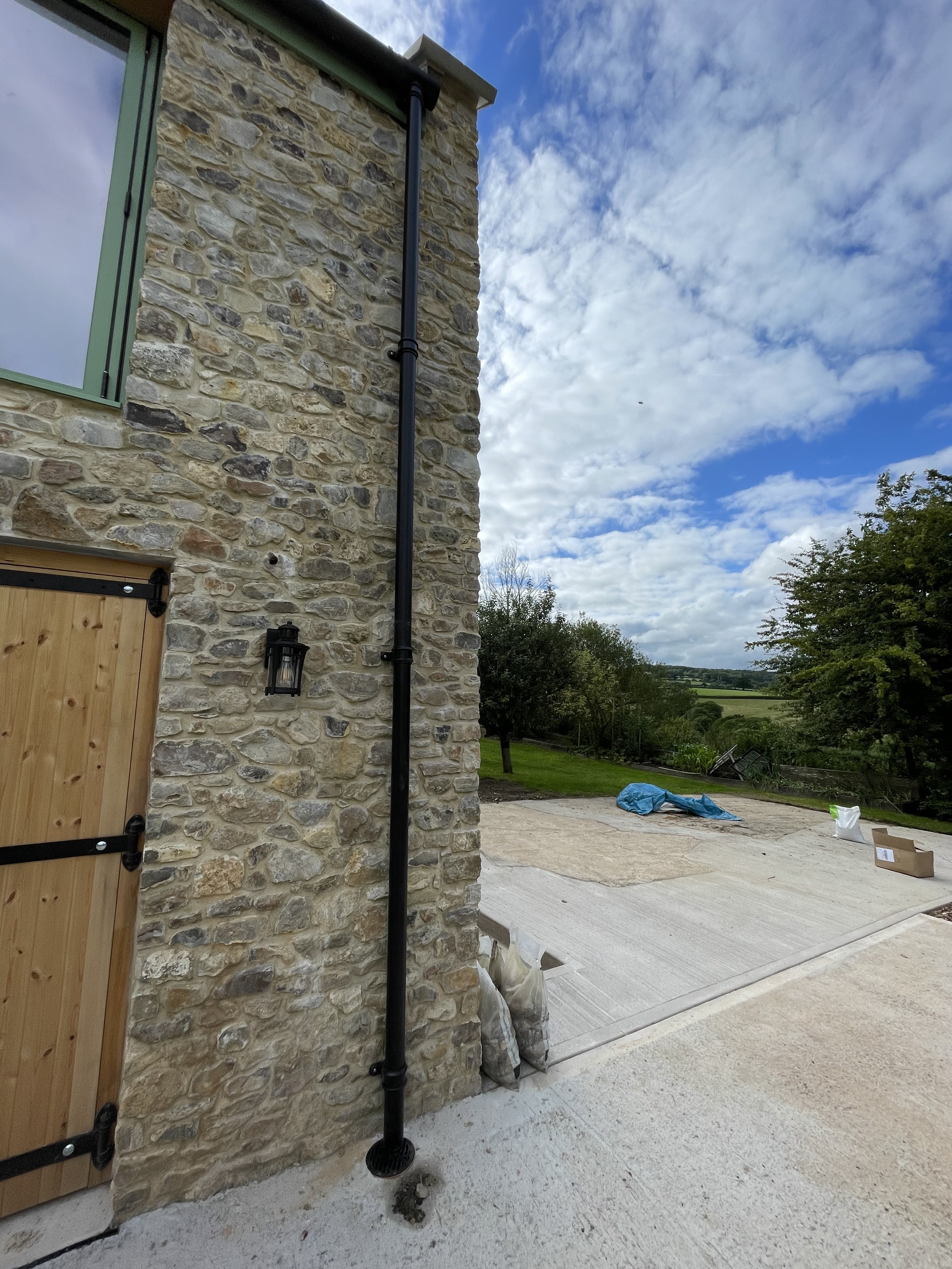 It’s been a relatively quiet week on site. The renderer came on Monday to repair the cracks and the areas that had blown, which John then primed while I was away for the day with work. We didn’t get round to painting it this weekend so will try during the week if the weather is kind – once this is finished then the protective covering on the downpipes can be removed and the water butts installed. The carpenter has been on site doing various jobs – one of them being to start removing the protective casing around the downpipes on the new communal barn, at the back of the three-bed barn and at the back of our new house, which he’s also added a water butt to. We have two more water butts that’ll be going in the front so we can use the water for the various flower pots we’ll have around the front doors.
