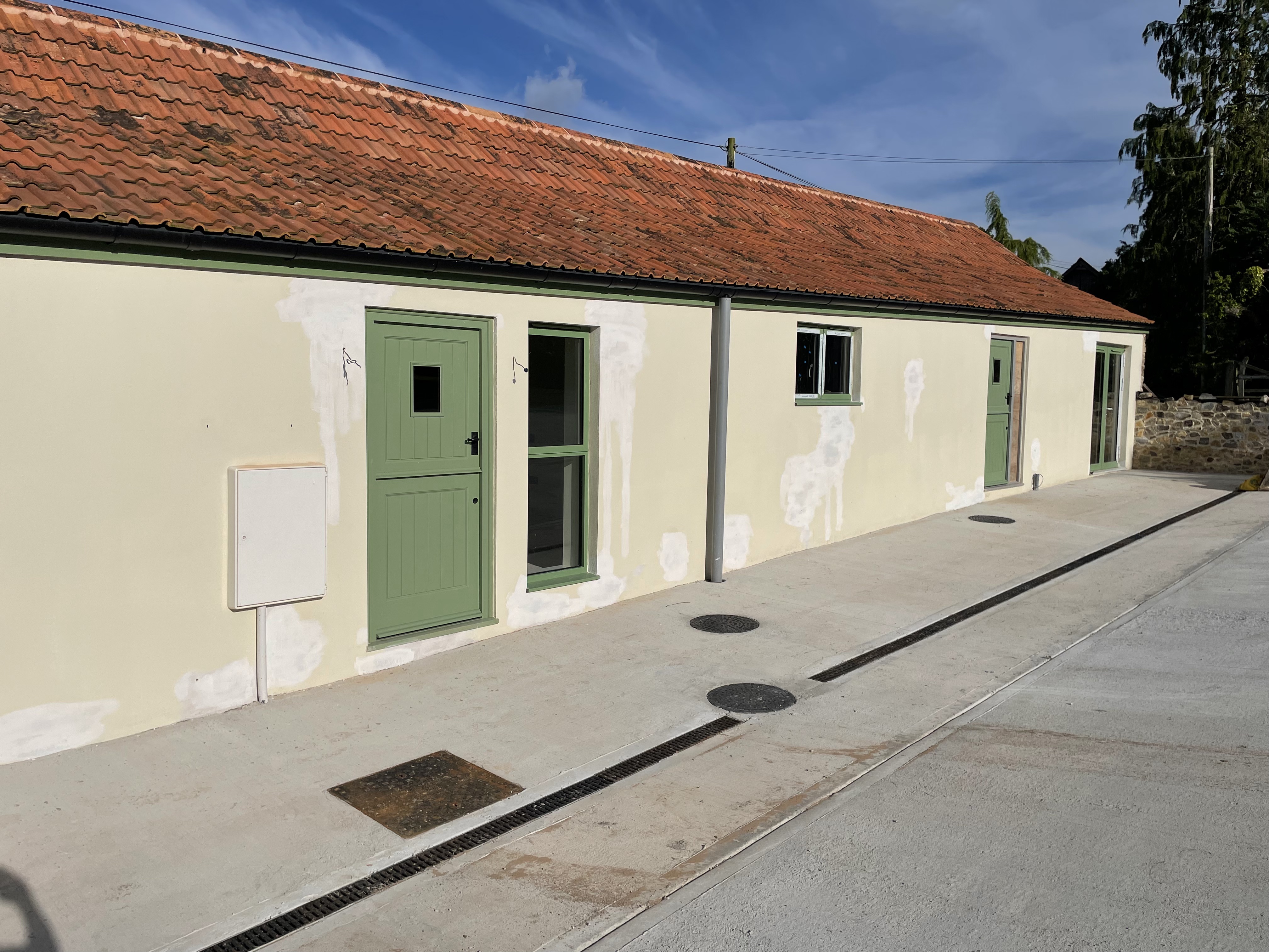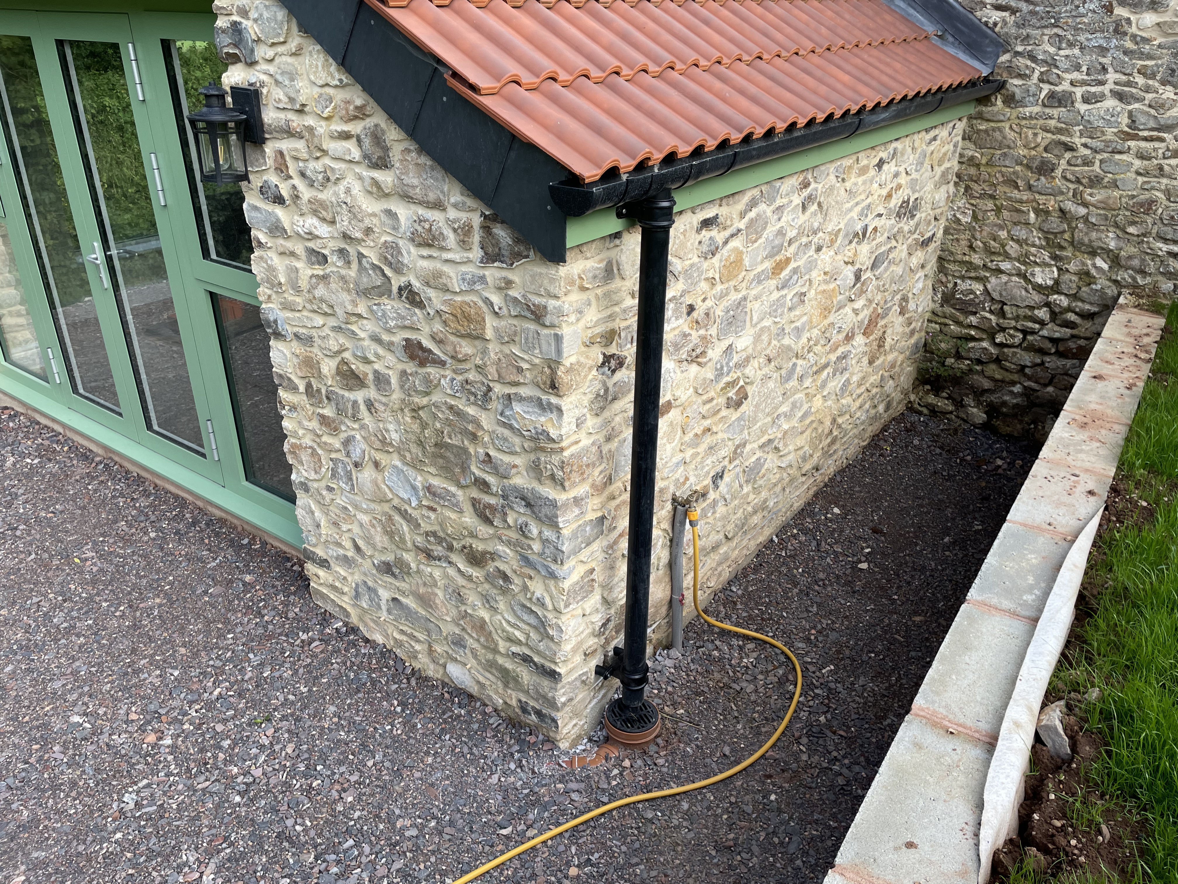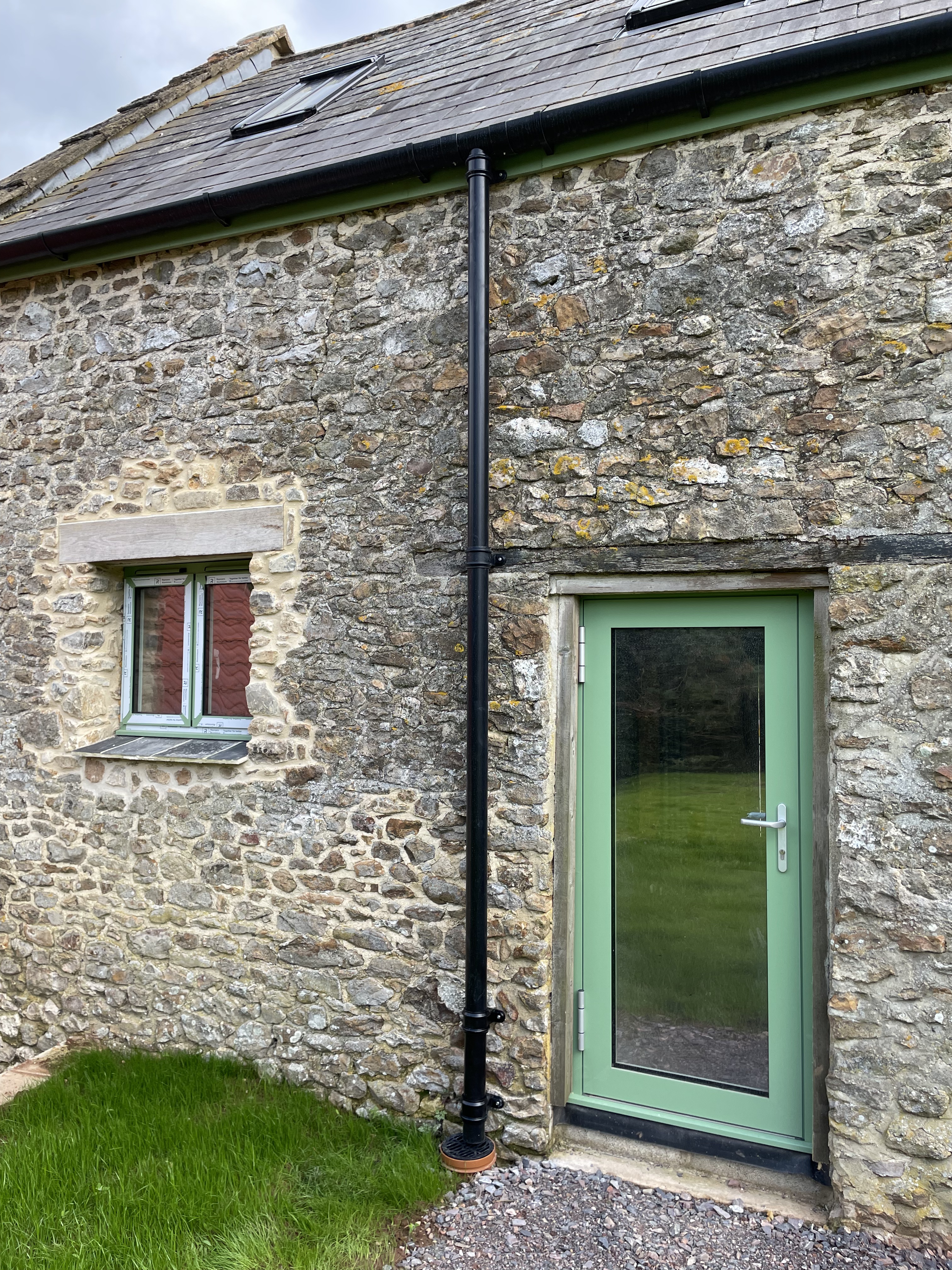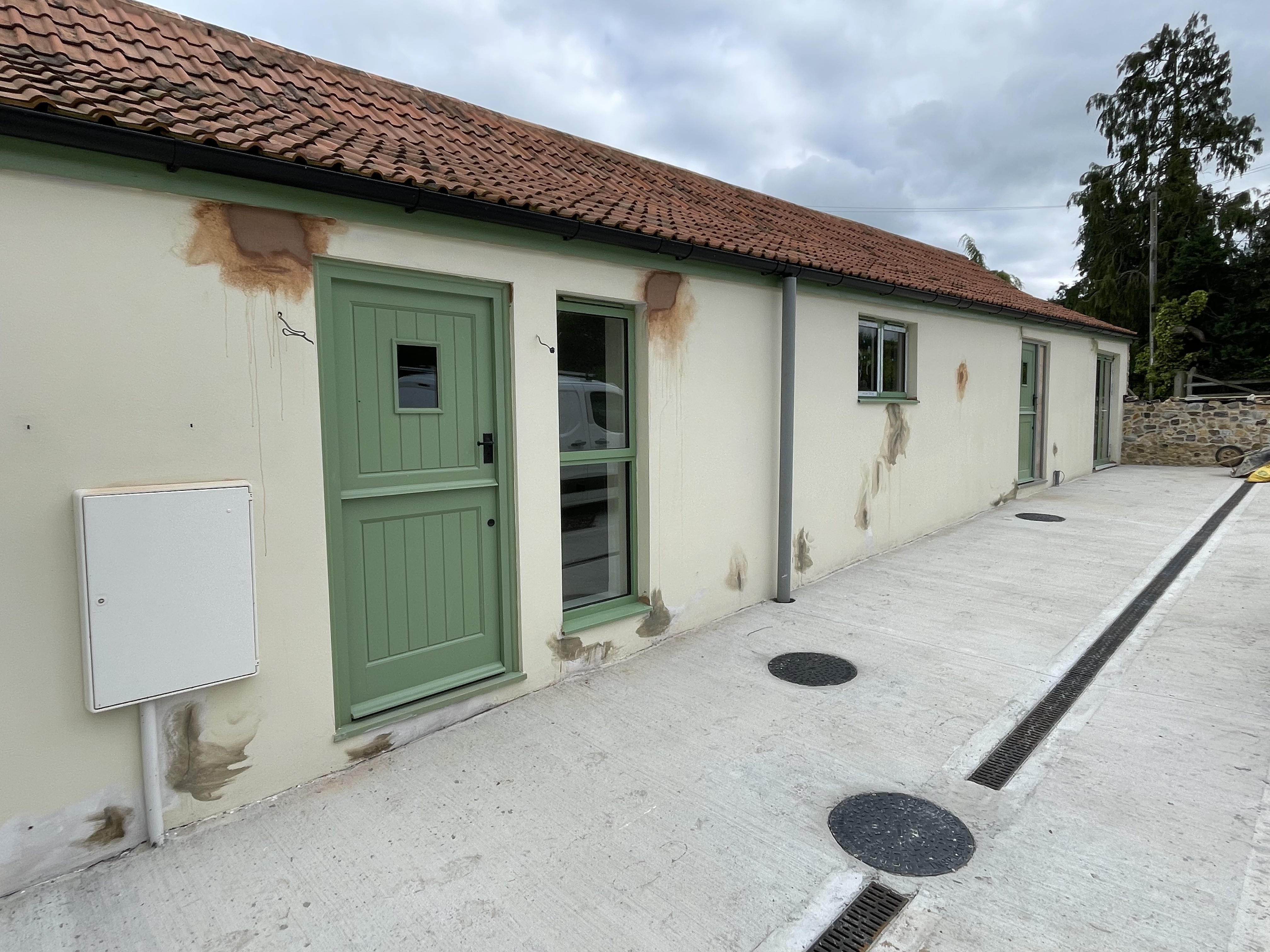 It’s been a relatively quiet week on site. The renderer came on Monday to repair the cracks and the areas that had blown, which John then primed while I was away for the day with work. We didn’t get round to painting it this weekend so will try during the week if the weather is kind – once this is finished then the protective covering on the downpipes can be removed and the water butts installed. The carpenter has been on site doing various jobs – one of them being to start removing the protective casing around the downpipes on the new communal barn, at the back of the three-bed barn and at the back of our new house, which he’s also added a water butt to. We have two more water butts that’ll be going in the front so we can use the water for the various flower pots we’ll have around the front doors.