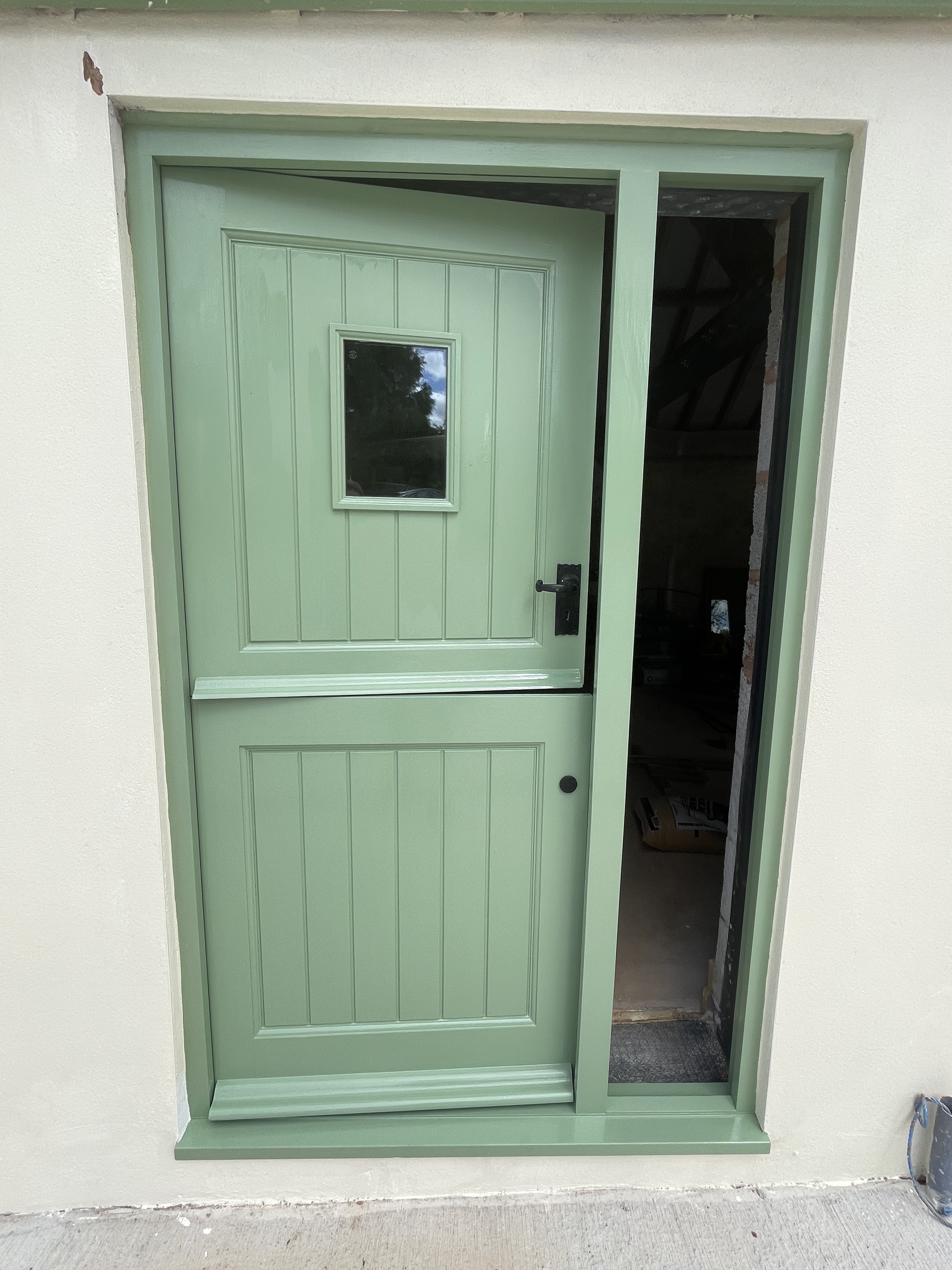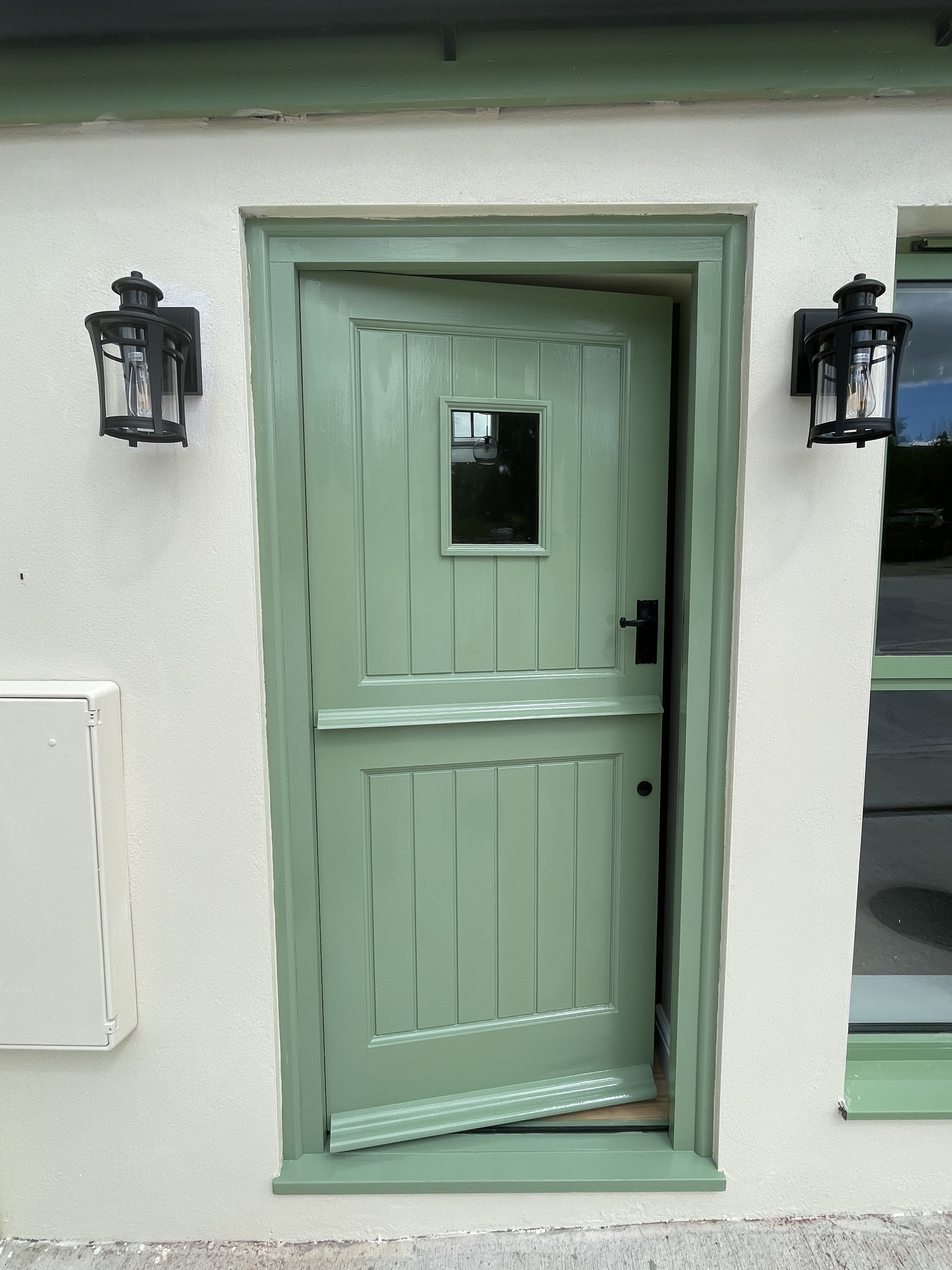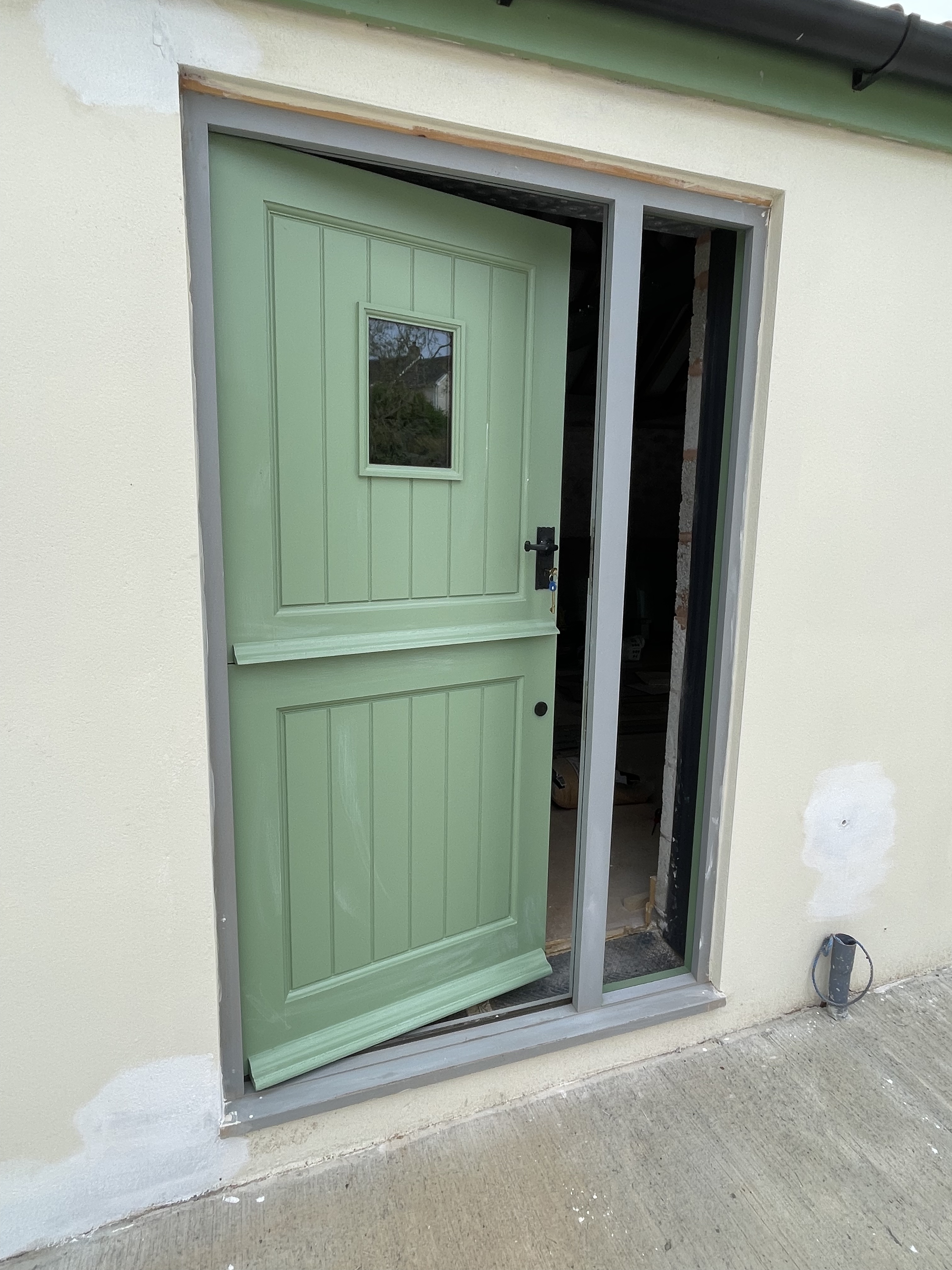 We made the most of the good weather on Sunday – finishing the fascia boards on the three-bed barn and on the outbuilding for the shippon (with all the heating equipment for the one-bed), both of which John had already sanded and primed during the week. He then repainted the fascia board for the new barn, which he’d done over winter but the cold weather caused it all to flake and so needed to be redone. We also painted the first coat of the door frame in the one-bed cottage; and touched up both front doors in the shippon (the one-bed and our new house) which have cracked in places and were covered in concrete splashes and render dust. We still have one more coat to do in the one-bed before the glass window can go in – hopefully it’s dry enough on Monday evening to finish off. And we finished the first coat of paint on the rendered shippon wall, covering up the areas touched up by the renderer a couple of weeks ago.