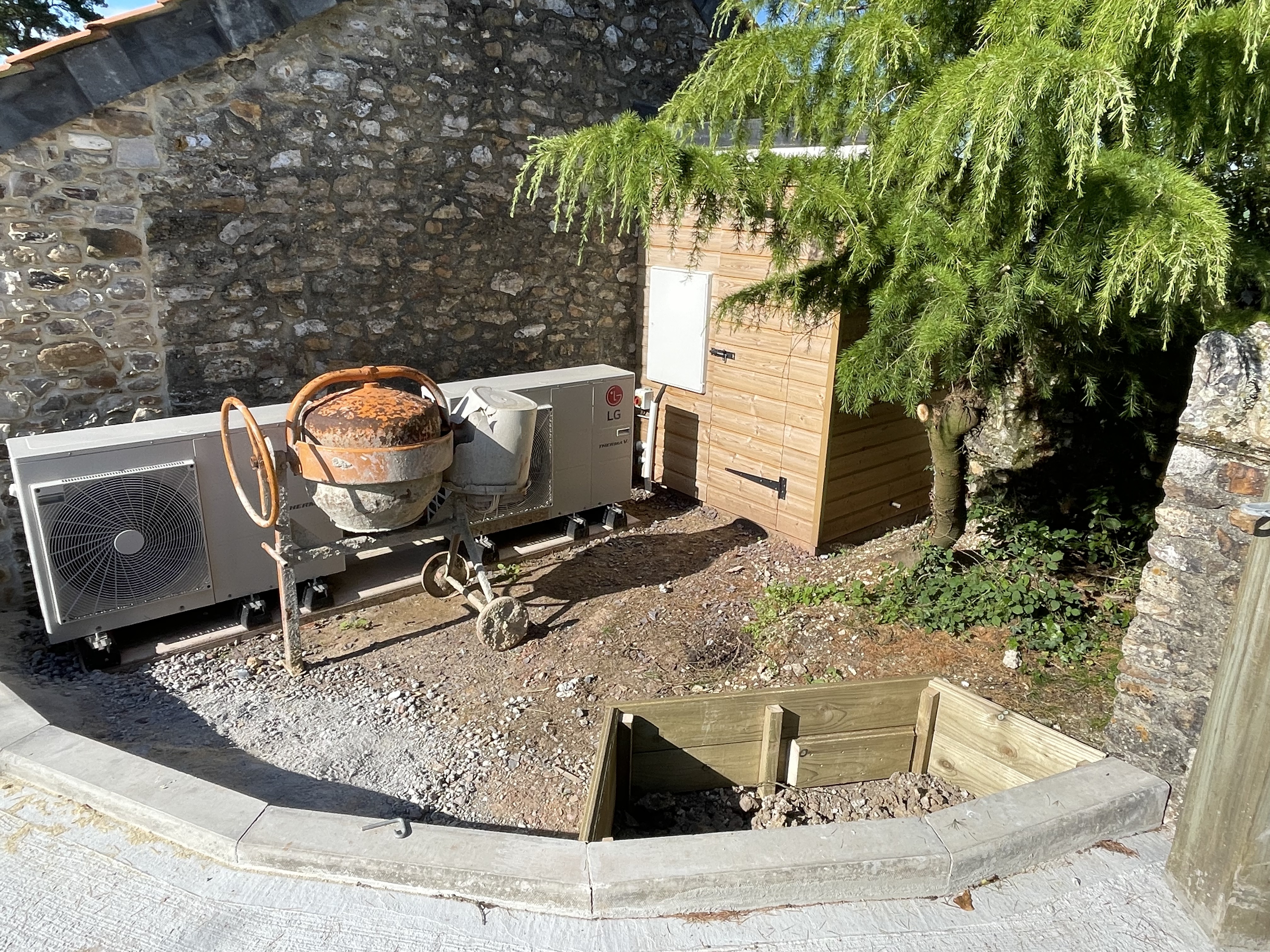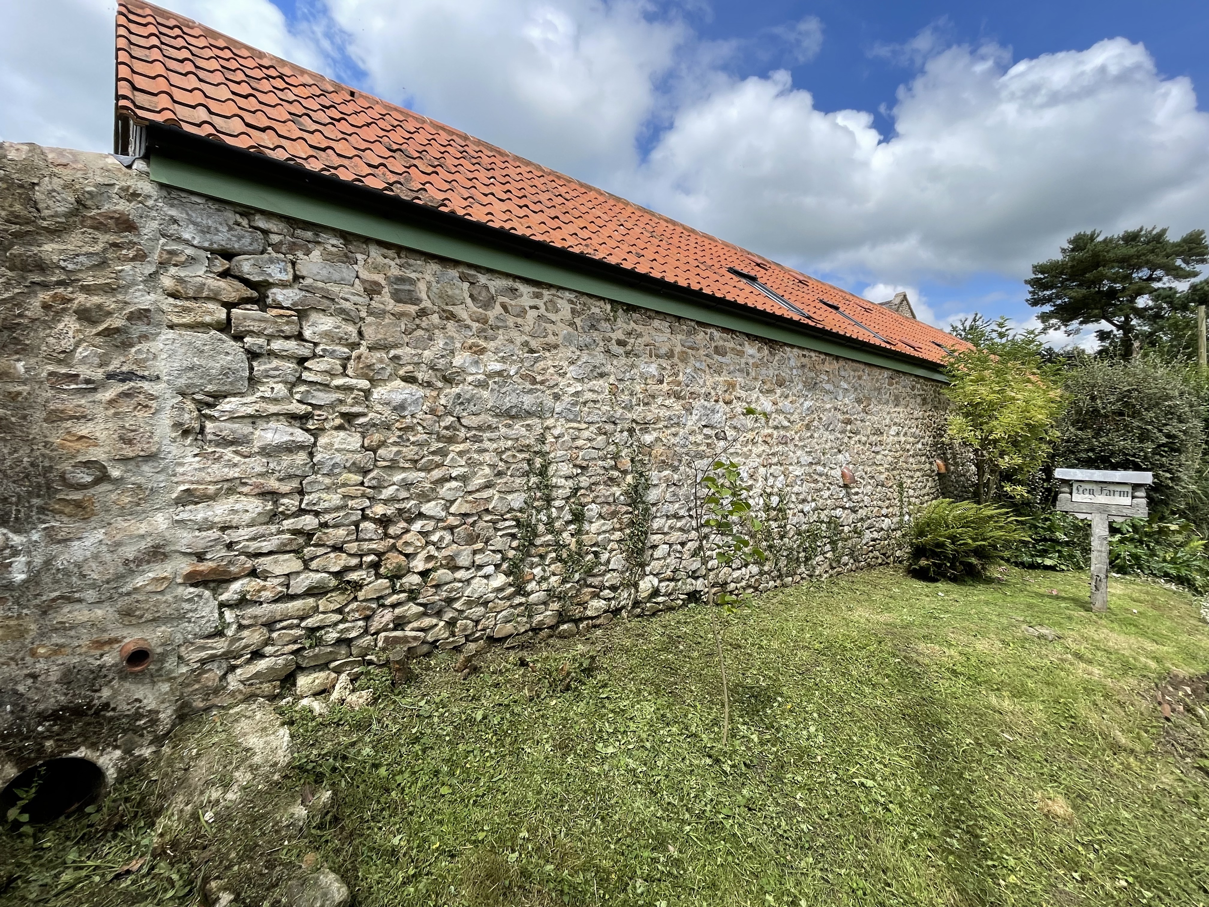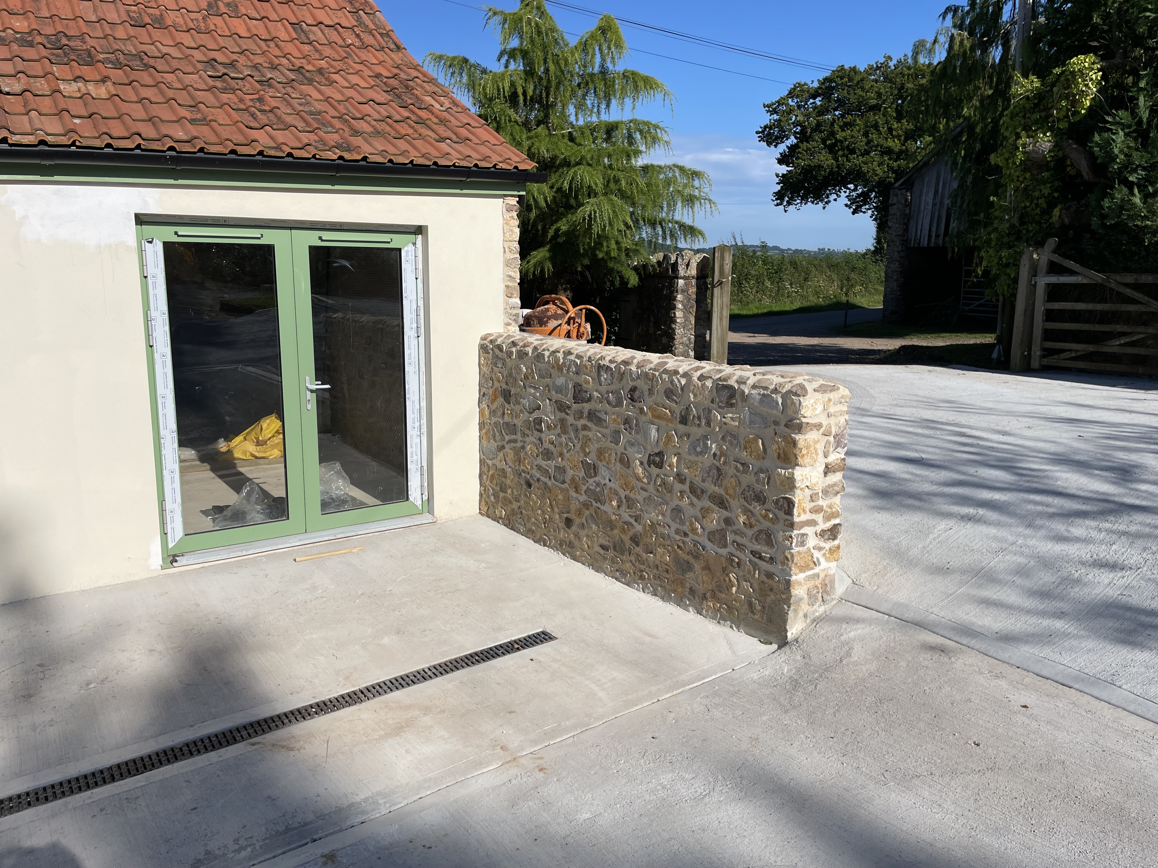 Another of our builders Tim finished the stone wall next to the one-bed cottage – and he’s done a fantastic job. It’s been built because we’ve changed the height of the courtyard and needed to have a clear separation between the higher ground by the gate and the lower ground next to the cottage so that cars didn’t just drive off the edge. It’s also part of the visual separation required by the council for the air source heat pumps, so they can’t be seen from the courtyard. We still need to come up with a way to screen them from the gate, which is more complicated given that the courtyard level is now much higher than the level of the air source heat pumps and the outbuilding (part of the design to divert excess rainwater away from the properties). Our builder has added a wooden bed in the lower part so we can plant a hedge there – we’re planning to find an agricultural-looking trough to go on the higher part to do the same. I’m still slightly disappointed that the council won’t let us put up a planter with a trellis as we have so many jasmine cuttings ready to go that would grow so fast. Instead we’re looking at something in keeping with a farmyard but that will take longer to grow…