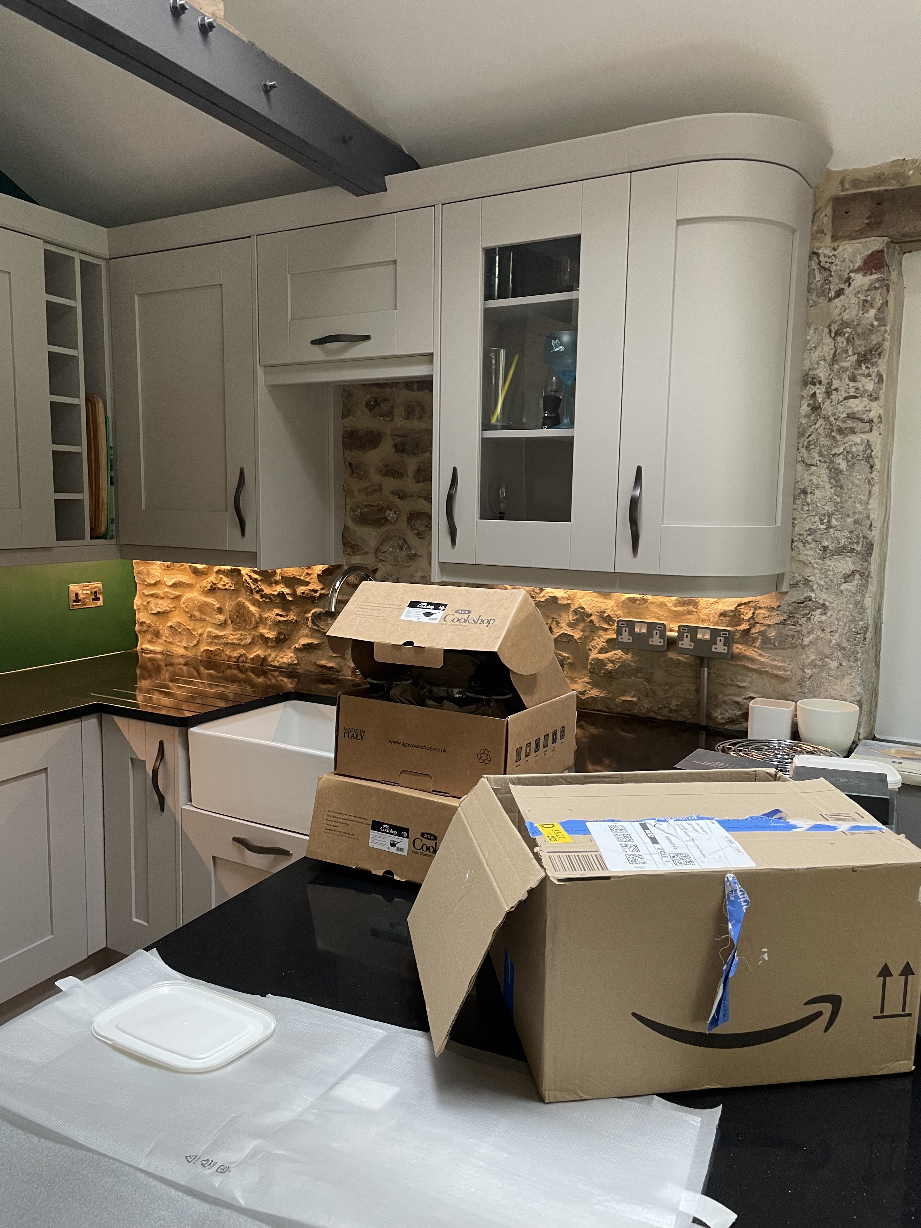 One of the key priorities for us this week has therefore been to start ordering various bits of furniture so we can add more photos to our listing. It’s been hard to prioritise ordering things while we’re still living there and don’t have empty space, but we’ve realised we’re running out of time to get the farmhouse furnished given delivery lead times. We made a start moving [most of] the kitchen and dining room this weekend – now we’re in a weird state where we have some things in one house and others in another – and generally we’ve found that whatever we need is in the wrong building…