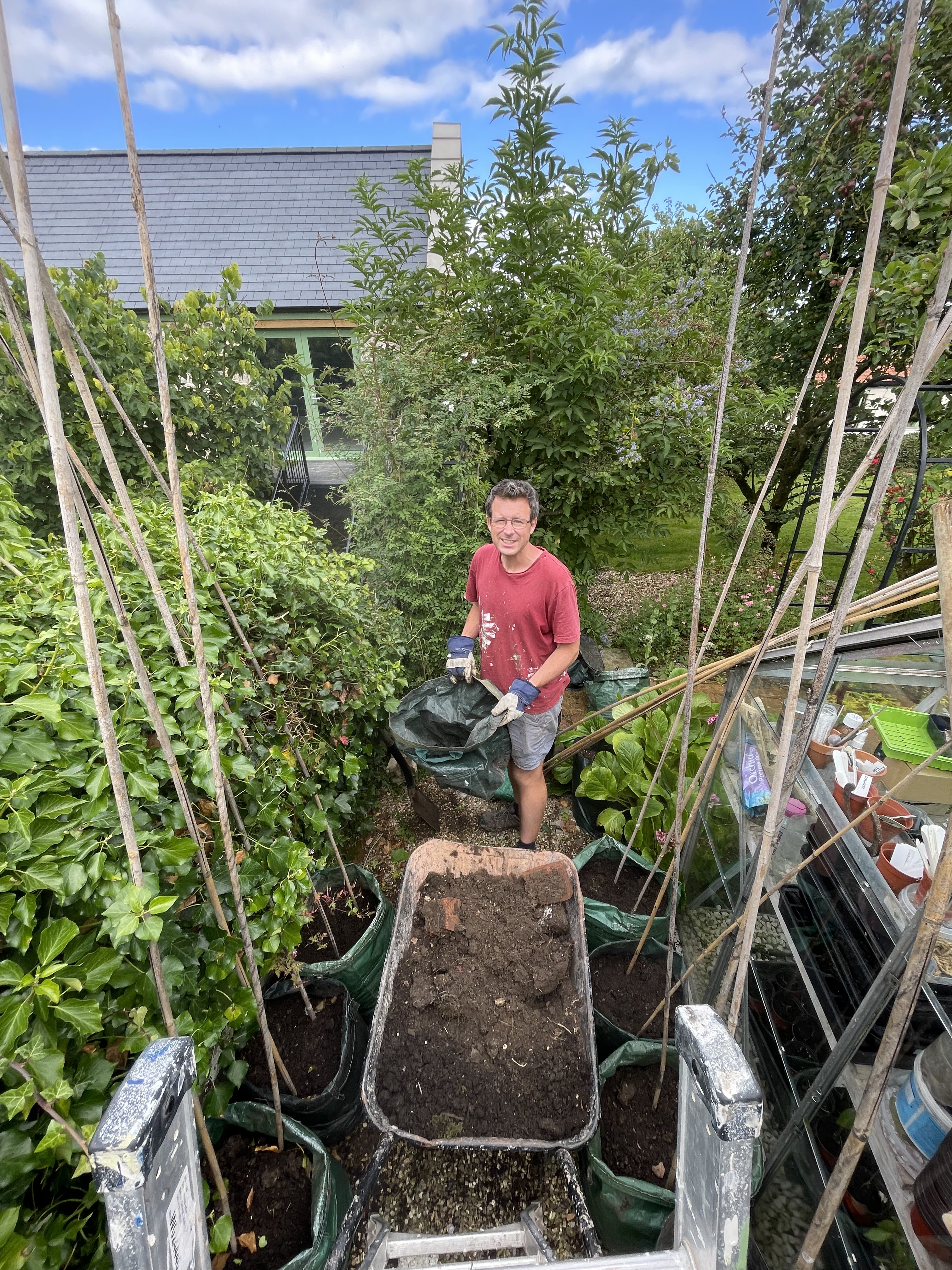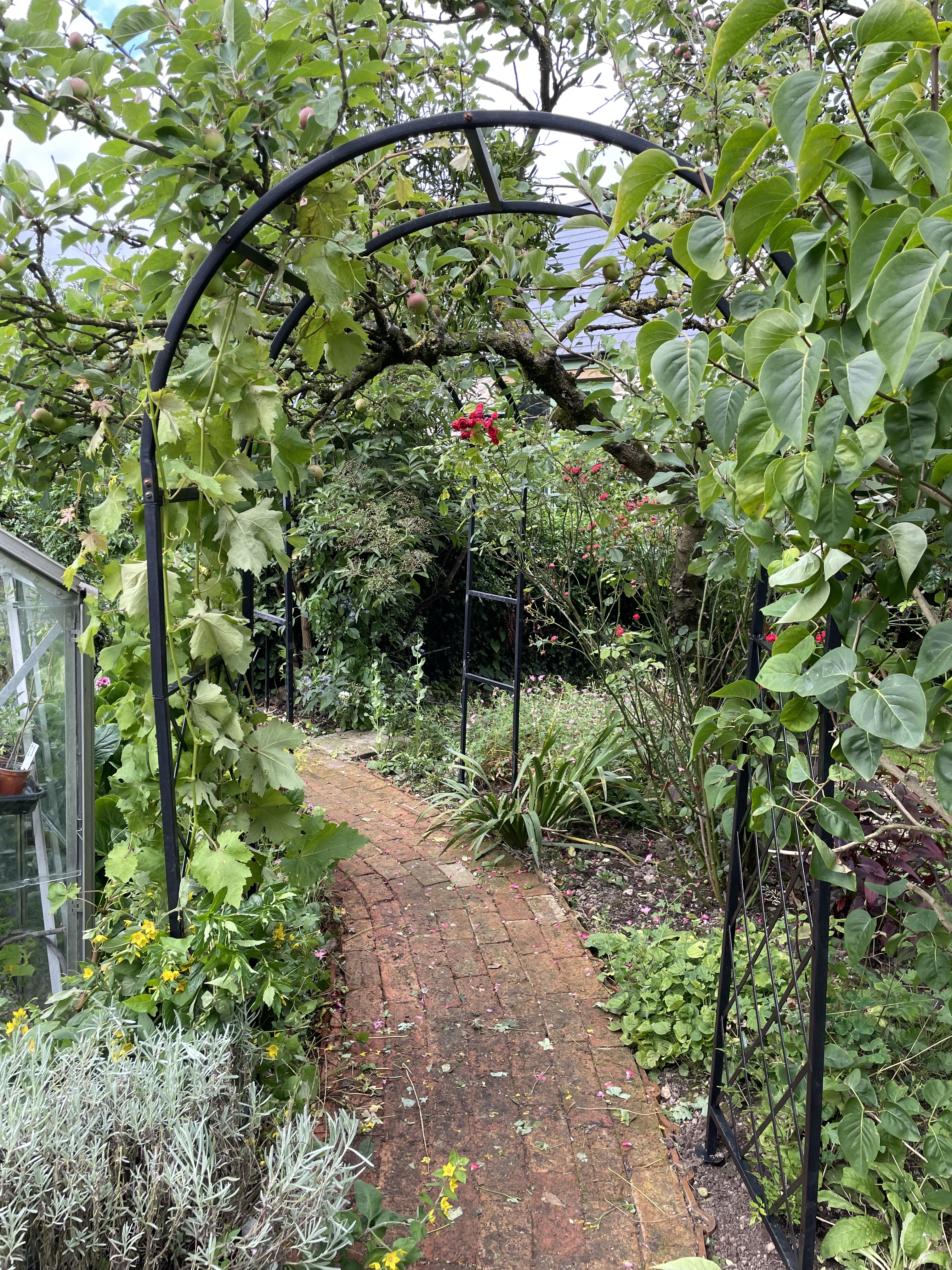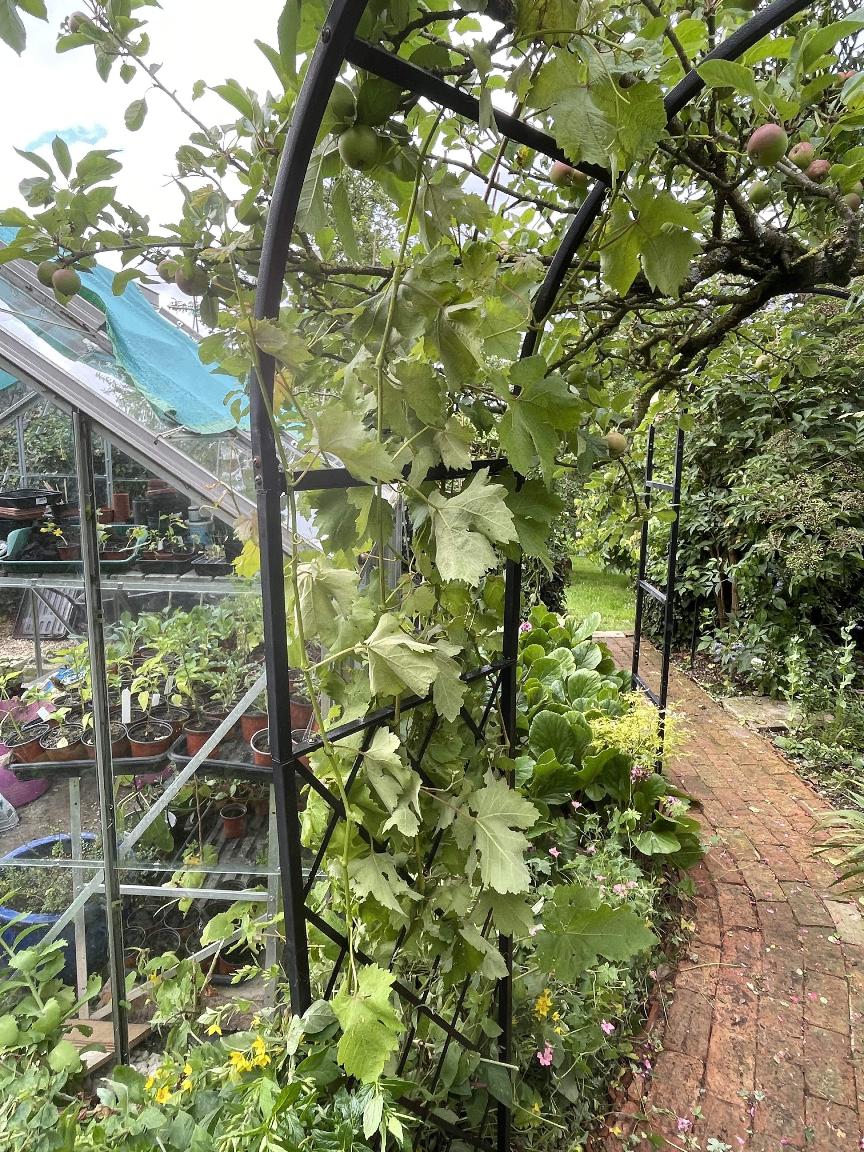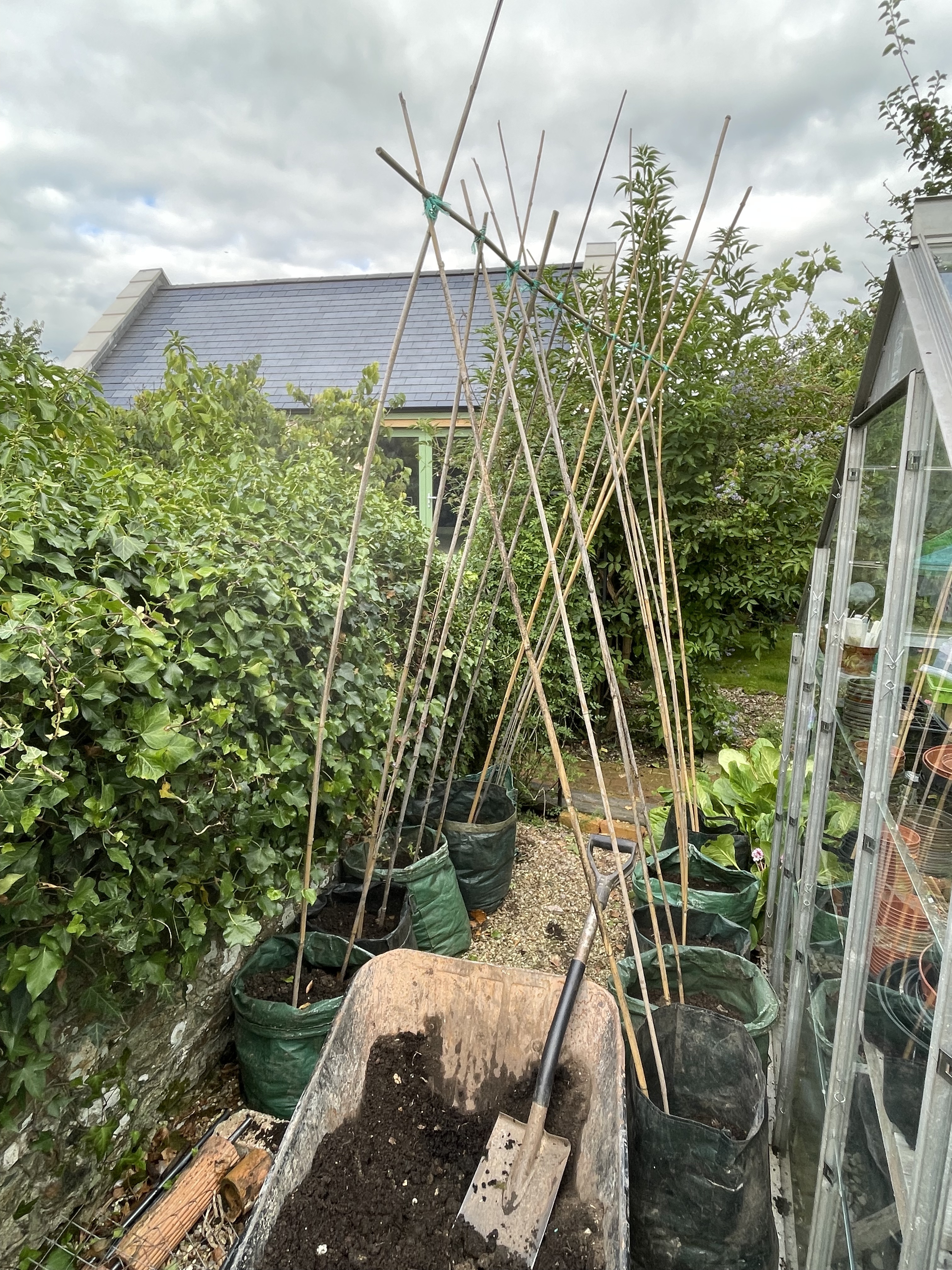 And we managed to squeeze in the installation of both our third arch along our brick path from the farmhouse to the games room; and our runner bean frame just behind the greenhouse. We’ve trailed our vine up the third arch – when we moved in this vine had been fed into the greenhouse and taken over – and gone mouldy. So we cut it back to try and get rid of it, but it’s been so persistent in growing that we thought we’d try to train it instead. We’ve planted jasmine on the other side of the arch just in case. And while we didn’t get time to plant the runner beans (and importantly adequately protect them from slugs and mice and everything else that will eat them), the frame is in place. It should be quick enough to plant them during the week…