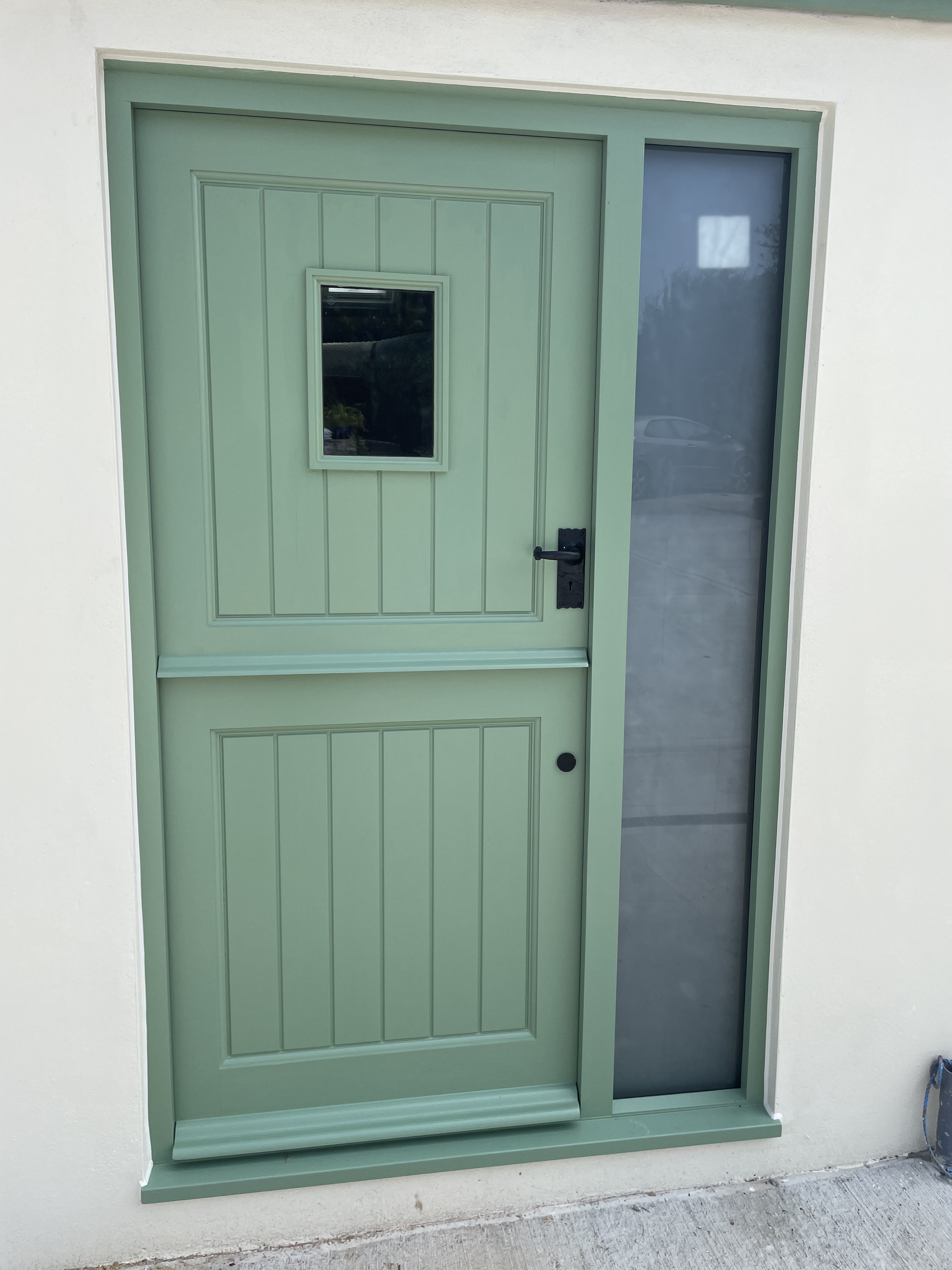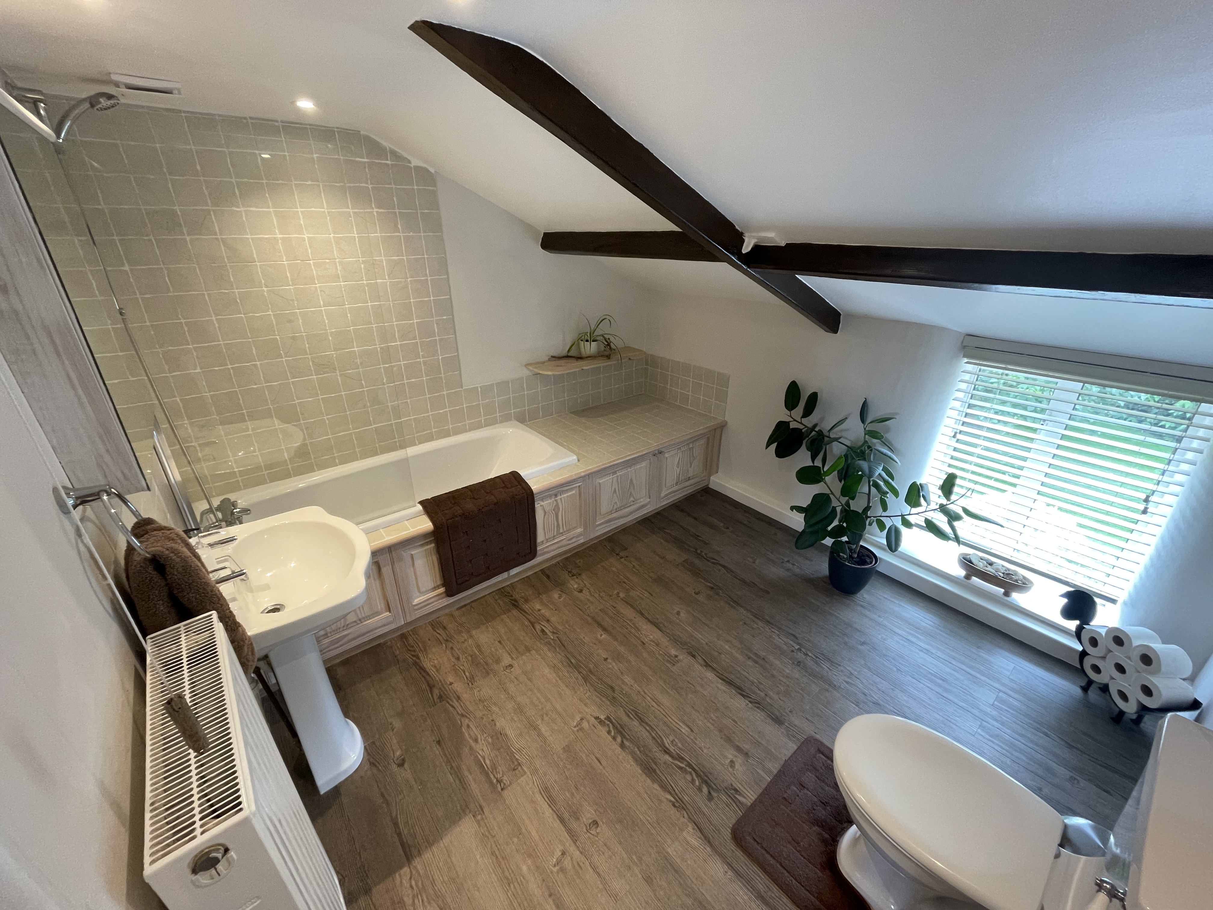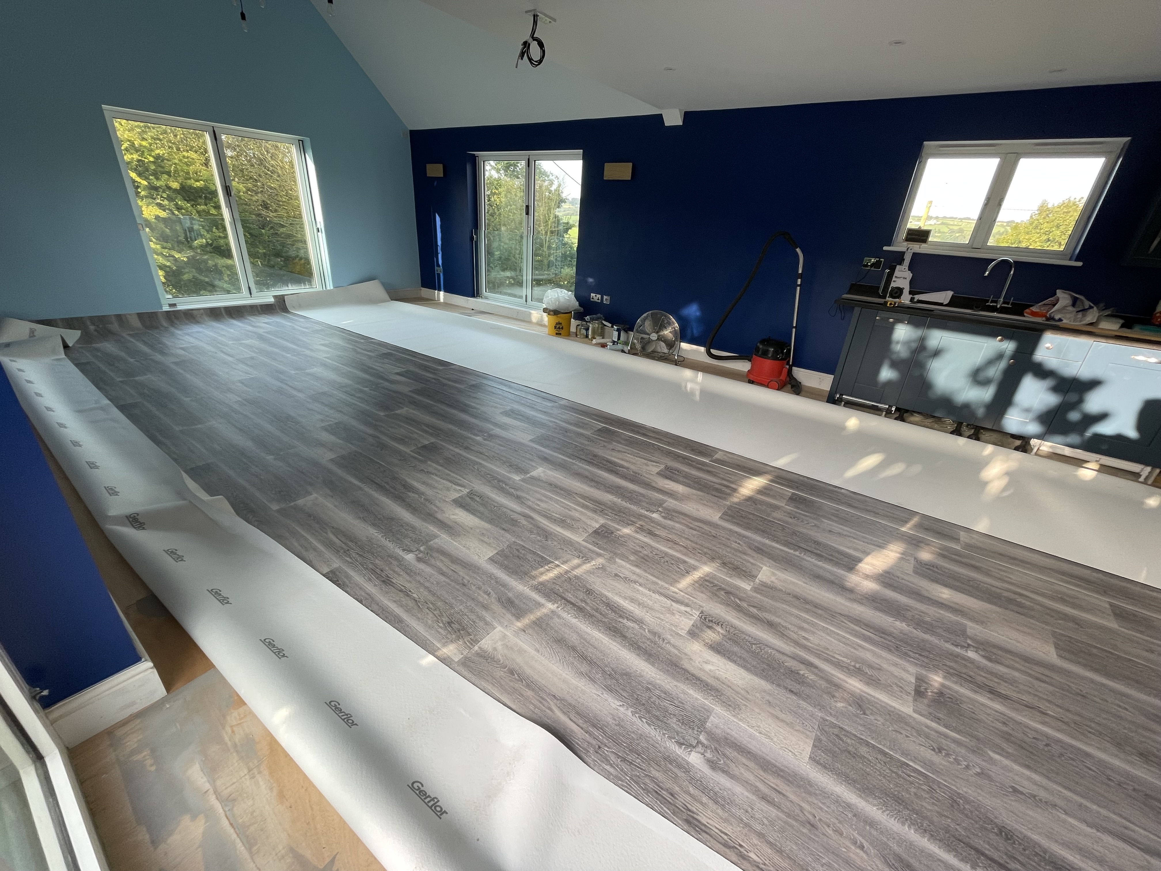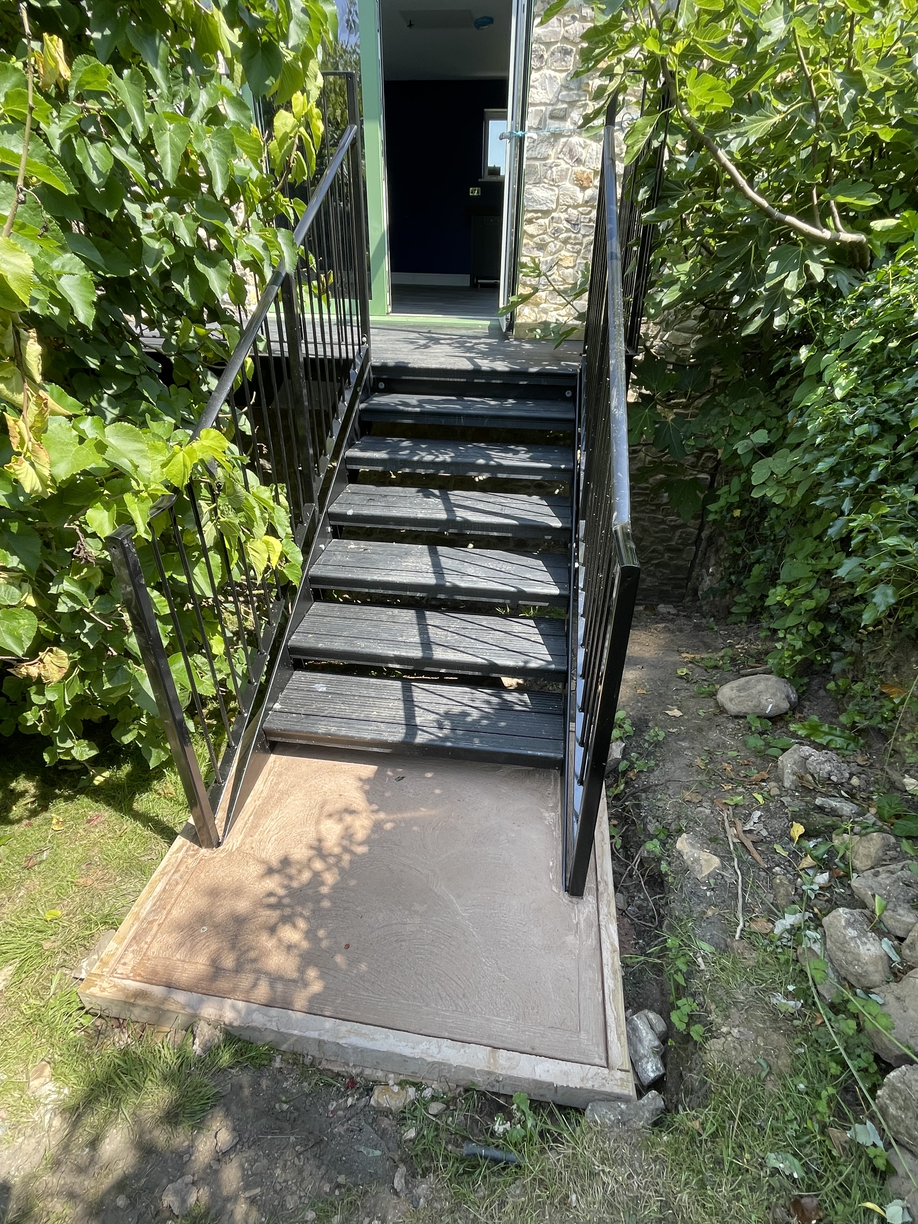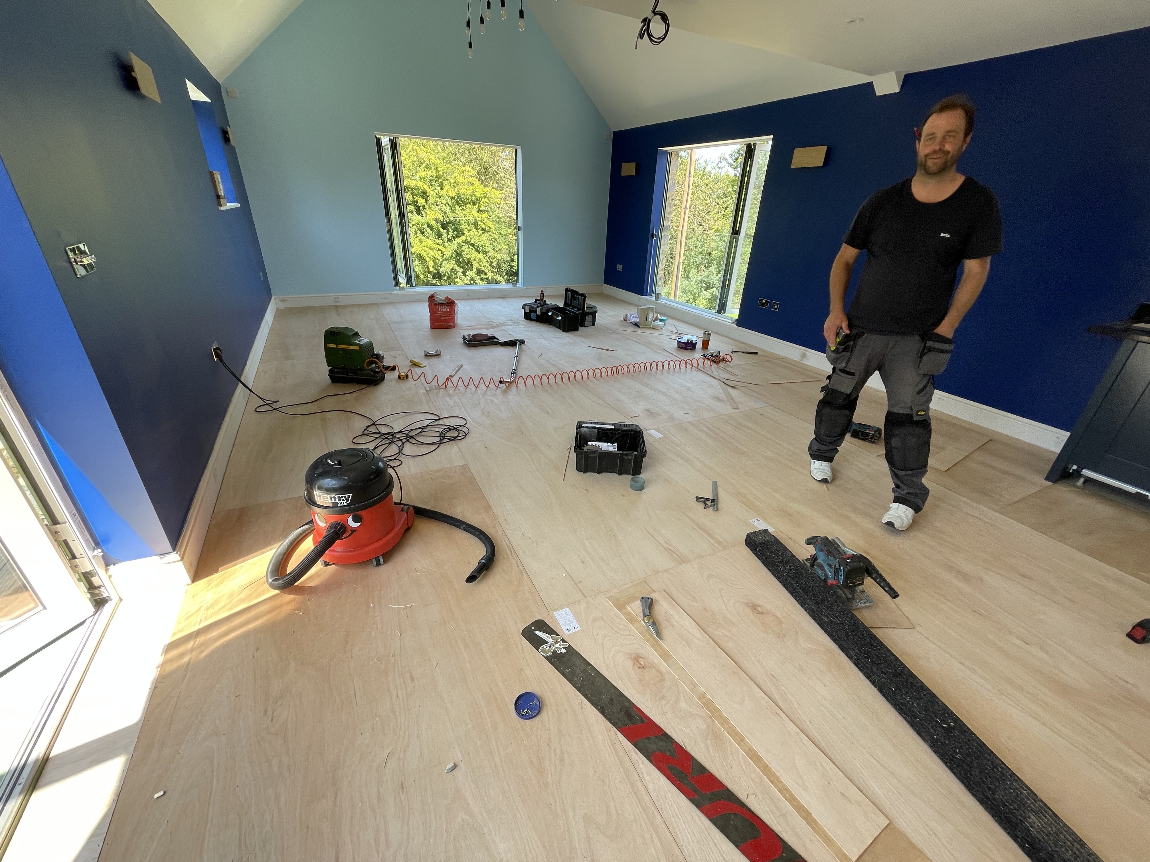 As the building work heads towards completion, we’ve made progress on some of the final items. Our builders installed the final glazing by the door for the one-bed this week after Kate finished painting the door frame last weekend. And the external windows along the shippon have been beautifully edged with mastic so they’re waterproofed. In the Games Room the flooring has been installed so we can now finish painting the shirting boards and start the process of furnishing it. And our builders have laid the last bit of concrete at the foot of the shorter section of stairs.