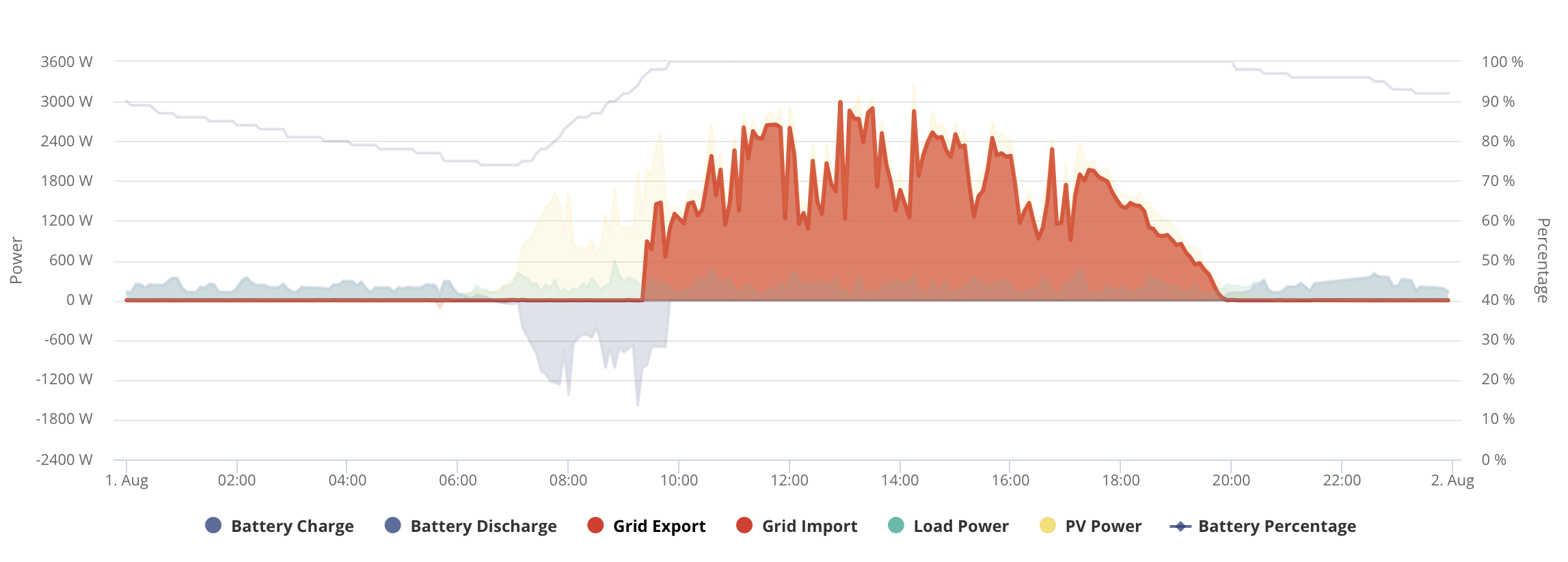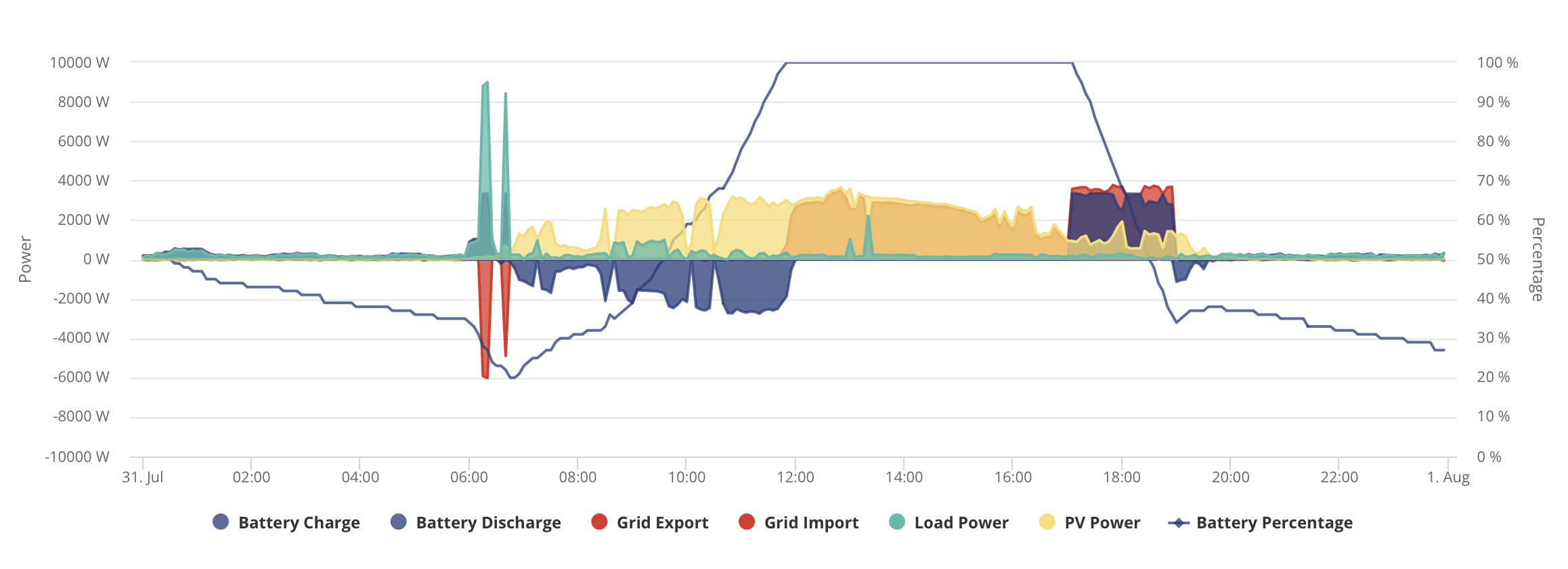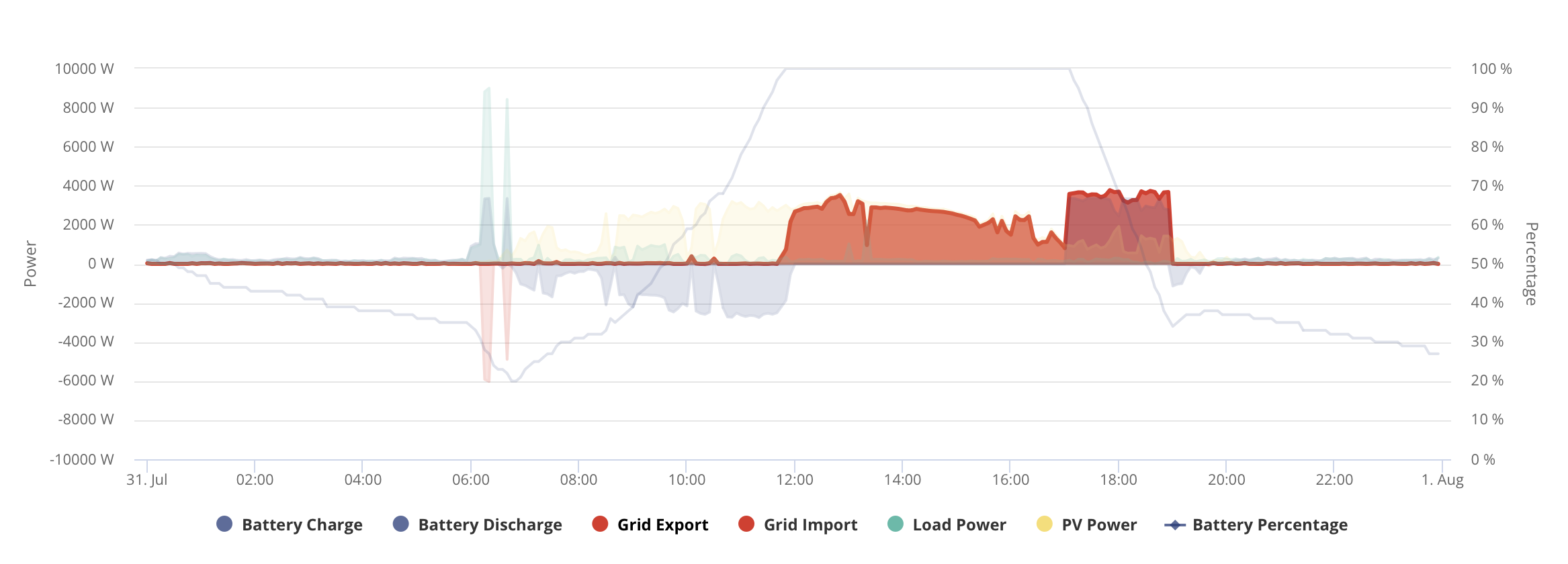 Meanwhile, the Farmhouse now has both east and west arrays hooked up after the second solar inverter was finally installed last week. With both arrays live it doesn’t take long before the batteries get fully charged and we start exporting. Thankfully we get paid for this energy, and the best export prices are in the early evening, so I’ve been force-discharging the batteries between 5 and 7pm each day. In case you’re wondering what the large early morning spikes in consumption are, that’s our ensuite electric shower which pulls an astonishing 8.5 kW. Our battery inverter can push out around 3 kW so this is the only time we currently need to pull from the grid. Otherwise, it’s all home harvested electricity at the moment!