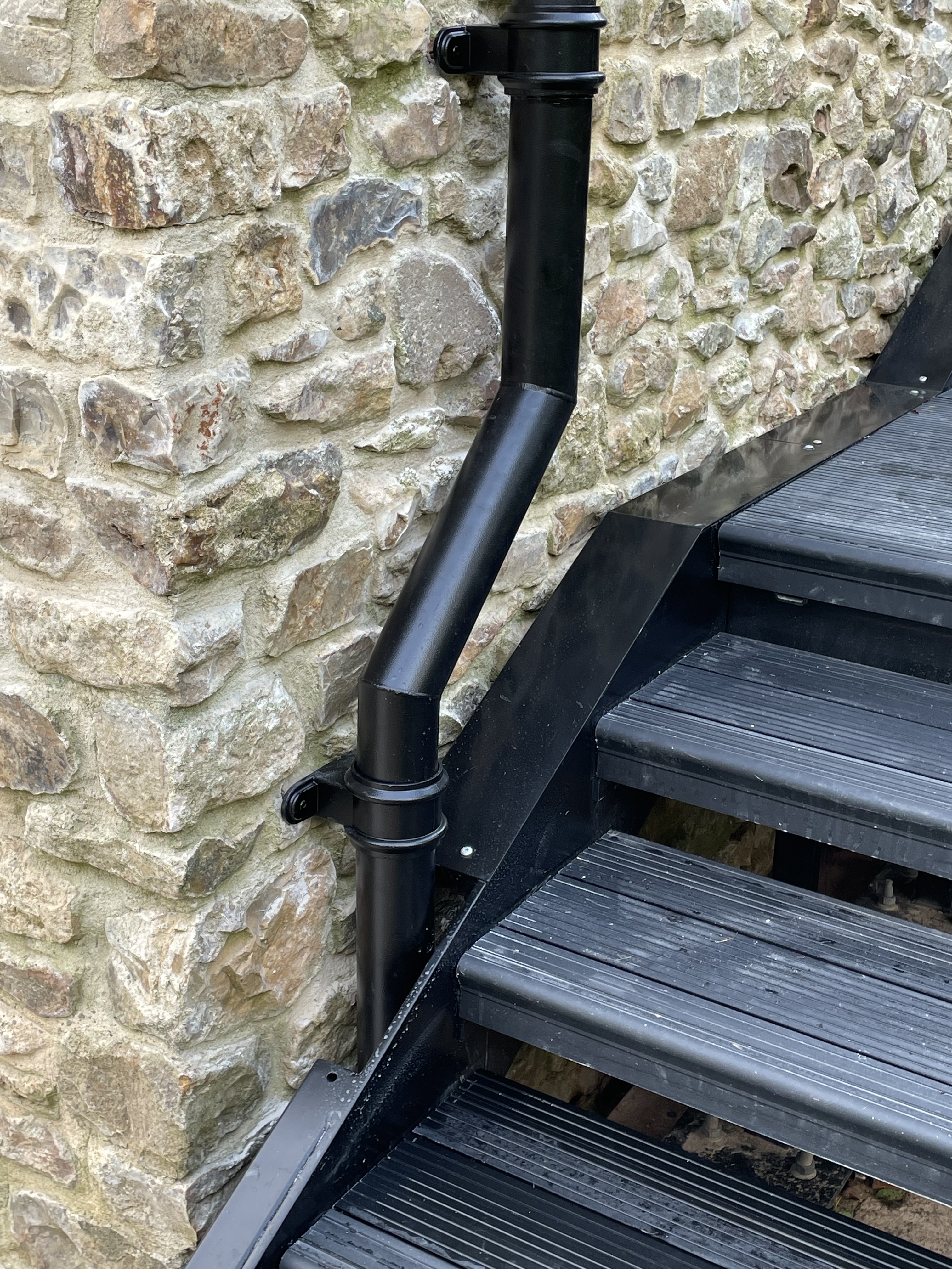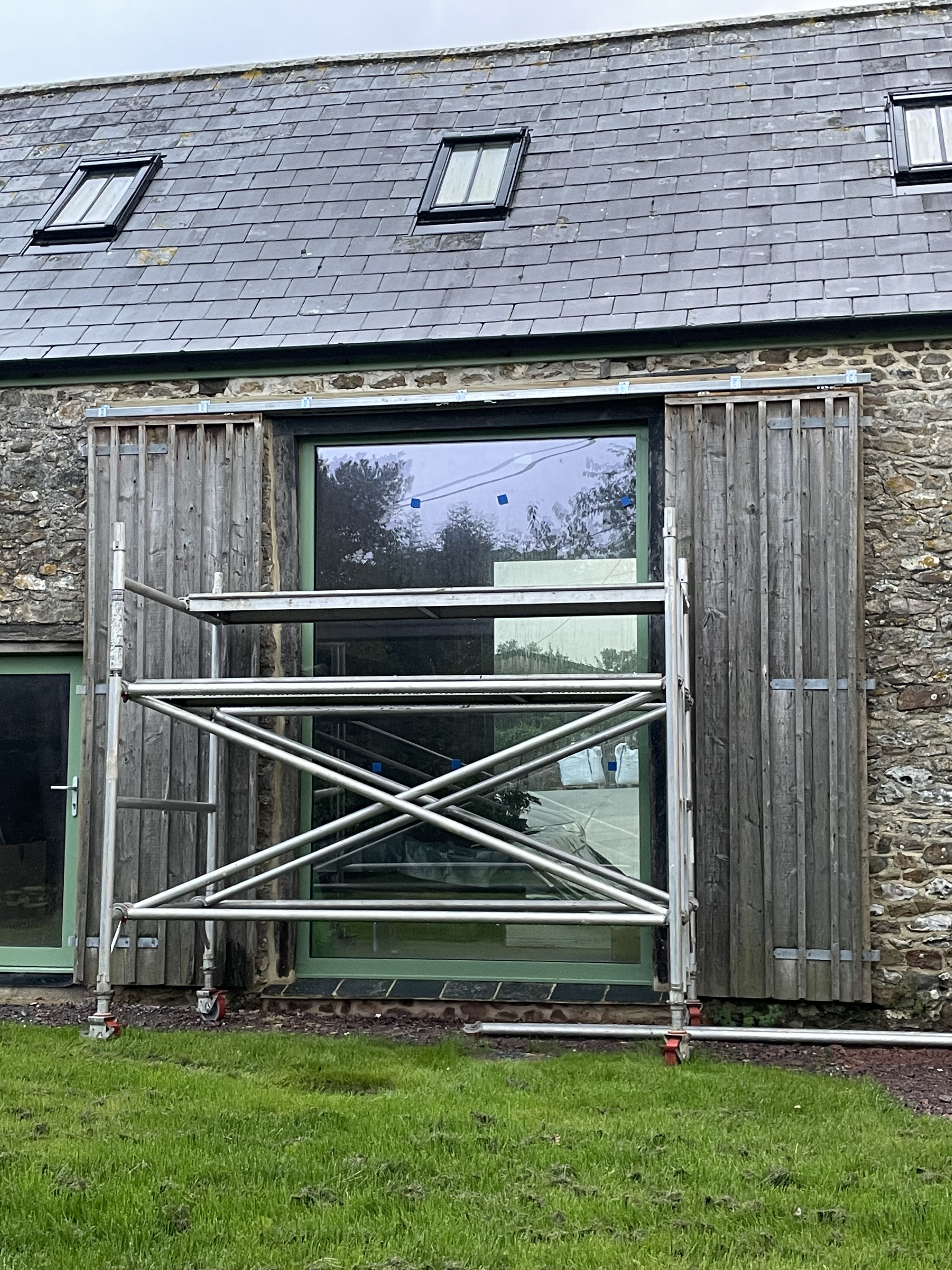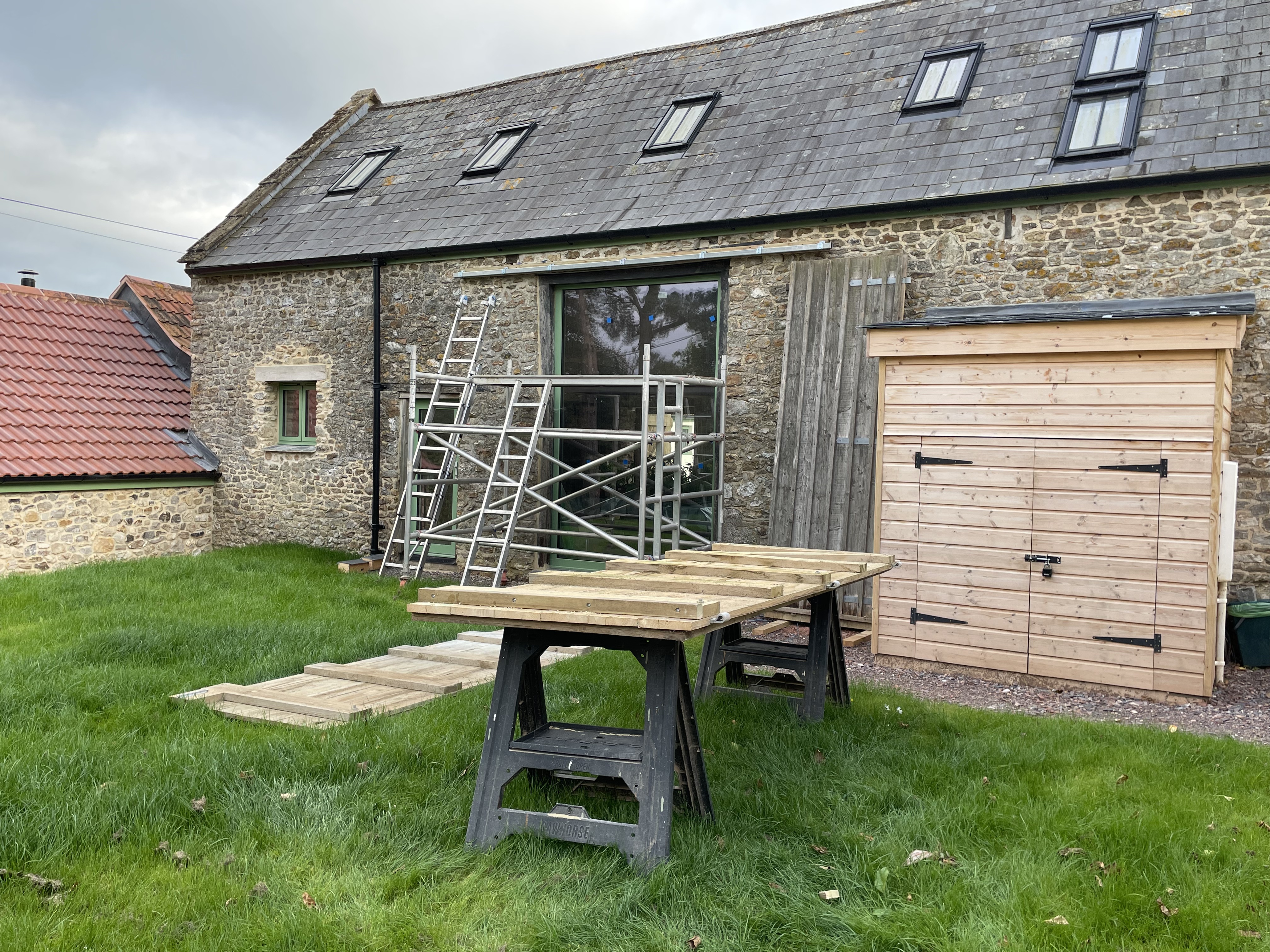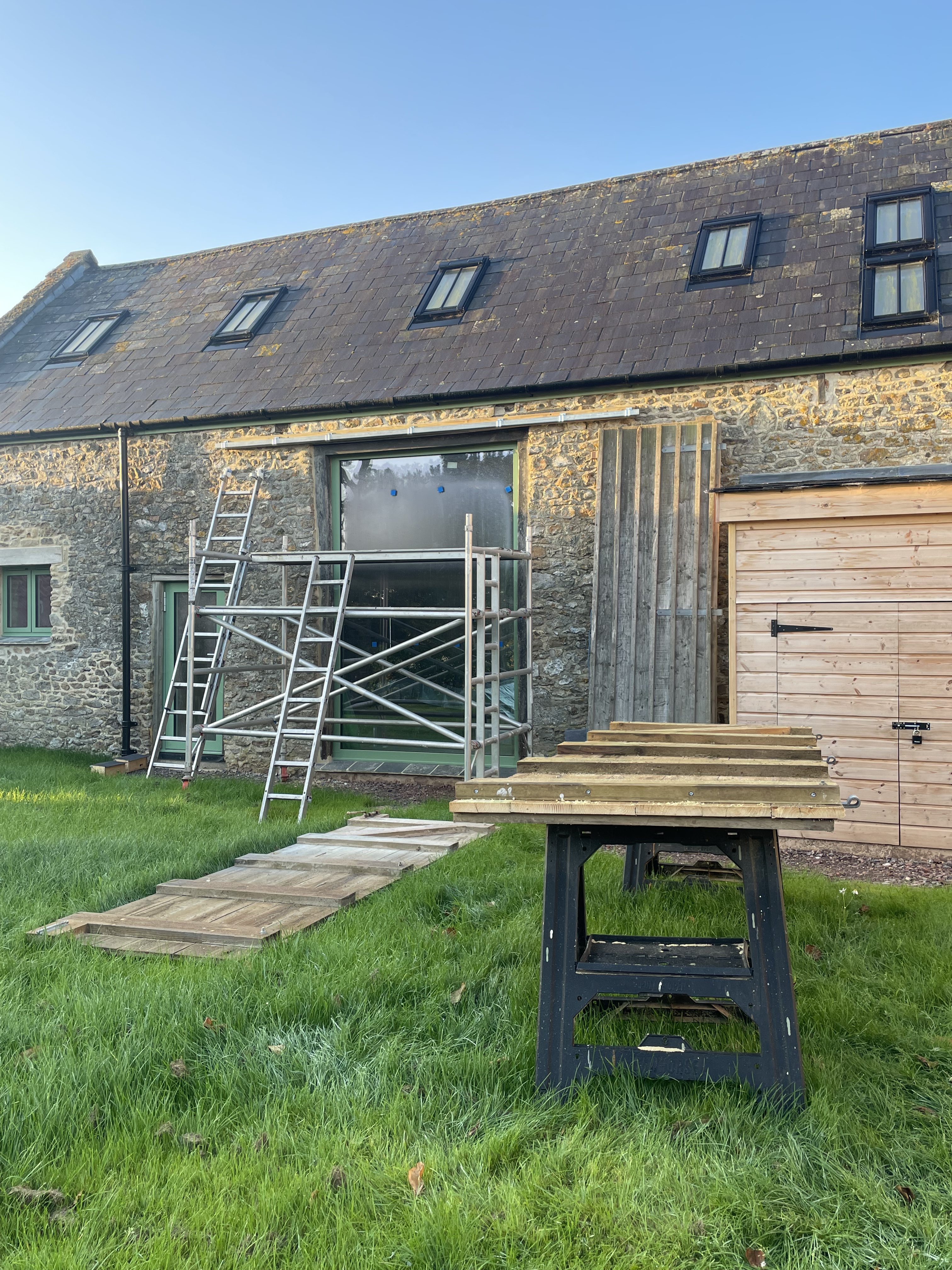 Our builders were back on Wednesday and Thursday to install shutters on the Old Barn (three bed) – these are the old doors that were taken off when we installed the large windows in their place. Part of our planning permission required us to install the doors as shutters to retain the feel of a barn – they’ll also be useful to protect the windows and reduce the amount of cleaning required!! The original plan was to put them on runners at the top and bottom so they slid across, but because we have lovely slate sills at the bottom the runners don’t work, so we’ll need to come up with a different plan. They also installed the remaining part of the downpipe on our New Barn (a mistake in the way the stairs were built meant the gap for the downpipe wasn’t centred and so either the downpipe needed to be moved a little to the left, or a whole section of the stairs needed to be rebuilt; we chose the former. There’s a bit more to be done, but at least most of the equipment was tidied away by Friday, and both the skip and portaloo that have adorned our courtyard since February 2023 has finally gone!