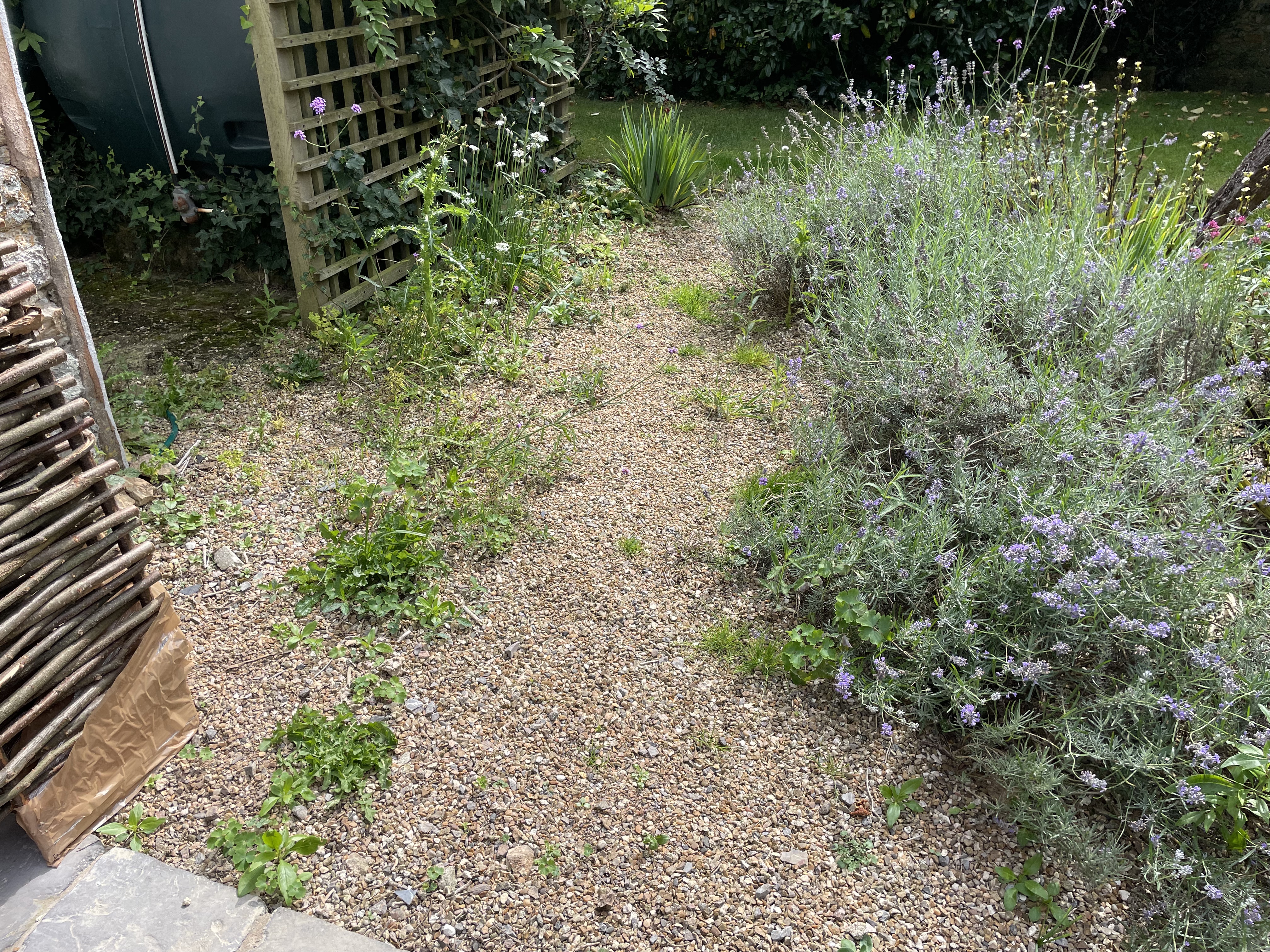 - Weeding the back garden and cutting back the lavender and roses; then staking the roses with metal stakes this time so they don’t snap;