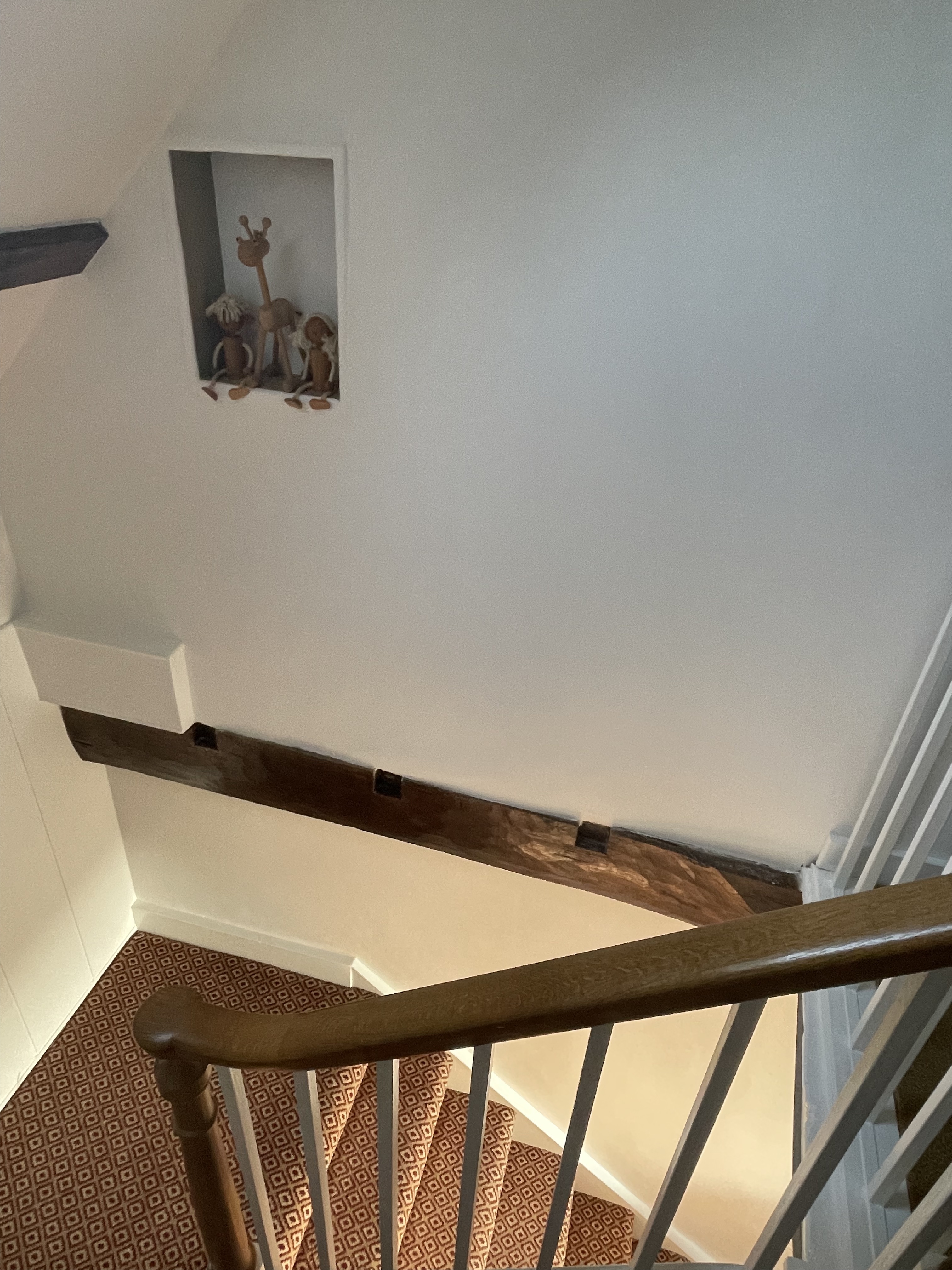 - Adding a mirror and floating hooks into the top floor yellow bedroom for hanging clothes, as there’s no space for a wardrobe because of the pitched ceilings;