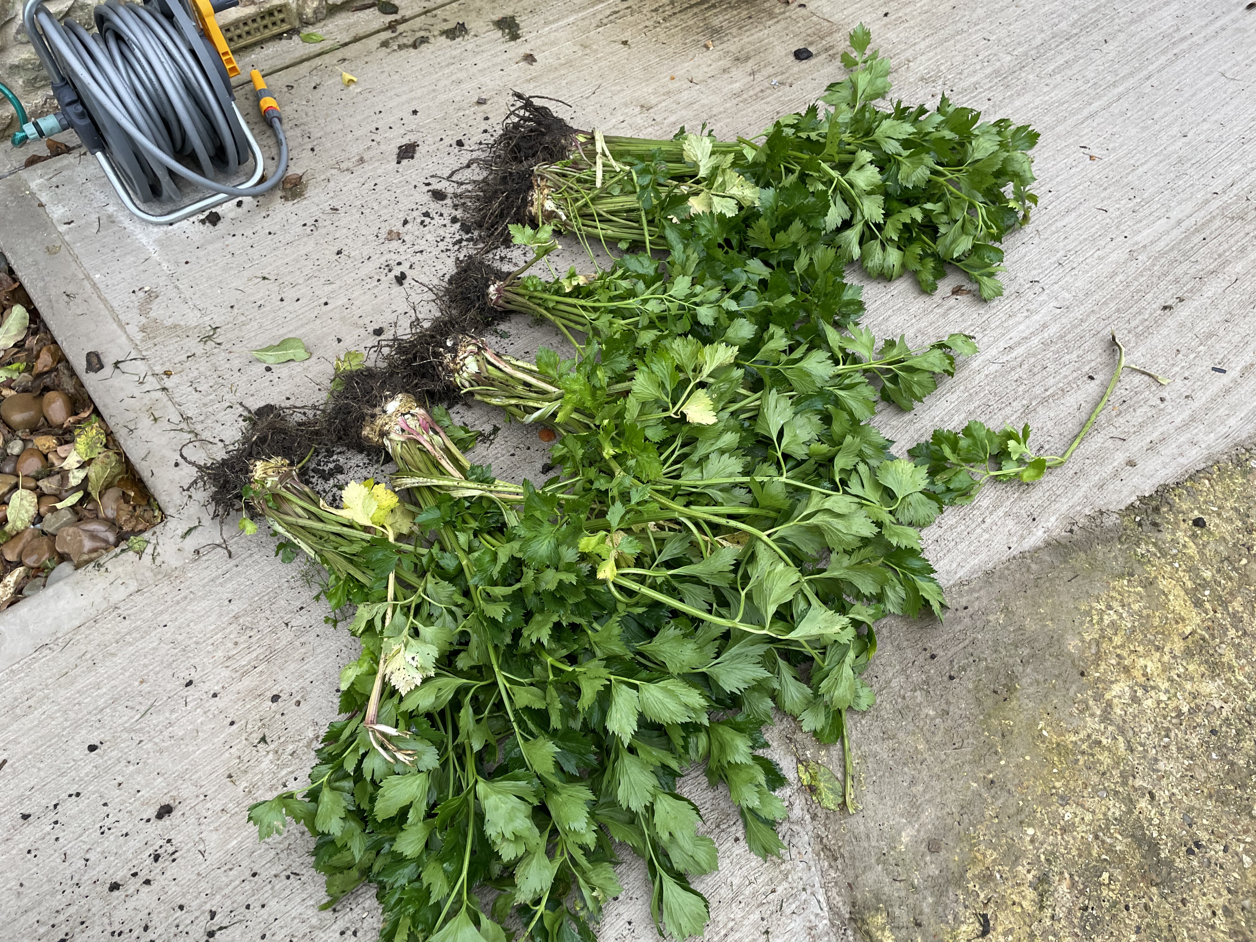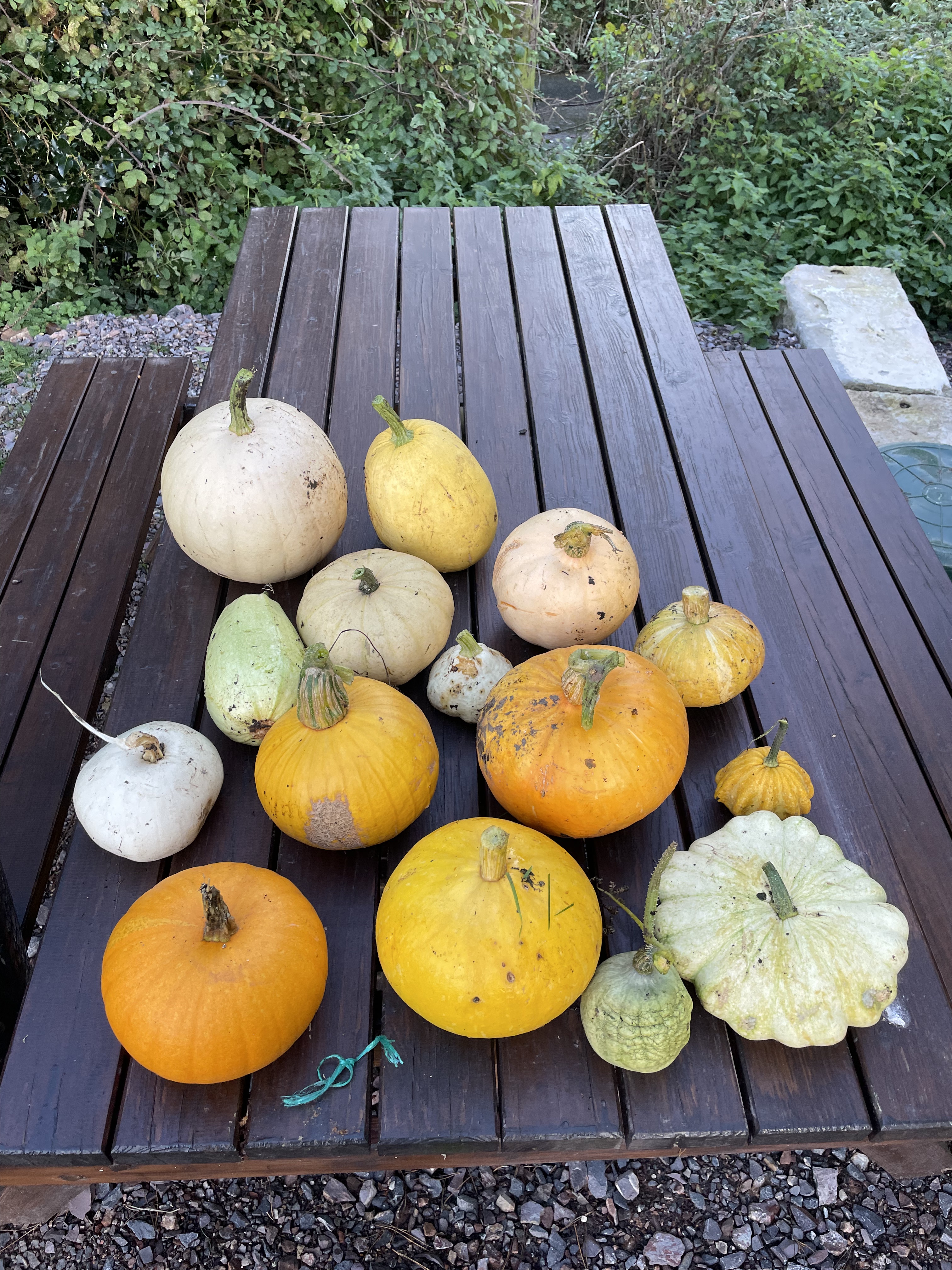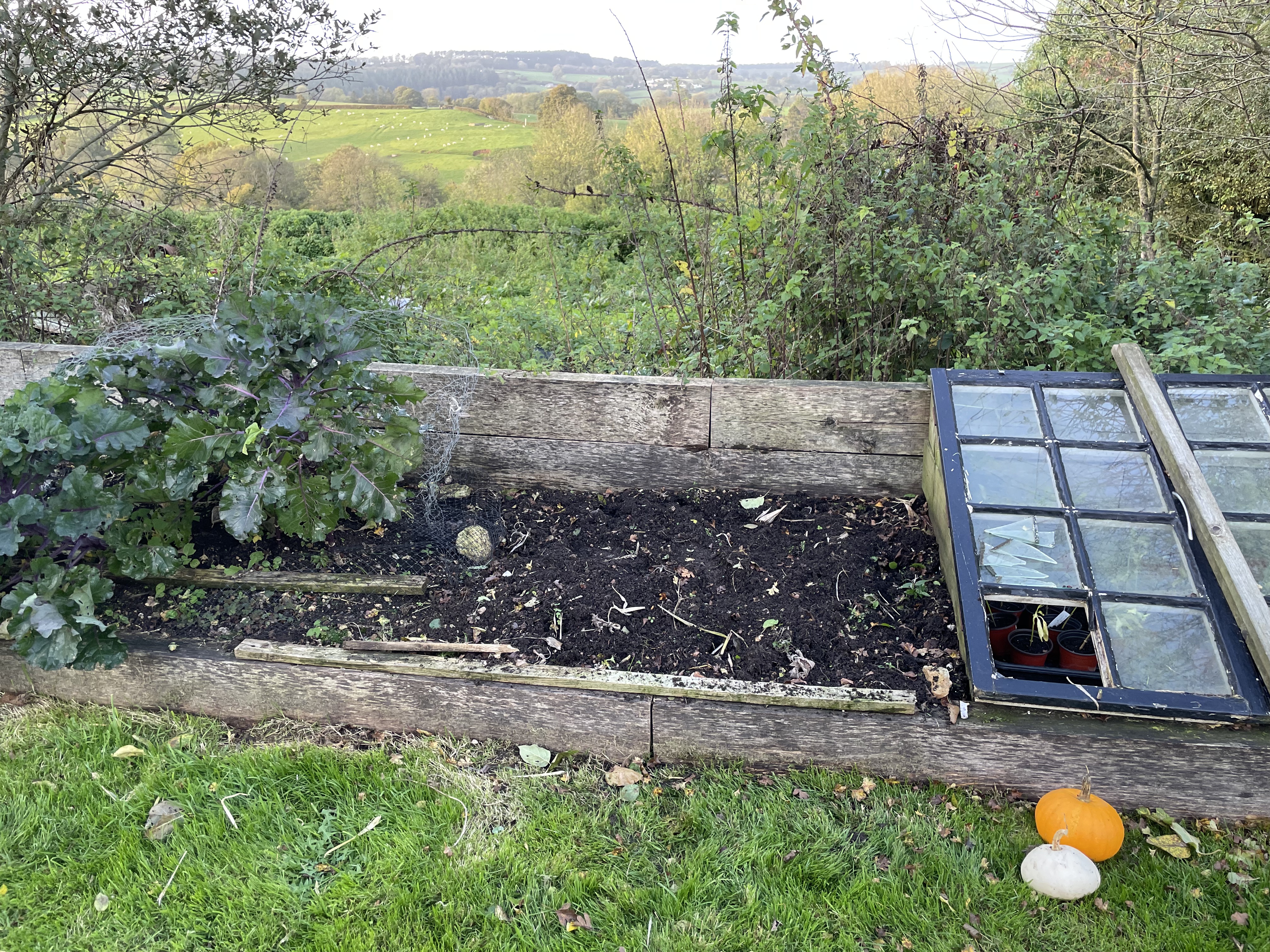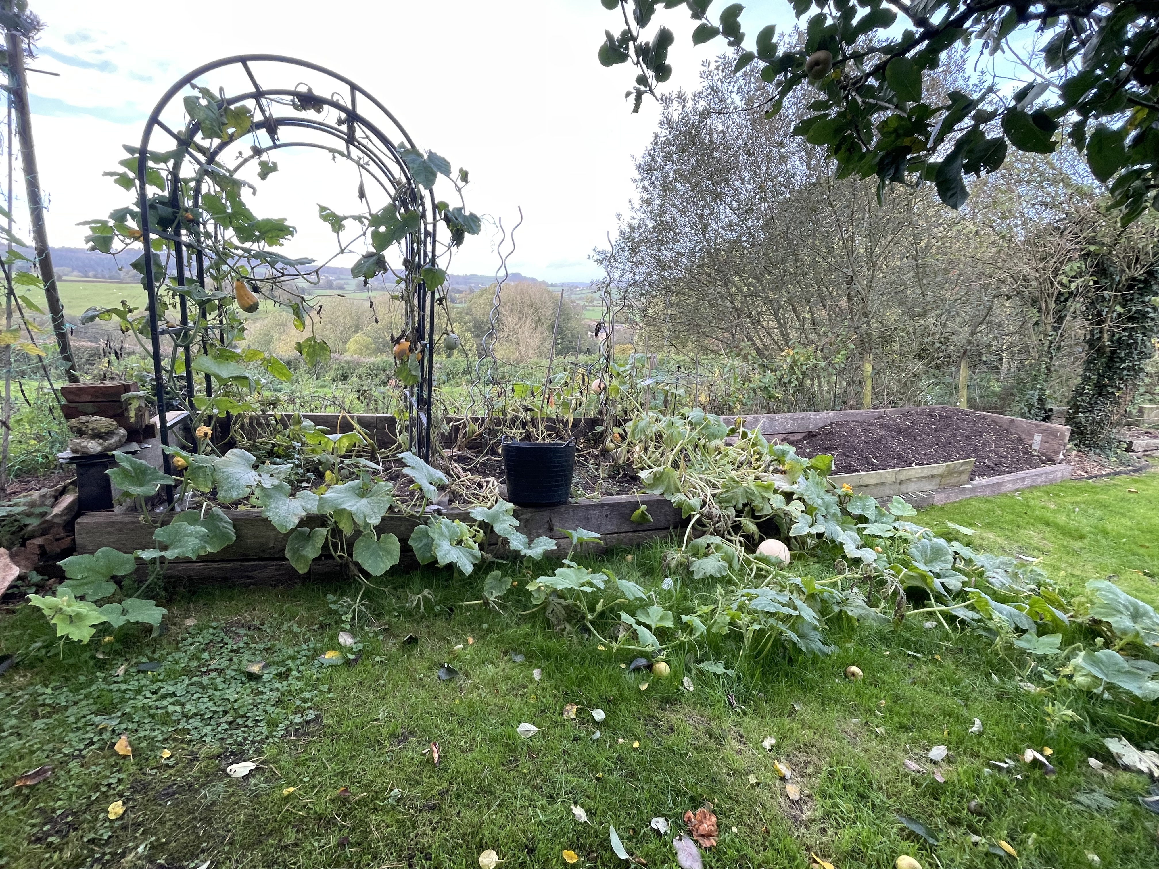 On Friday night our drain blocked again – this time due to debris coming down from the farm above and blocking the drain rather than the rain. Luckily we got to it in time to avoid losing any of our driveway, but it made us particularly nervous when Storm Ashley came through on Sunday, and we were up early to check the drain was coping ok (which it was). Once the storm passed we made the most of the dry weather to start clearing the vegetable beds, starting with the pumpkin/squash bed and the sweetcorn. It’s been a dismal year for vegetables – as our focus has been on the building work this year we planted the squashes late and didn’t have time to feed them or trail them properly. We’re lucky to get the harvest we did really – but our bad luck didn’t end here and I managed to drop a pumpkin through the cold frame, smashing a pane. That’s another job to add to the list… The sweetcorn was another disaster. I learnt from previous years and planted it deep enough not to fall over – again it was late so we had a fairly small harvest. The squirrels helped themselves to most of it too, so we ended up with four partly-grown cobs from about 30 plants… The two things that seem to have grown well are our celeriac and runner beans despite planting them both late – we harvested them this week and got 6 celeriac bulbs for soup and 3.3kg beans for the freezer. We’ll just need to find more time next year for the rest of the garden!