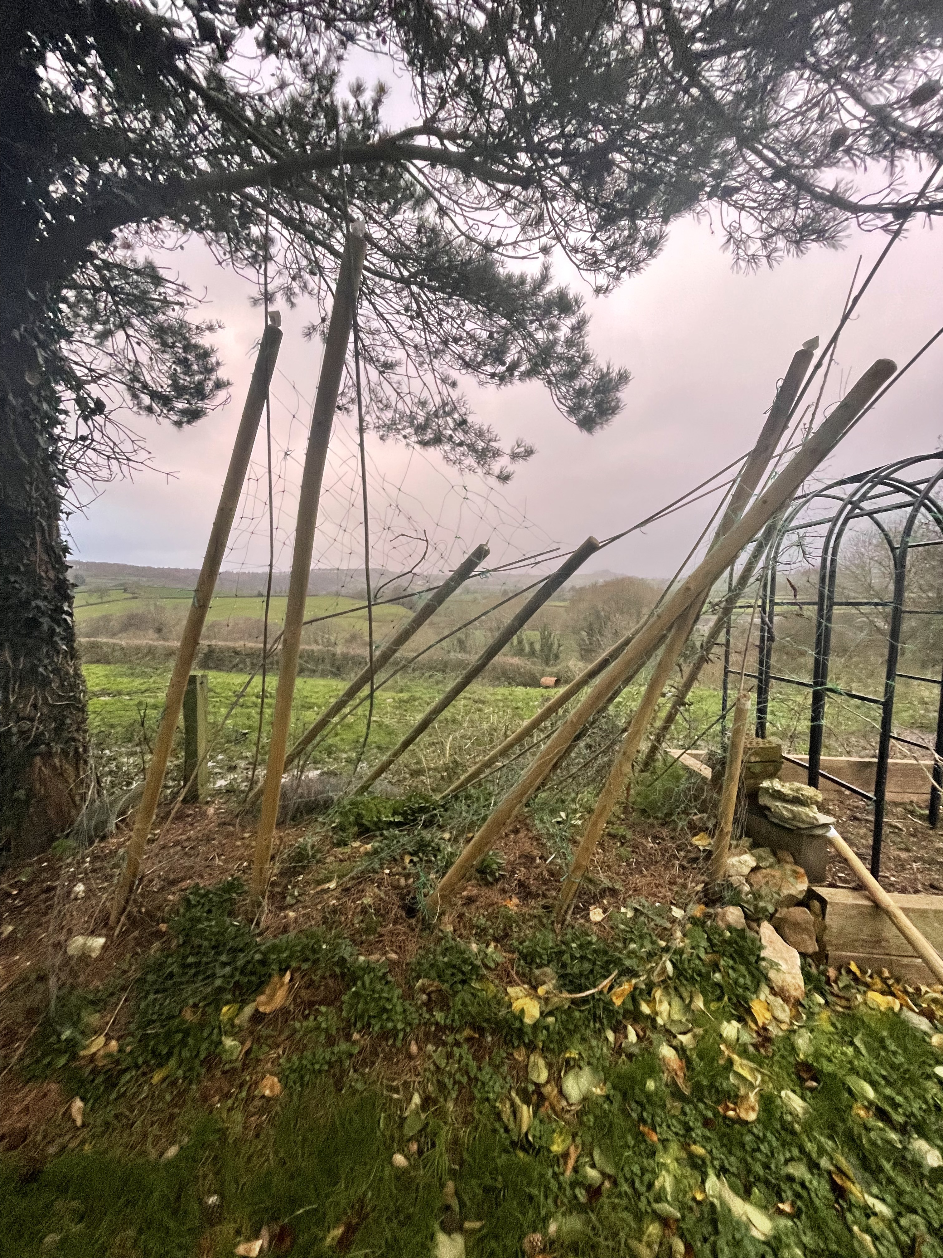 We’ve been very lucky to escape without much storm damage. Like most people in one of the warning areas, we spent most of Friday night and Saturday on edge waiting for something to happen and constantly checking our trees to see how much they were bending. On Saturday we had intermittent power cuts continually which made it difficult to get through the baking and washing; one of our veg bed covers and our pea frame were blown apart and snapped. Still – it could have been so much worse and we still had plenty of jobs to do that didn’t require electricity. And now we have a new Spring 2025 job – rebuilding our pea frame and making a proper bed with rabbit protection as we know they frequent the orchard and love to munch our pea plants!