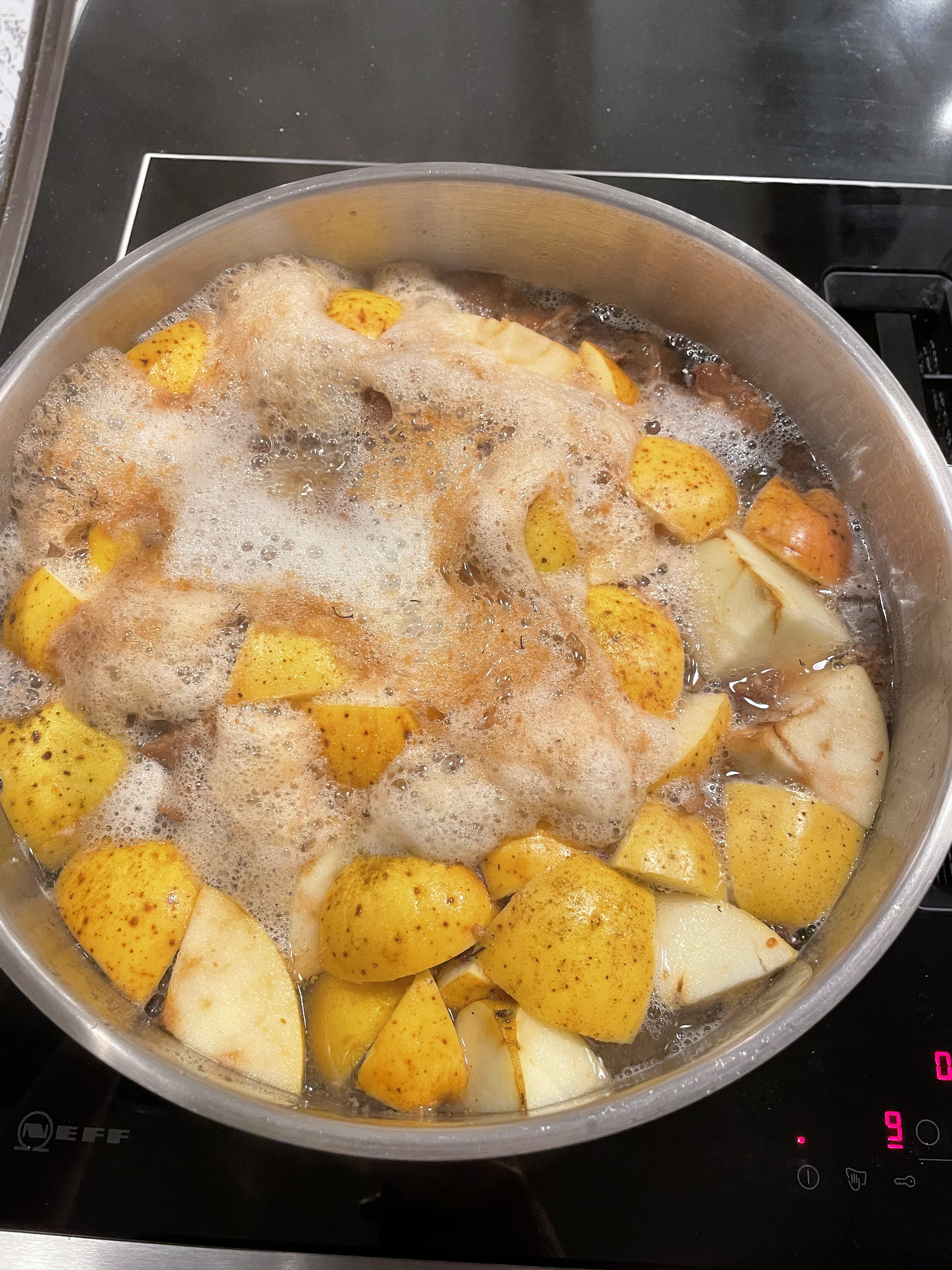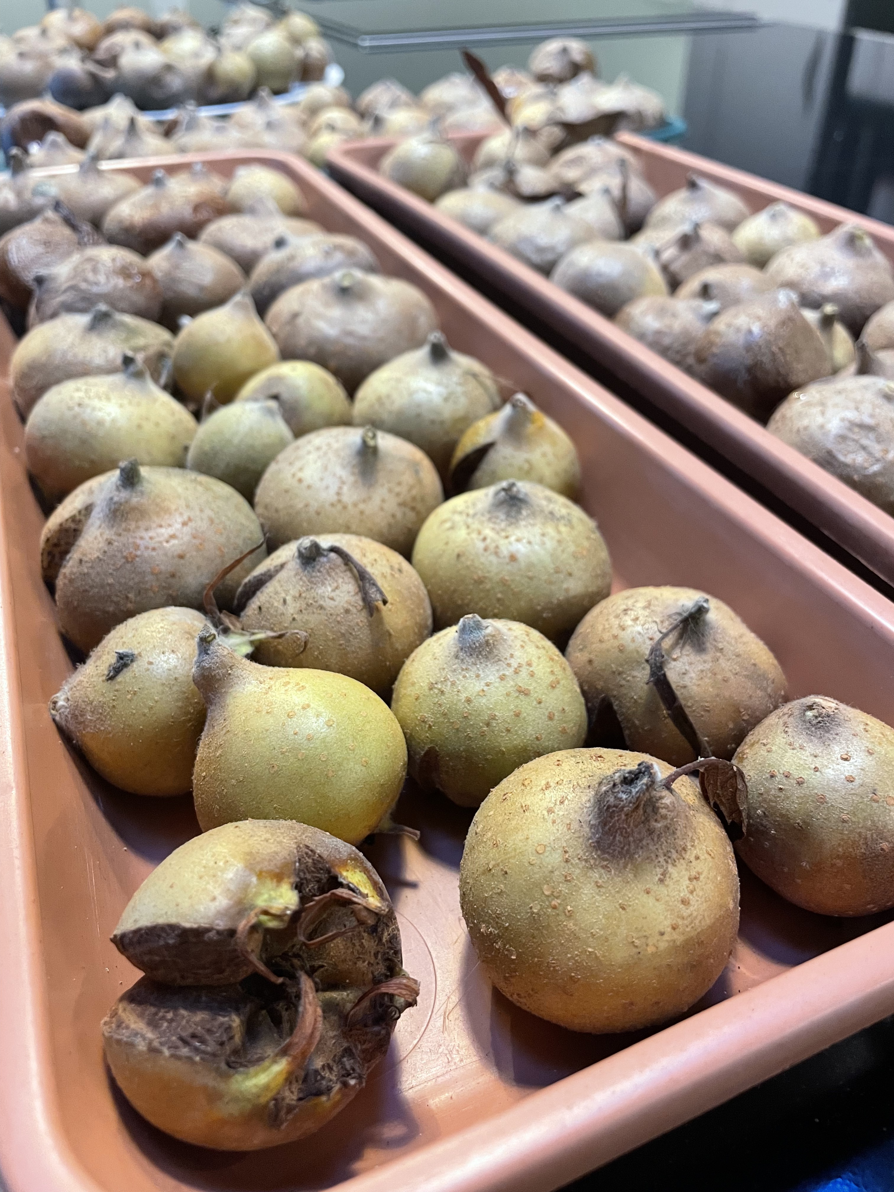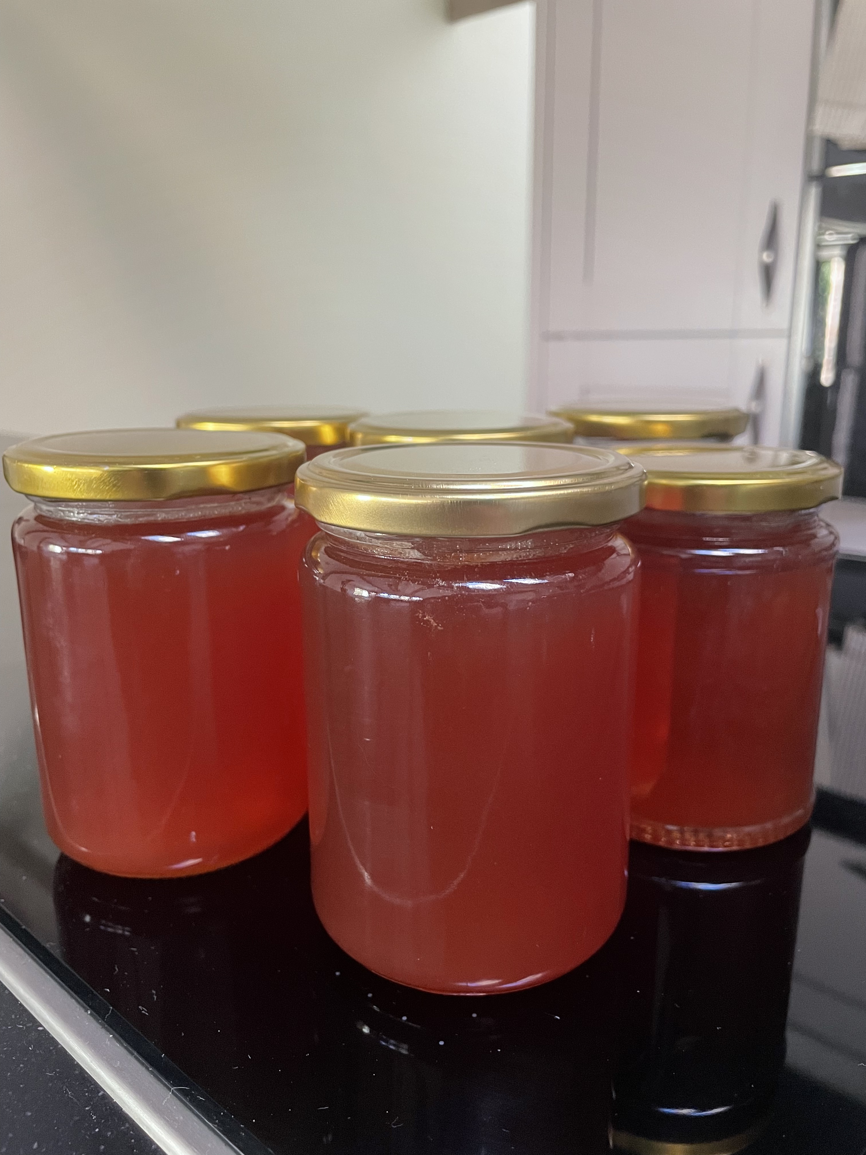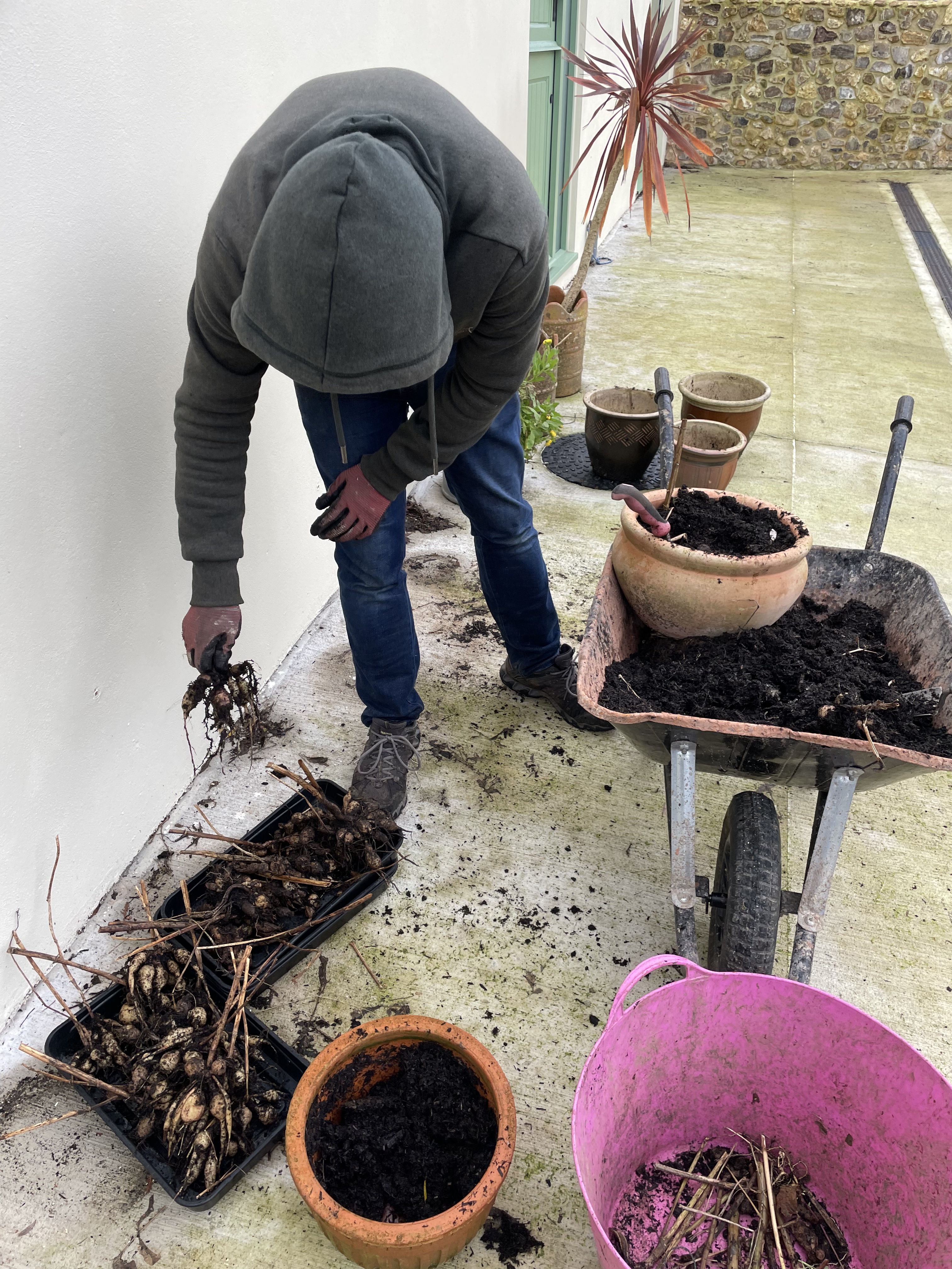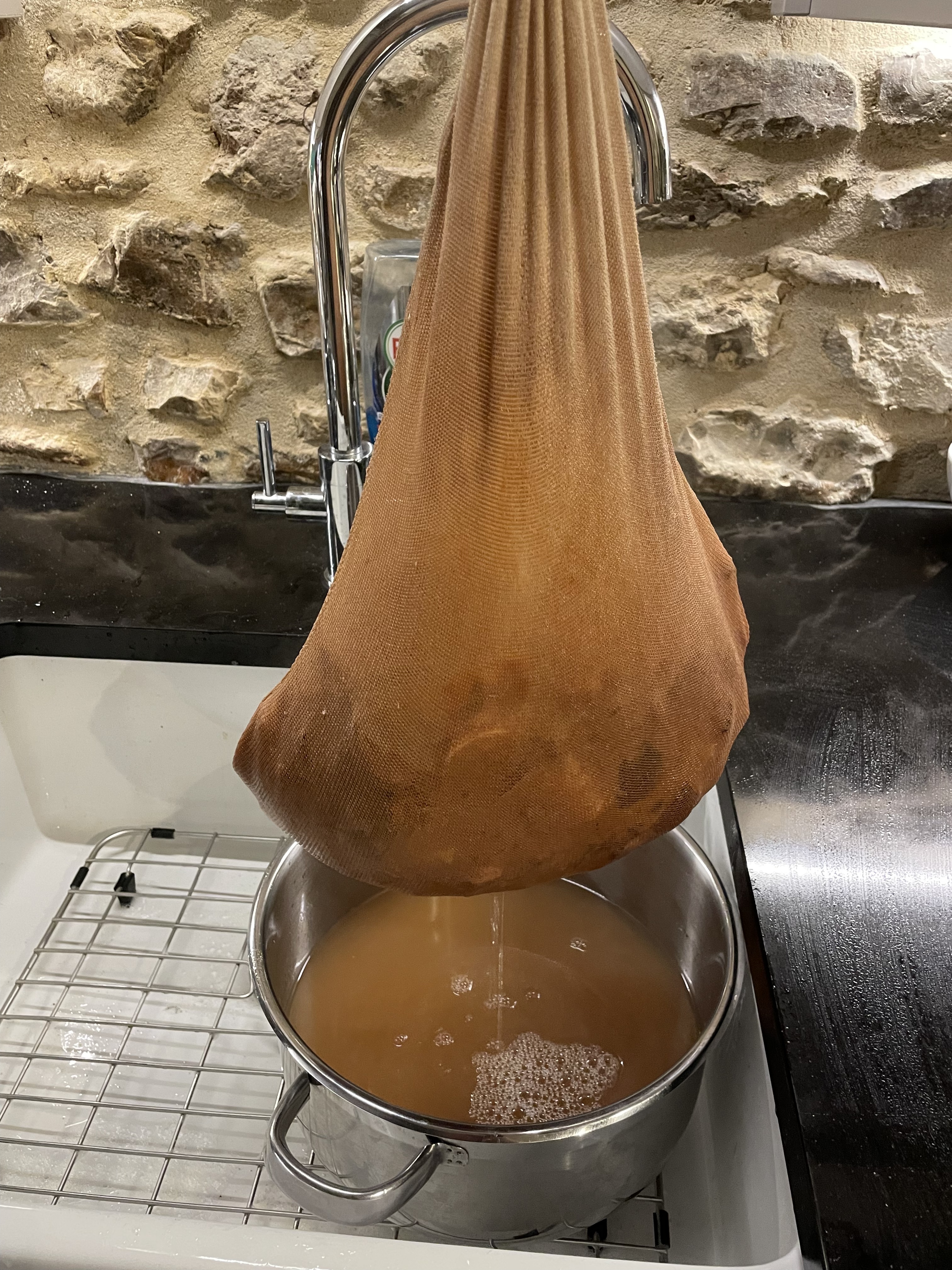It’s been a weekend of more odd jobs too. After our dismal year in the orchard we’re trying to keep up with everything we need to do to improve the harvest – starting with greasing the tree trunks to stop insects climbing up and destroying the buds and fruits. It’s supposed to be done at the start of Autumn (and again in February), but at least we’ve done it now. And perhaps this means we don’t need to do it in the Spring… We’ve also been chopping up the remaining apples to freeze ready for jam and cleaned the apple rack ready for next year; and made this year’s only batch of medlar jelly. And we emptied out all our dahlia pots so we can store the tubers over winter.