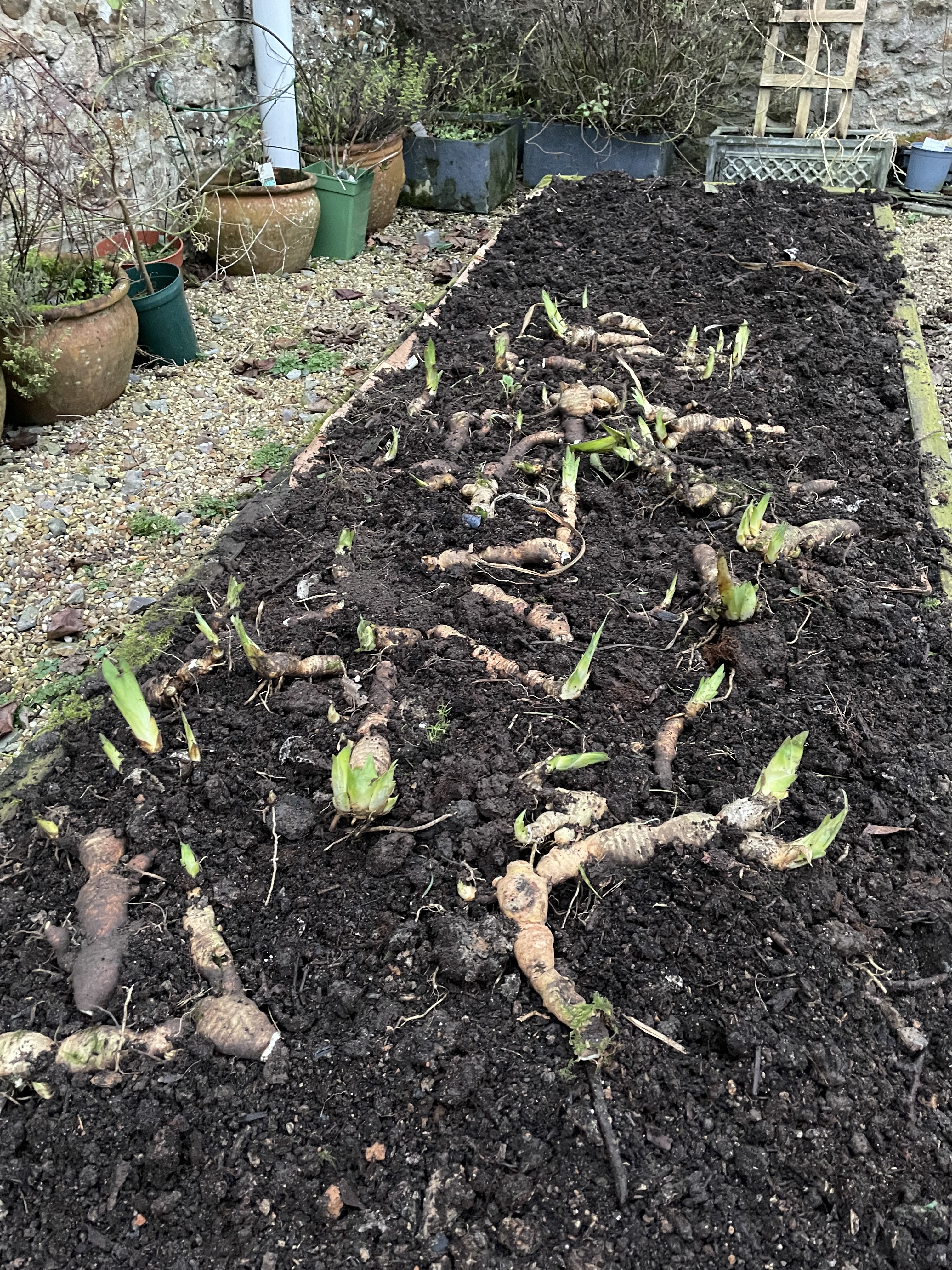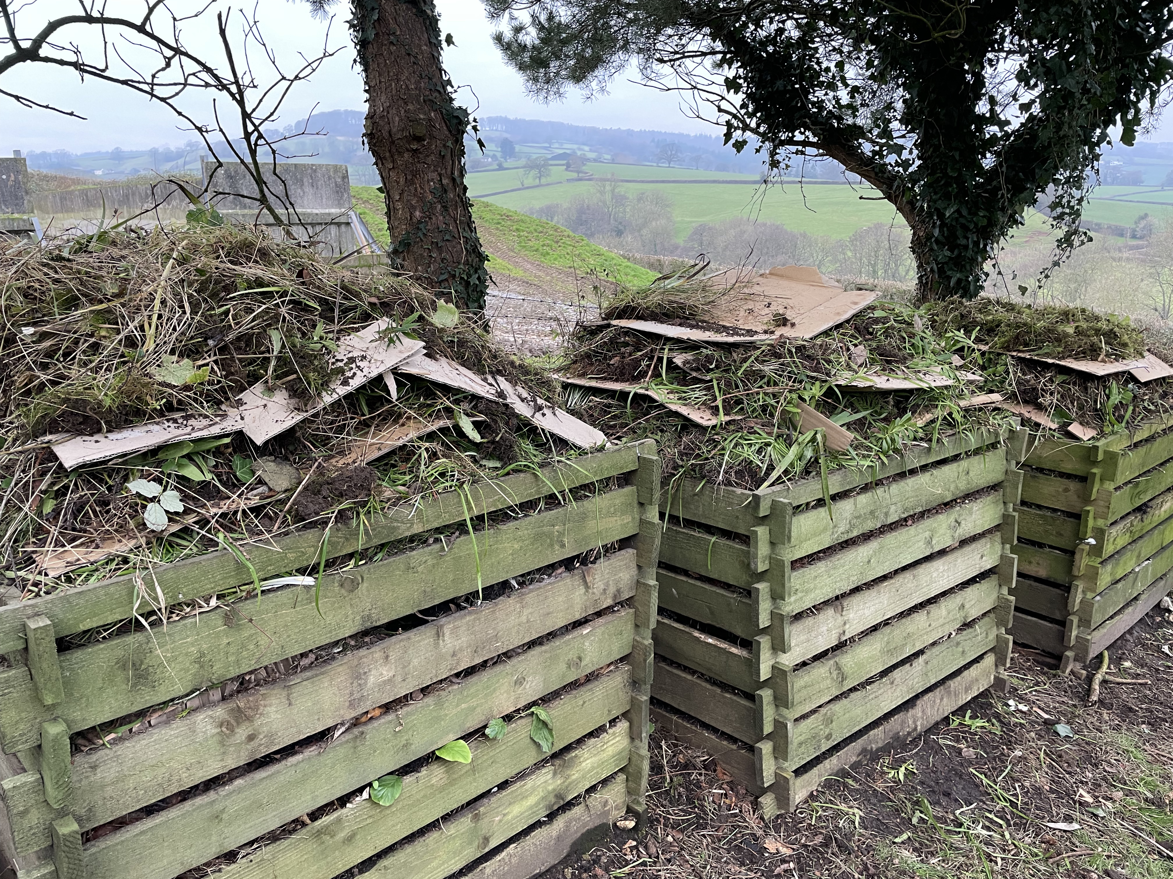 After three days we’ve managed to clear about 85% of the first bed. It’s been difficult to dig out all of the grass roots, and I’m sure we’ve missed three-cornered leek bulbs all over the place. We tried to keep as many of the primroses and other plants we found – including some huge iris rhizomes which produce the most beautiful flowers. They were impossible to dig up without splitting them so we likely won’t any flowers this year since we’ve split them too late in the season but we’re keeping our fingers crossed. We’ve temporarily ‘heeled in’ the plants we managed to dig up before we replant the bed and put them in properly to give them more chance of surviving. The compost bins are overflowing now! We’ve put multiple layers of cardboard between the weeds to give them a better chance of breaking down and dying.