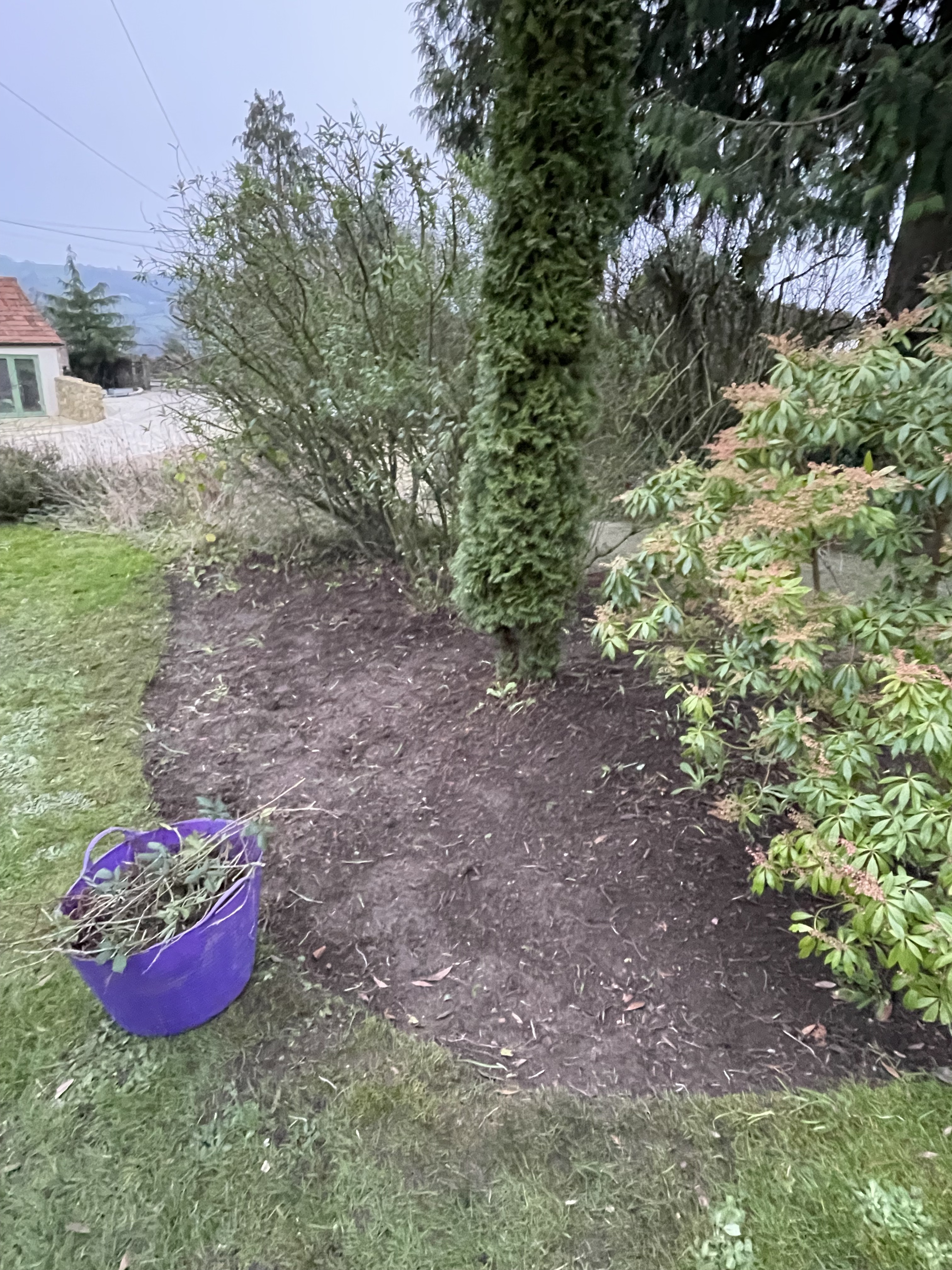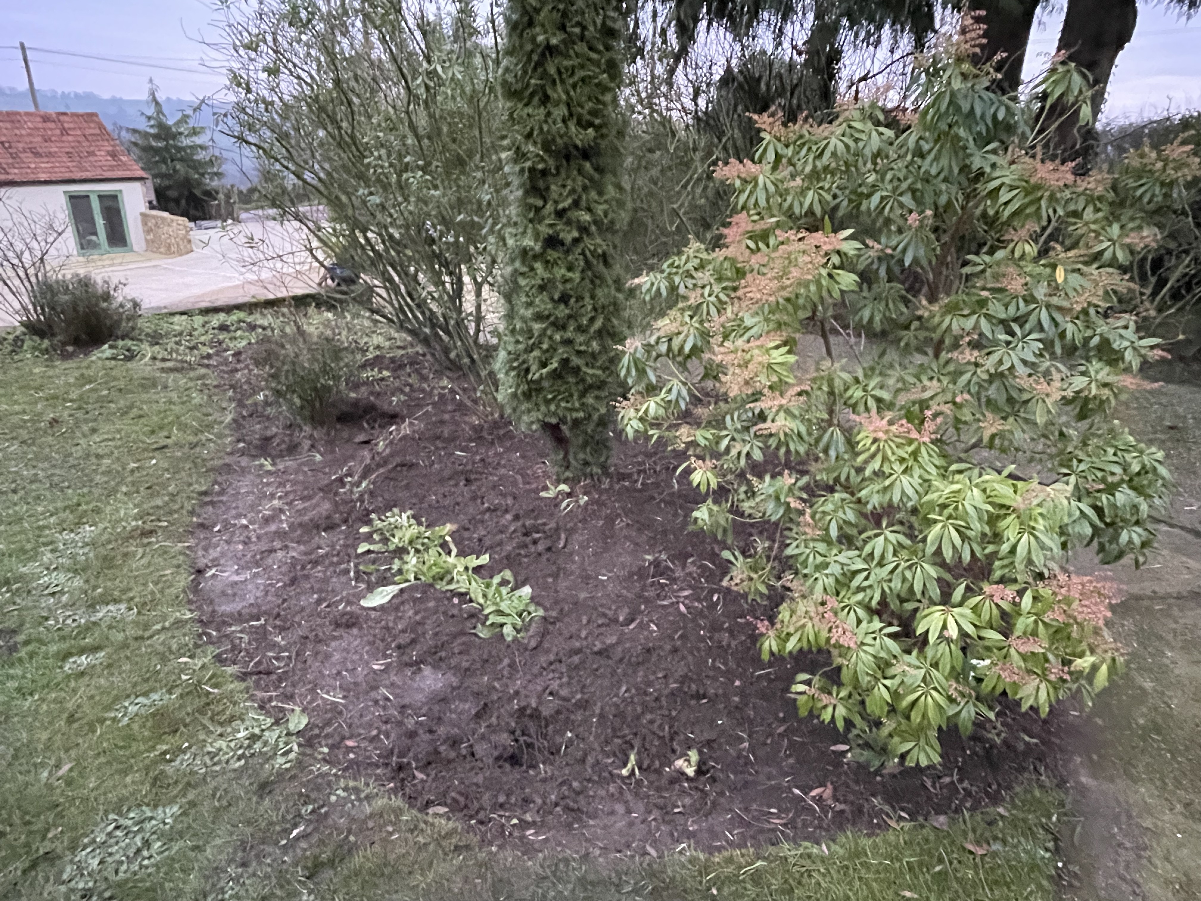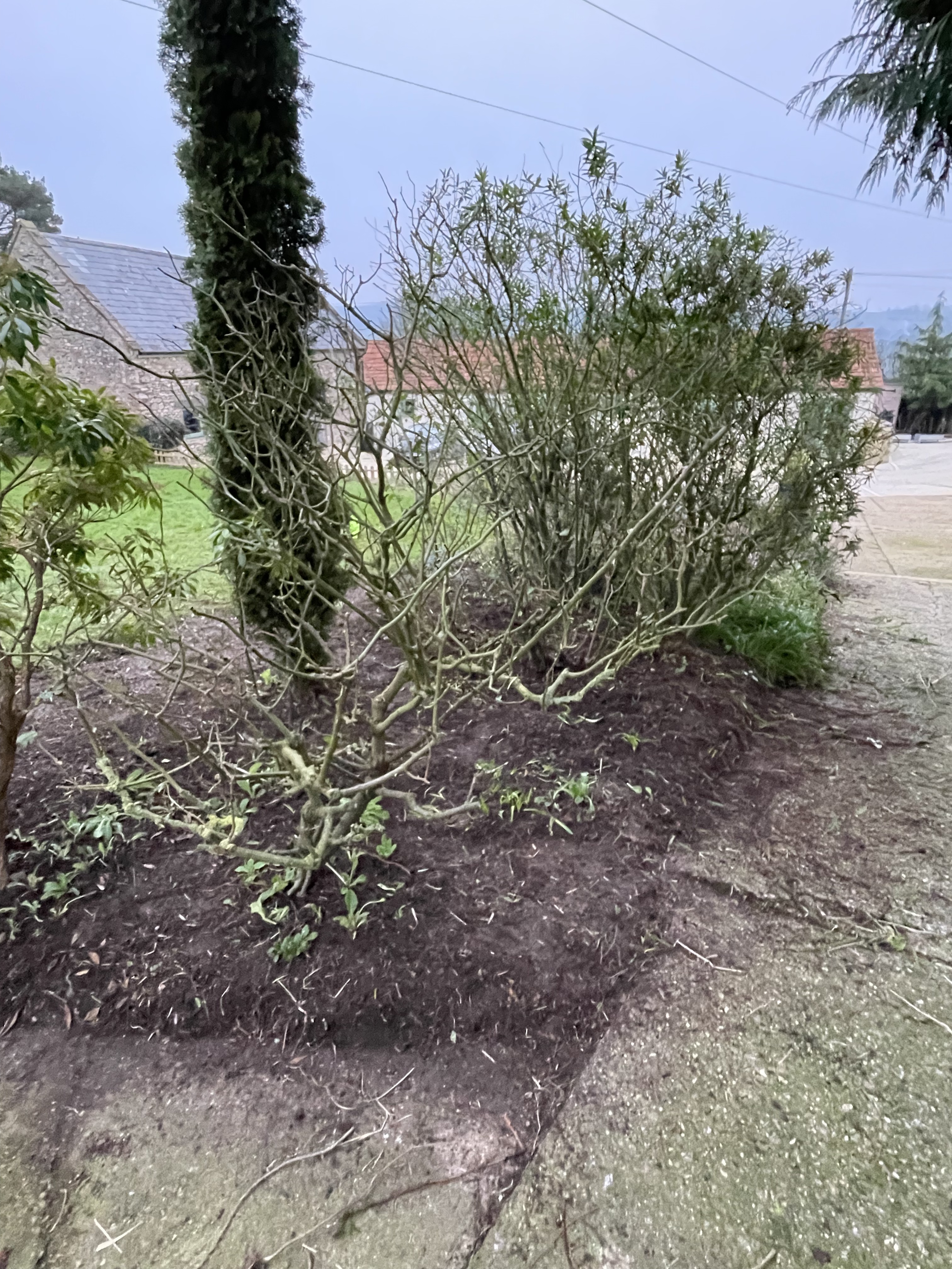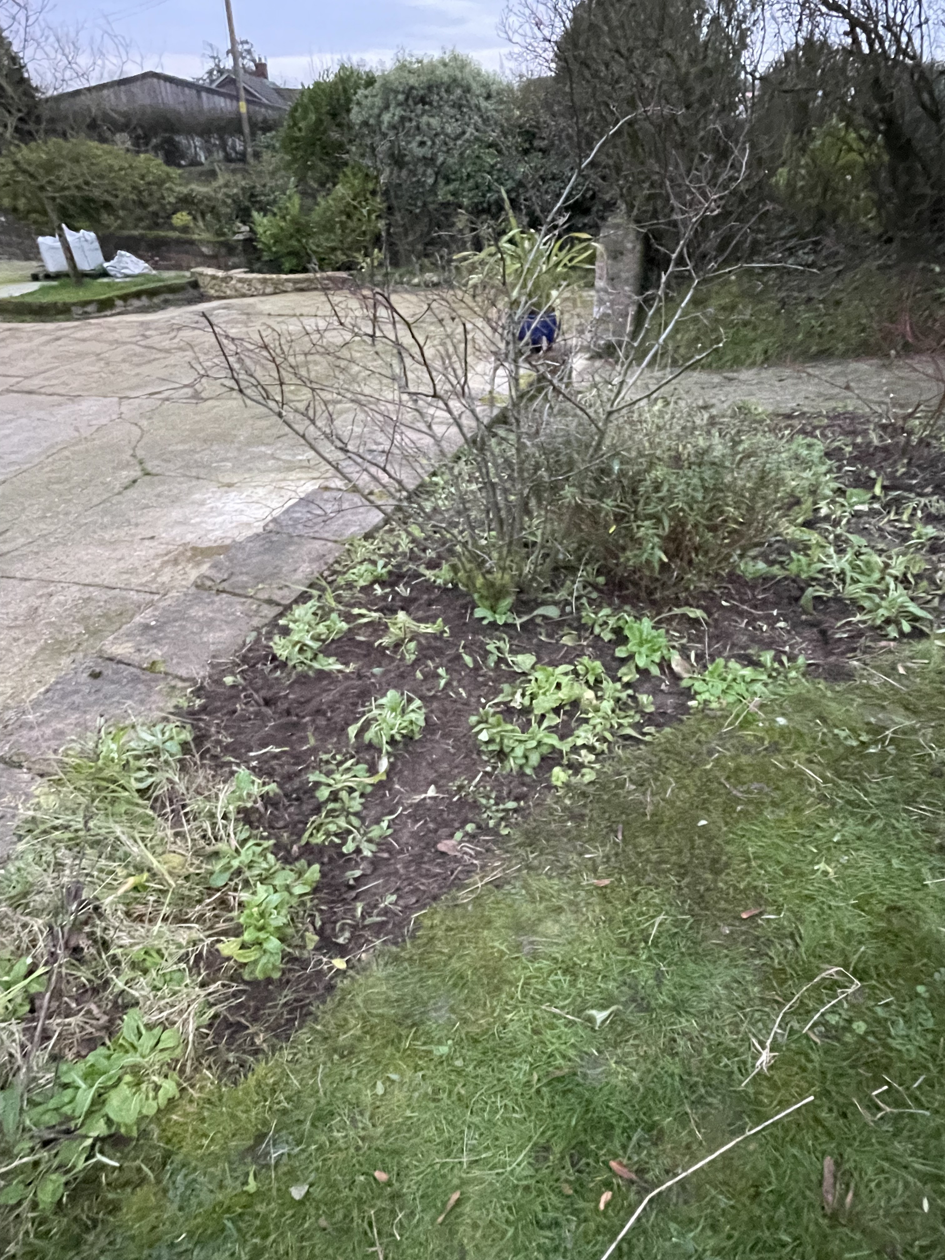 So with a day off on Friday and a weekend without guests staying (it’s not really a job we can do with people staying at the Farmhouse), we started with the largest bed that runs along the side of the driveway and up around the front lawn. It was full of three-cornered leek (a tasty but invasive plant that seems to appear out of nowhere and multiply at an incredible rate), brambles and grass predominantly. The shrubs were overgrown and needed cutting back – one of our first jobs although we need to go back and trim some of them further.