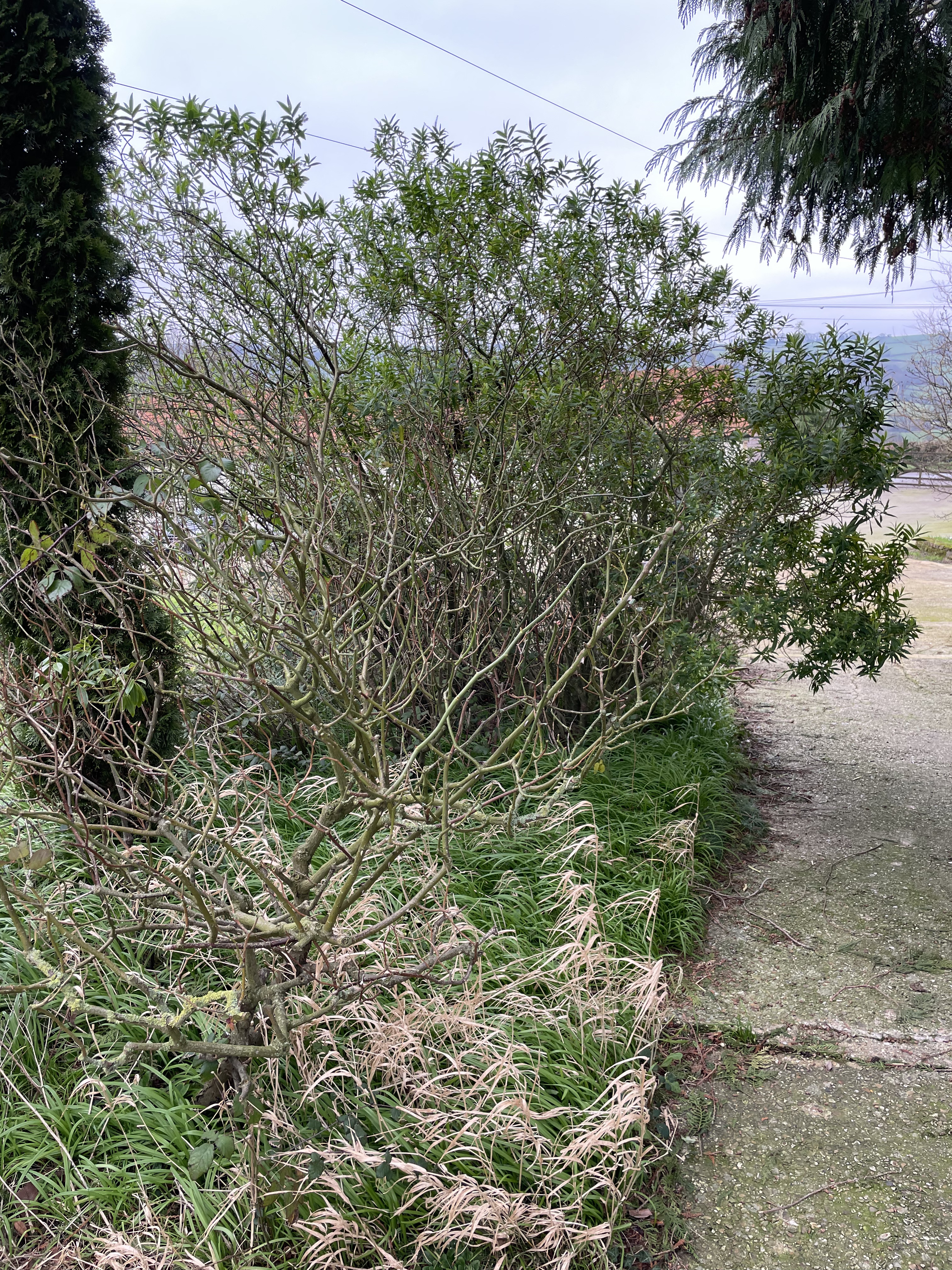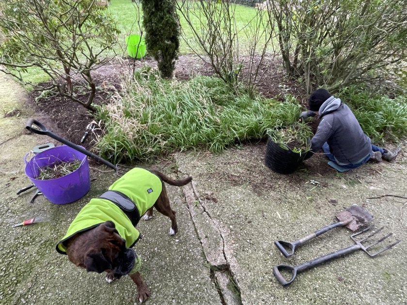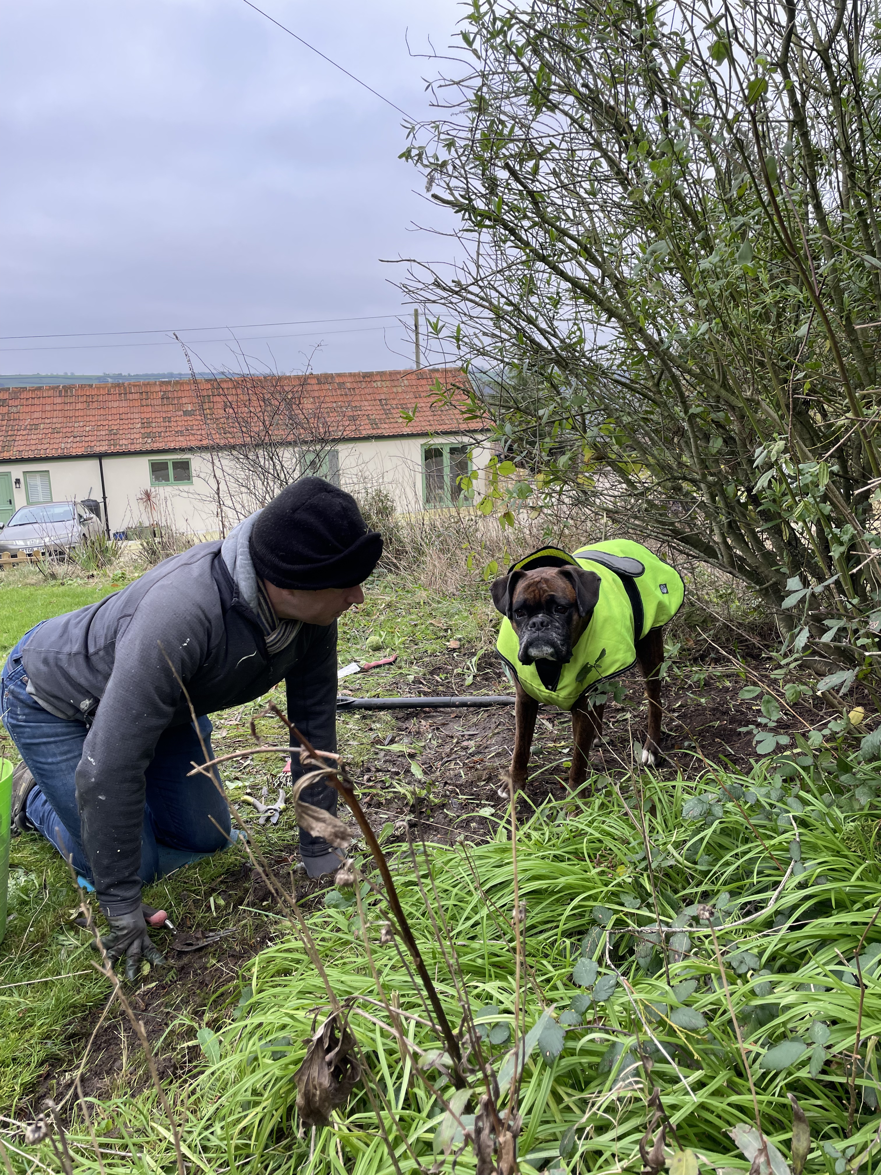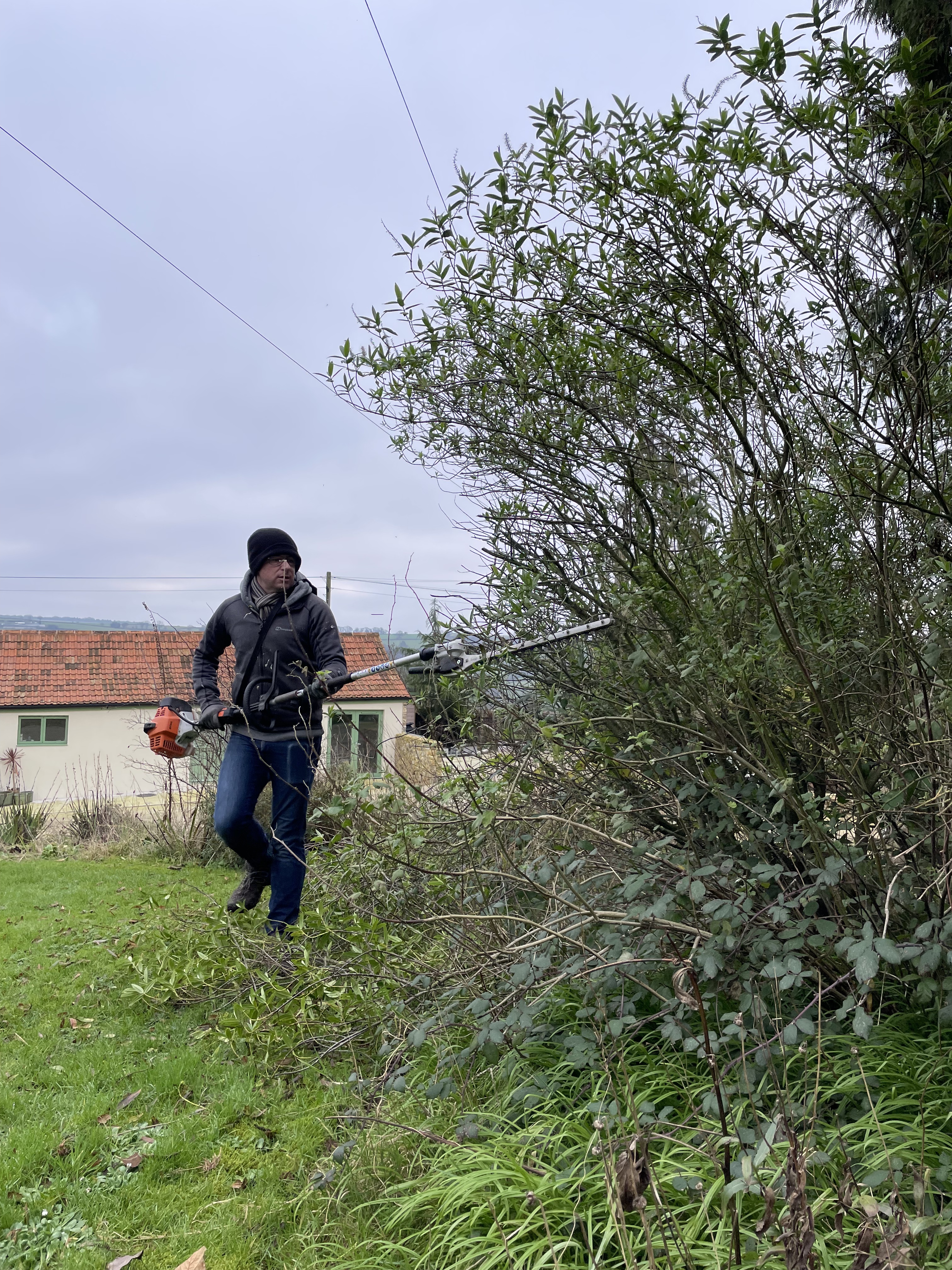 So with a day off on Friday and a weekend without guests staying (it’s not really a job we can do with people staying at the Farmhouse), we started with the largest bed that runs along the side of the driveway and up around the front lawn. It was full of three-cornered leek (a tasty but invasive plant that seems to appear out of nowhere and multiply at an incredible rate), brambles and grass predominantly. The shrubs were overgrown and needed cutting back – one of our first jobs although we need to go back and trim some of them further.