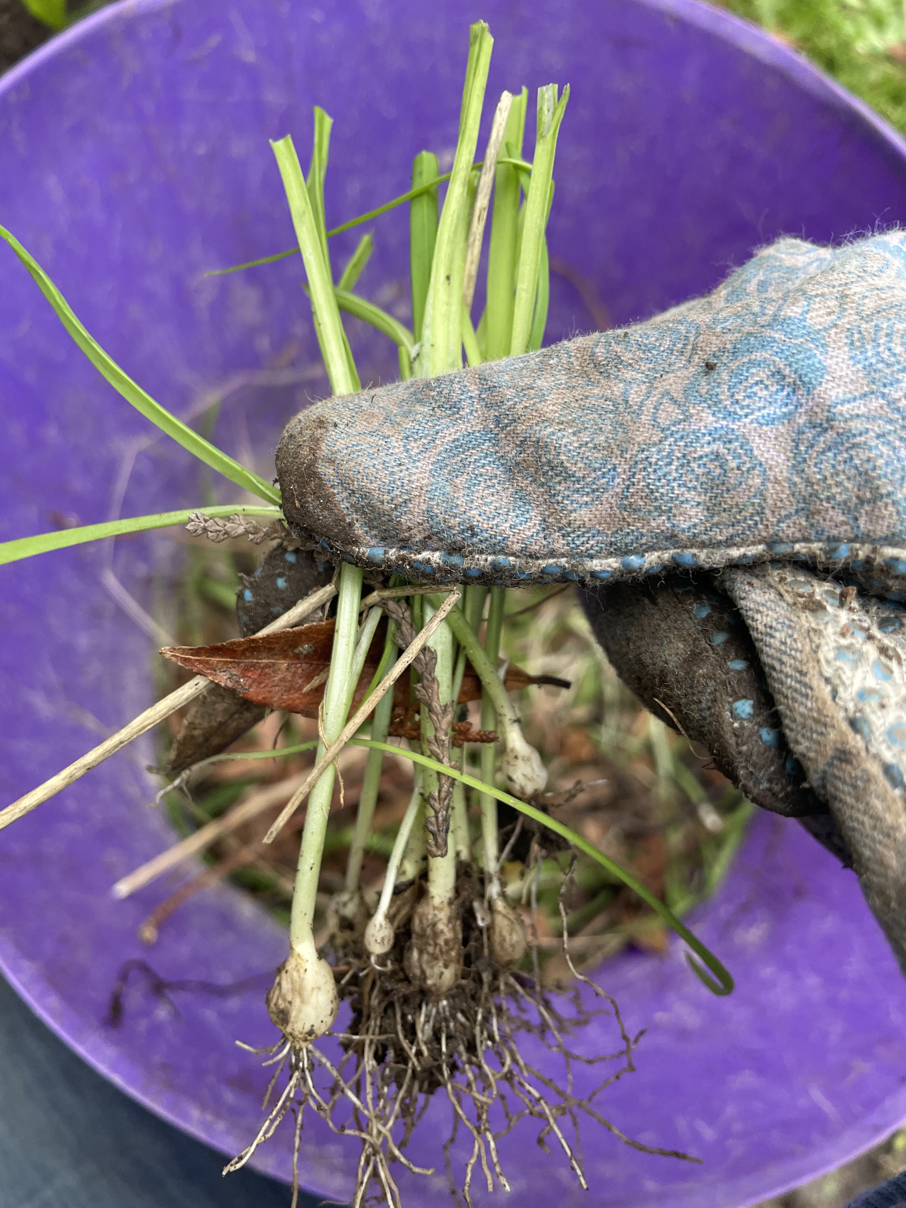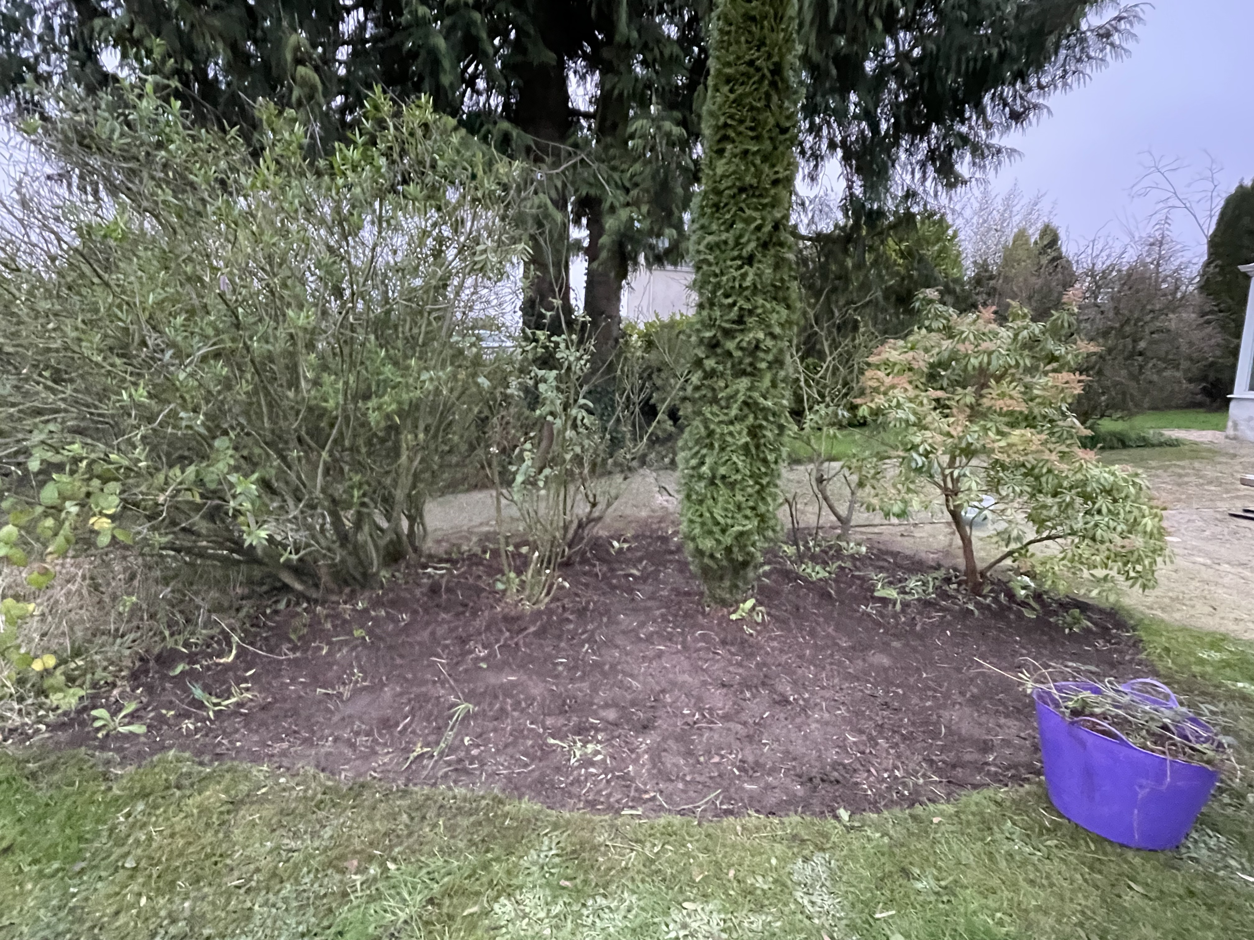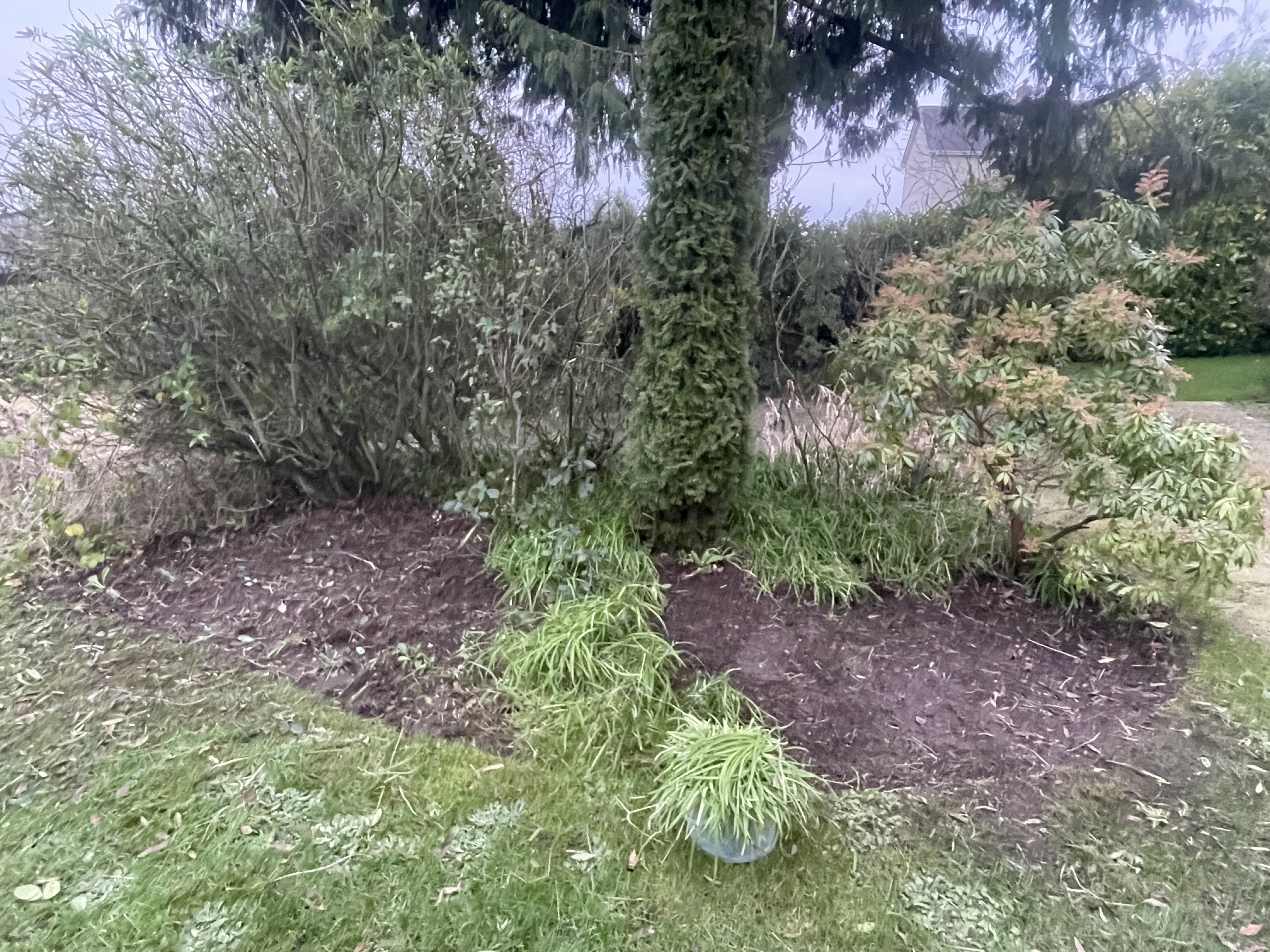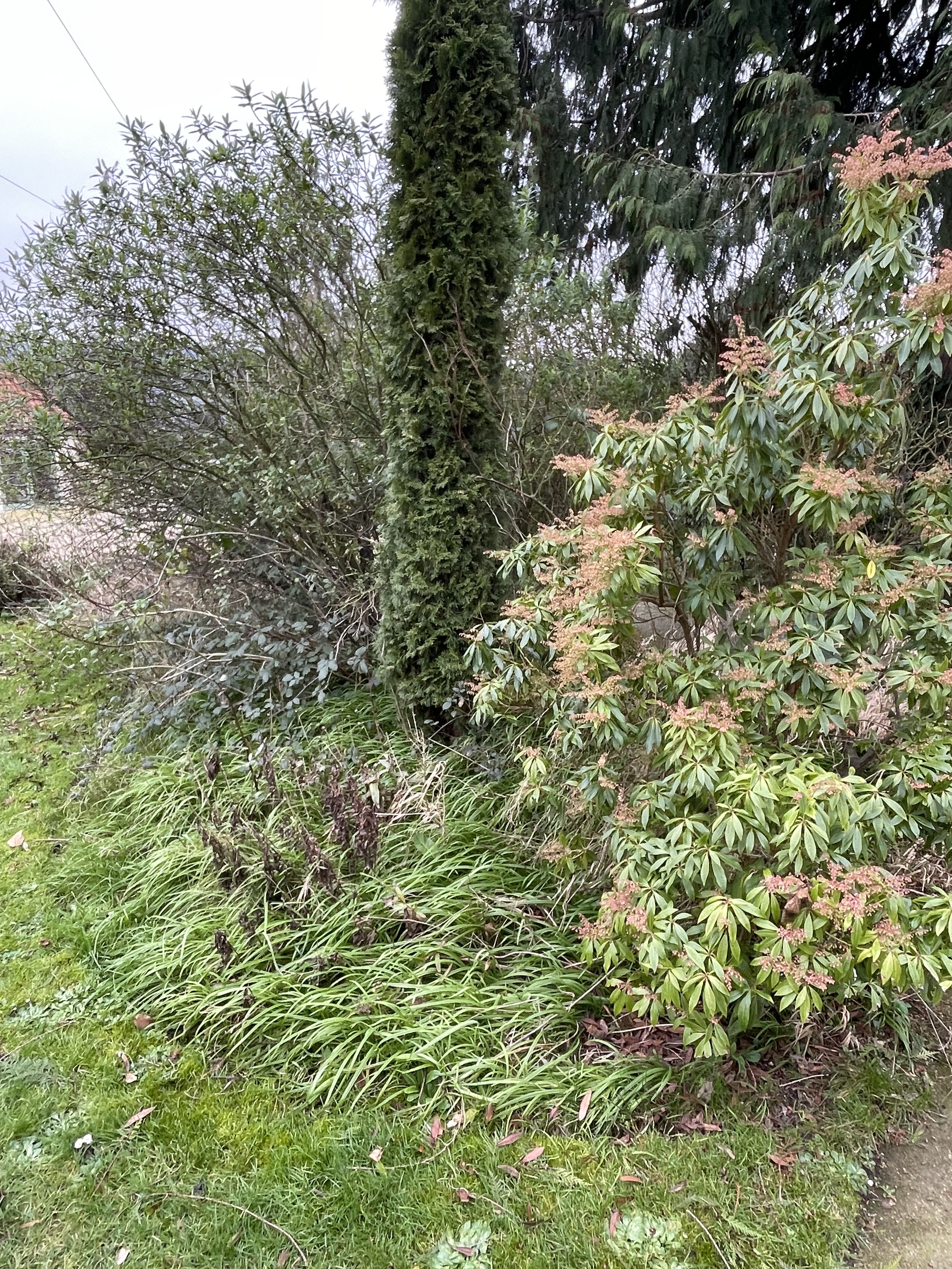 So with a day off on Friday and a weekend without guests staying (it’s not really a job we can do with people staying at the Farmhouse), we started with the largest bed that runs along the side of the driveway and up around the front lawn. It was full of three-cornered leek (a tasty but invasive plant that seems to appear out of nowhere and multiply at an incredible rate), brambles and grass predominantly. The shrubs were overgrown and needed cutting back – one of our first jobs although we need to go back and trim some of them further.