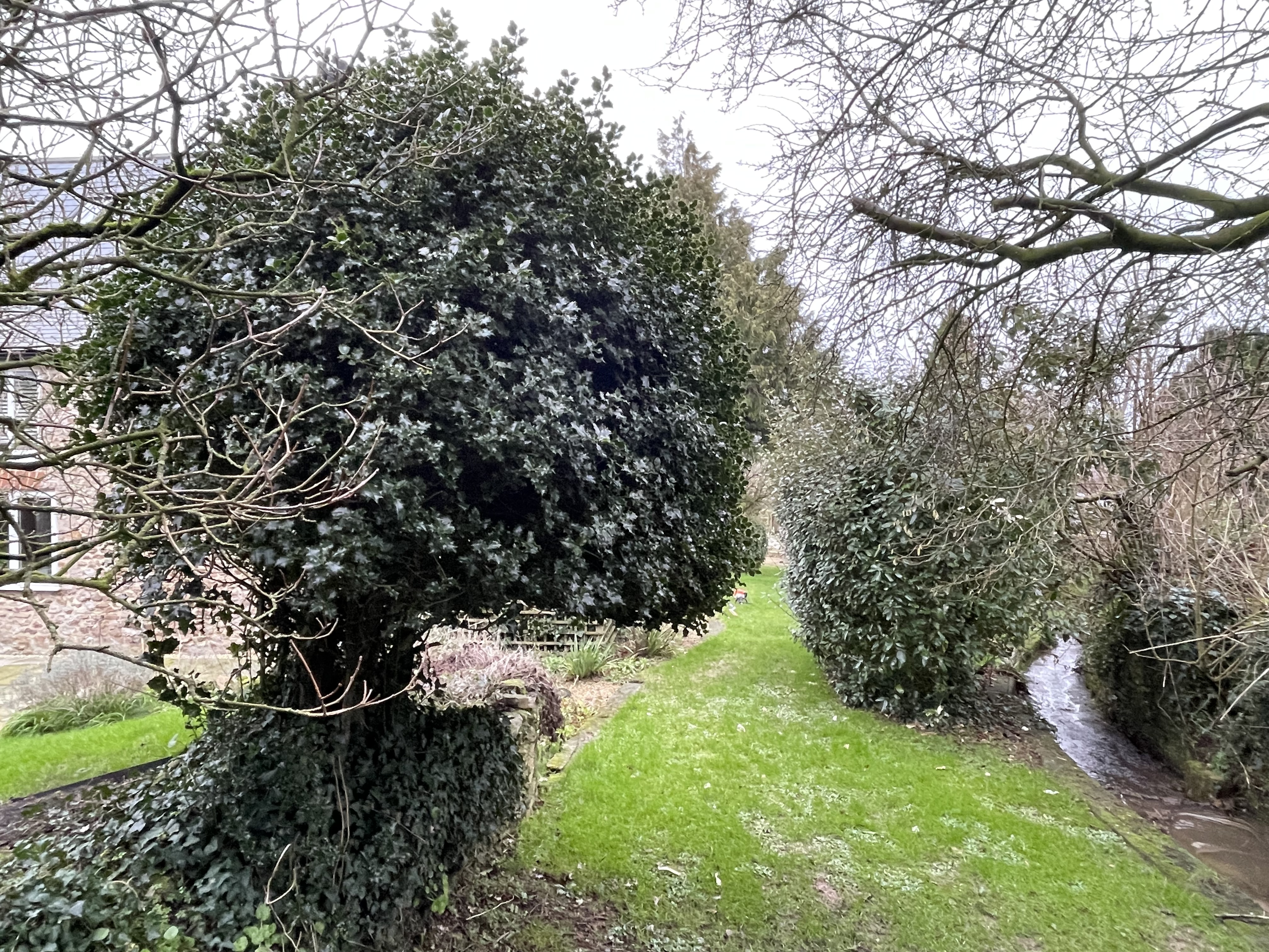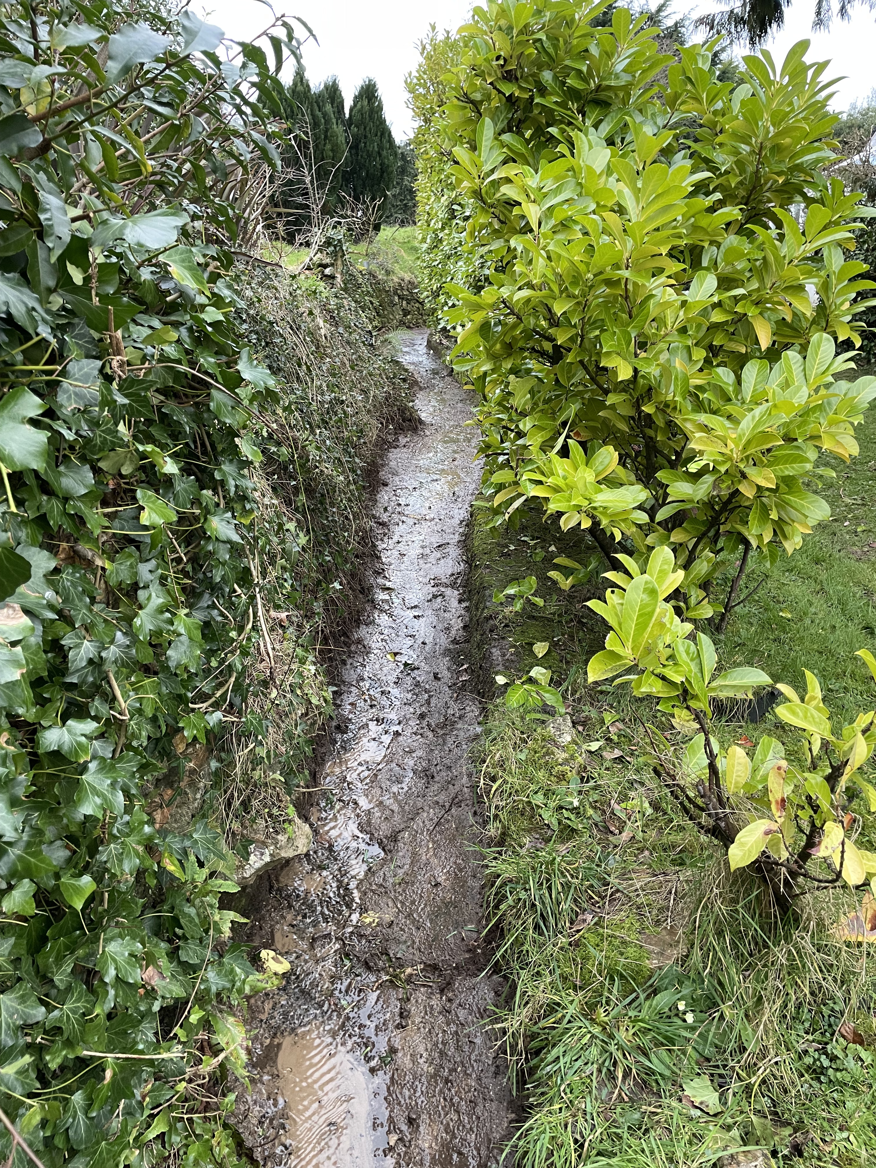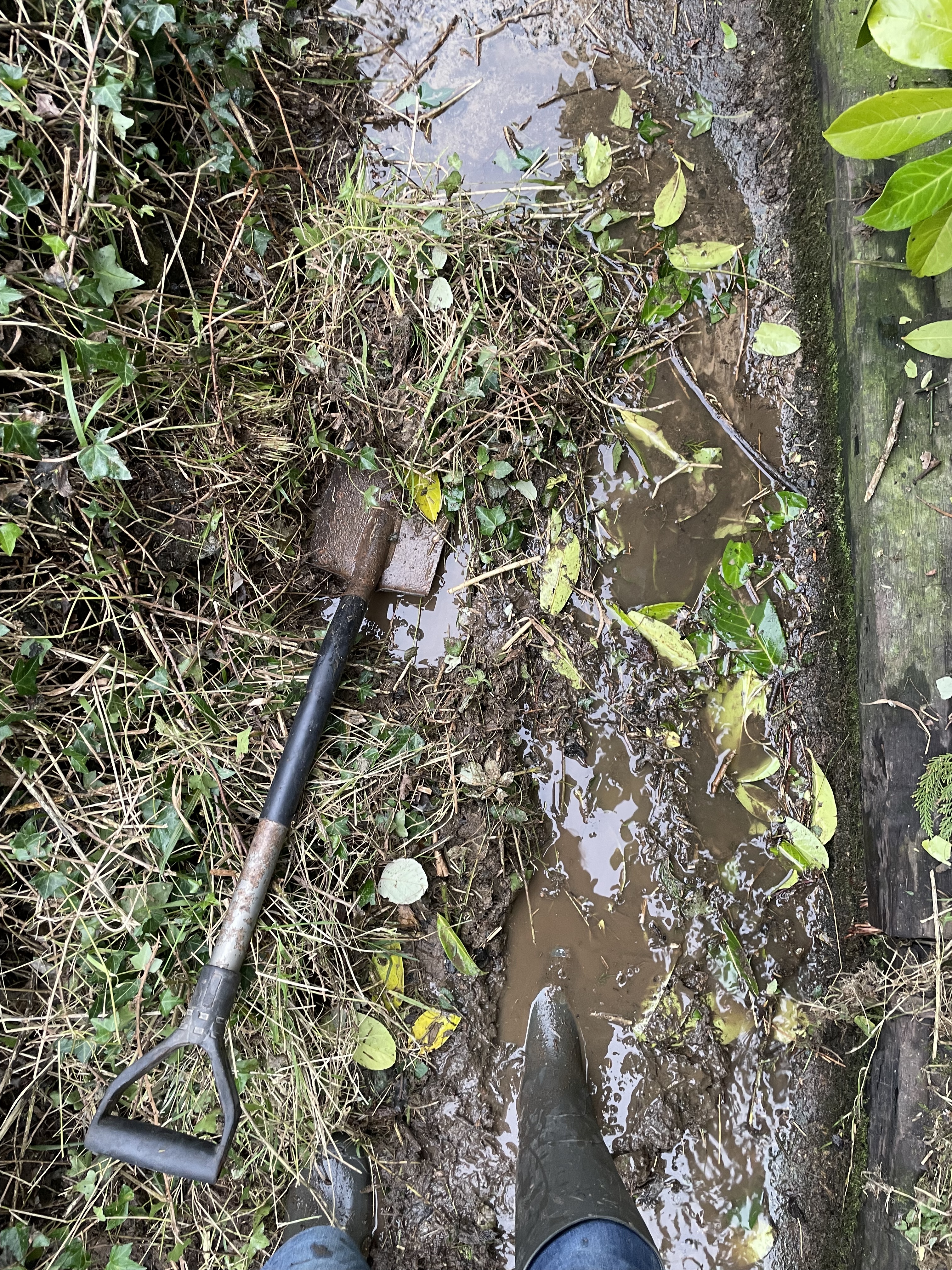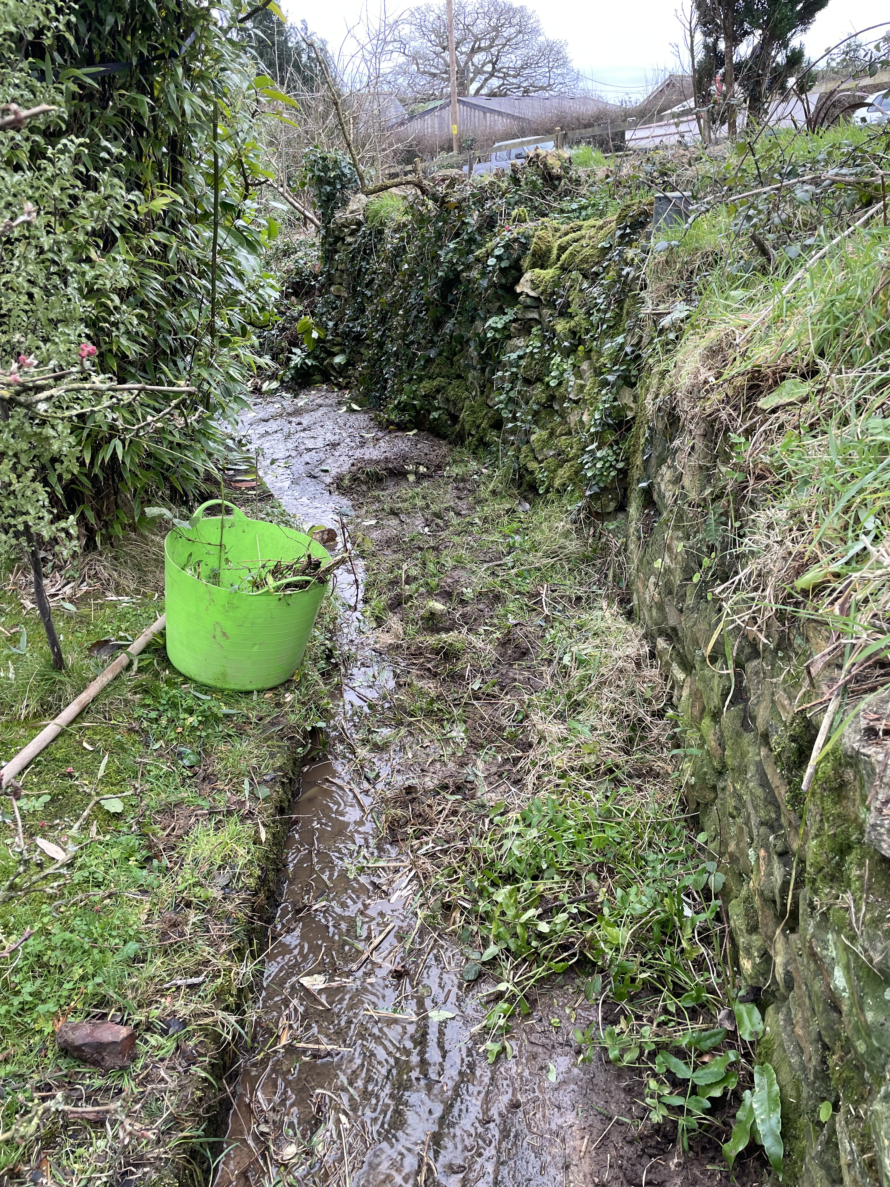 We also cleared the rainwater channel that runs down the side of our property next to the wall that separates us from next door. Because we’re set into the hill a bit, the wall actually holds up part of next door’s garden, and has a huge bank above it, covered in brambles, nettles, ivy and all sorts of dead vegetation. The channel had got pretty overgrown – with big piles of mud full of weeds catching the vegetation coming down off the bank and the silage from the farm above. The metal ‘gates’ that John put in place to catch things on their way down had been washed out and weren’t catching anything at all – no wonder the drain cover blocked last week. It was a pretty messy job getting rid of all the mud and weeds, and our arms are still sore from removing the brambles and nettles from the bank. It looks a lot better now though – and we uncovered a gap in the wall that used to be steps up to the land above when it was all part of the same farm and housed their vegetable patch; now blocked up and home to a self-seeded tree. The rainwater coming off the hill should make it down the channel more quickly, and the [now-reinforced] gates should catch any stones, silage or anything else coming along with it. At some point we’ll do more to the bank to tidy it up properly and put plants there instead of allowing the weeds to grow – we have enough major jobs on our list for this year though!