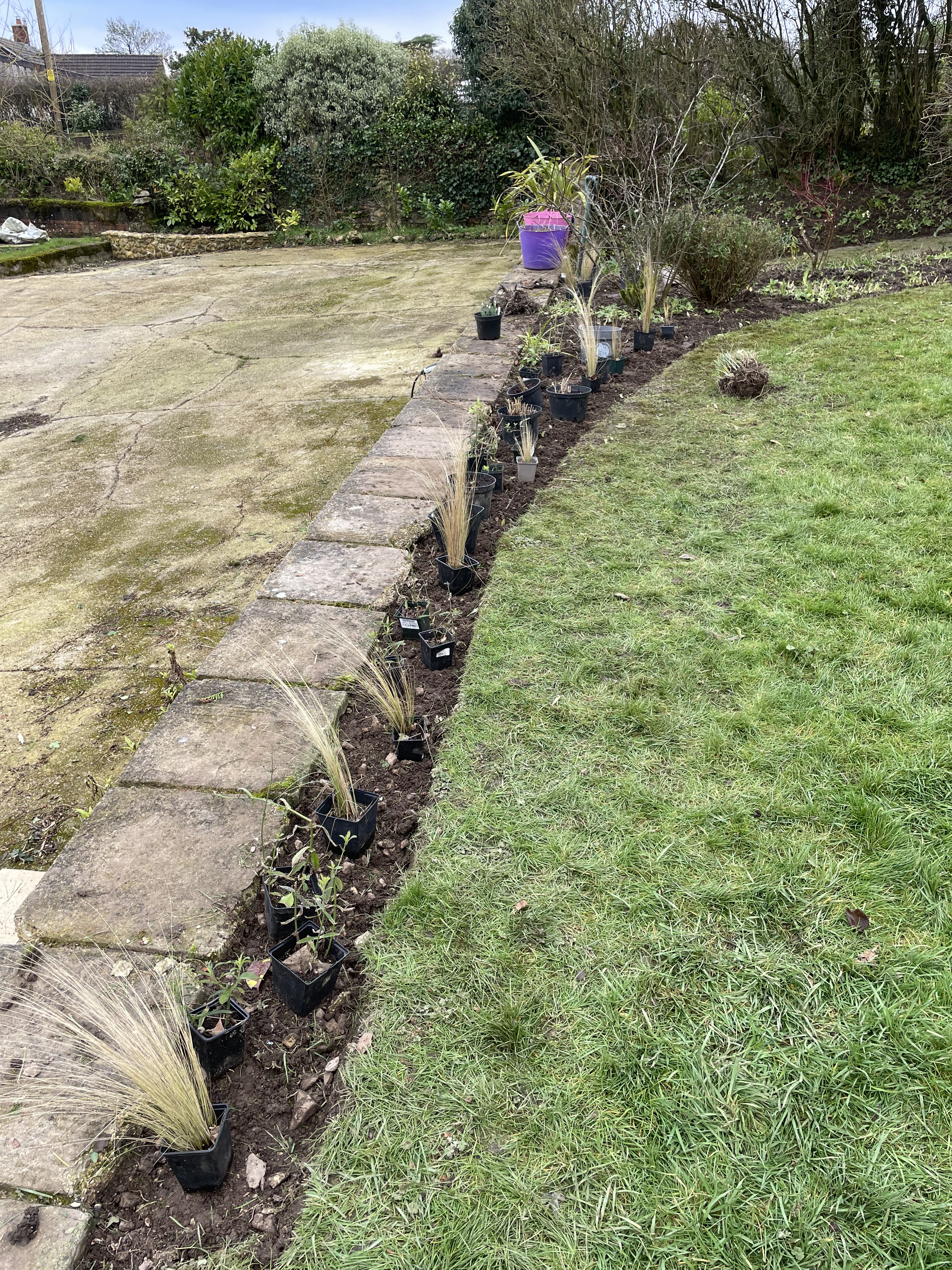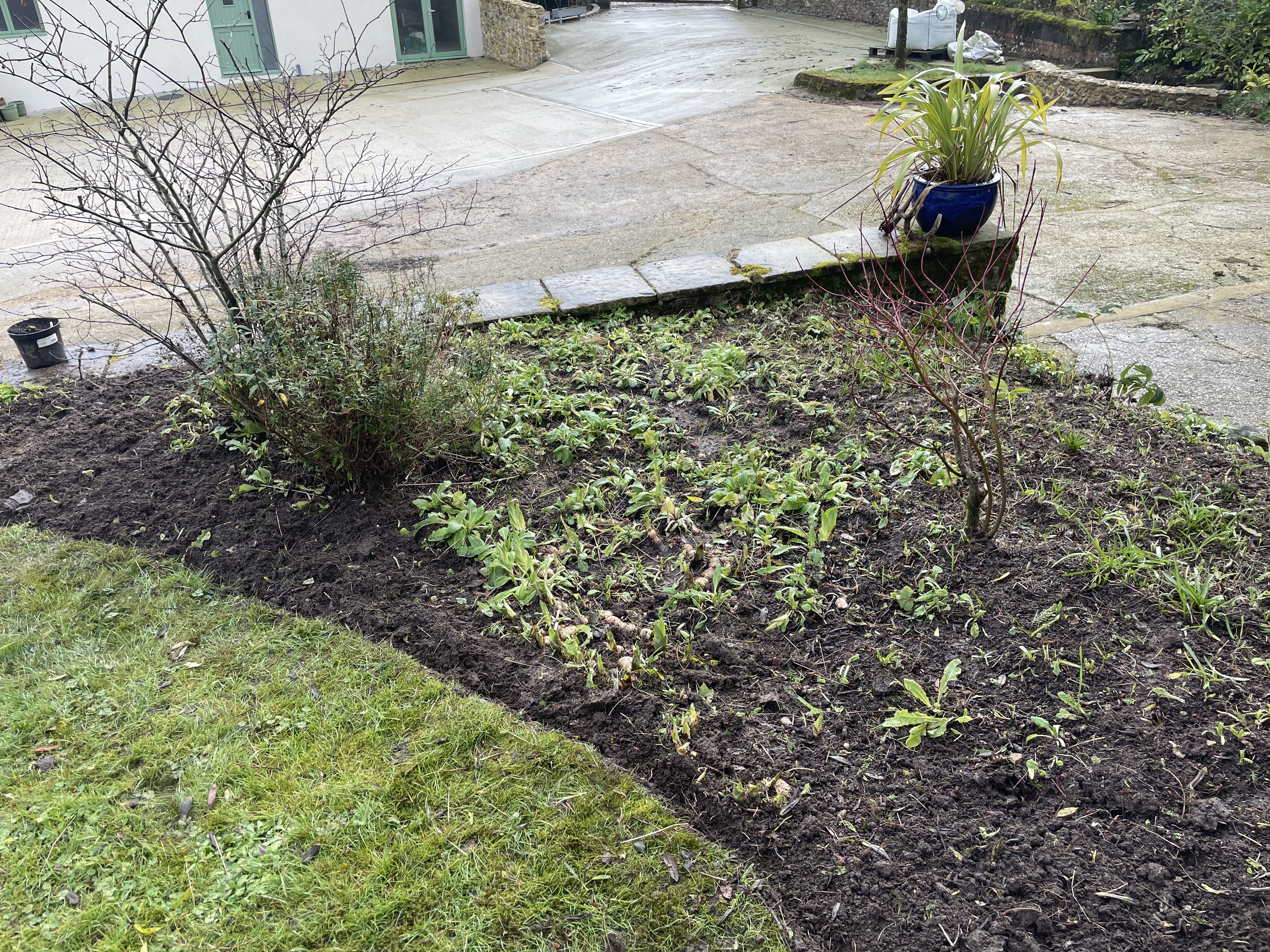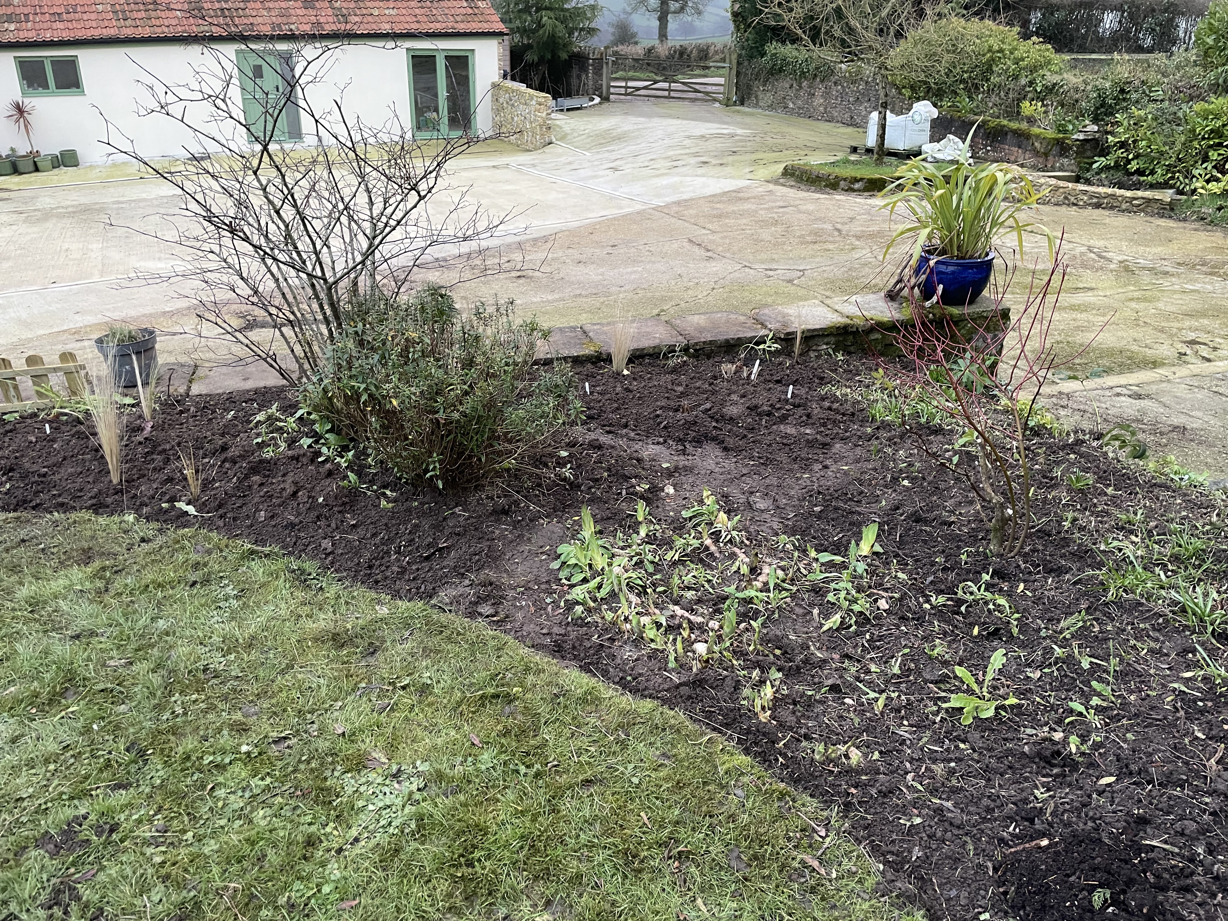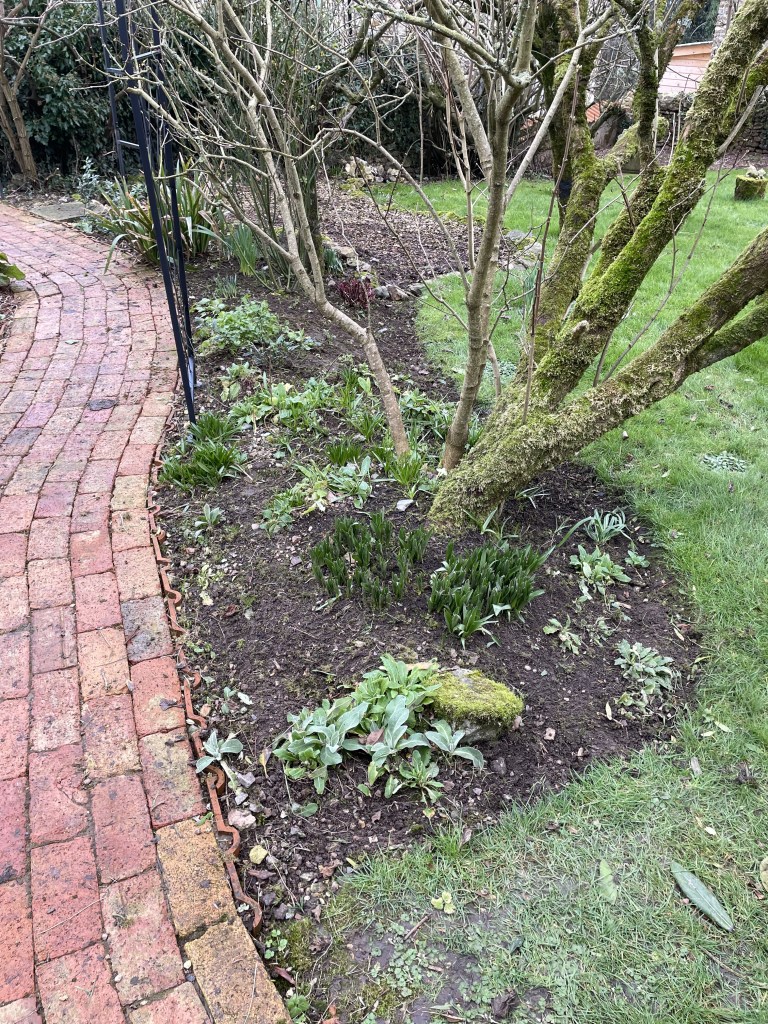 In the main bed we took out most of the primroses that had taken over the bed and relocated them to the snowdrop bank and beneath some of the shrubs as you walk up the driveway. We extended the bed along the picket fence up to the daffodils that were planted before we moved in, to create a break between the lawn and the courtyard, making it easier to mow the lawn too as the grass isn’t up against the fence now. And somehow we also managed to plant all of the plants we’d kindly been donated by my parents – it helps to have a garden designer in the family who is willing to dig up various seedlings from their garden and pot up for us to take!