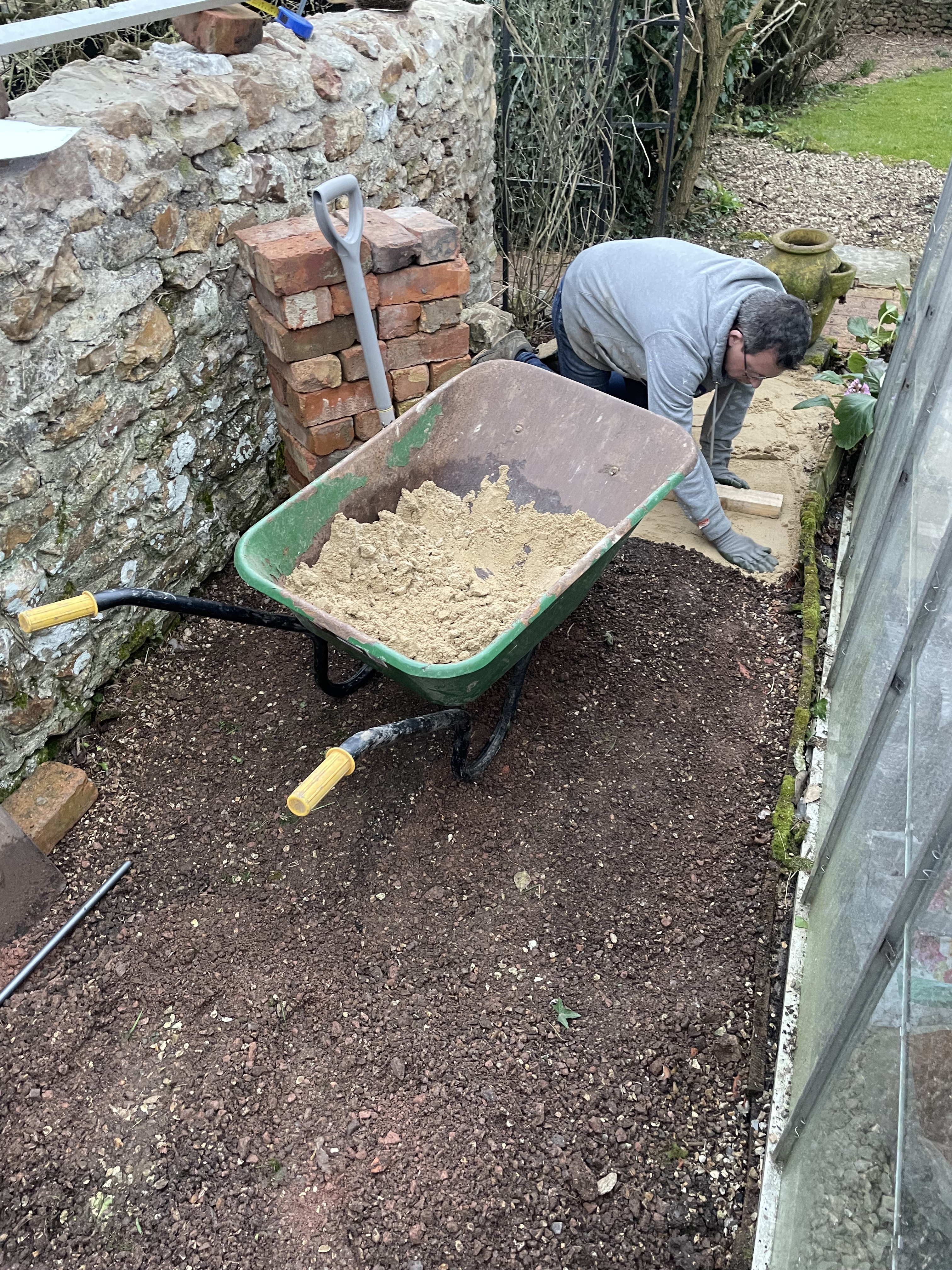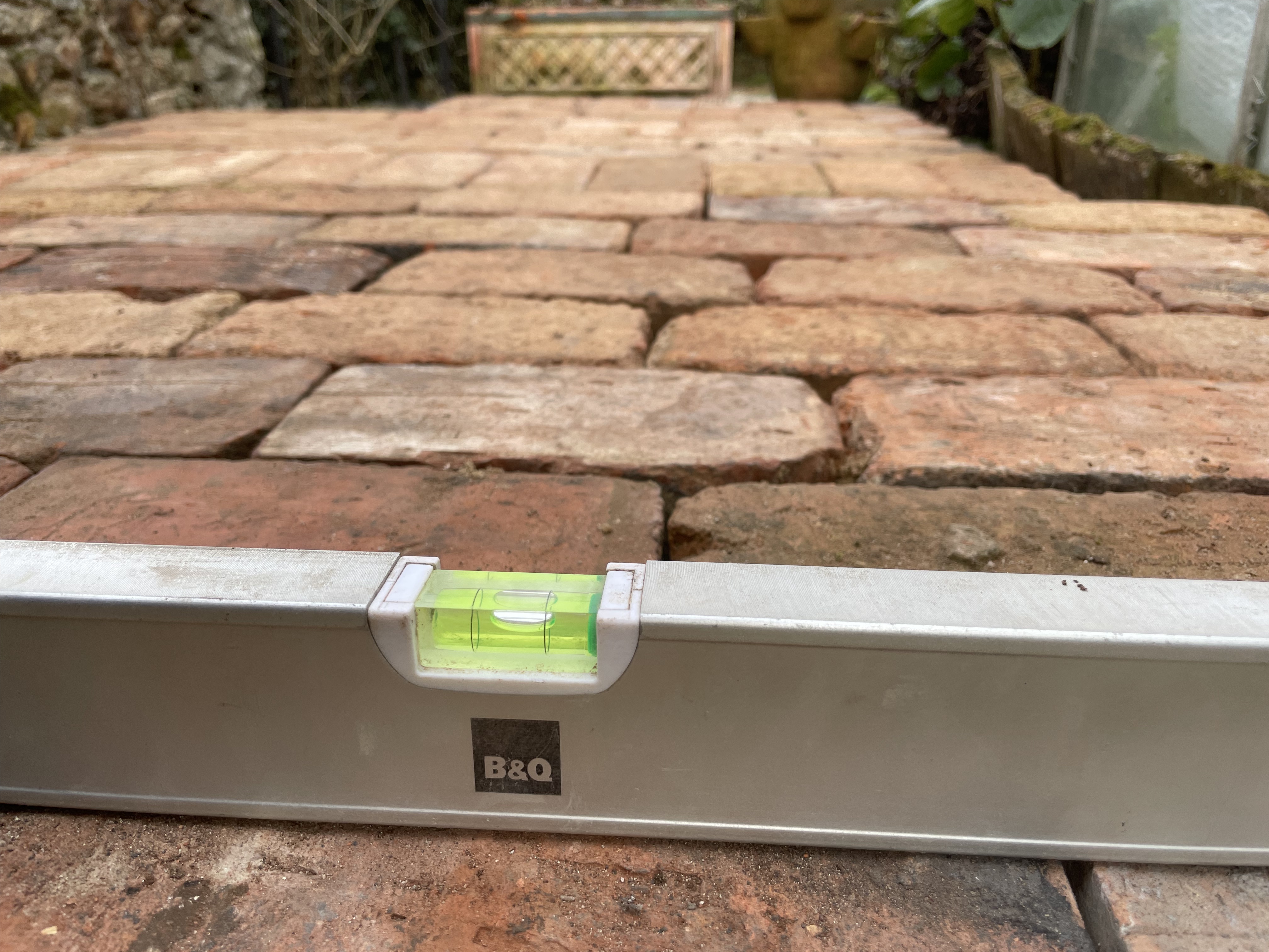 This enabled us to start another of our ‘2025 major jobs’ which is to brick the area between the wall and the greenhouse, removing the gravel in the process. The kitchen garden is full of gravel paths – our intention is to brick as much of the kitchen garden as we possibly can to minimise weeds and noise when we’re working in there. We prioritised the area behind the greenhouse after a disaster last year when the sloping ground and gravel caused our plastic seedling greenhouse to collapse and we lost most of the plants. We’re building in steps to try and manage the slope, although I’m not sure how we’ll join it up from the other side! Still plenty to do before we get to that stage…