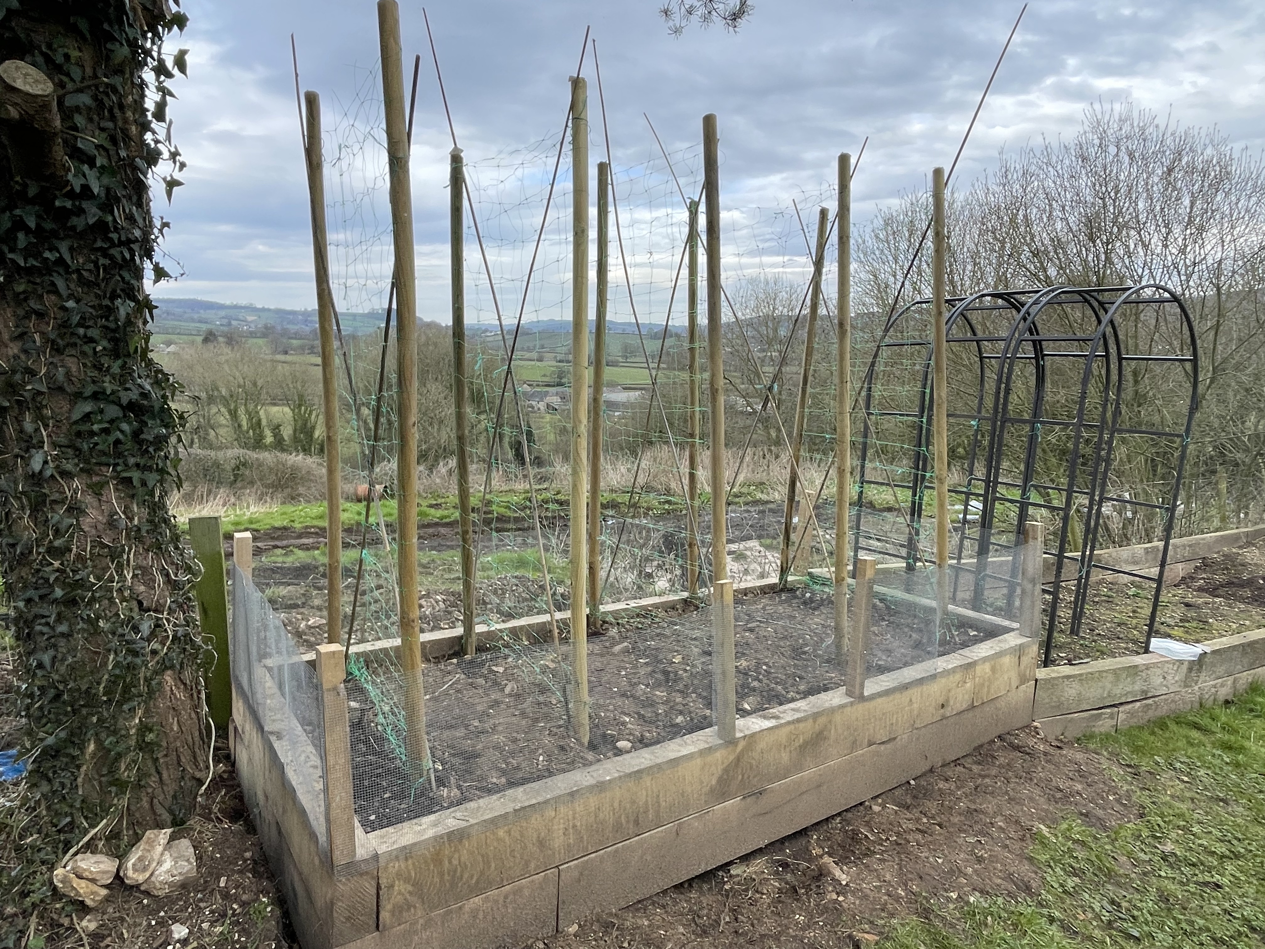 We ticked off our pea frames from the list on Saturday, having left the soil in our new veg bed to settle a bit after filling it up a couple of weeks ago. The frames are up and are now deep enough that hopefully they won’t blow over in the next storm. We’ve installed a fine mesh fence around the whole bed to keep out the mice and rabbits so should have more of a chance of actually eating some of our vegetables this year!