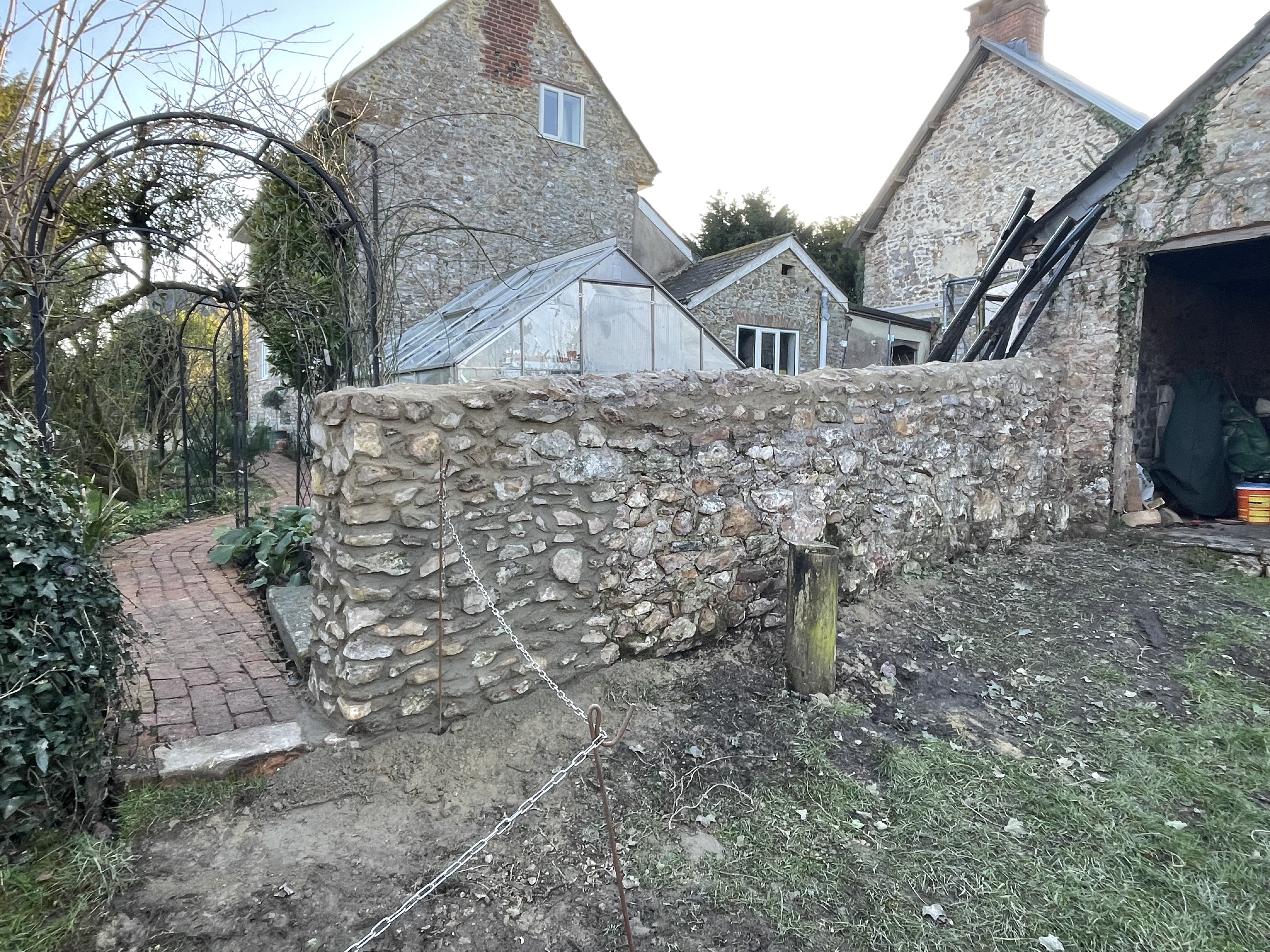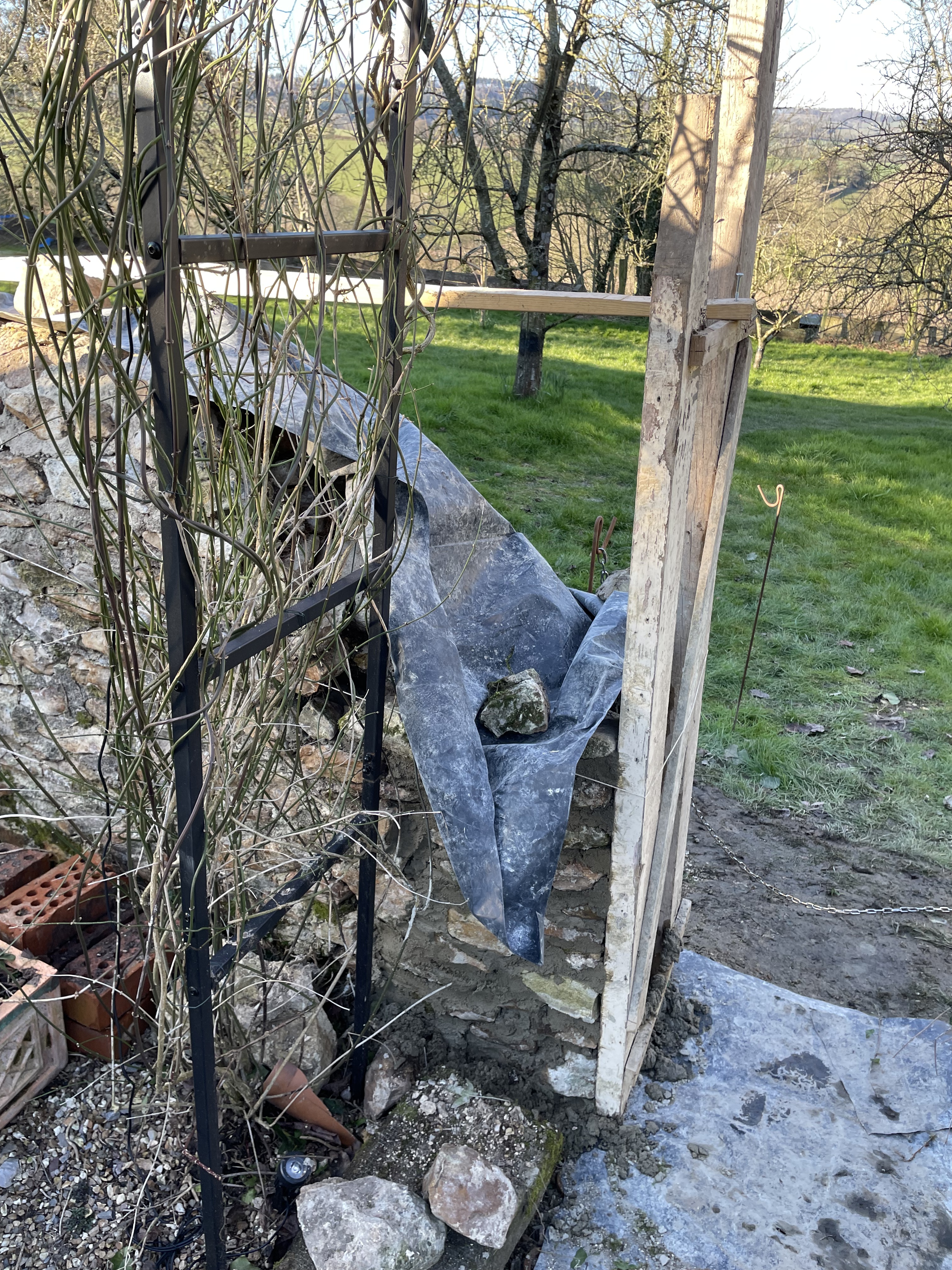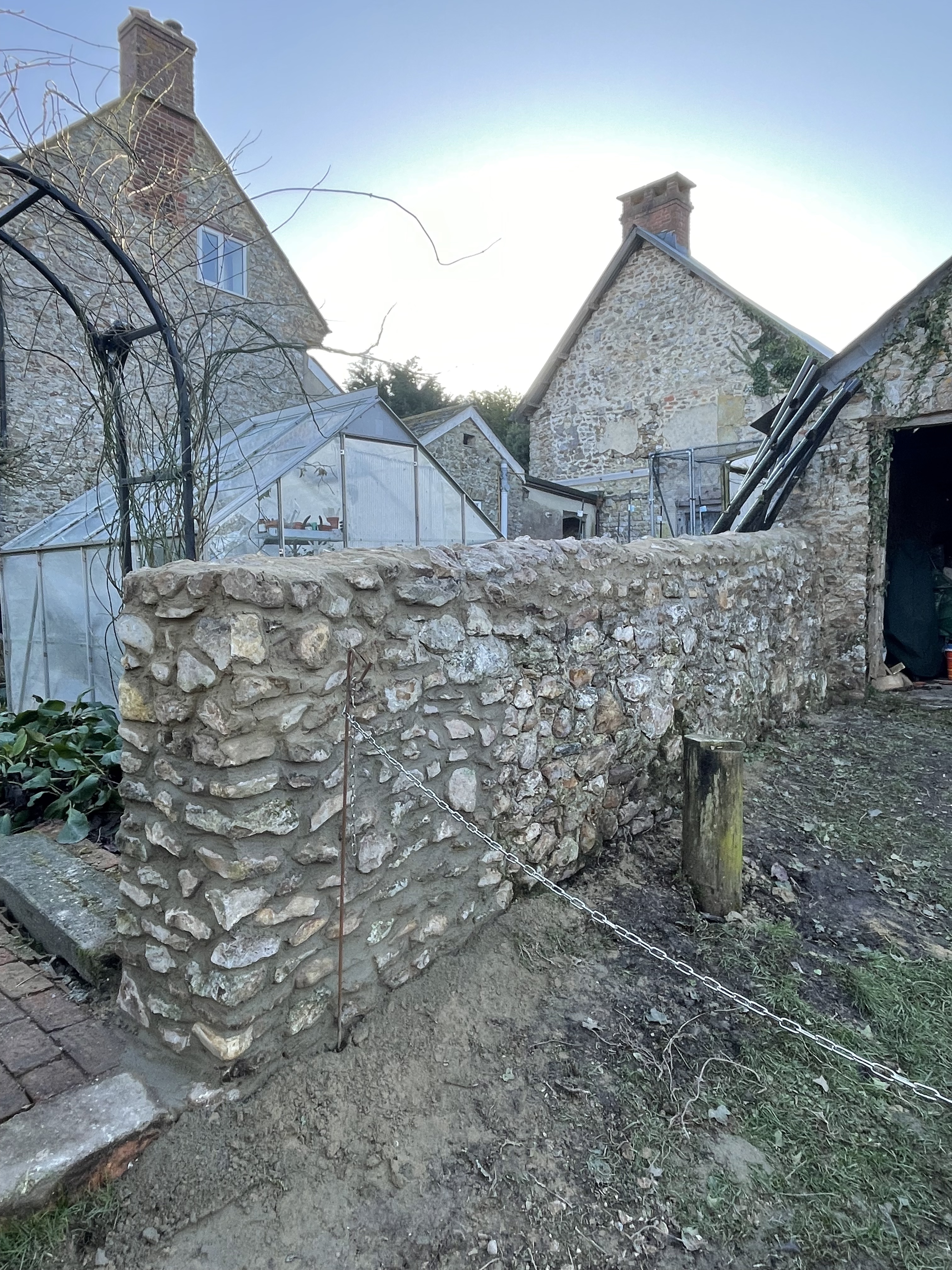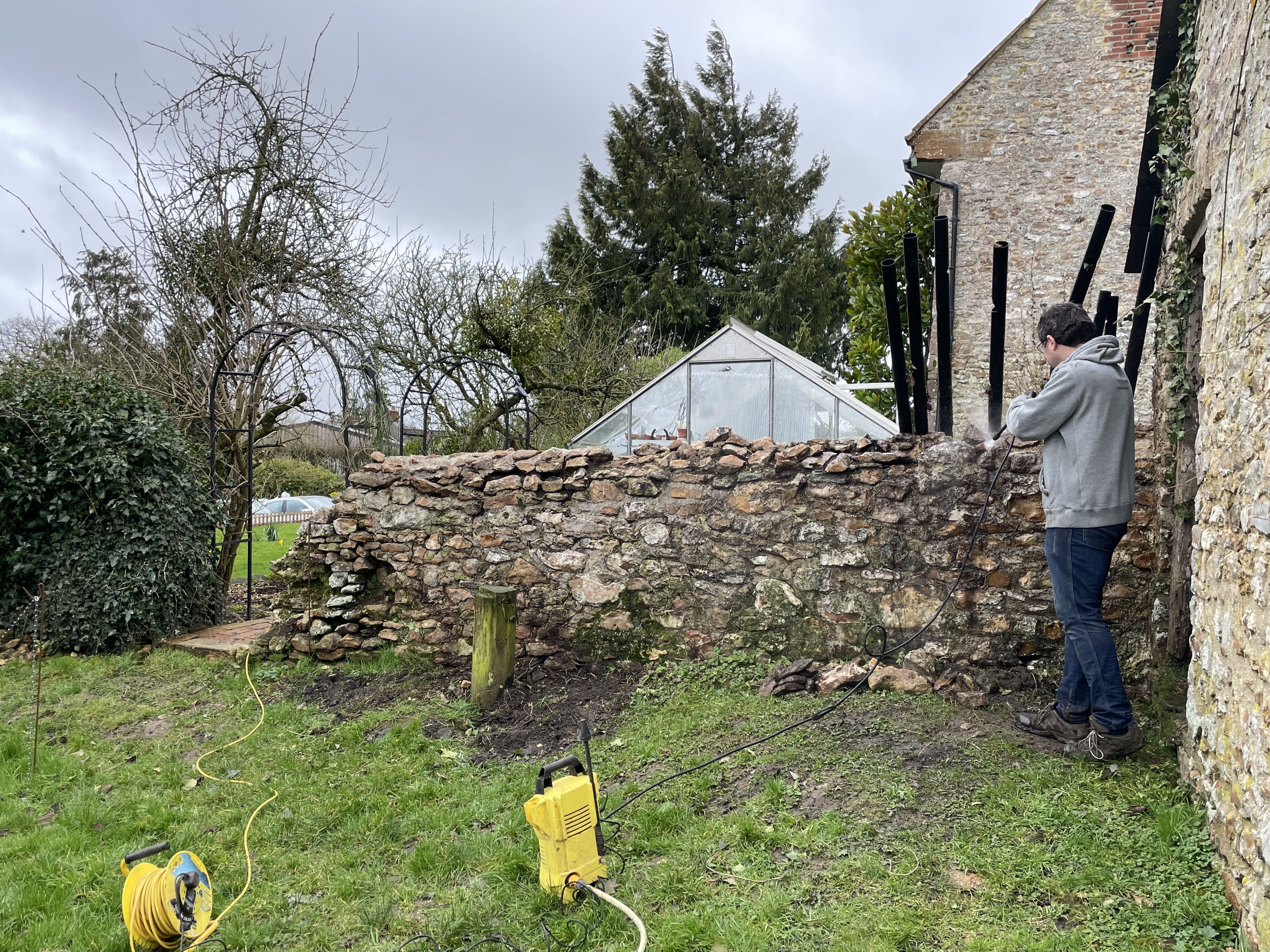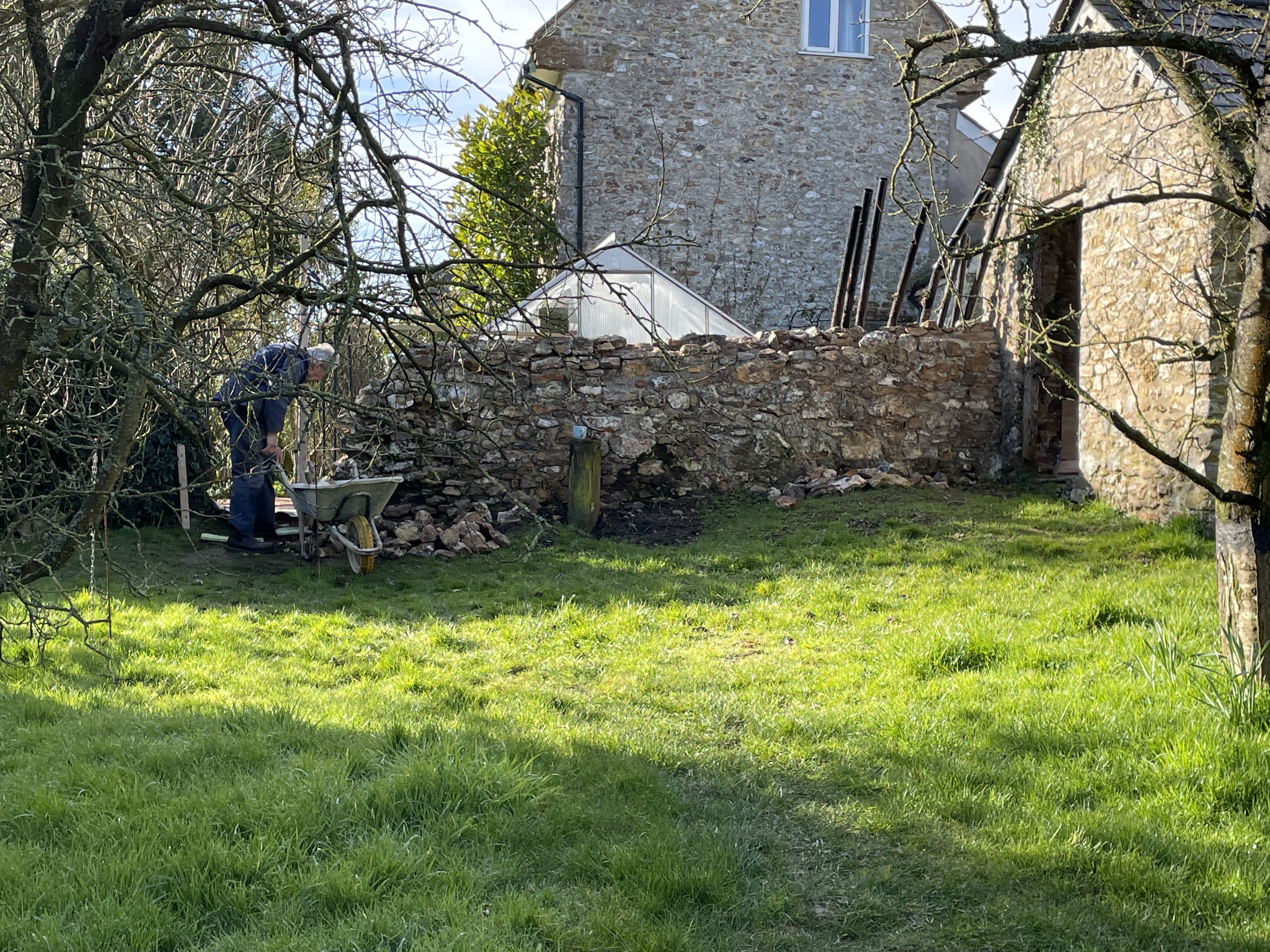 We also had our neighbour Sue’s dad on site this week helping us by rebuilding the garden wall by the kitchen garden. It had been totally taken over by ivy and weeds which harboured slugs and mice feeding off our vegetables and having finally had enough, we cleared it back in December. The wall had partially collapsed at one end, so over the last two months we’ve taken out the super-thick ivy stems and pressure-washed it to get rid of the soil that was supporting the vegetation. Sue’s dad is well known in the area for his stone walling expertise and made short work of rebuilding it. It looks so much better than it did, he’s done a fantastic job!