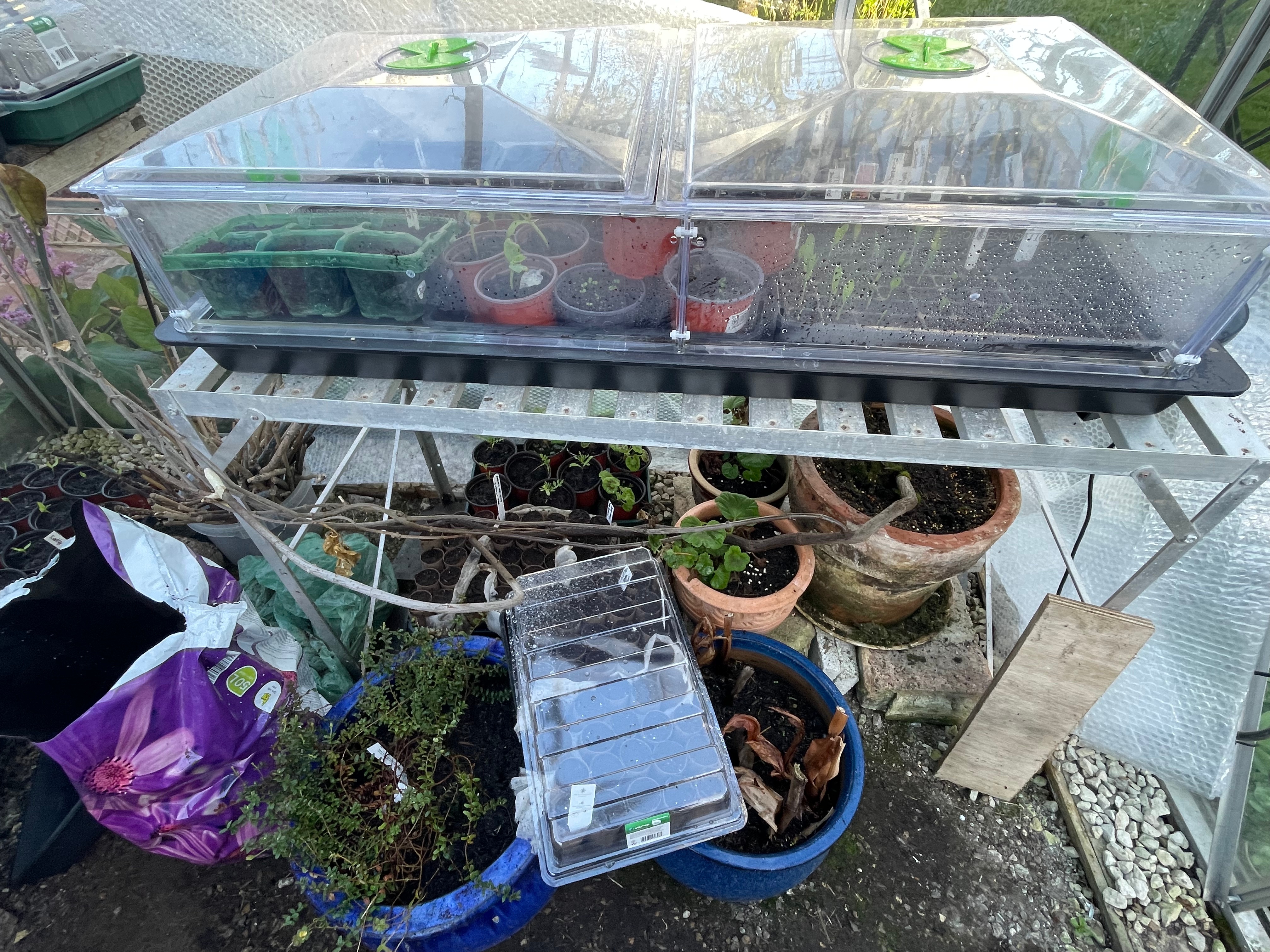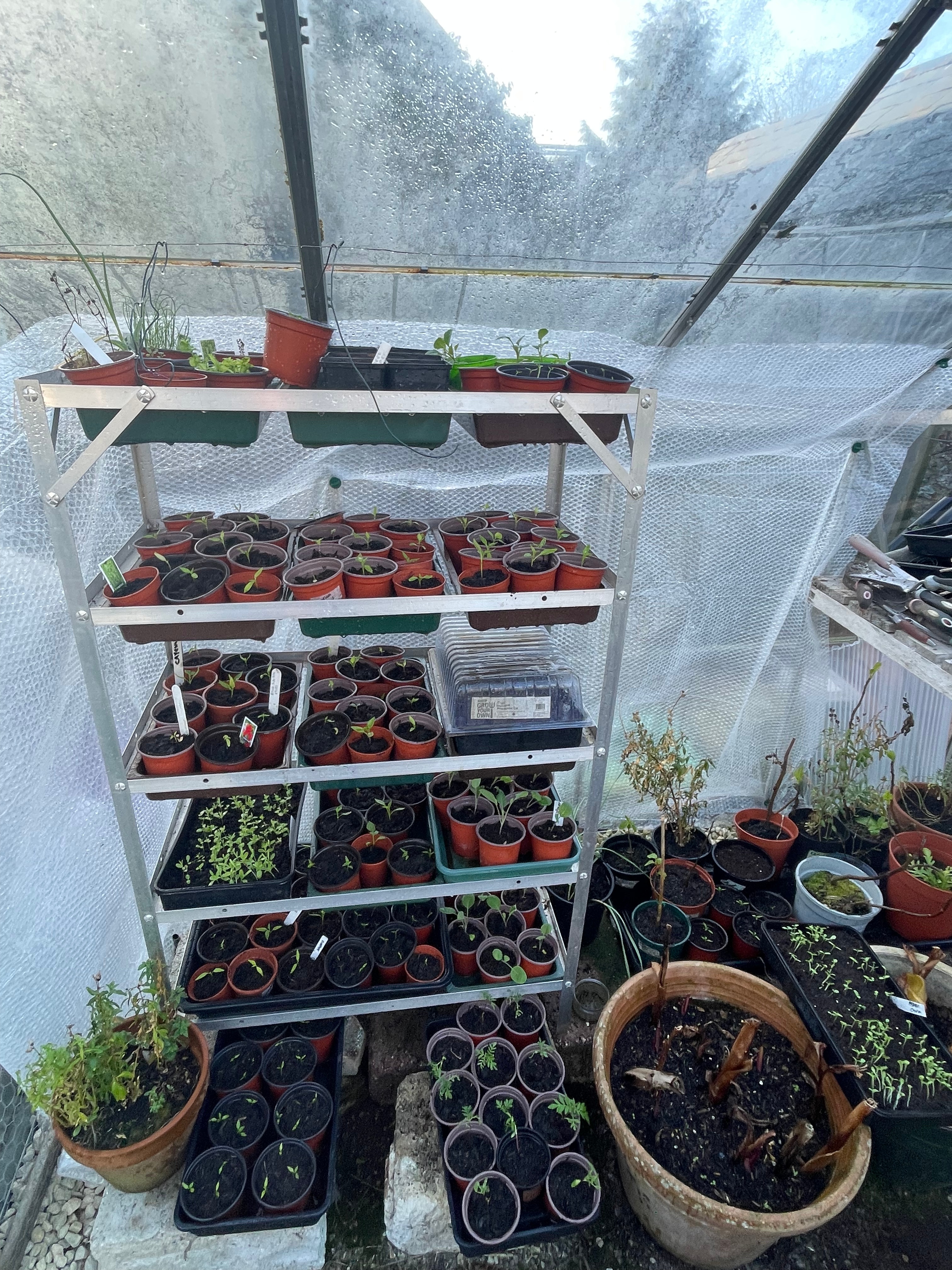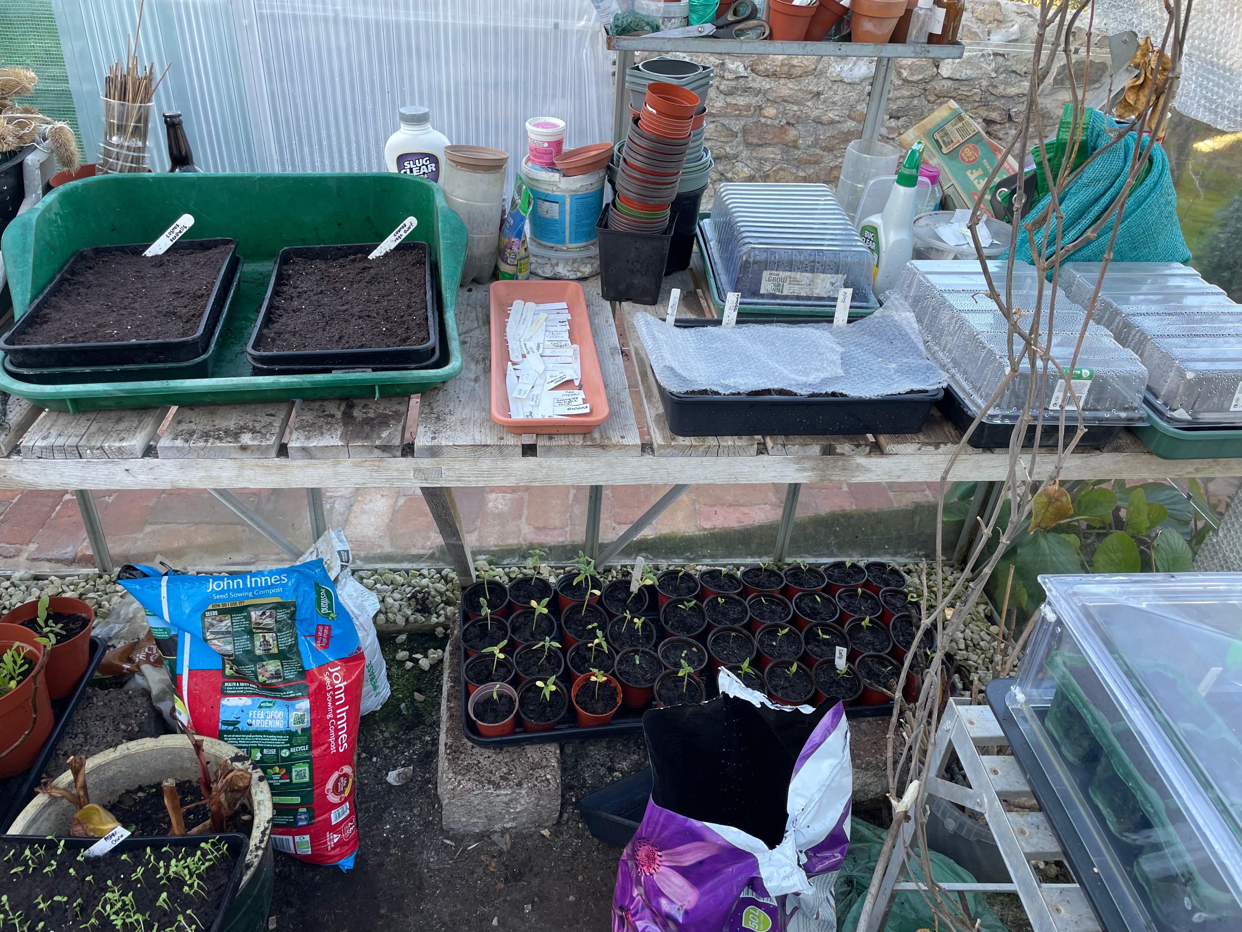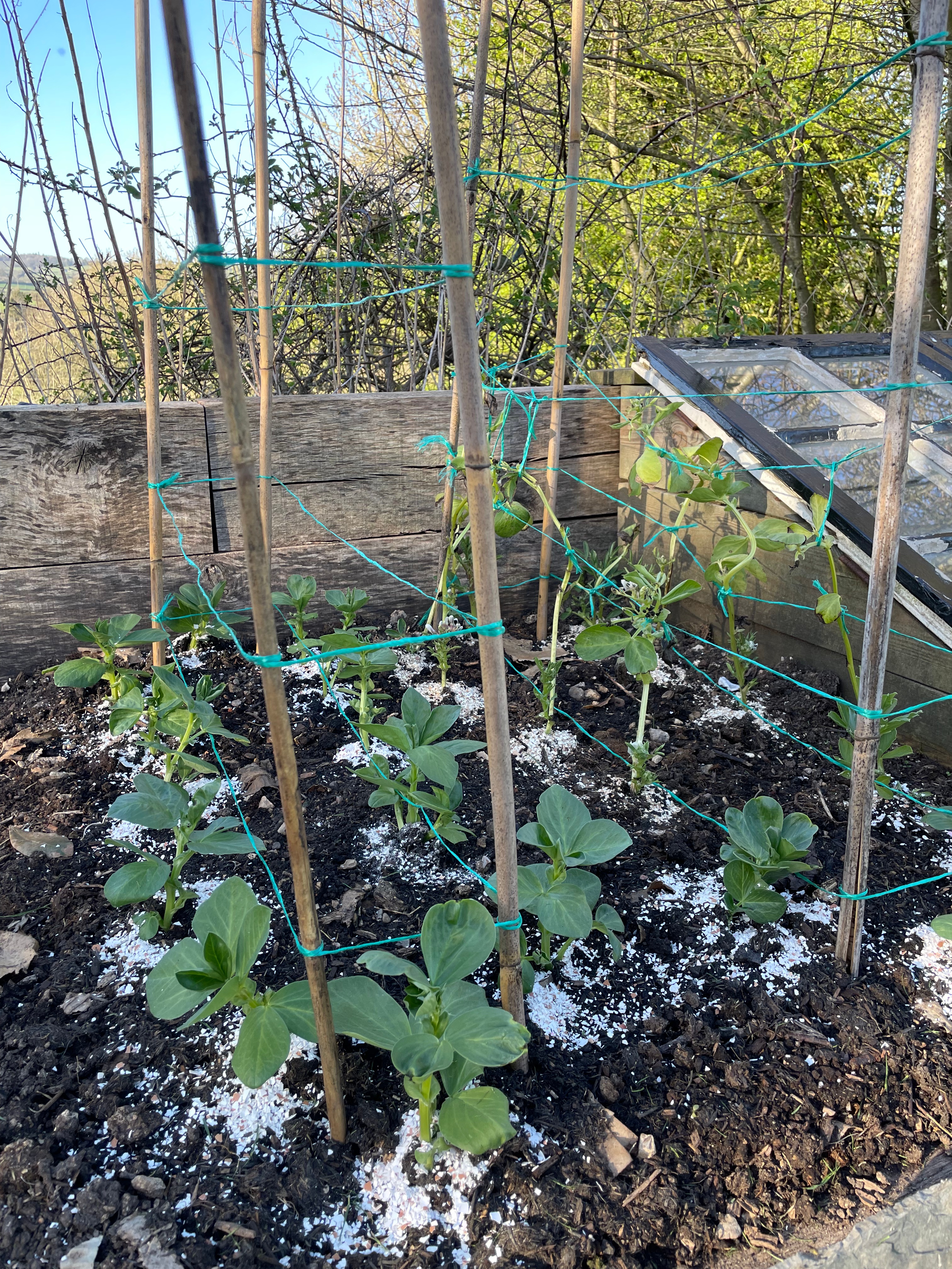 We’ve been busy in the greenhouse potting up seedlings and planting more seeds. As it’s getting slightly warmer we’ve started hardening off some of the plants and plant them out to make more space – this week we put out the strawberries, leeks (left over from last year), broad beans and first peas. We completely replanted our strawberry patch with new plants and moved it to one end of the raised bed instead of taking a long strip. It took up a lot of space and we couldn’t cover it properly, so lost all our strawberries to slugs and mice. We also potted up some of our strawberry drainpipes now the slugs can’t hide in the ivy behind them although we actually ran out of strawberry plants for the first time since we moved in!