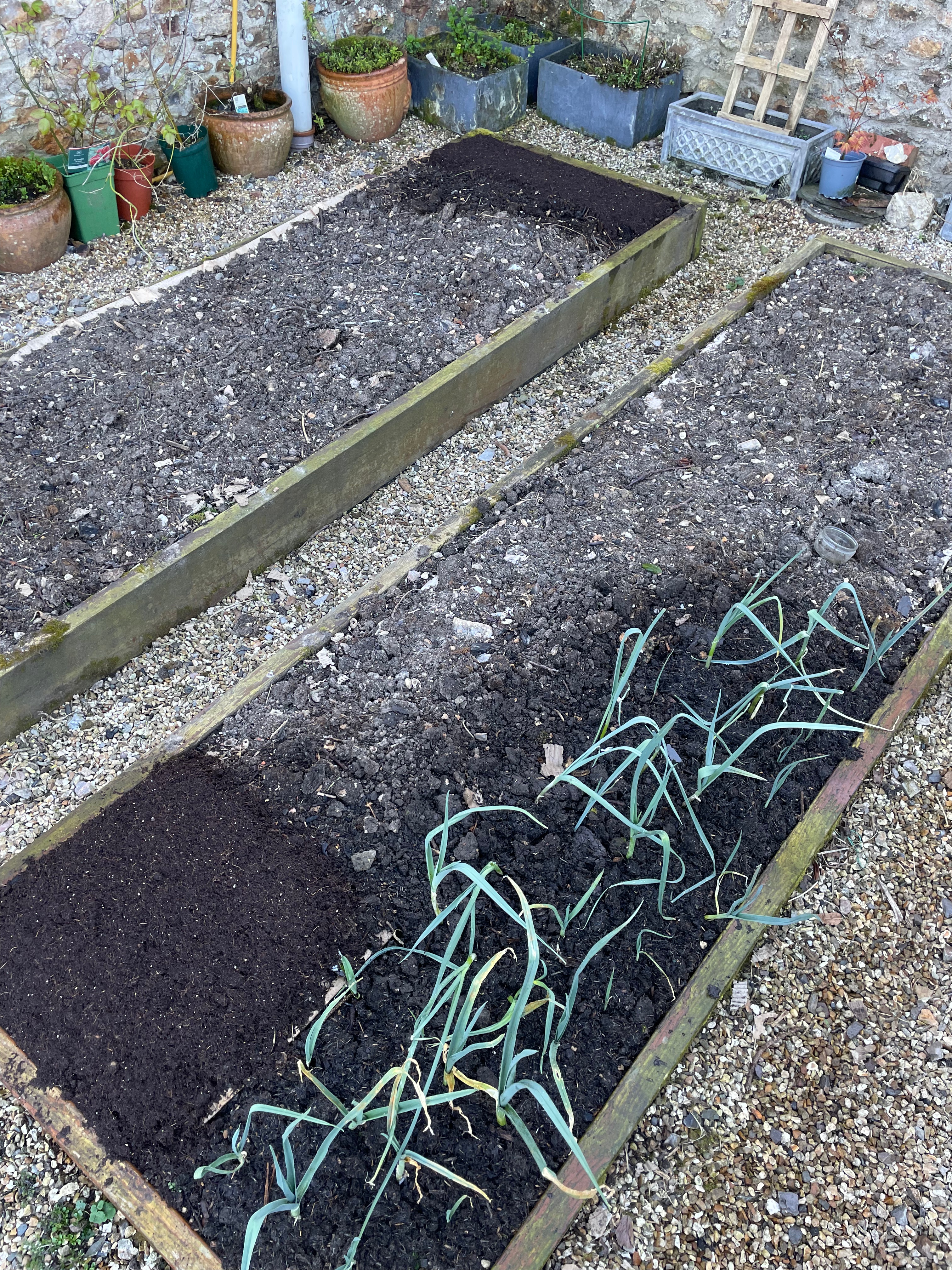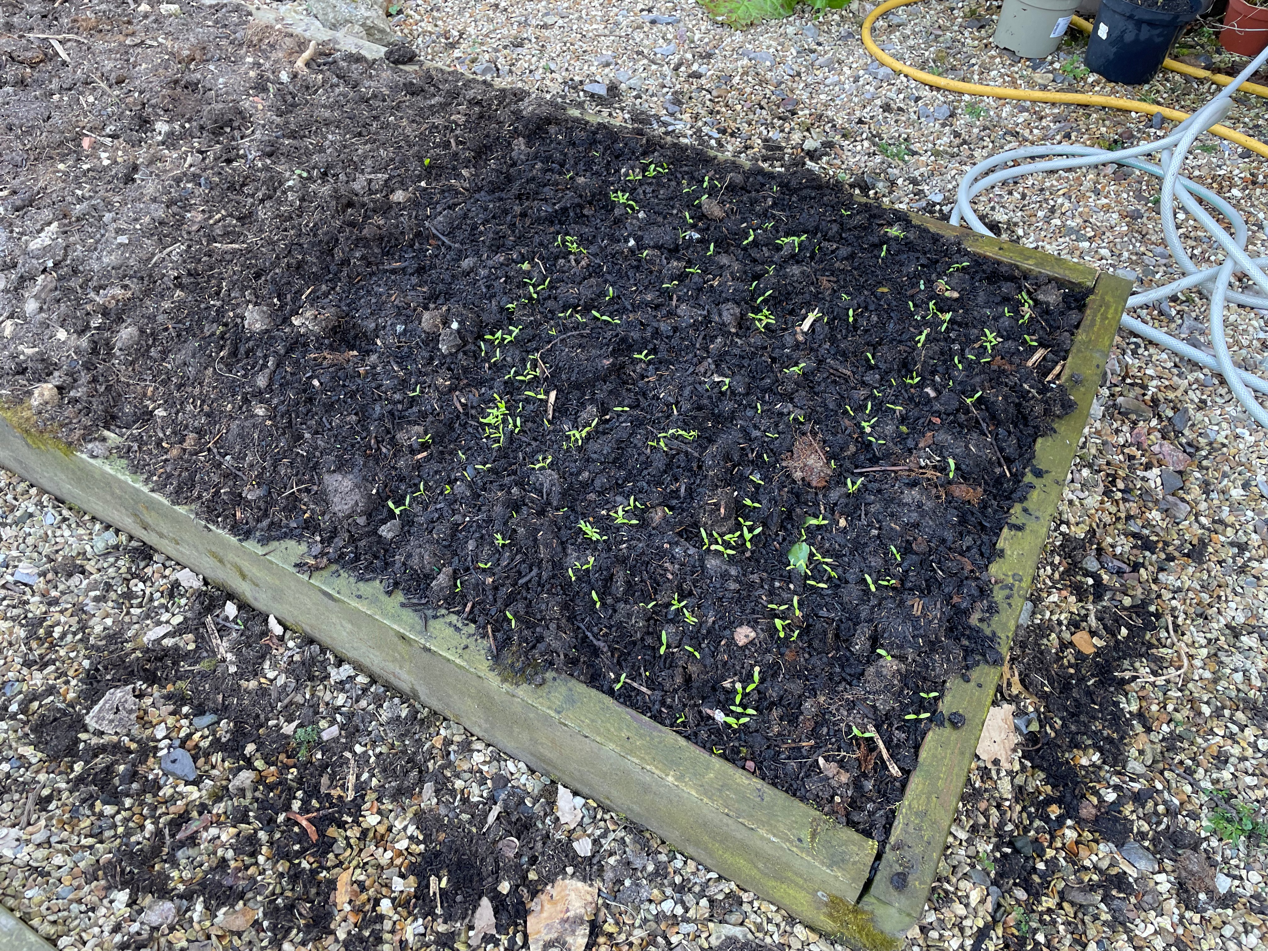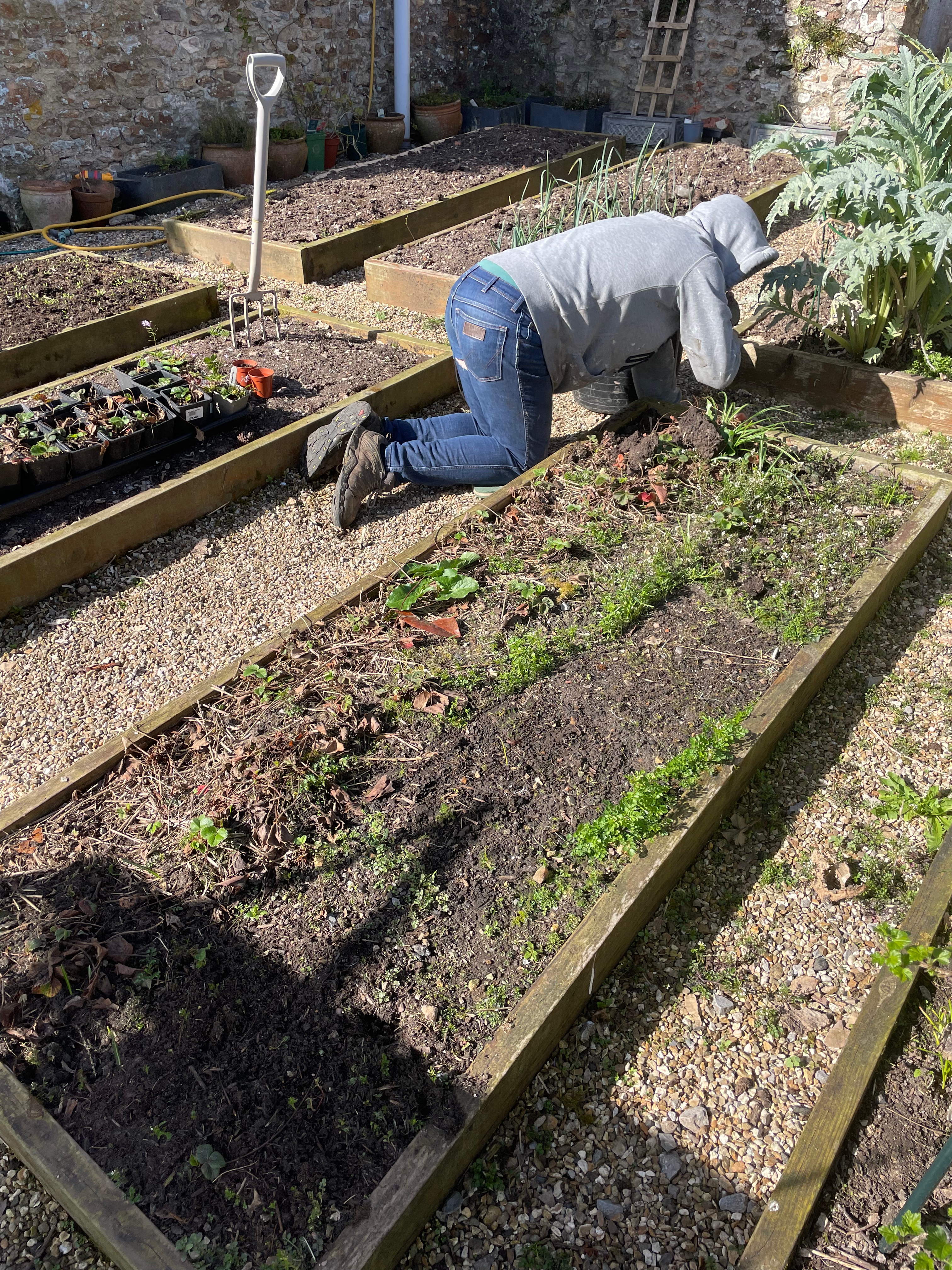 Our parsnips are starting to come up (we seem to have far more than in previous years so I hope they all make it!!) which inspired me to start sowing seeds outside. We’ve put the first sowing of carrots, beetroot and radishes in (another reason for redoing the strawberry bed this weekend as the radishes are next to them). It’s a little too early to say for sure but it seems like the ‘no dig’ process in the kitchen garden has worked. We put cardboard down over winter and put compost on top – so far the plants are making it through the cardboard but the weeds aren’t. The only bed that’s covered in weeds is the one in the fruit cage that we didn’t cover…