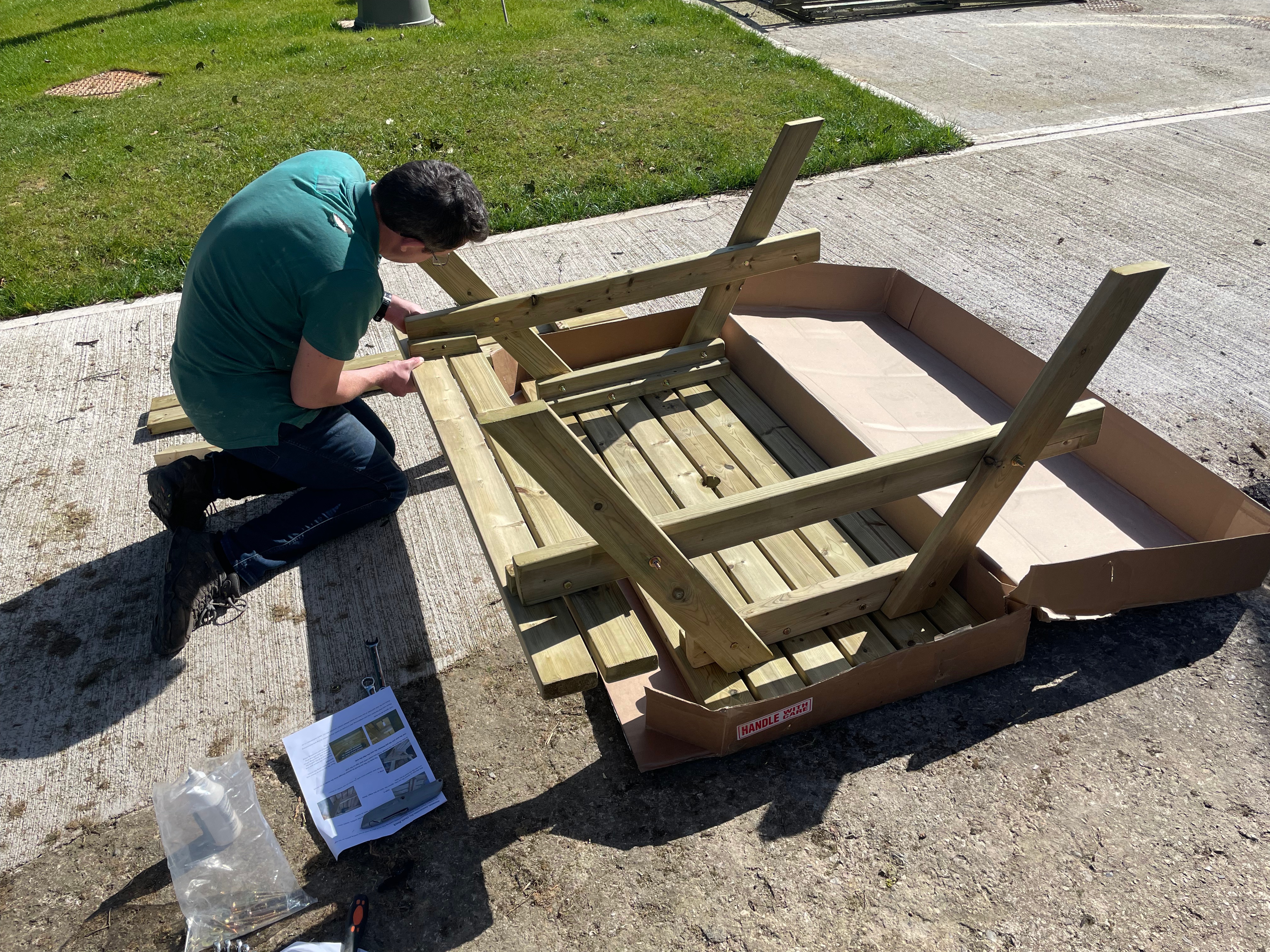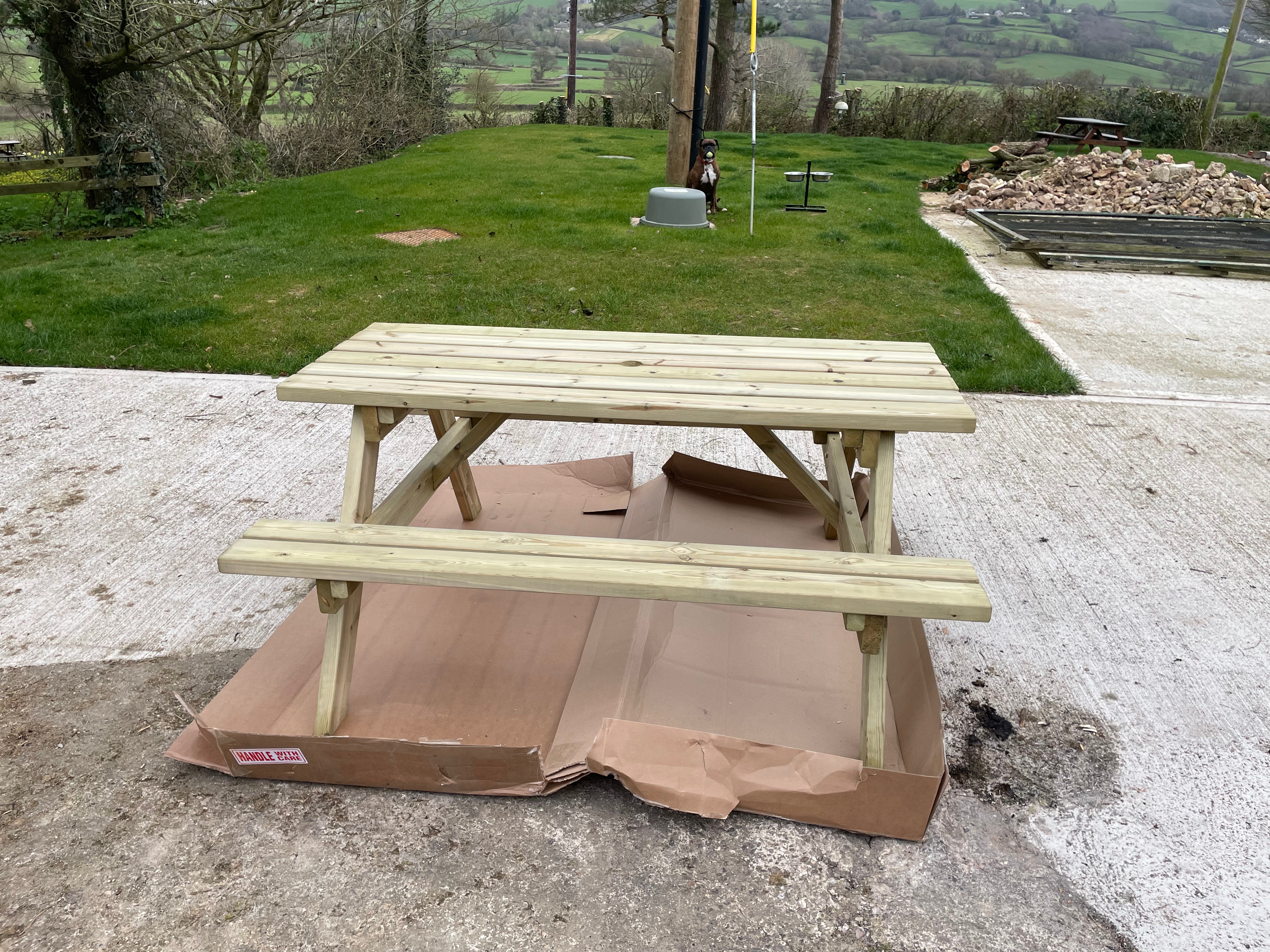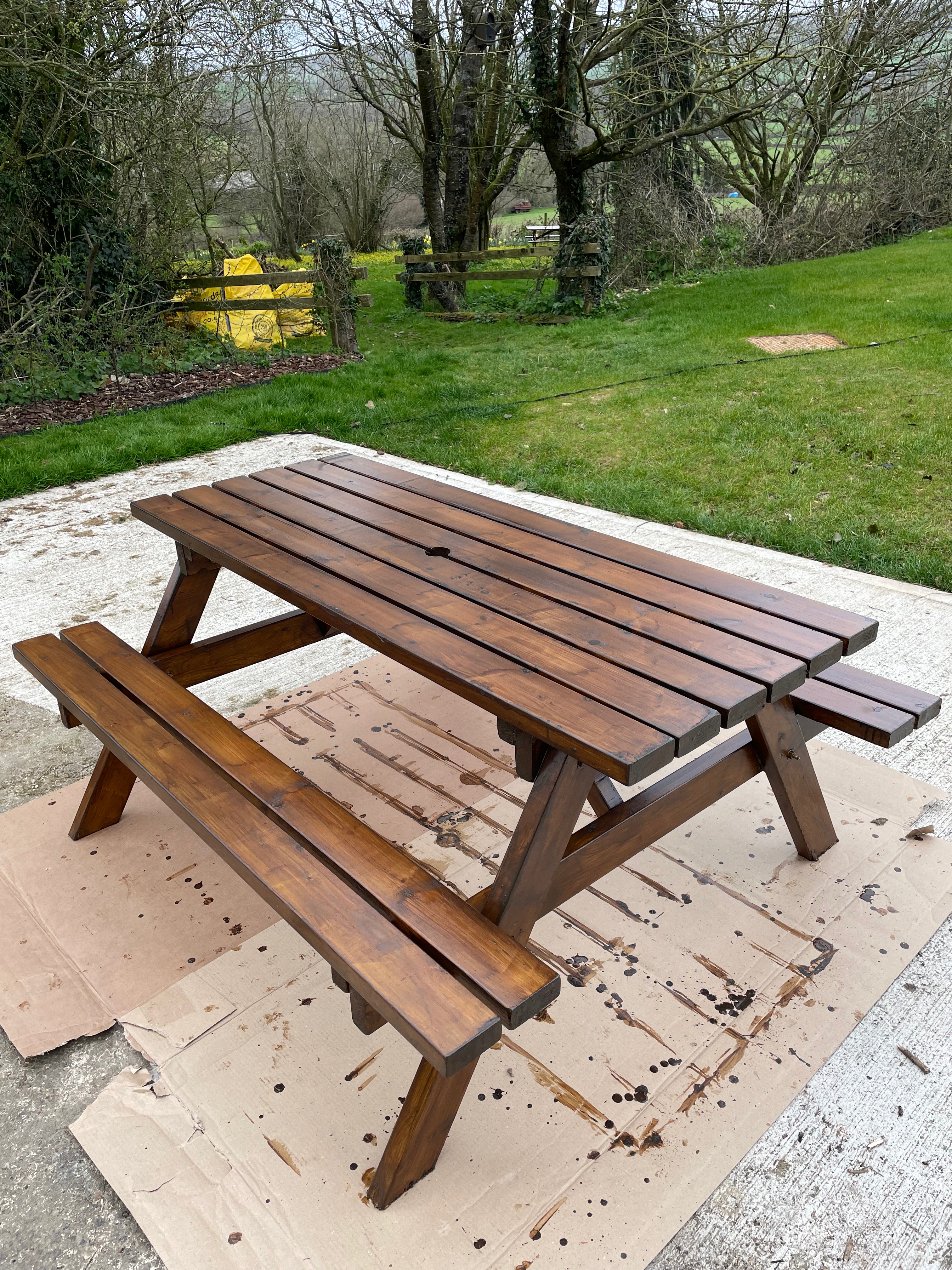 This weekend we built and treated a new picnic bench for our guests to use in the wood, so we now have seating for eight people. It’s the perfect place to enjoy the views across the valley – at the moment the lesser celandine is out throughout the wood and the daffodils we planted a few years ago line the fence beautifully. A few patches haven’t taken so we’ll try and replant them this autumn – it looks much better when it’s a continuous yellow line. Guests might even see one of our pheasants who live between the wood and next door’s field. Now we’re getting into Spring, our male has attracted his harem – we’ve started seeing up to 4 females clustered round the bird feeder.