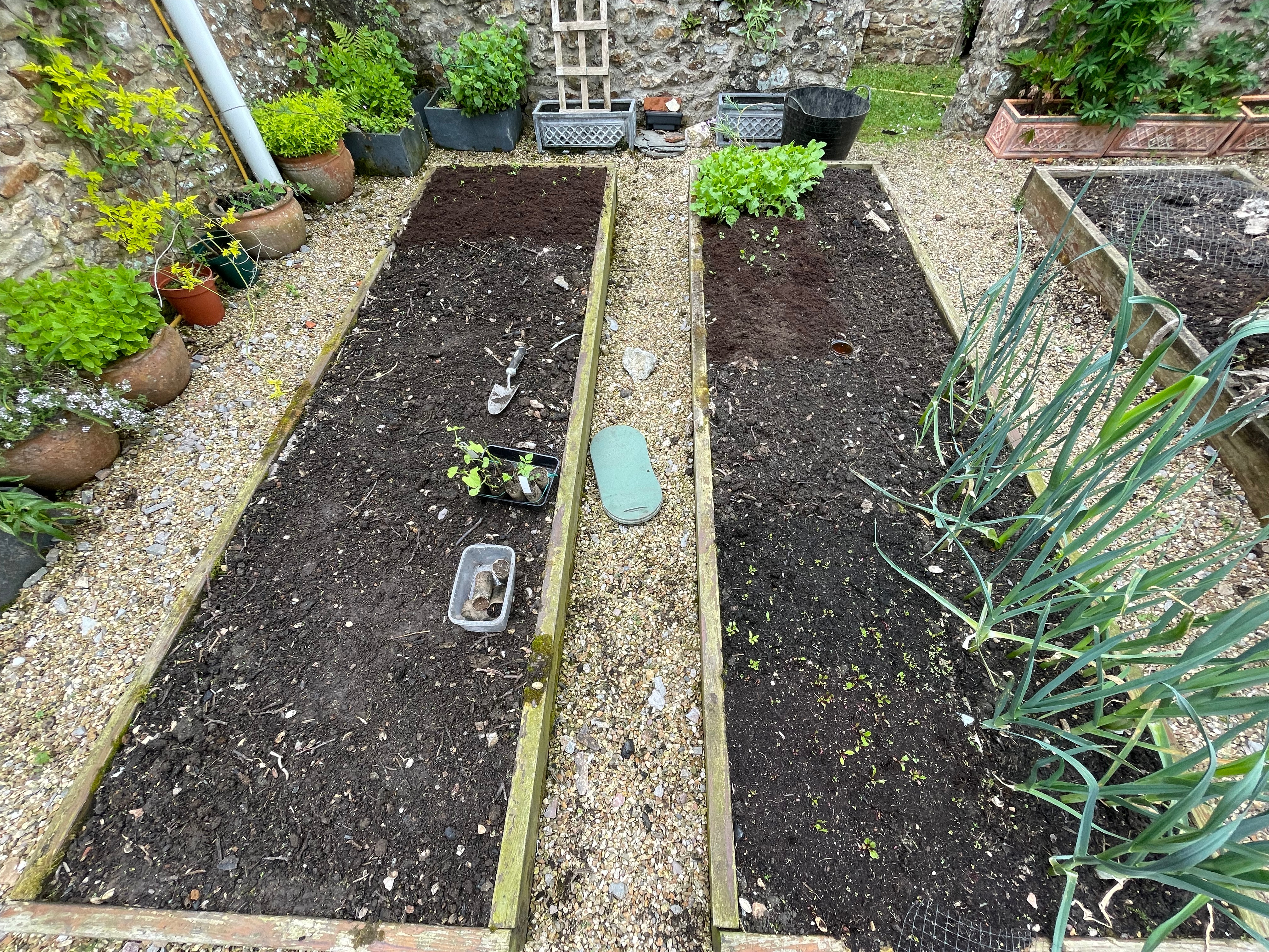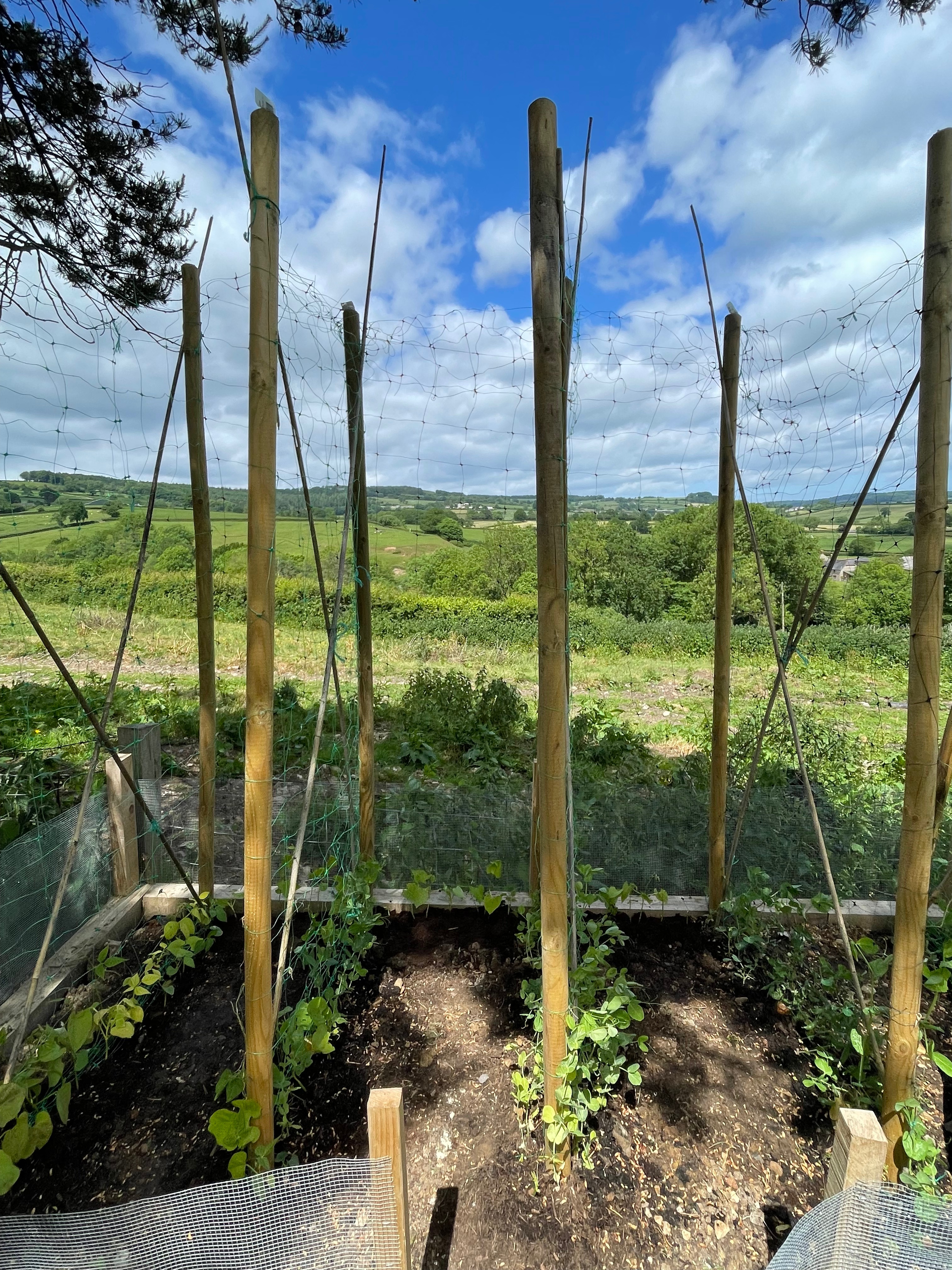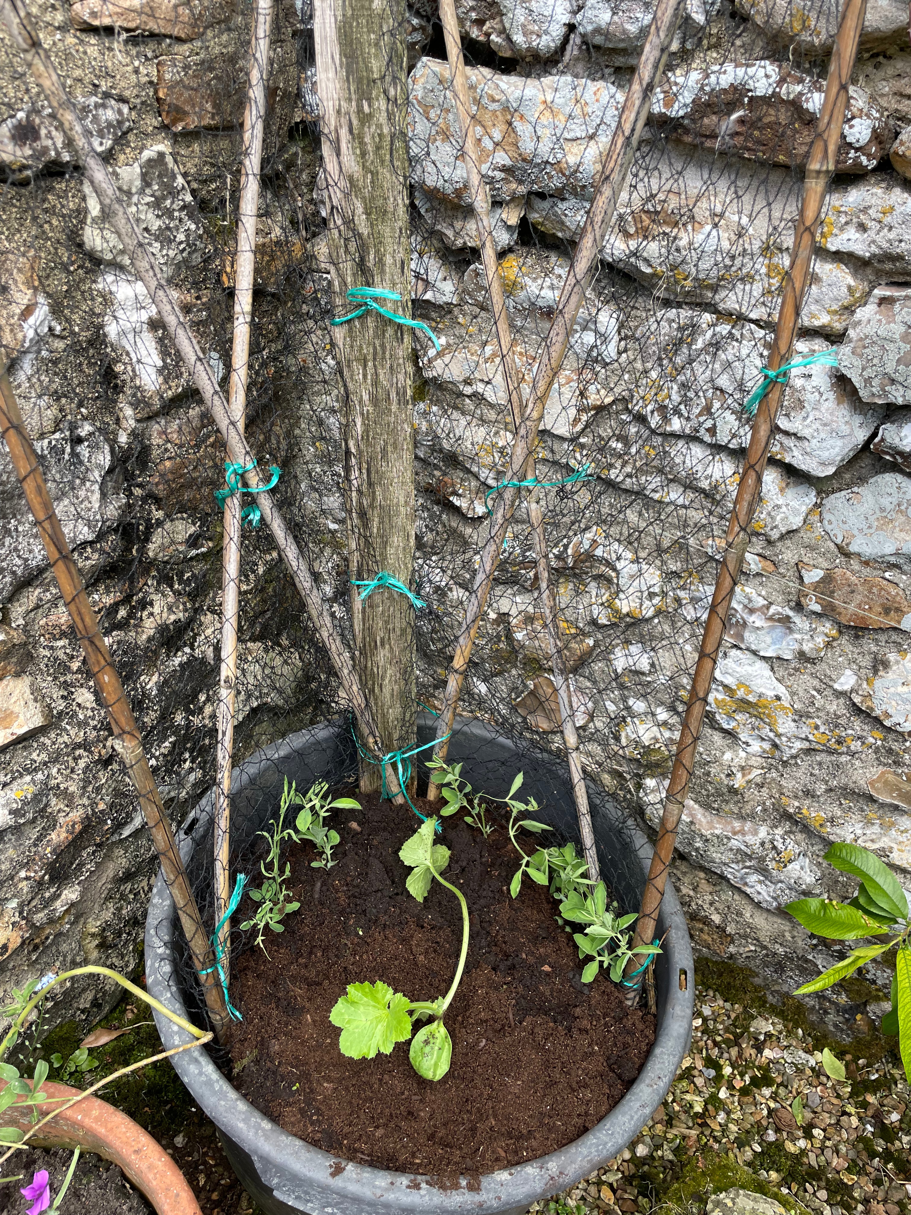 John repaired both our sweet pea corner frame and the blackberry arch in the orchard, which had been damaged by one of the winter storms. We’re also experimenting with a new sweet pea wall – since we took the ivy off the kitchen garden wall and had it beautifully repaired by our neighbour’s dad, we’ve now draped a net over it and planted sweet peas in pots at the bottom. Hopefully they’ll take and we’ll have a wall of sweet peas by the walk to the games room that attracts pollinators to both the kitchen garden and the orchard vegetable beds.